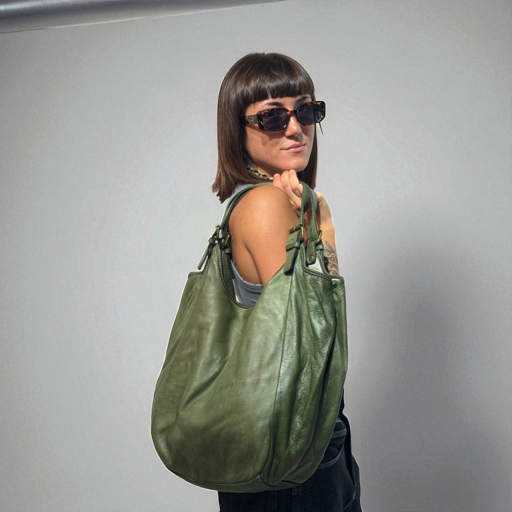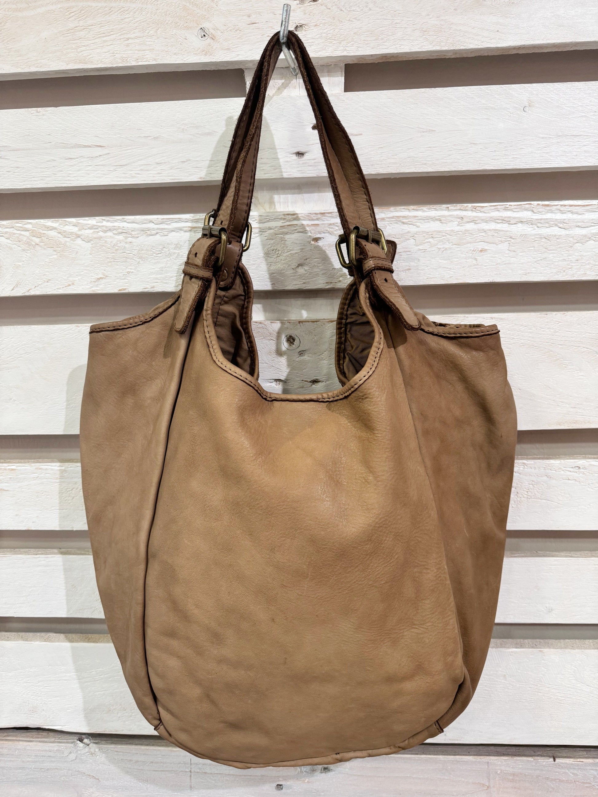 Grande borsa a sacca, comoda a spalla e capiente, interno rivestito ed accessoriato, costruita con pelle morbida tinta in capo nello storico distretto del cuoio toscano in maniera artigianale