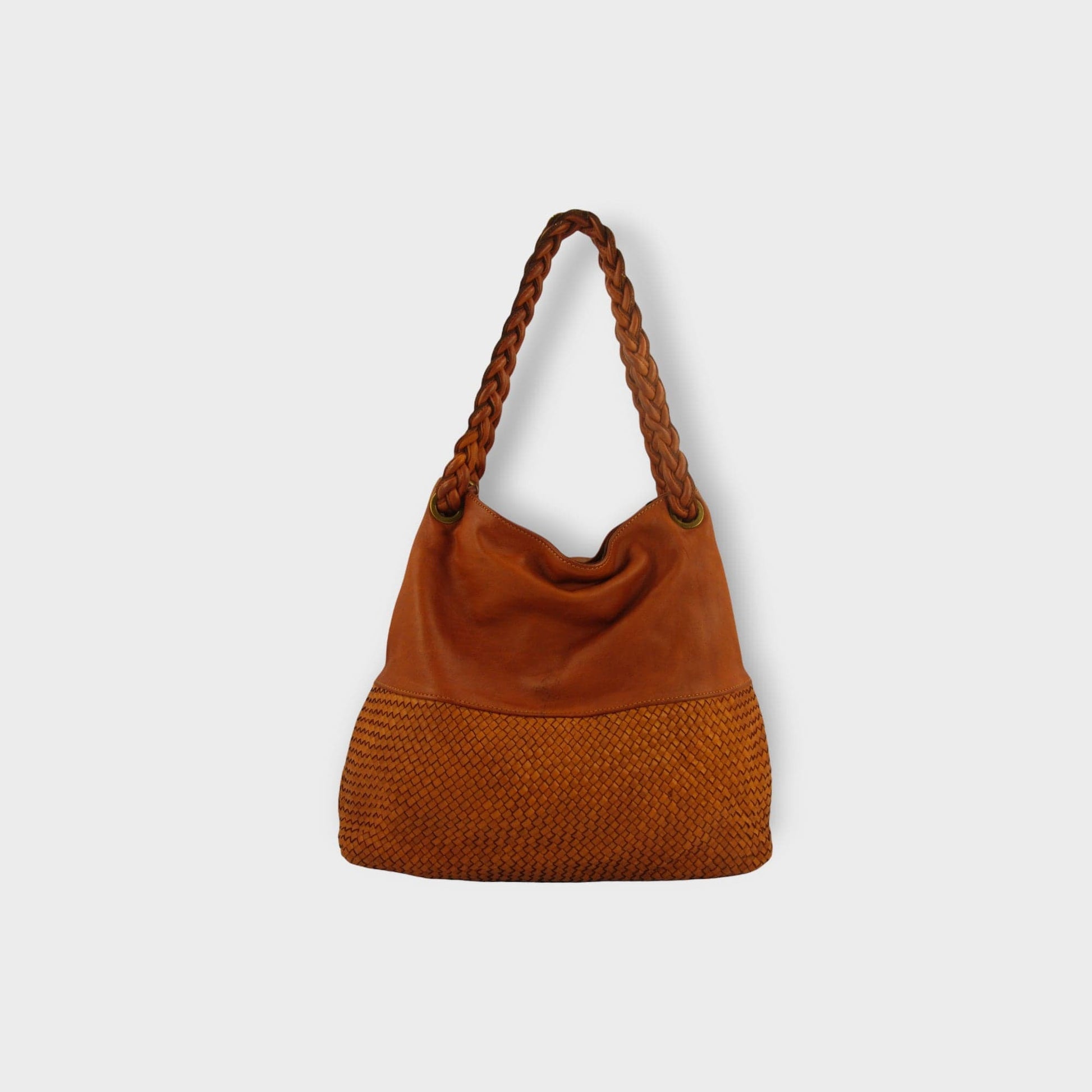 Borsa in vacchetta tinta in capo. Chiusa con zip, interno unico scomparto rivestito con fodera di cotone, accessoriato con tasca chiusa da zip e tasche di cortesia aperte. Tracolla in pelle regolabile e rimovibile. Manici e parte inferiore intrecciati a mano. Molto comoda a spalla oppure a tracolla, capiente e leggera. Costruita con pellami di alta qualità in maniera artigianale.