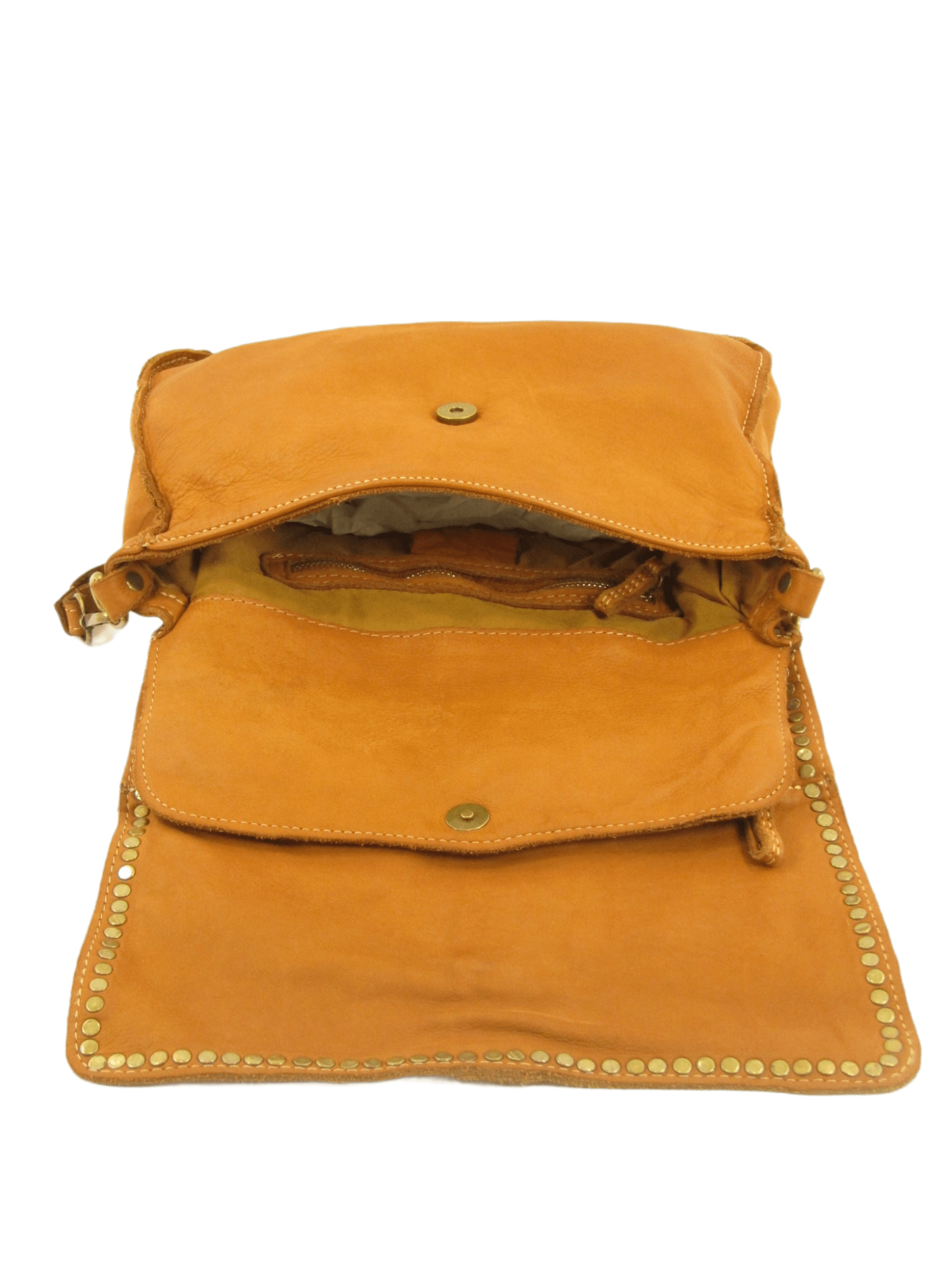 Borsa in vacchetta tinta in capo. Chiusura con patella. Interno diviso in due scomparti, accessoriato da tasche chiuse da zip e tasche porta accessori aperte. Decorata con borchie. Tracolla in pelle regolabile e rimovibile. Laccetto da polso rimovibile. Si porta a mano, a tracolla, al polso. Borsa comoda e morbida.