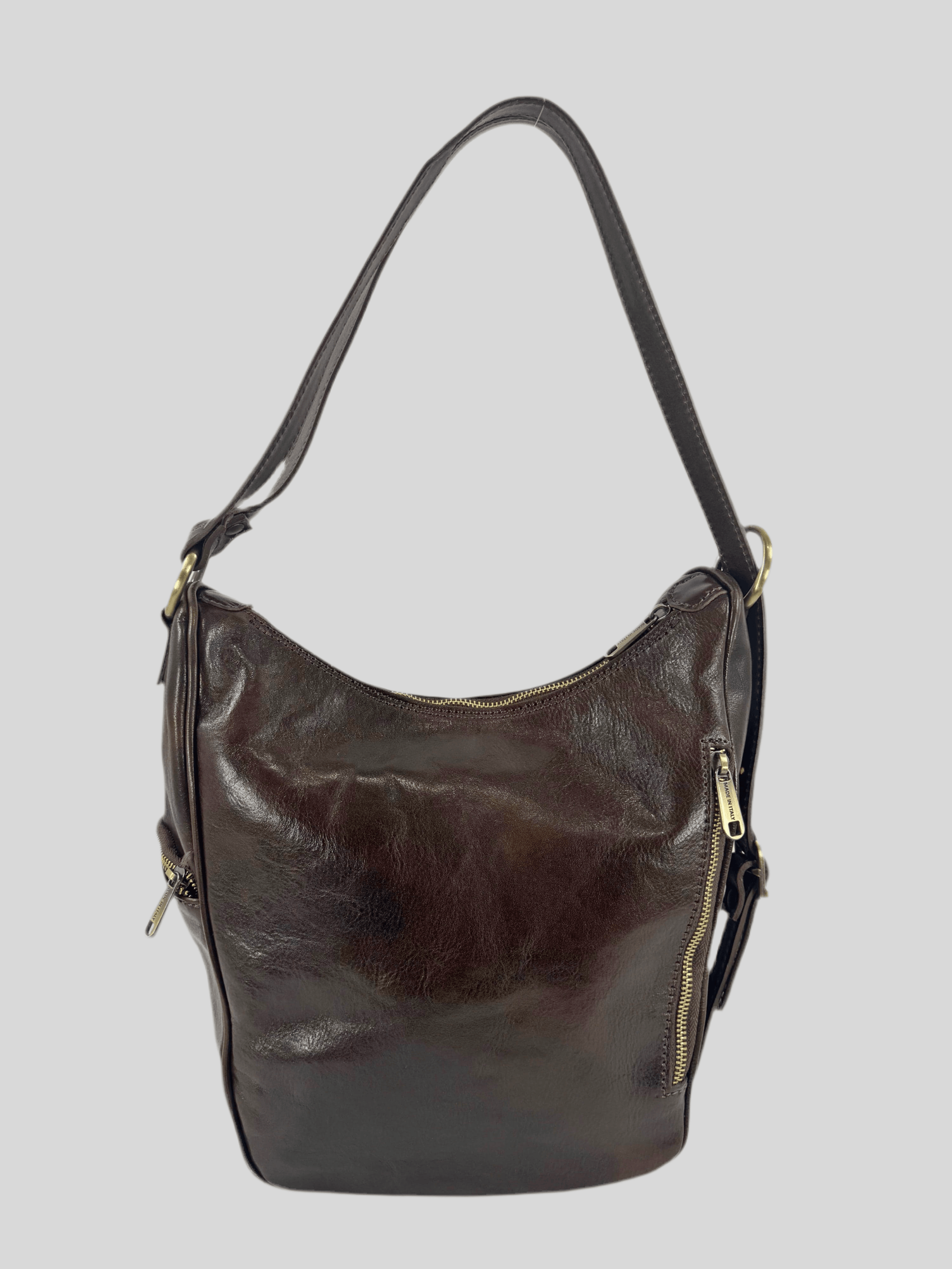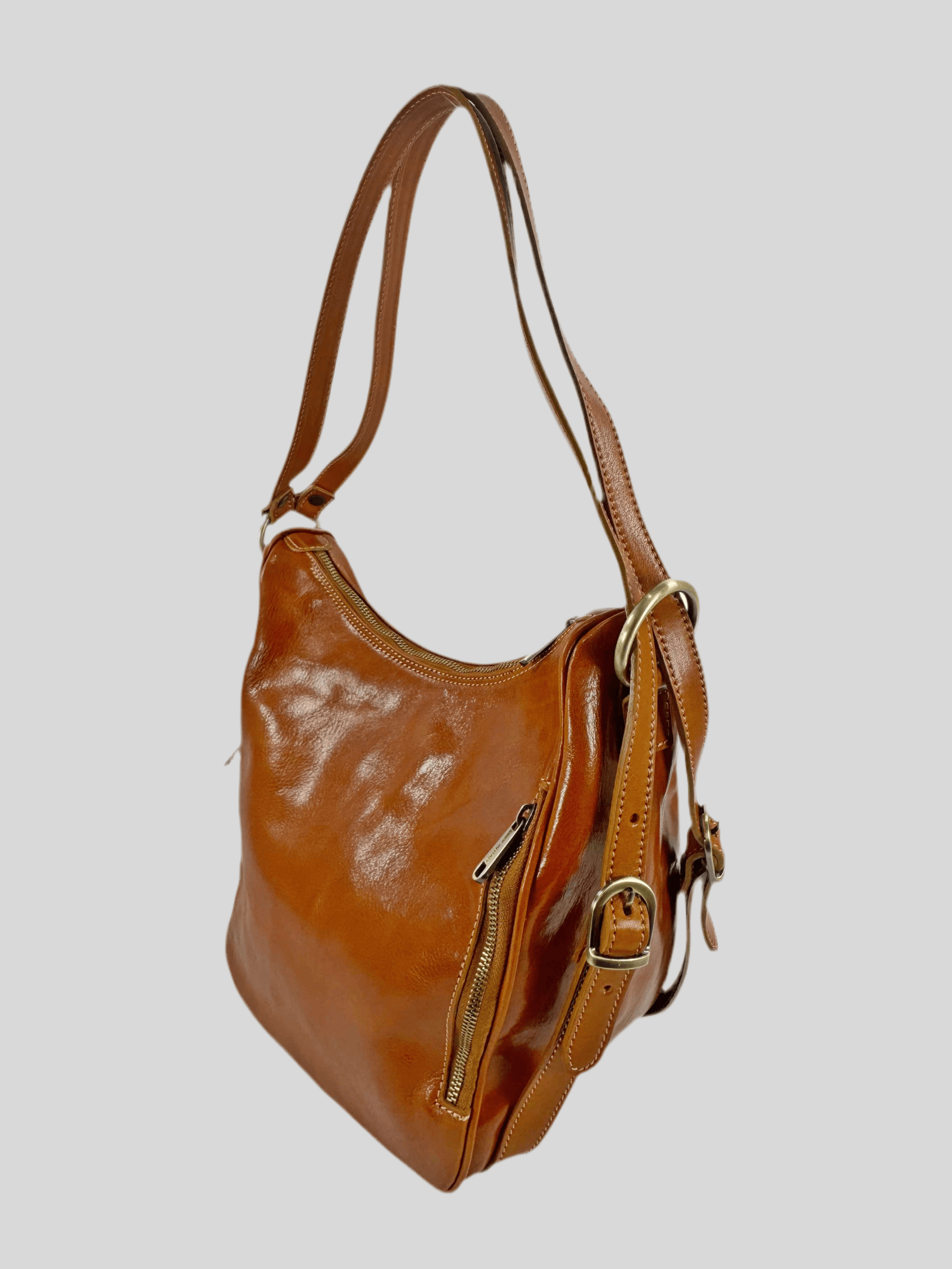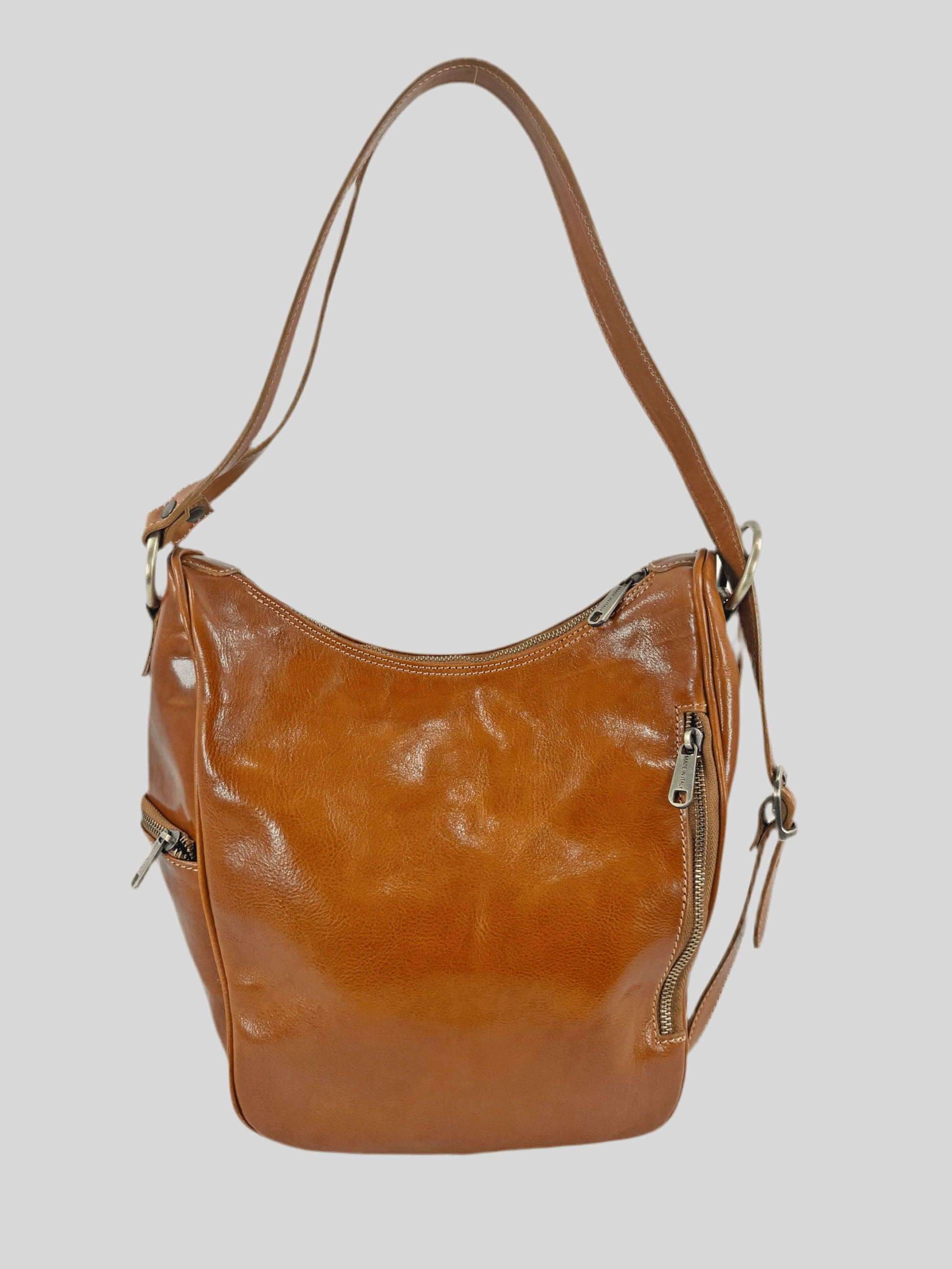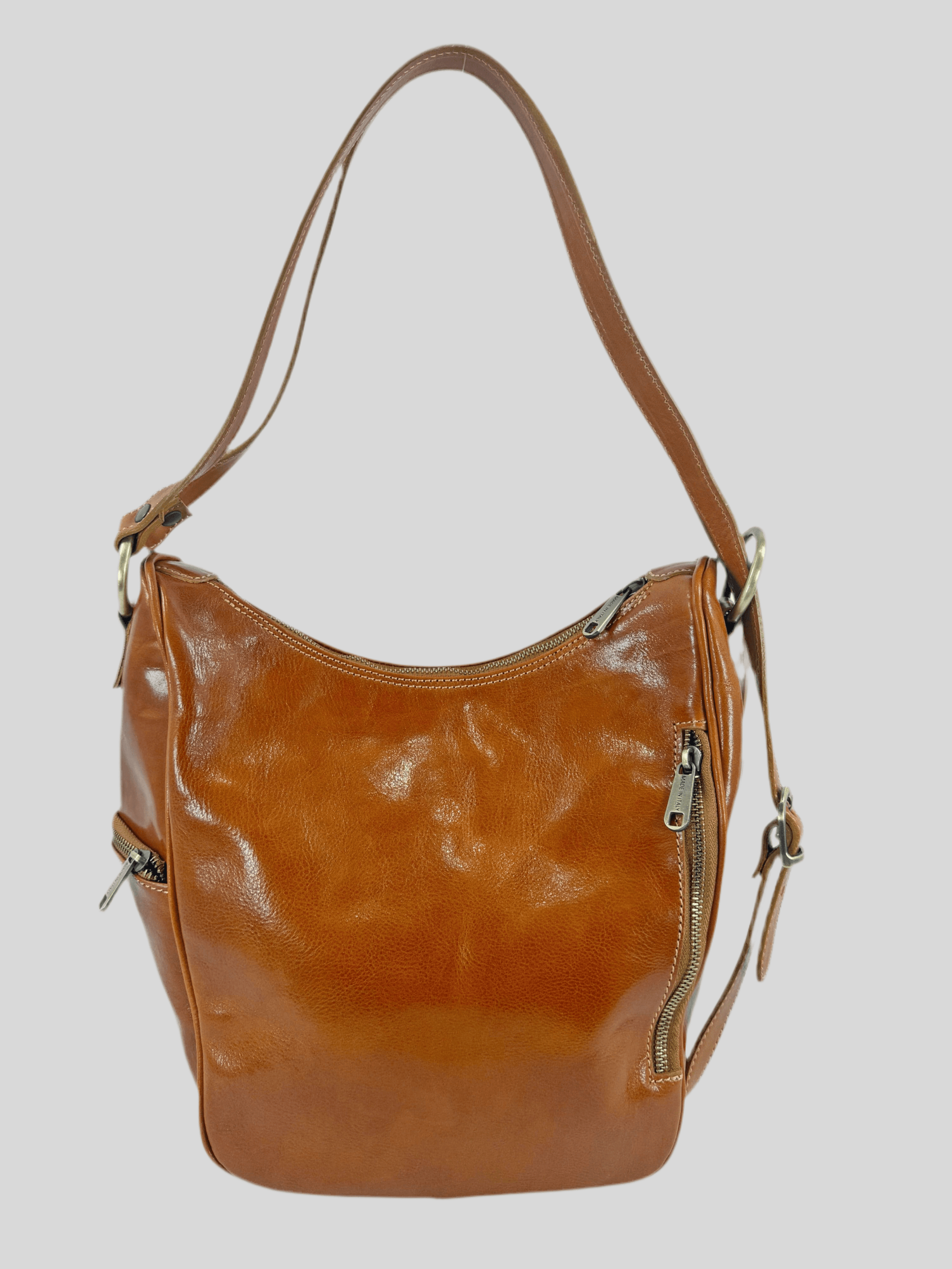 Borsa e Zaino in cuoio conciato al vegetale, chiusura con zip, interno rivestito ed accessoriato con tasche aperte e tasca chiusa da zip, sull'esterno due tasche chiuse da zip, comodo sia come borsa a spalla che come zaino, la trasformazione da borsa a zaino è semplice ed immediata, oggetto versatile , realizzato con pellami di pregio in maniera artigianale, il passare del tempo ammorbidirà il pellame e conferirà note calde al colore