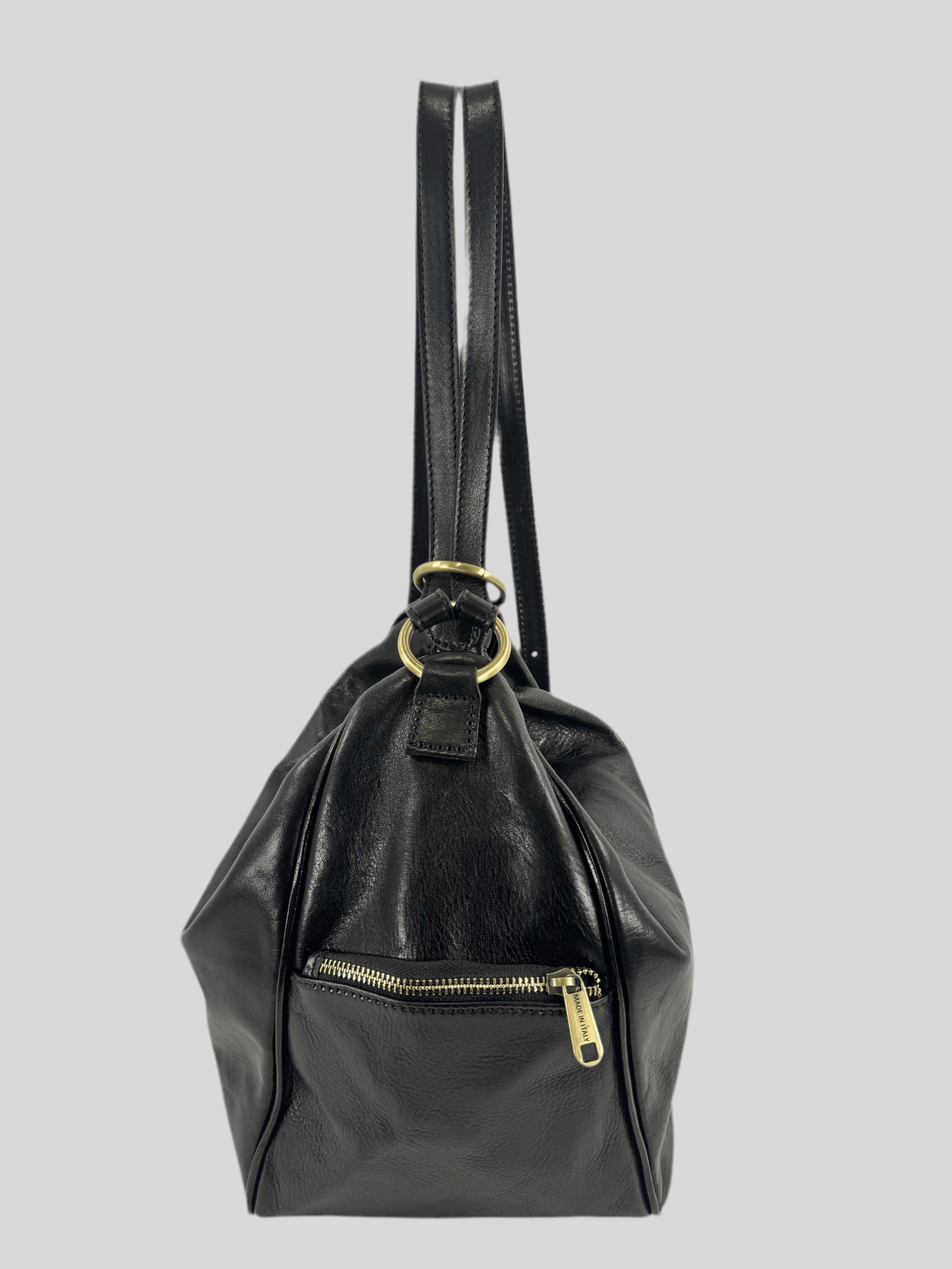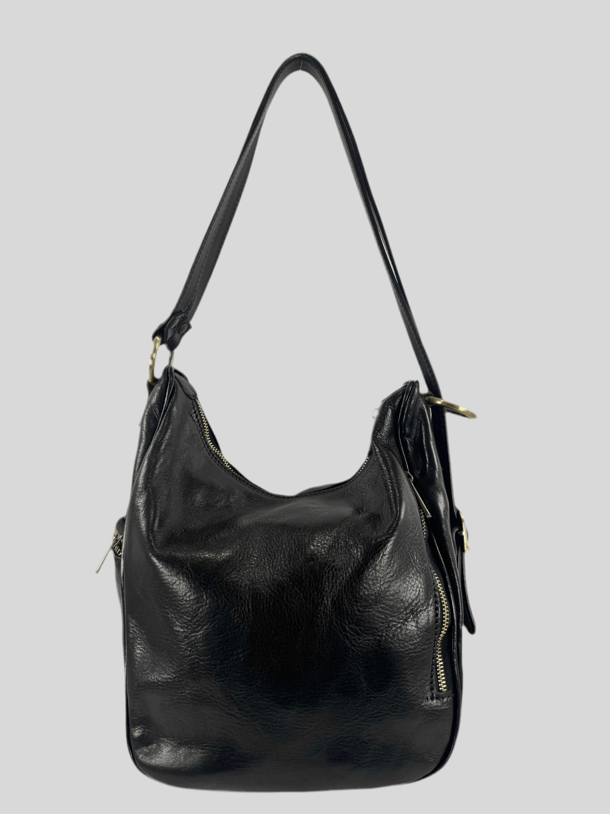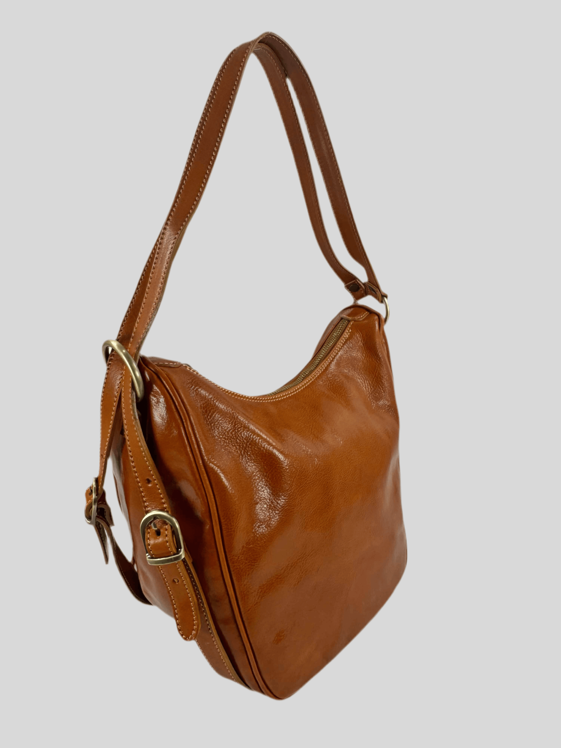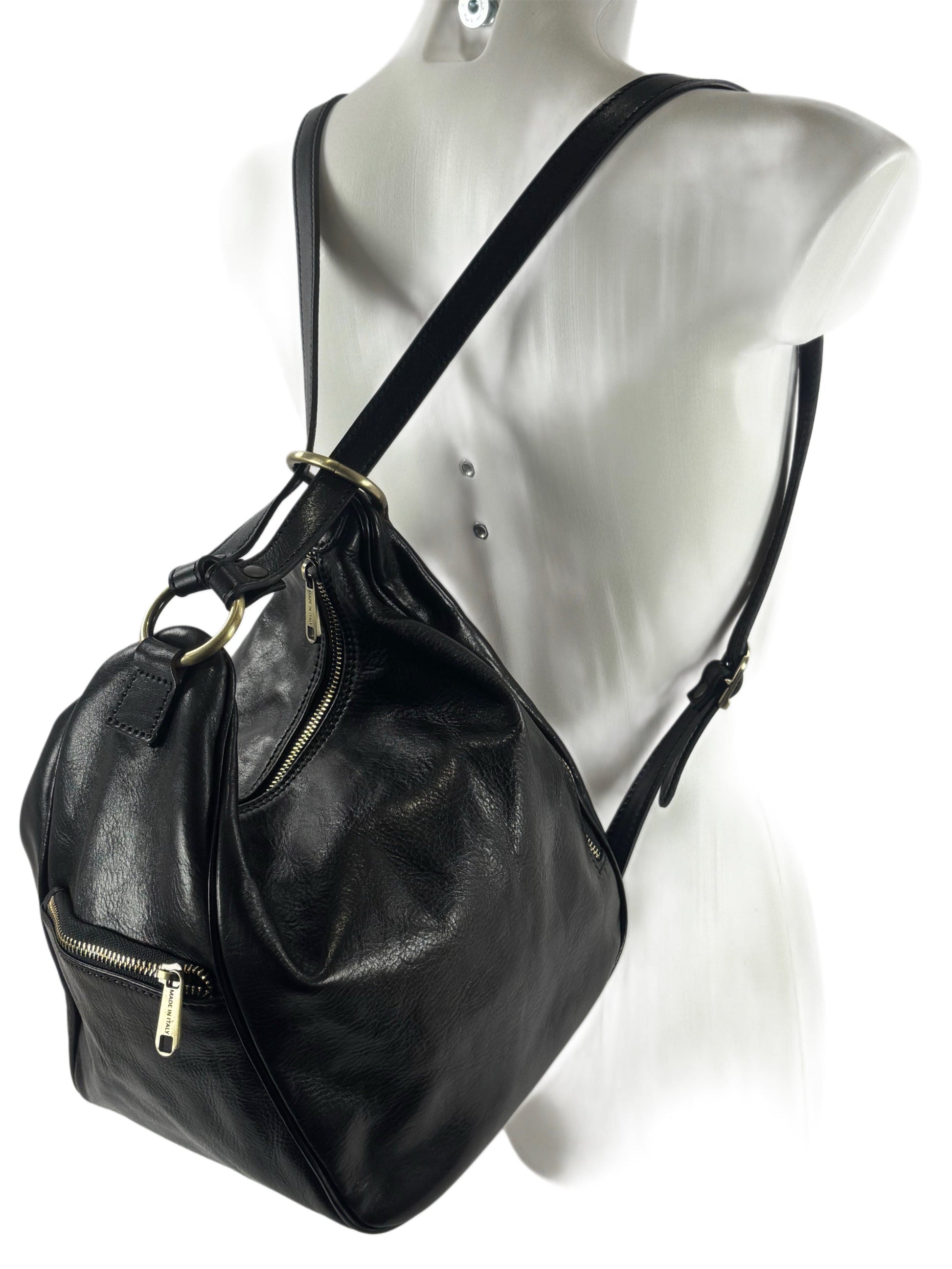 Borsa e Zaino in cuoio conciato al vegetale, chiusura con zip, interno rivestito ed accessoriato con tasche aperte e tasca chiusa da zip, sull'esterno due tasche chiuse da zip, comodo sia come borsa a spalla che come zaino, la trasformazione da borsa a zaino è semplice ed immediata, oggetto versatile , realizzato con pellami di pregio in maniera artigianale, il passare del tempo ammorbidirà il pellame e conferirà note calde al colore