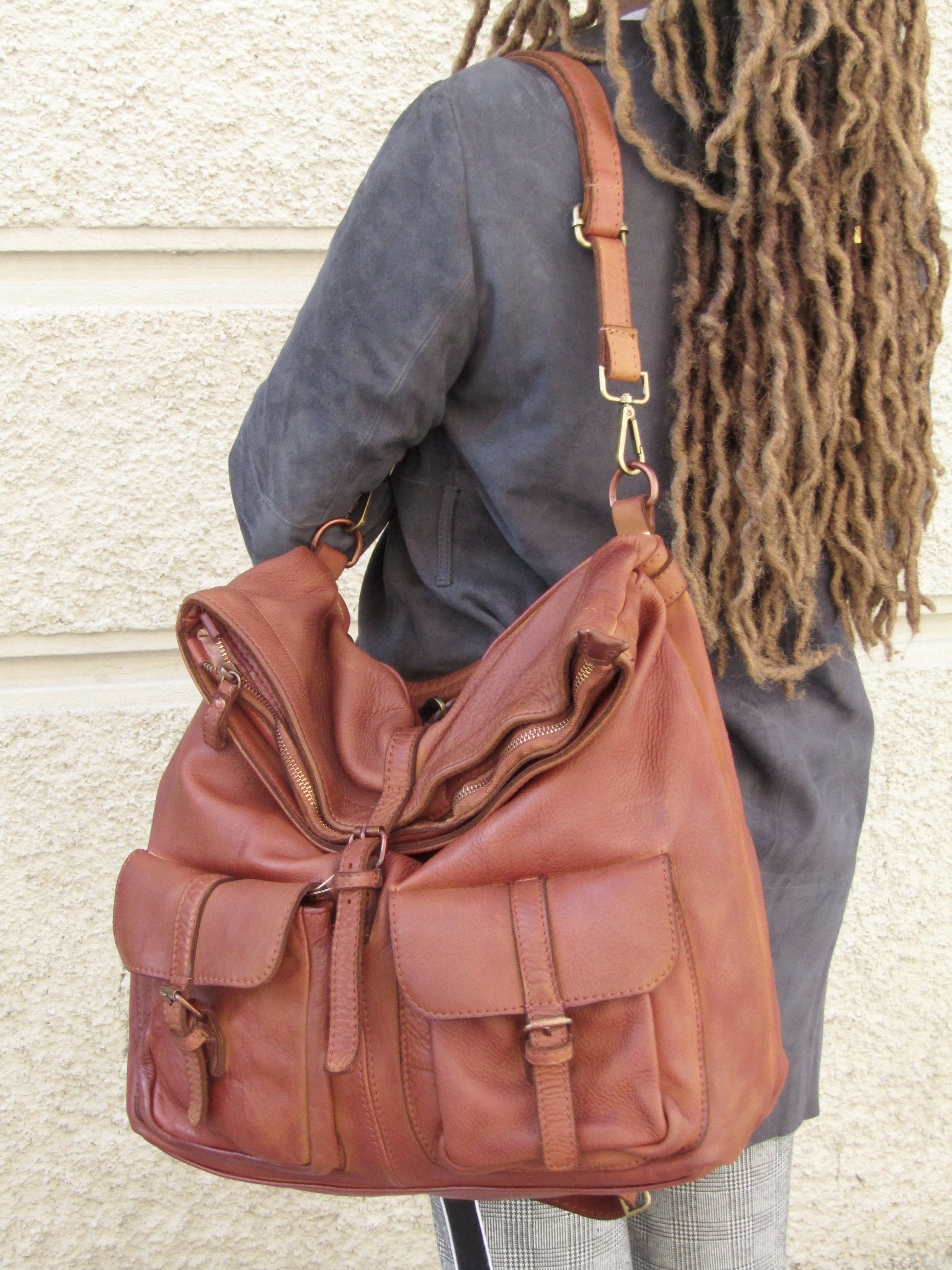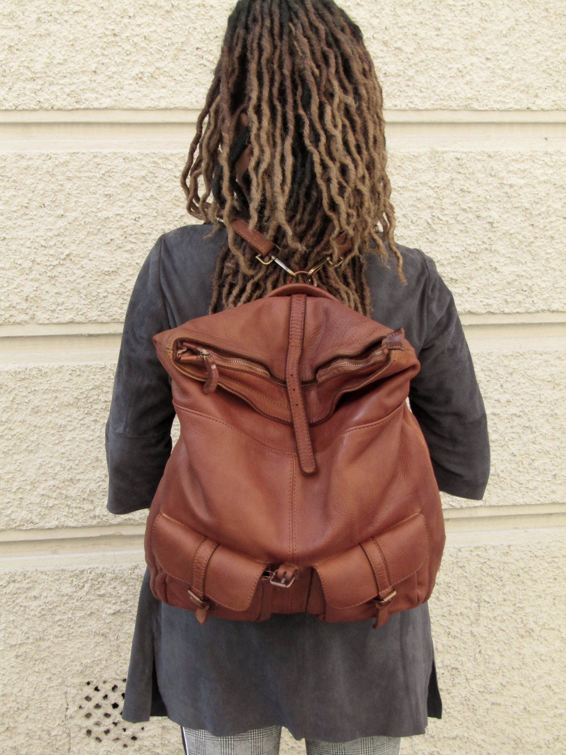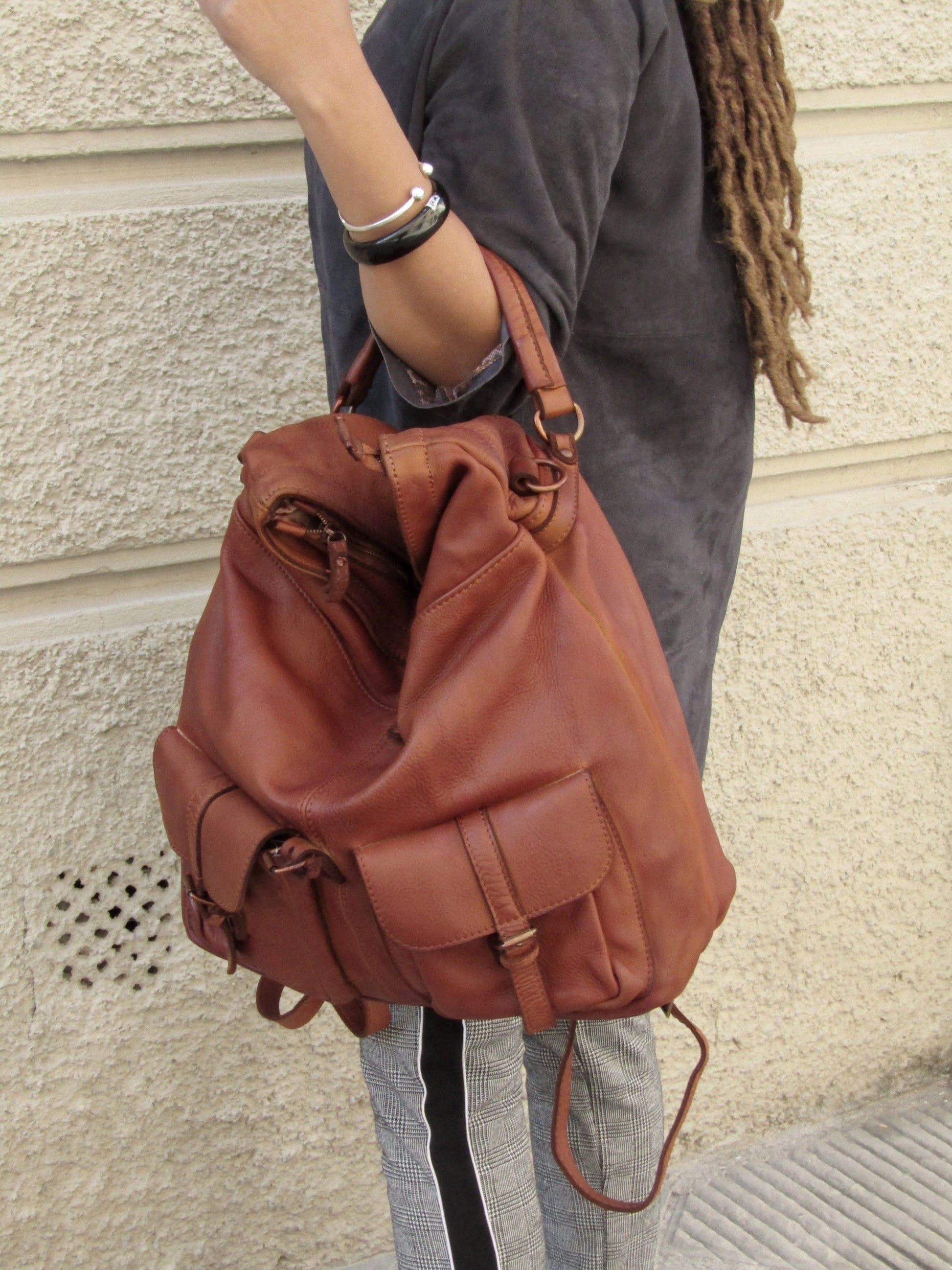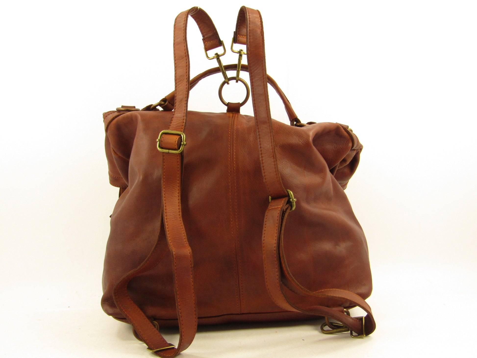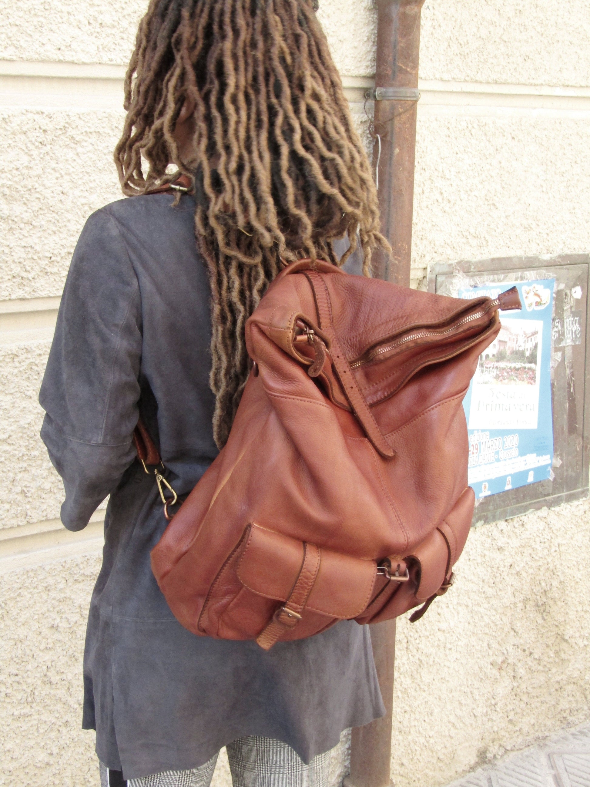 Borsa e zaino in vacchetta tinta in capo, chiusura con zip e fibbietta, tracolle in pelle regolabili e rimovibili, interno rivestito organizzato con tasca chiusa da zip e tasca porta accessori aperta, sull’esterno due tasche chiuse da fibbietta, borsa morbida, con effetto vintage donato dalla tintura in capo, multifunzione, si indossa a spalla, a mano, a tracolla ed è anche un bellissimo zaino. Accessorio dal carattere marcato e dalle sfumature inconfondibili, costruita in maniera artigianale in Toscana a Firenze con pellami di alta qualità da veri maestri del cuoio