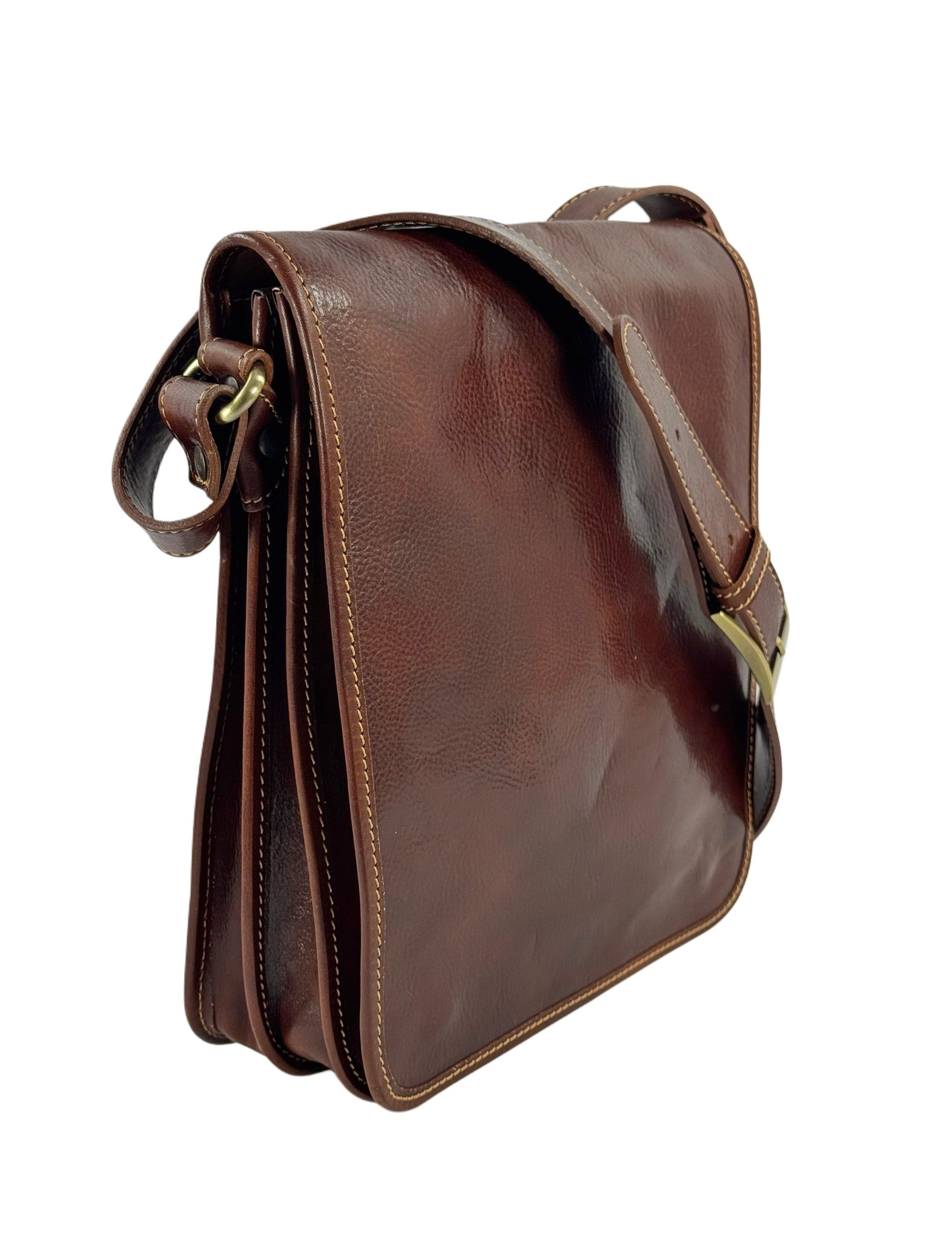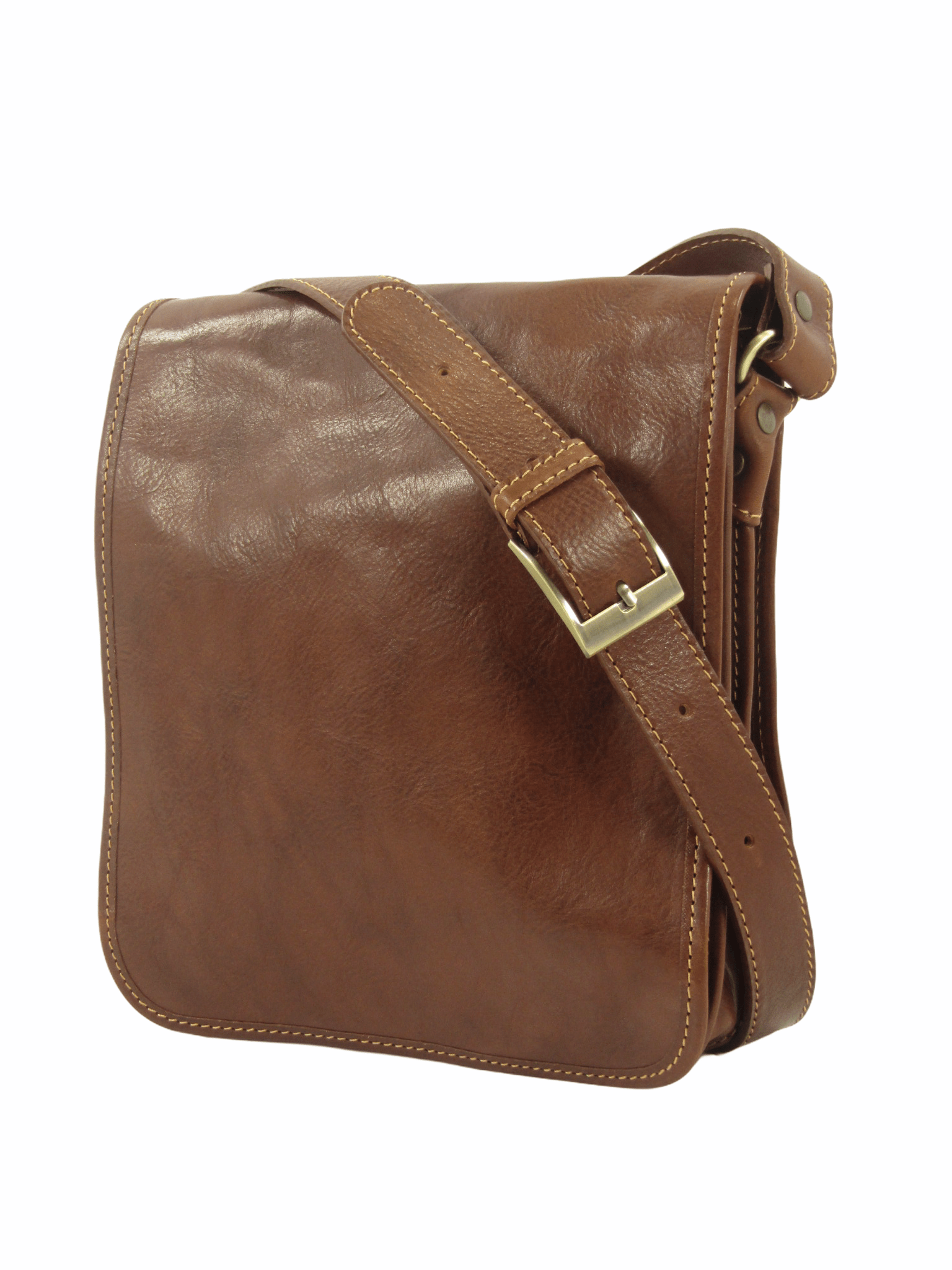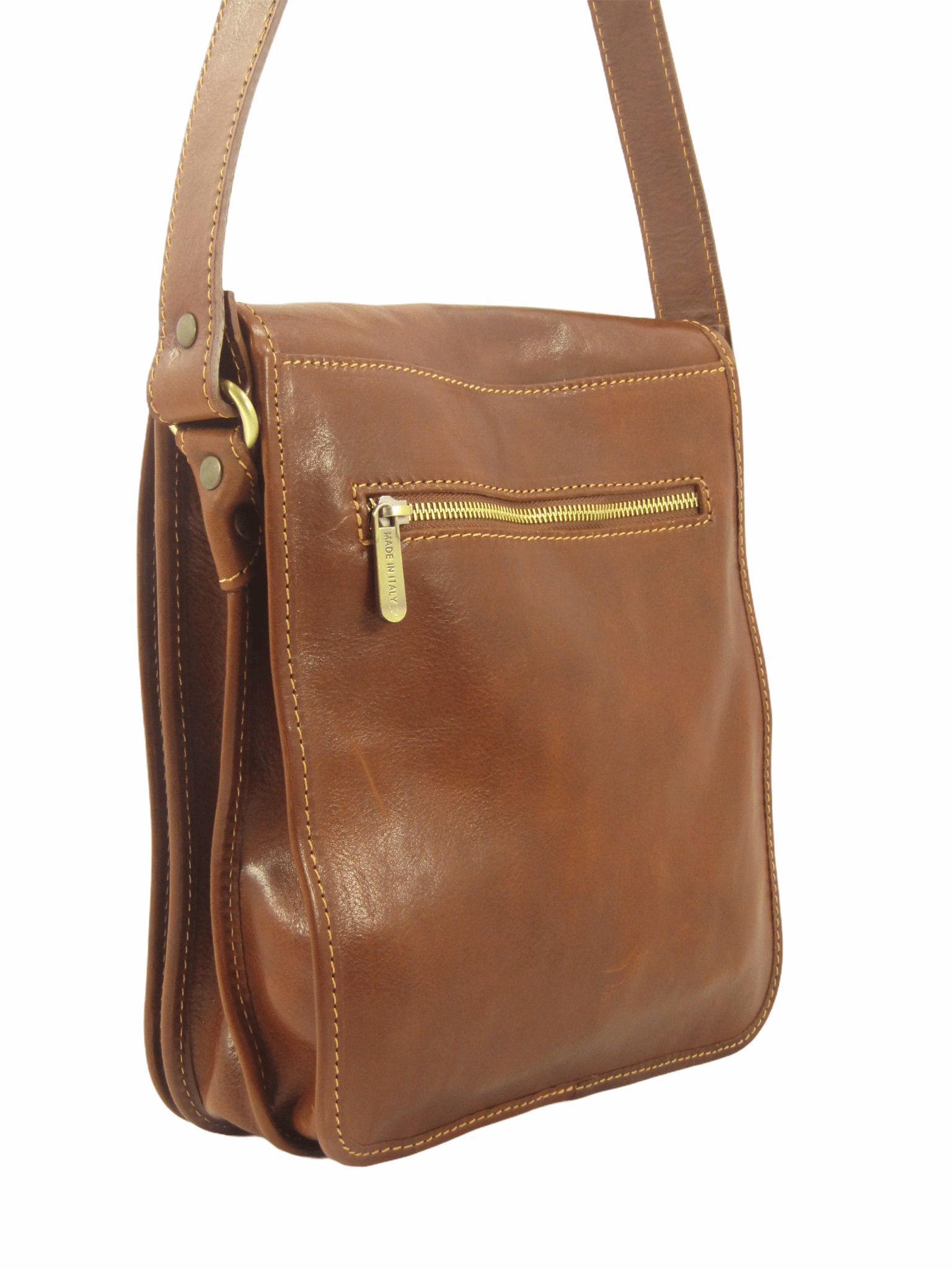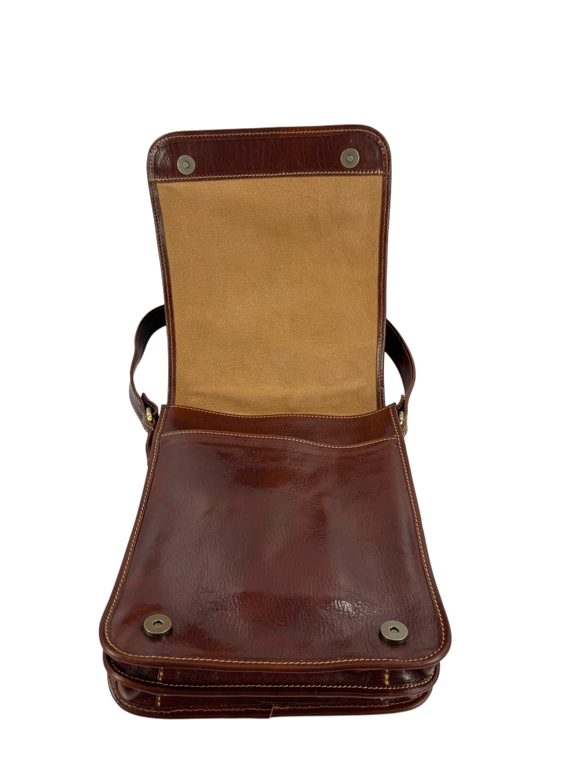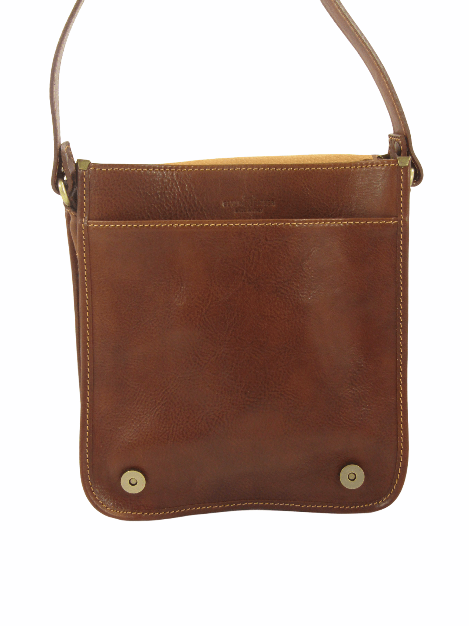 Classica tracolla in cuoio primo fiore conciato al vegetale, chiusura con pattina fermata da clip magnetiche, interno diviso in tre scomparti ed accessoriato da porta accessori e tasca chiusa da zip, tracolla in pelle regolabile e rimovibile, borsa comoda e robusta, costruita con pellami di alta qualità in maniera artigianale in Toscana.