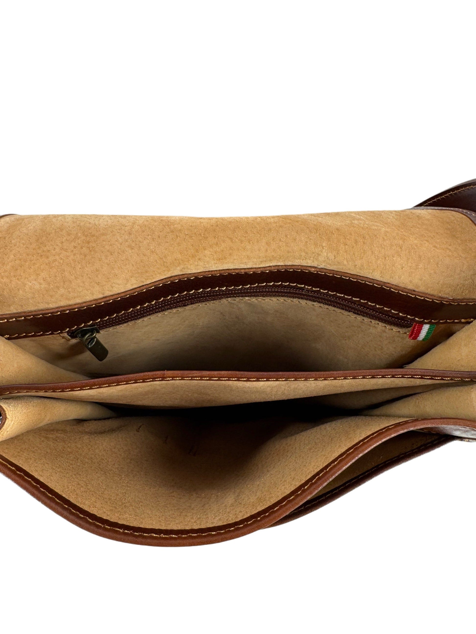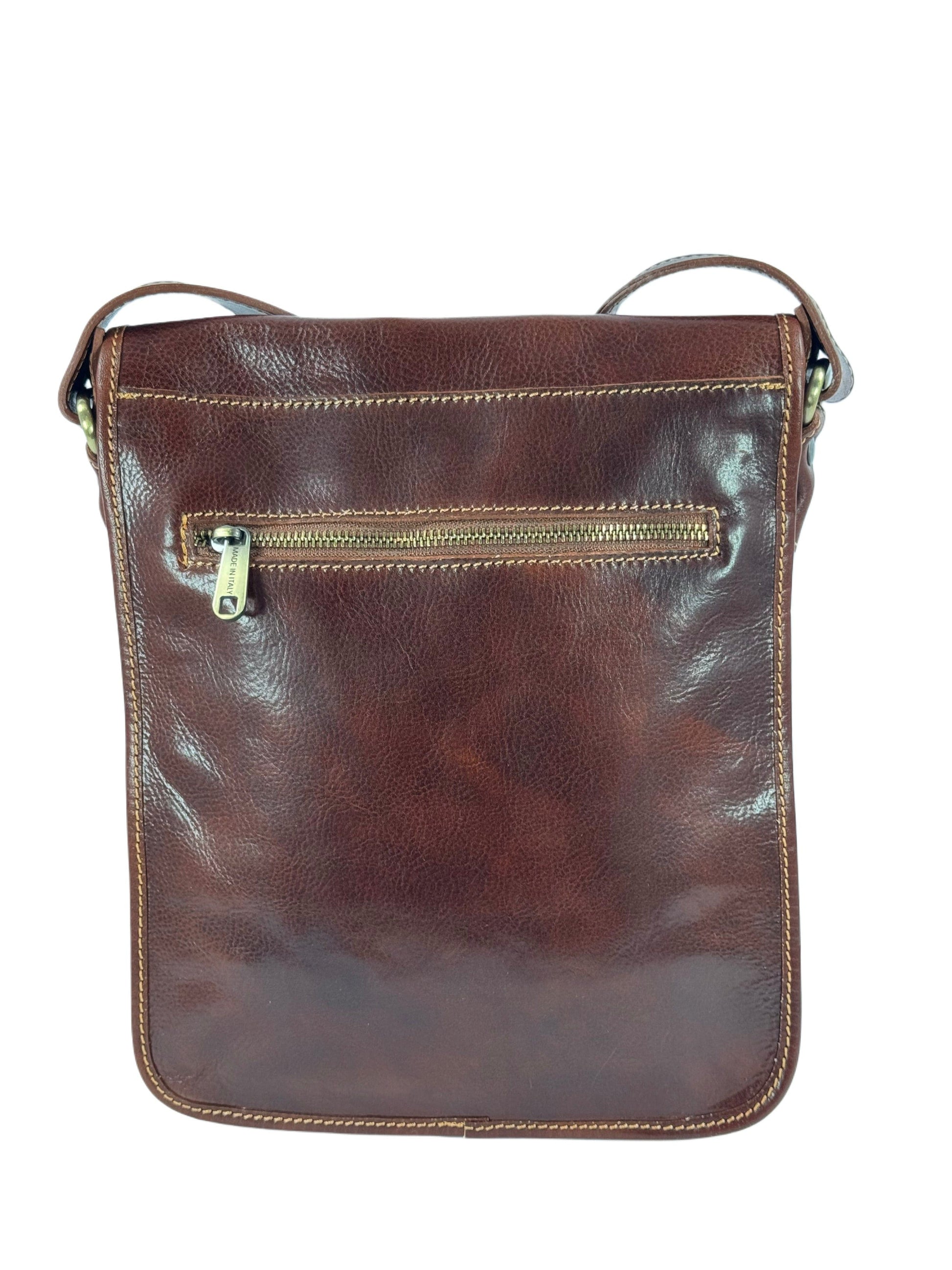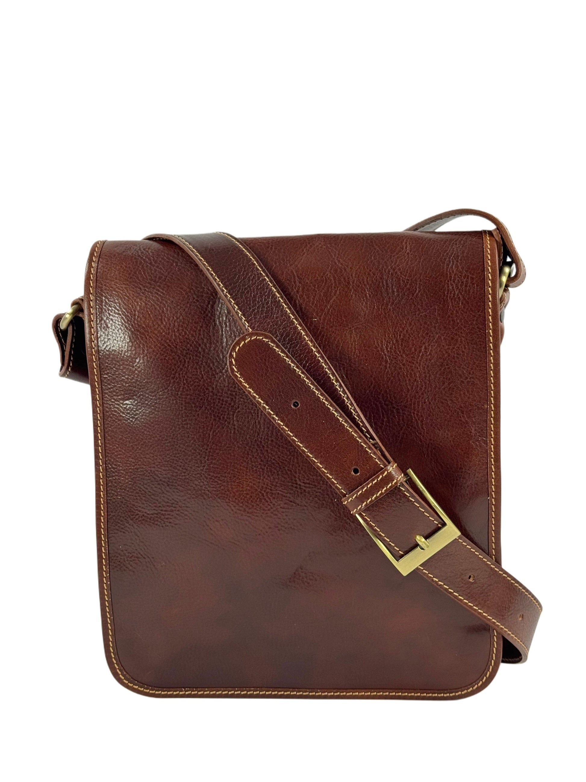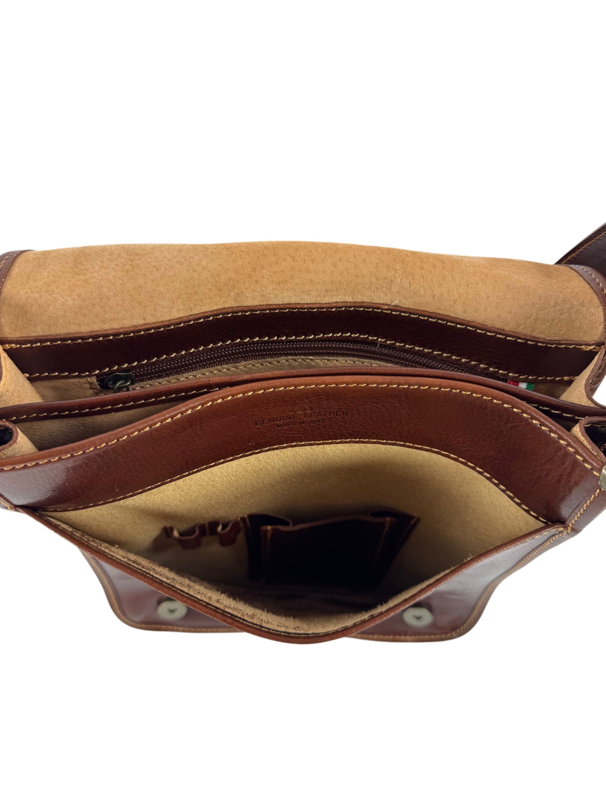 Classica tracolla in cuoio primo fiore conciato al vegetale, chiusura con pattina fermata da clip magnetiche, interno diviso in tre scomparti ed accessoriato da porta accessori e tasca chiusa da zip, tracolla in pelle regolabile e rimovibile, borsa comoda e robusta, costruita con pellami di alta qualità in maniera artigianale in Toscana.