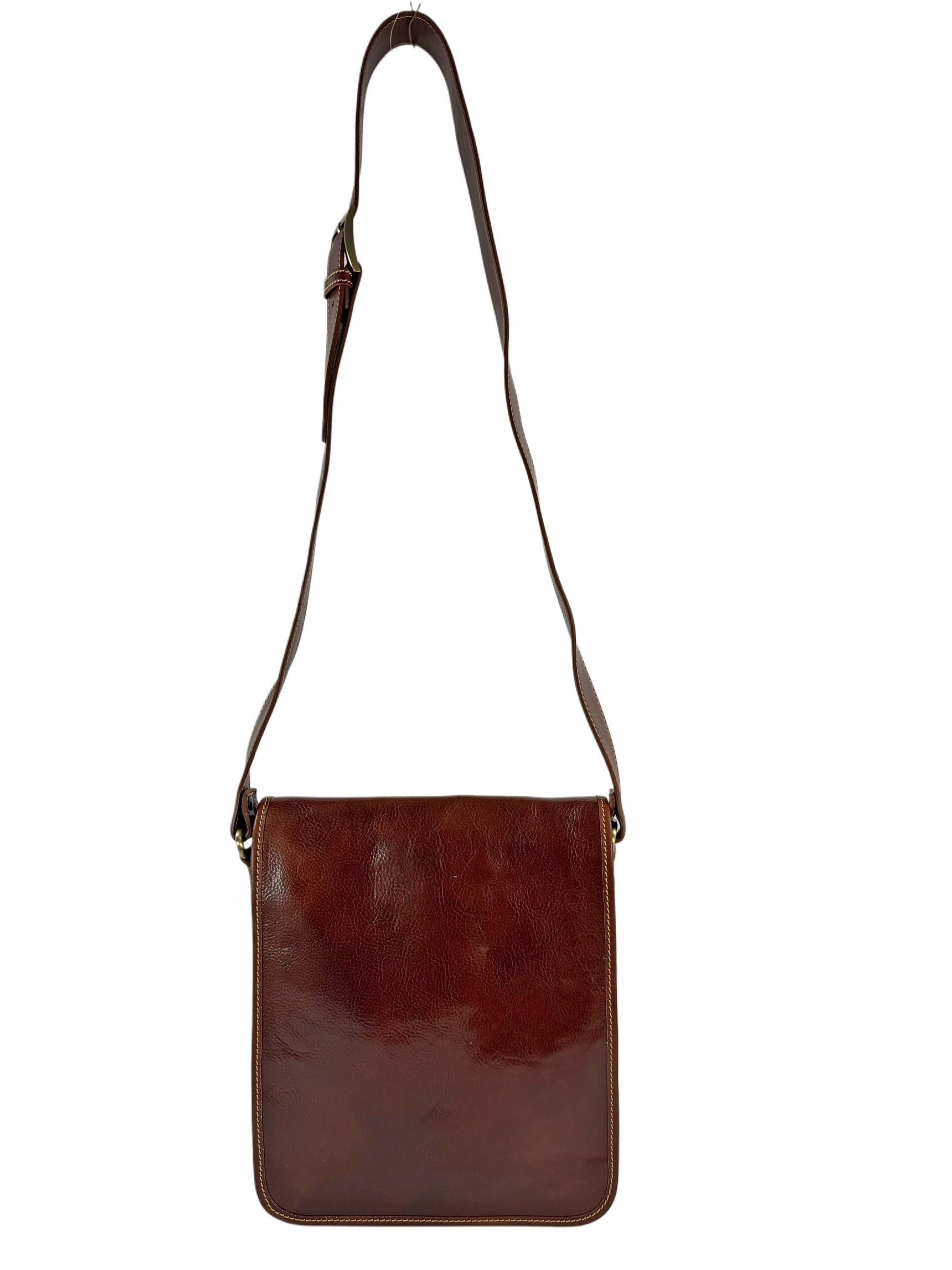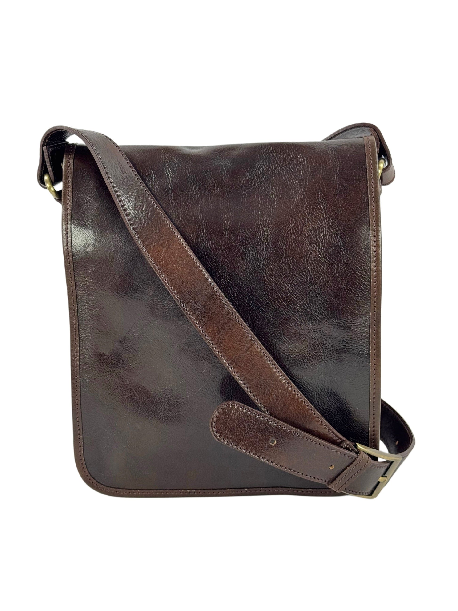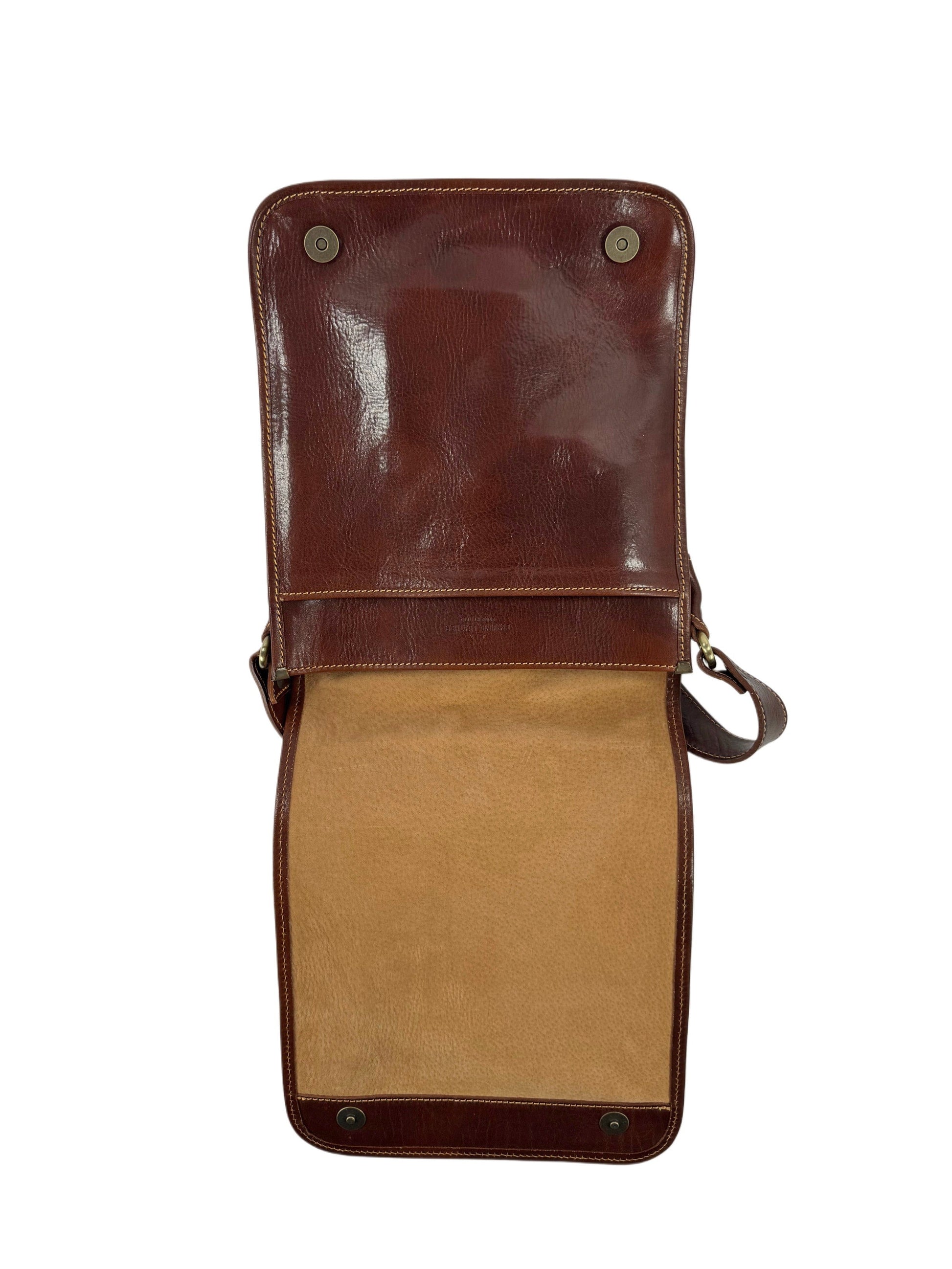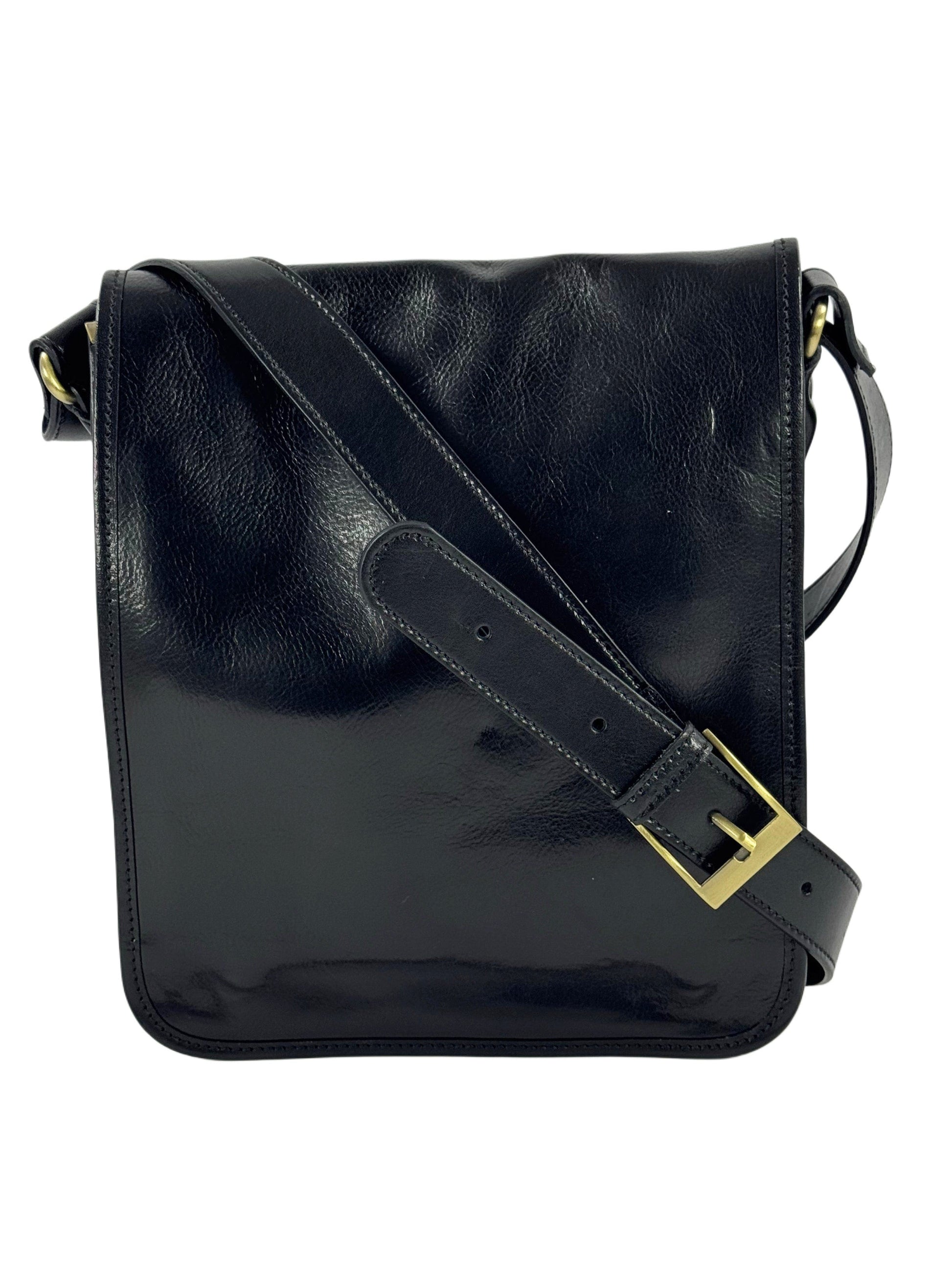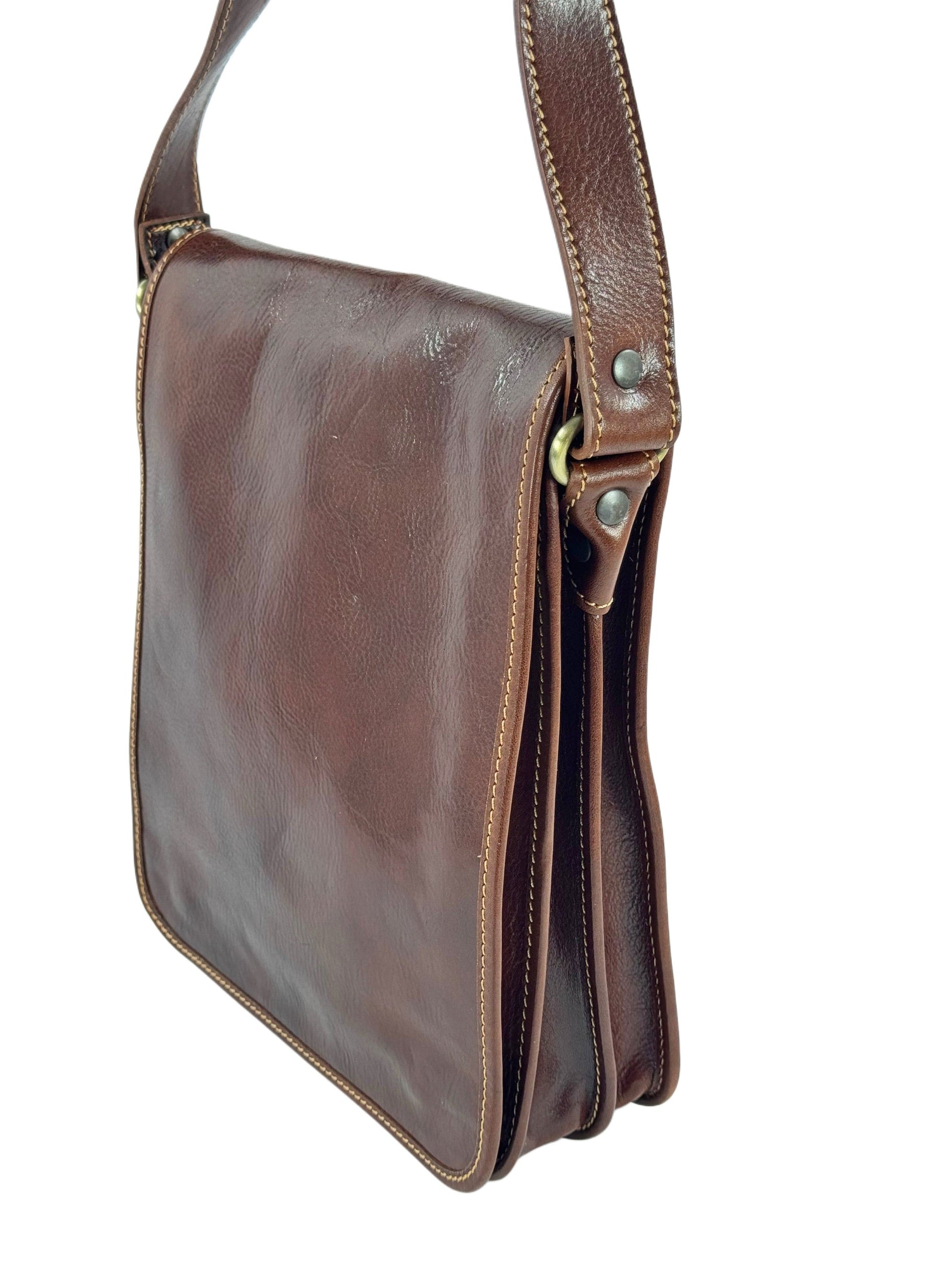 Classica tracolla in cuoio primo fiore conciato al vegetale, chiusura con pattina fermata da clip magnetiche, interno diviso in tre scomparti ed accessoriato da porta accessori e tasca chiusa da zip, tracolla in pelle regolabile e rimovibile, borsa comoda e robusta, costruita con pellami di alta qualità in maniera artigianale in Toscana.