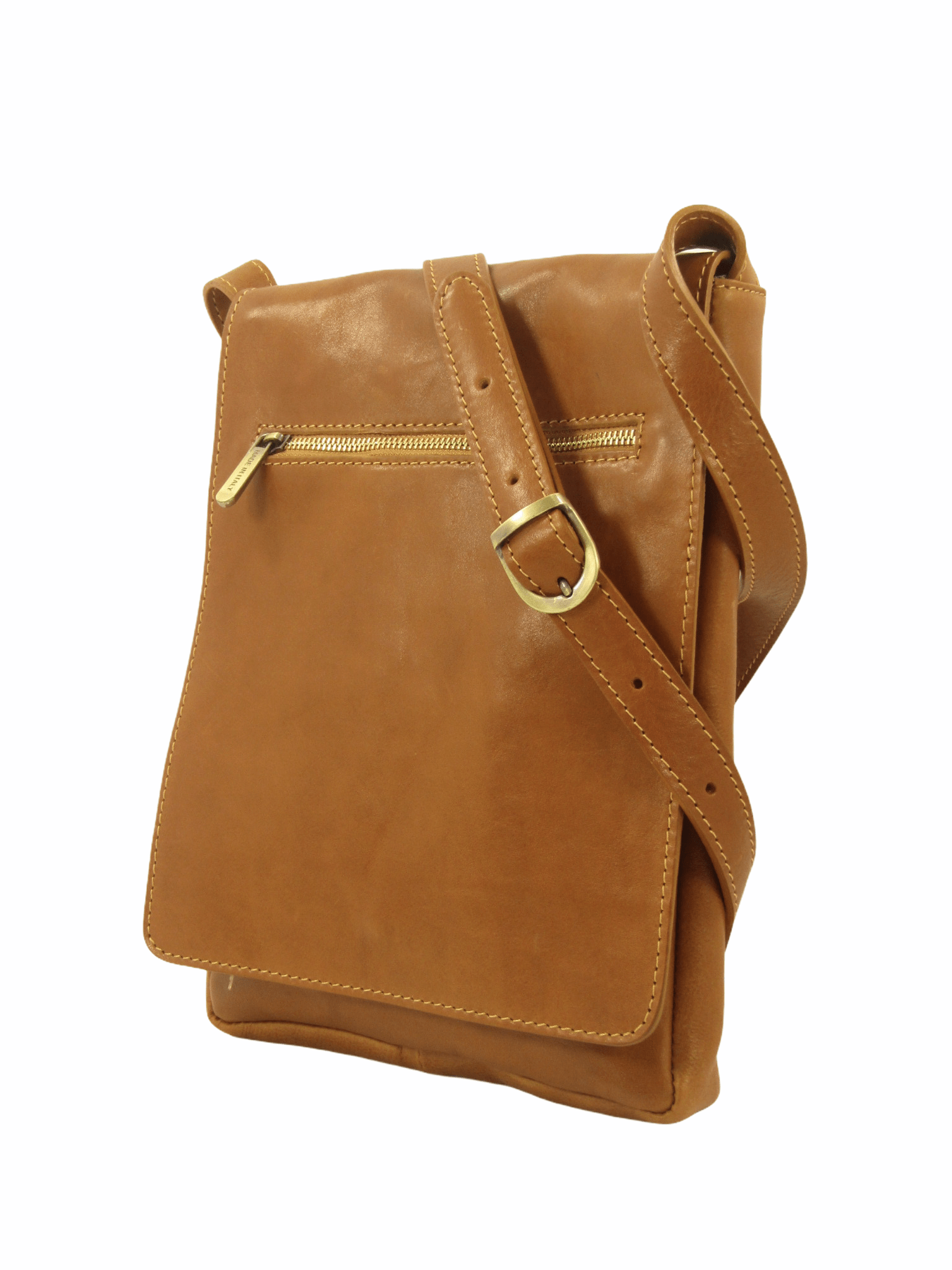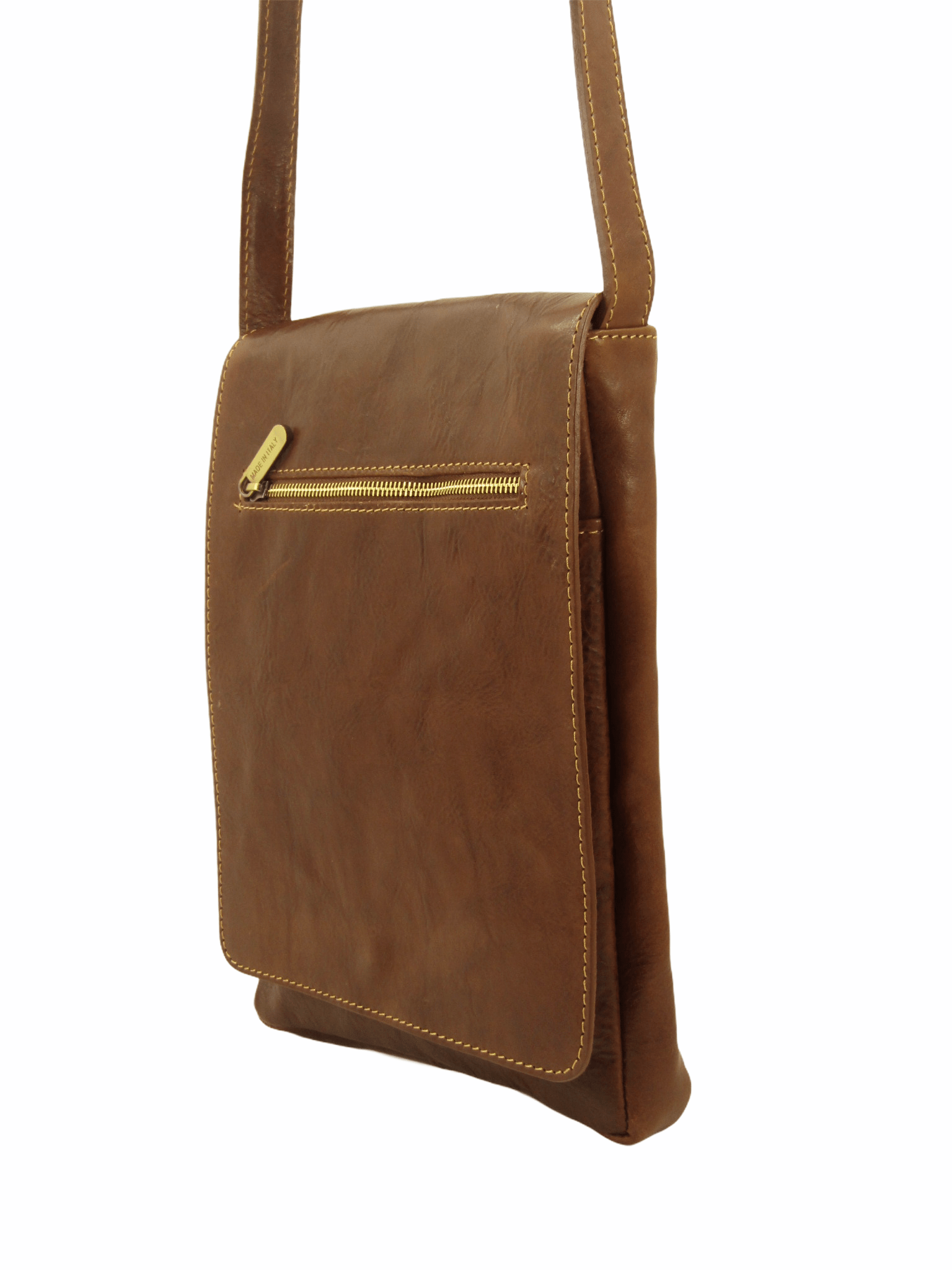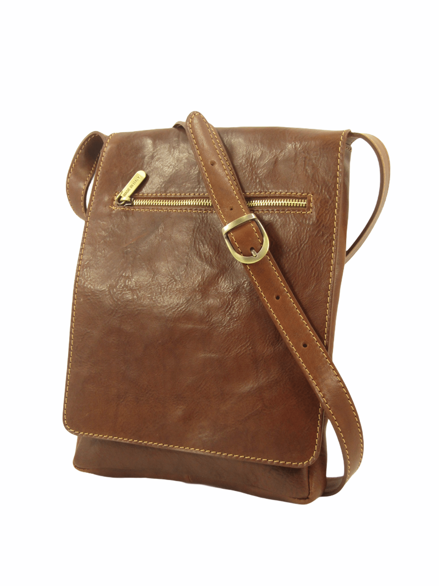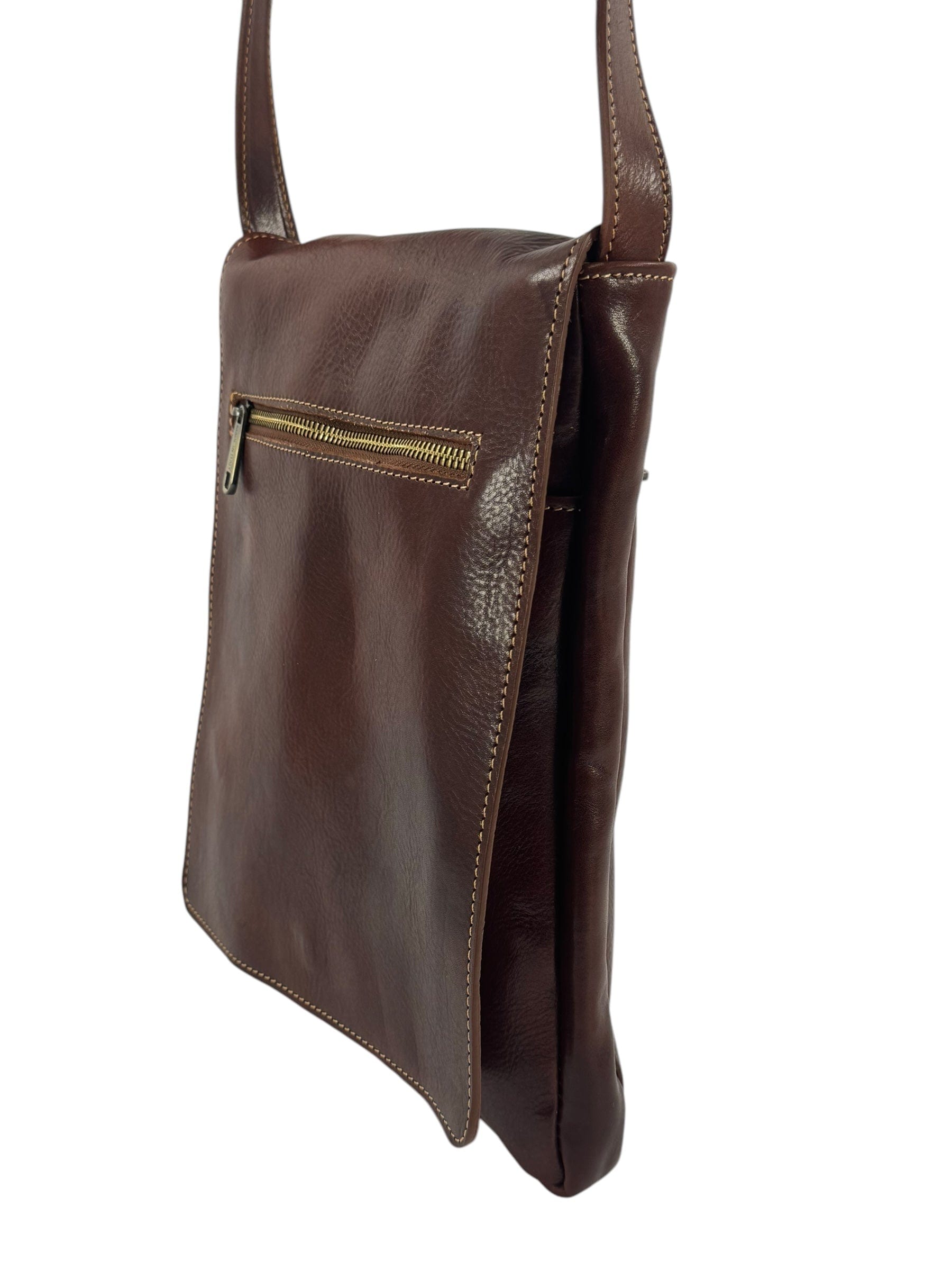 Borsello a tracolla in cuoio conciato al vegetale, chiusura con patina fermata da clip magnetica, tracolla in pelle regolabile, interno rivestito diviso in due scomparti accessoriati con tasca chiusa da zip e porta accessori, sull'esterno tasca chiusa da zip sulla patina e tasca chiusa da zip sul retro, comodo informale, adatto per la vita di tutti i giorni, realizzato con pellami di pregio in maniera artigianale