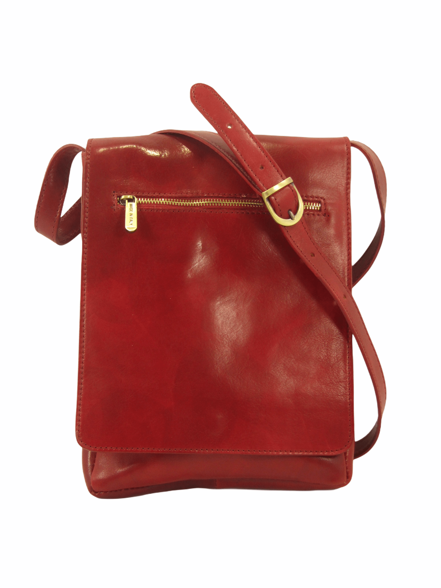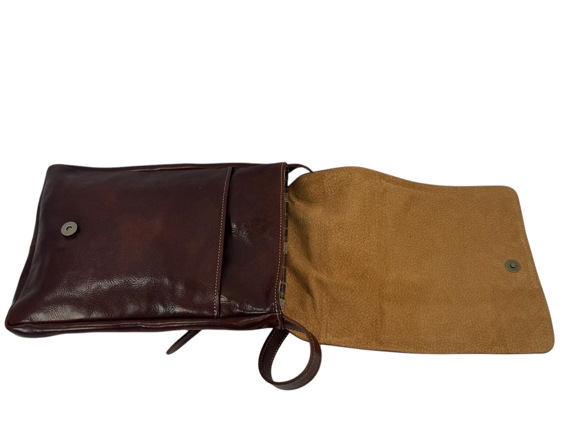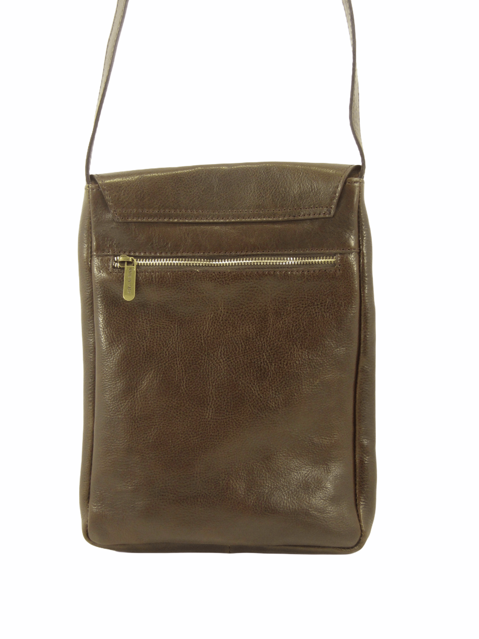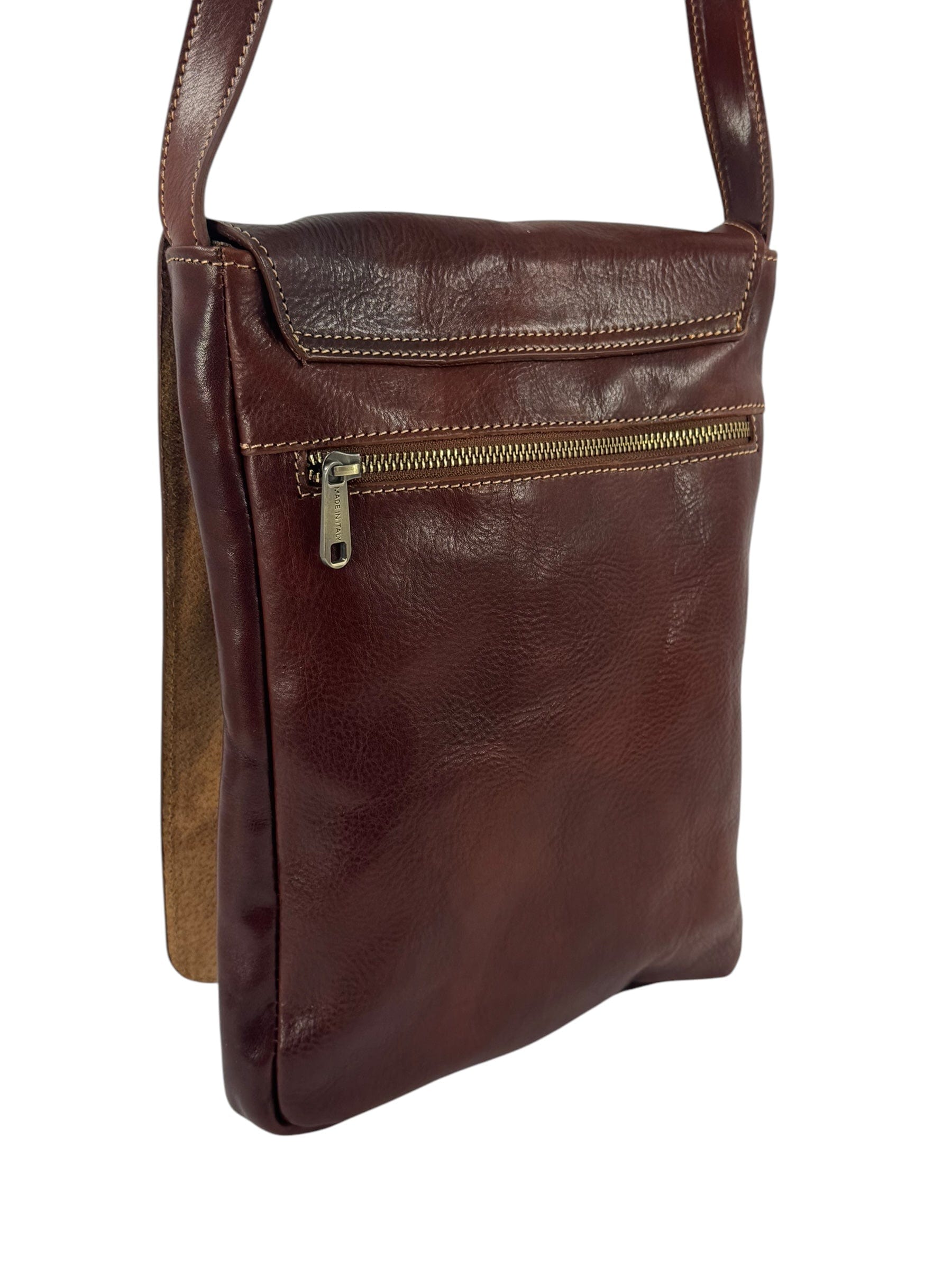 Borsello a tracolla in cuoio conciato al vegetale, chiusura con patina fermata da clip magnetica, tracolla in pelle regolabile, interno rivestito diviso in due scomparti accessoriati con tasca chiusa da zip e porta accessori, sull'esterno tasca chiusa da zip sulla patina e tasca chiusa da zip sul retro, comodo informale, adatto per la vita di tutti i giorni, realizzato con pellami di pregio in maniera artigianale