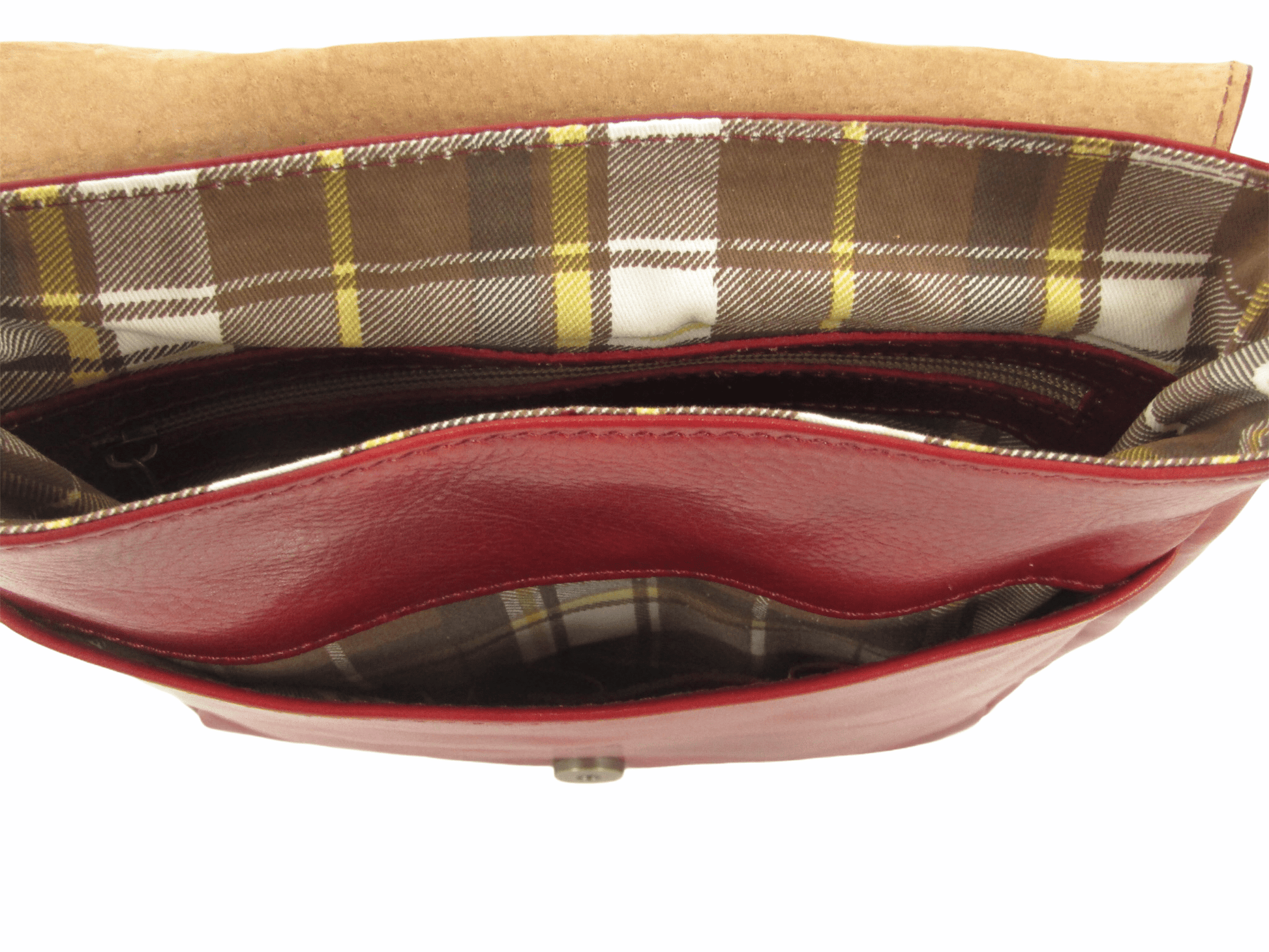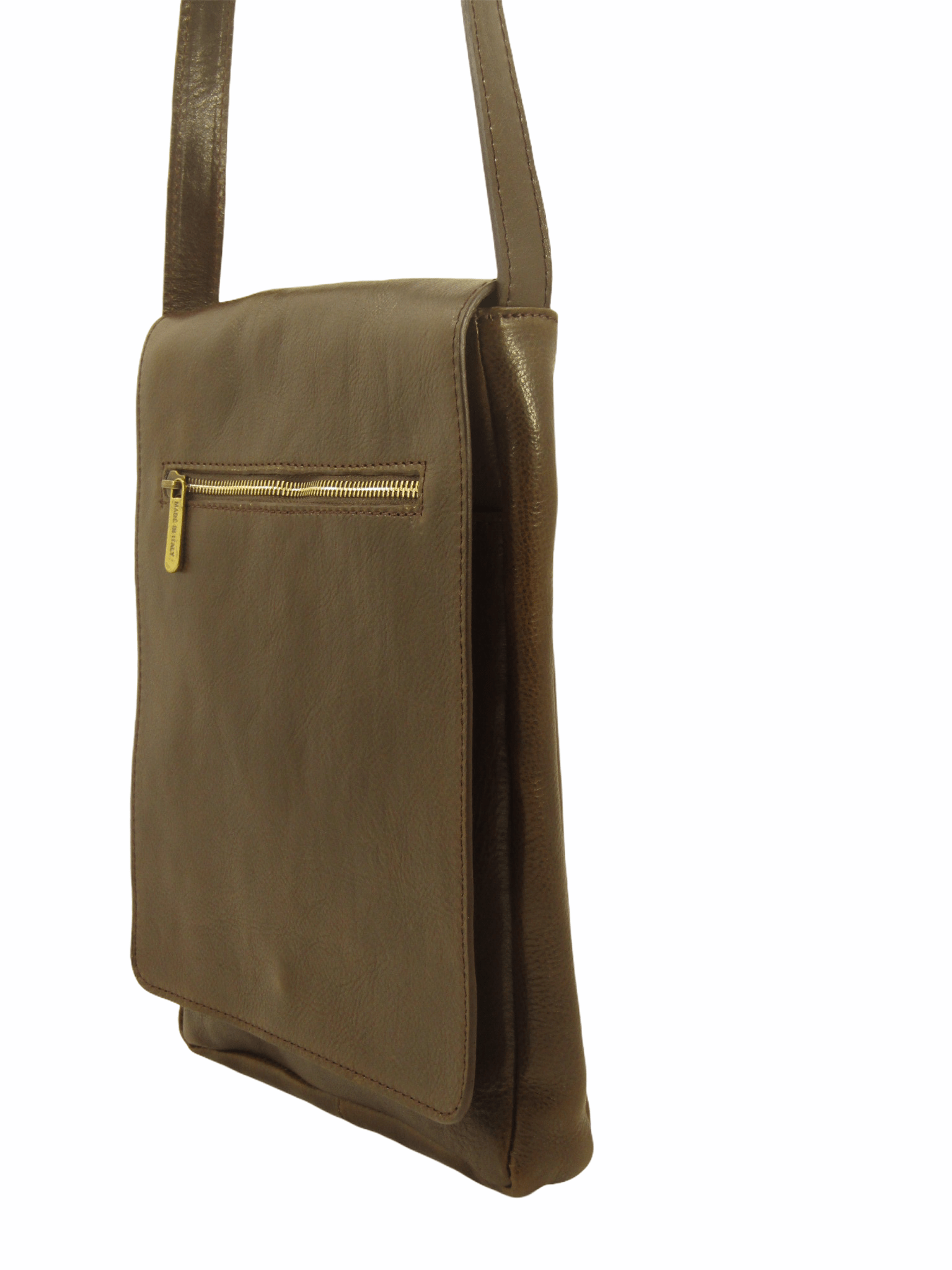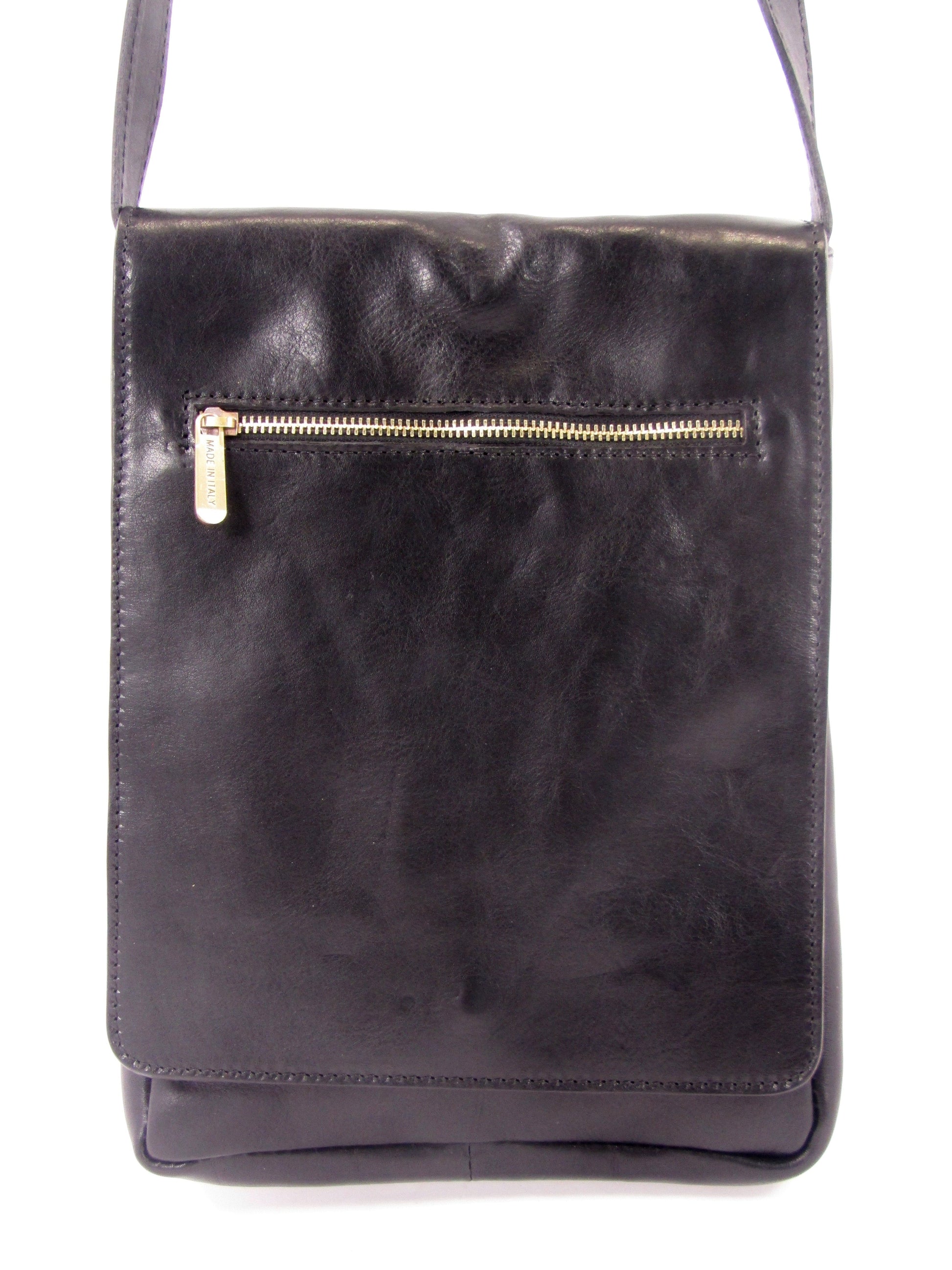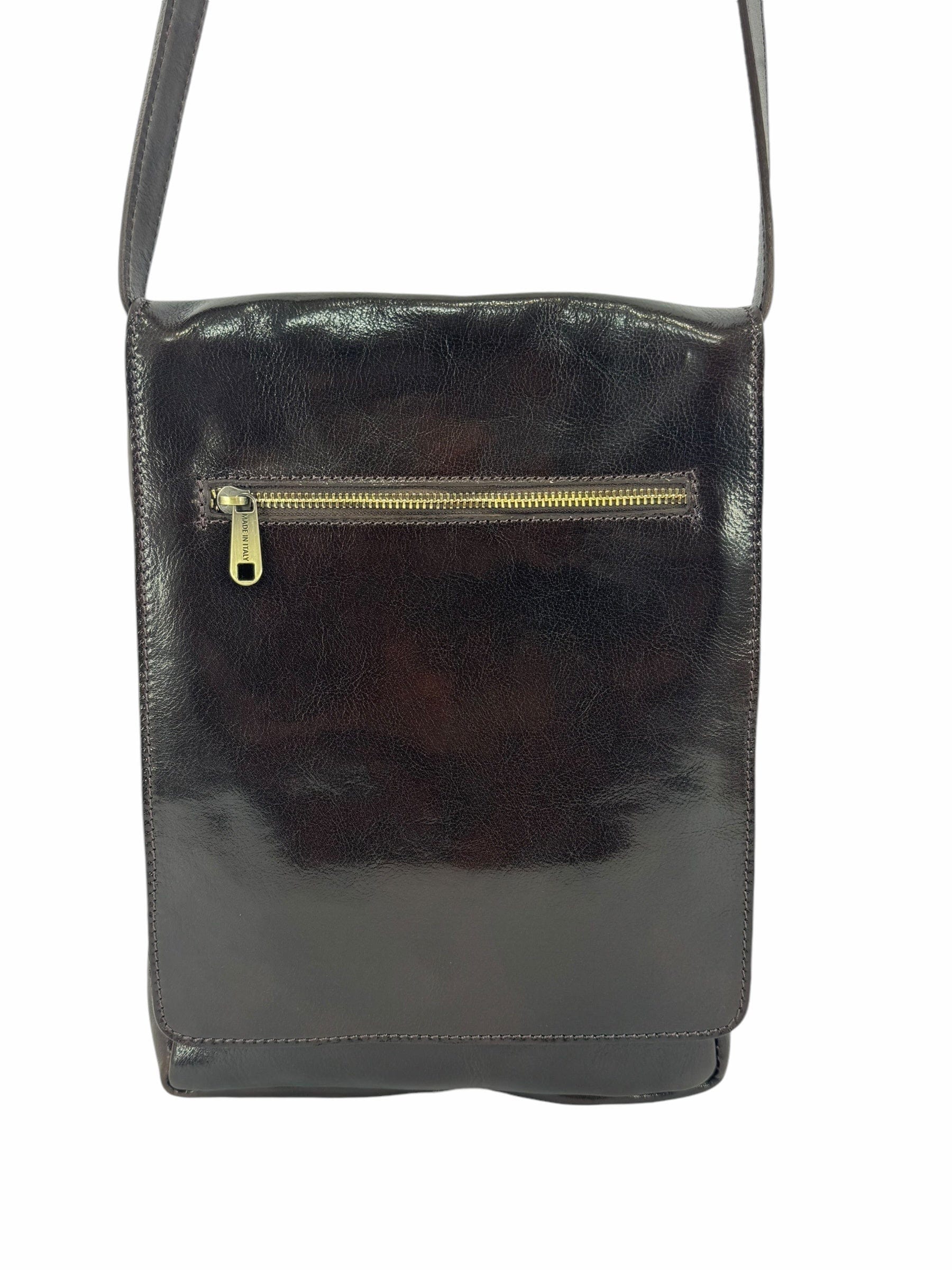 Borsello a tracolla in cuoio conciato al vegetale, chiusura con patina fermata da clip magnetica, tracolla in pelle regolabile, interno rivestito diviso in due scomparti accessoriati con tasca chiusa da zip e porta accessori, sull'esterno tasca chiusa da zip sulla patina e tasca chiusa da zip sul retro, comodo informale, adatto per la vita di tutti i giorni, realizzato con pellami di pregio in maniera artigianale