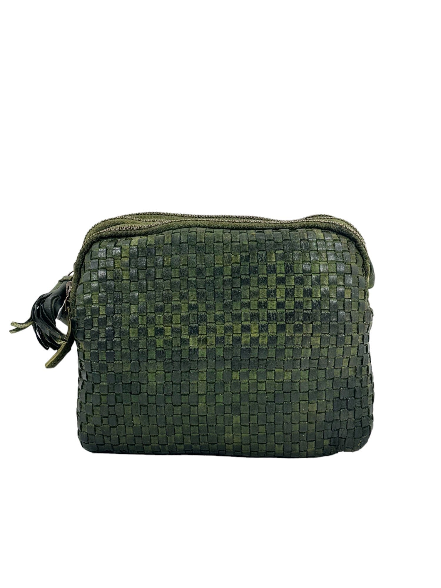 Borsetta a tracolla o spalla in pelle tinta in capo con frontale intrecciato, piccol, comoda e ben organizzata con i suoi tre scomparti separati, colori caldi, senza stagioni, realizzata in maniera artigianale