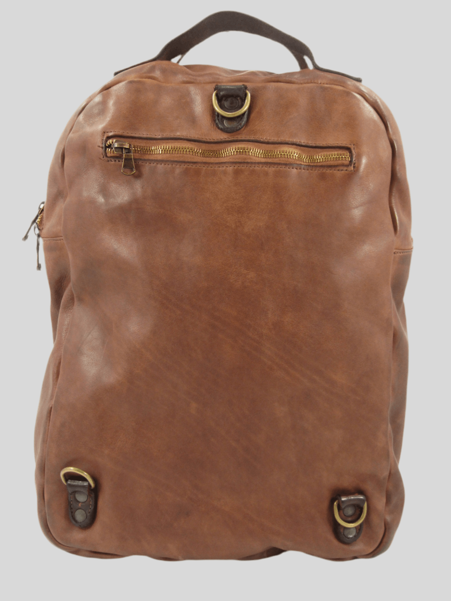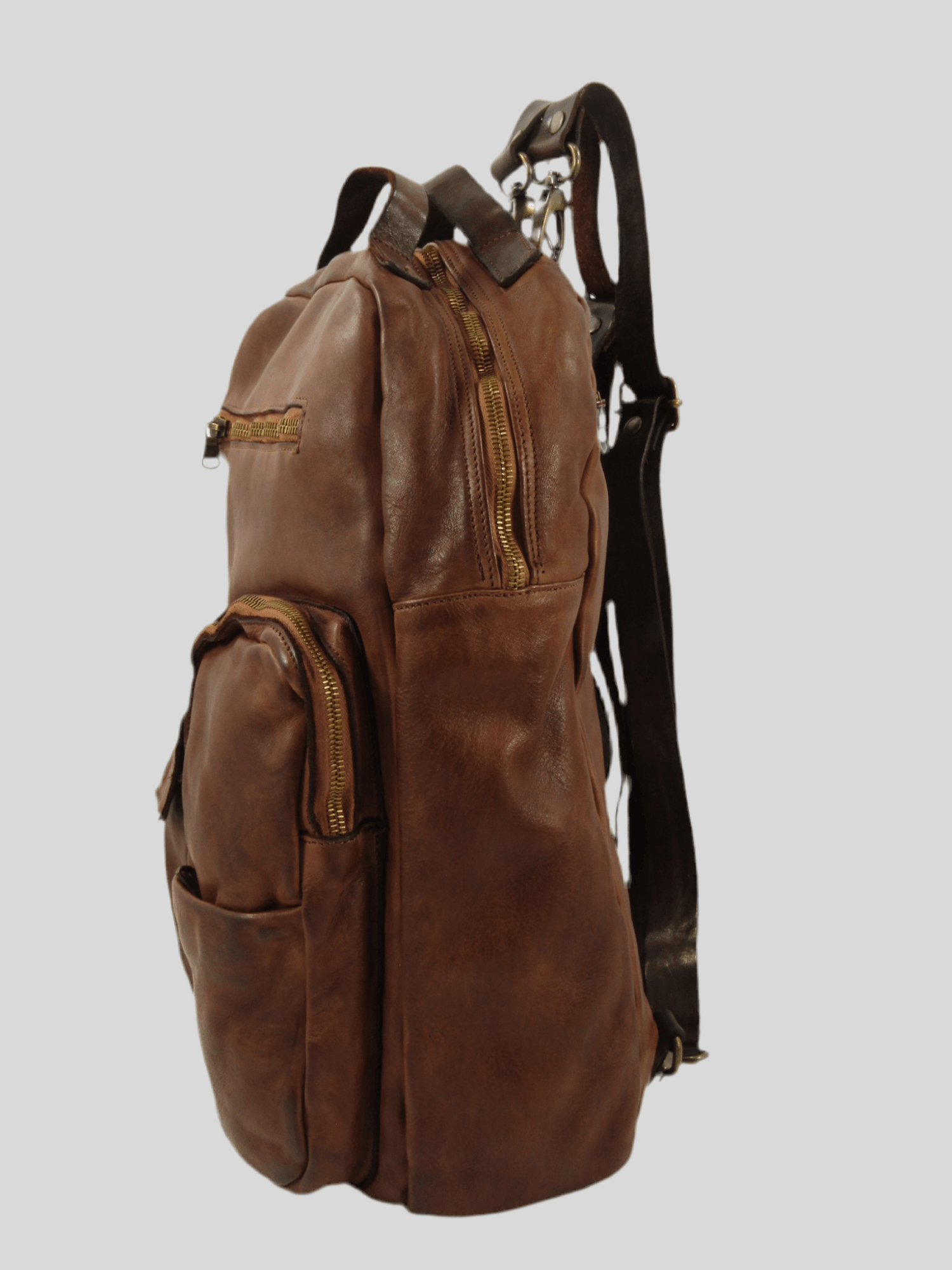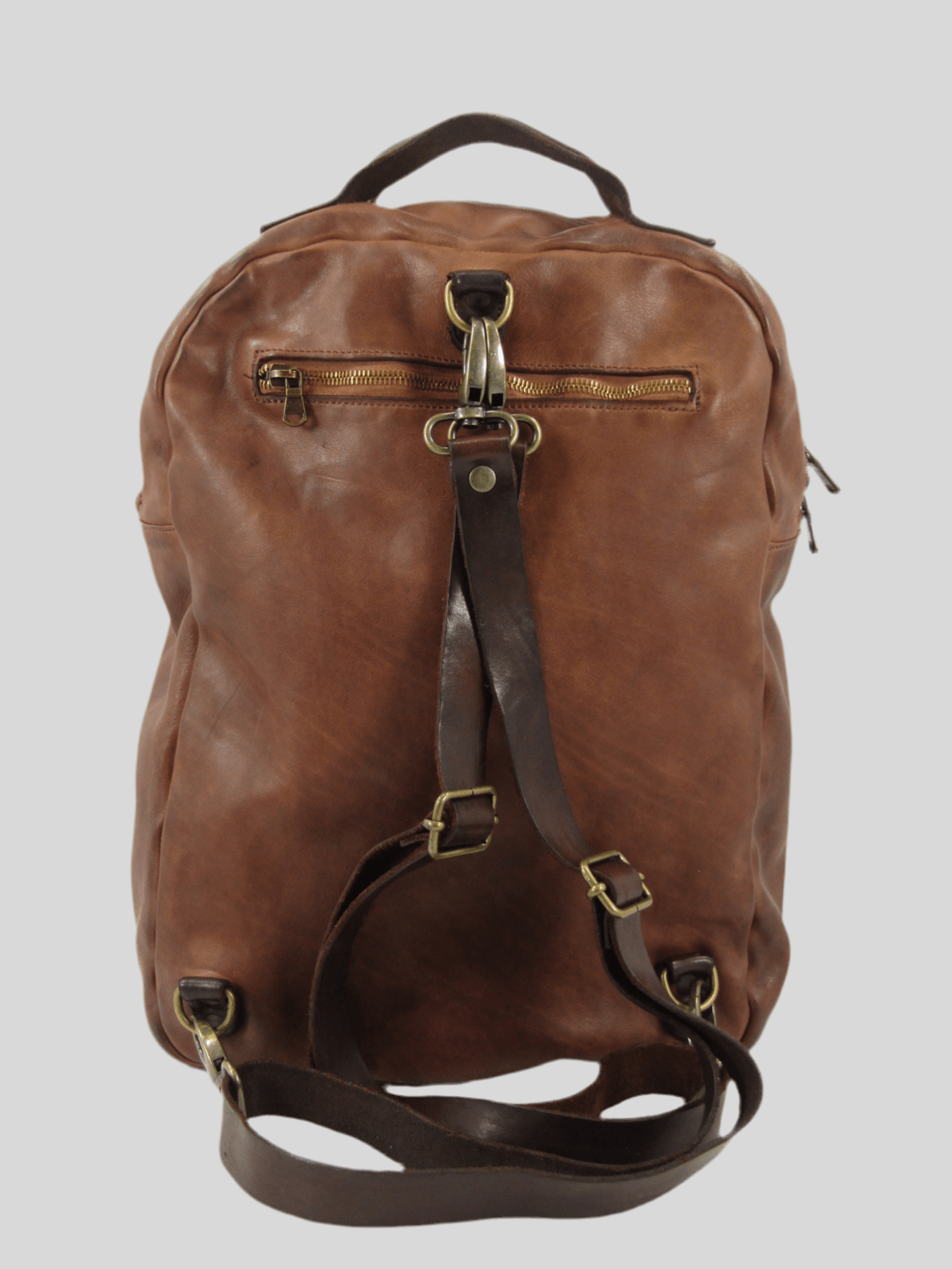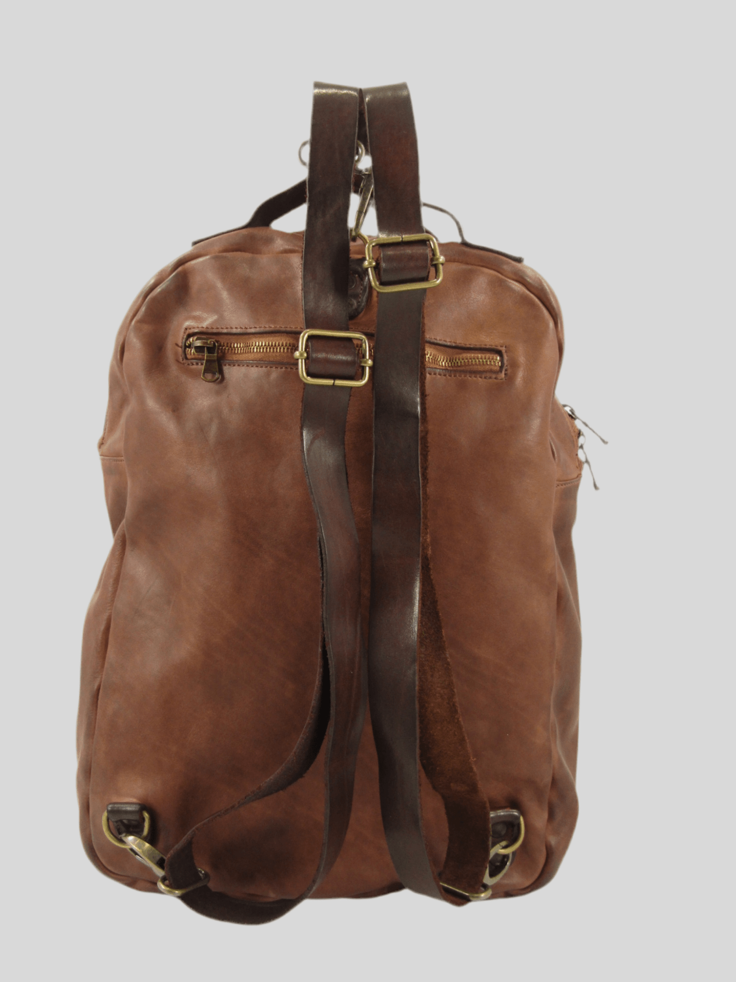 Zaino e cartella in vacchetta con inserti in Cuoio tinto in capo al vegetale, i due spallacci sono rimovibili e trasformano lo zaino in una borsa, oggetto ricercato nelle linee e nei materiali, adatto in più situazioni e fortemente caratteriale, interno rivestito ed accessoriato da tasca chiusa da zip e tasche aperte, costruito in maniera artigianale con pellami di alta qualità da veri maestri del cuoio