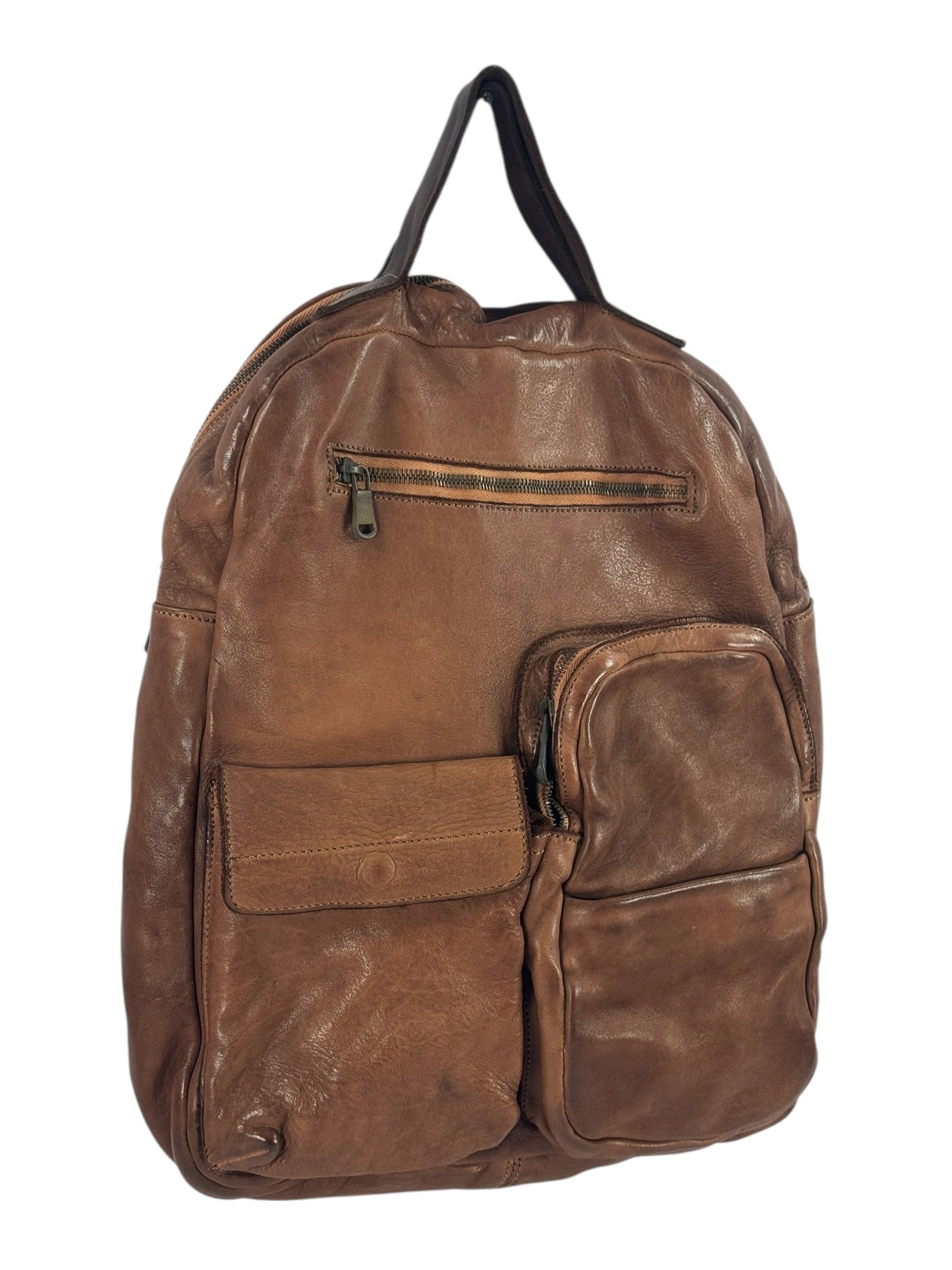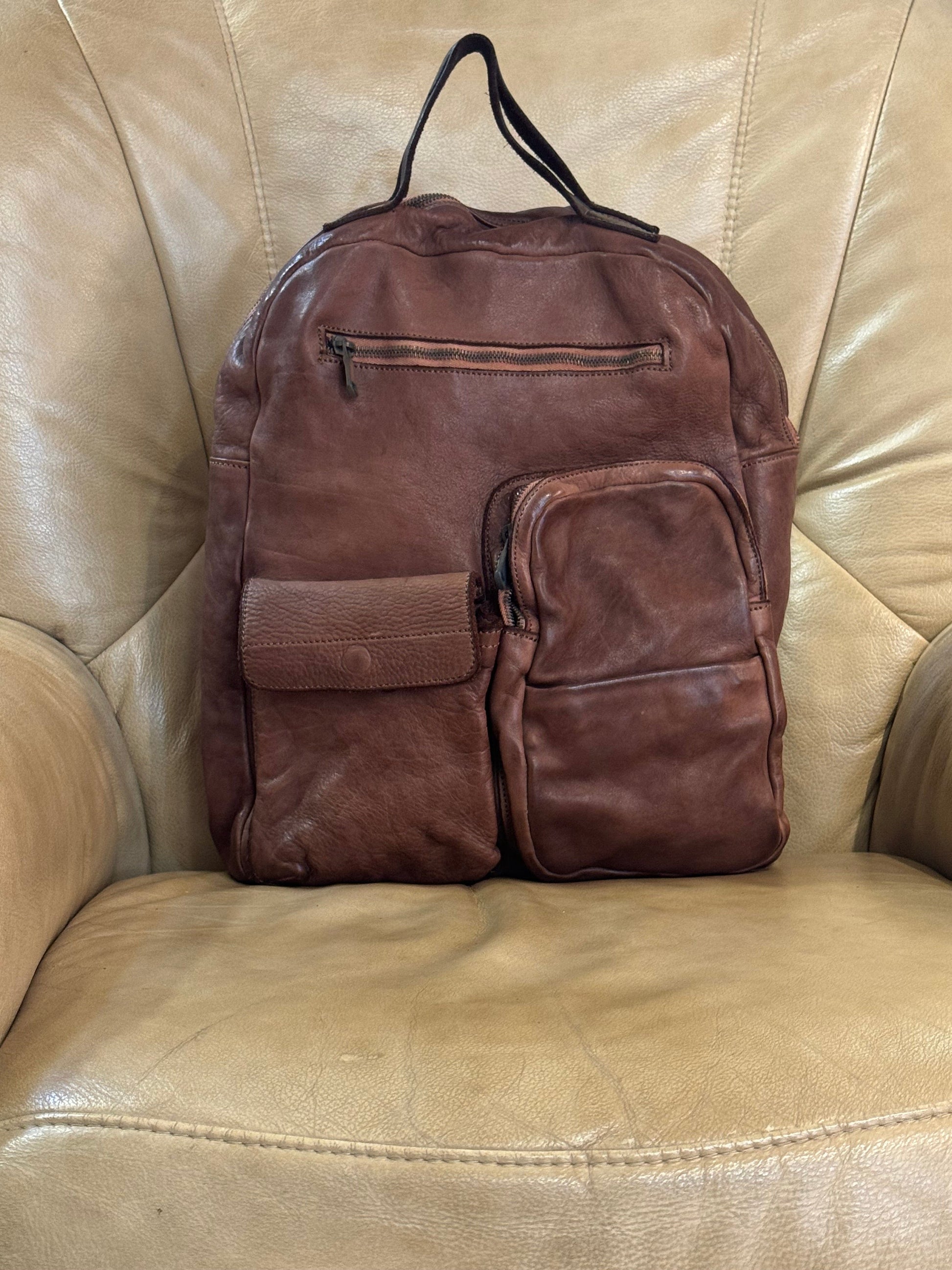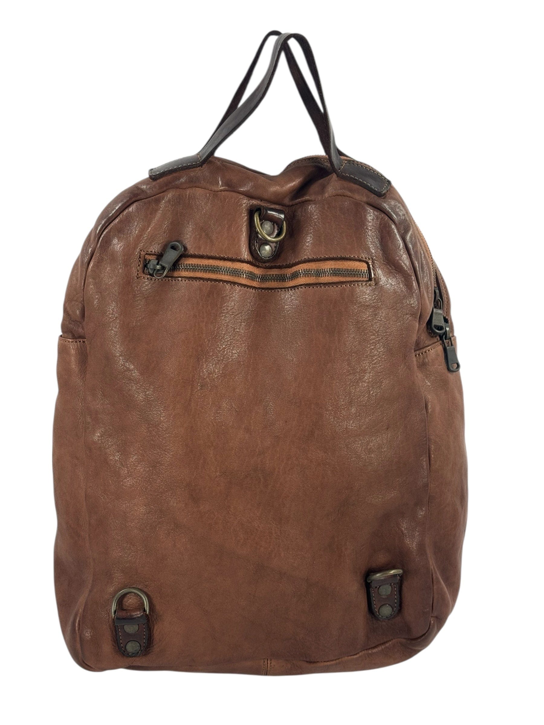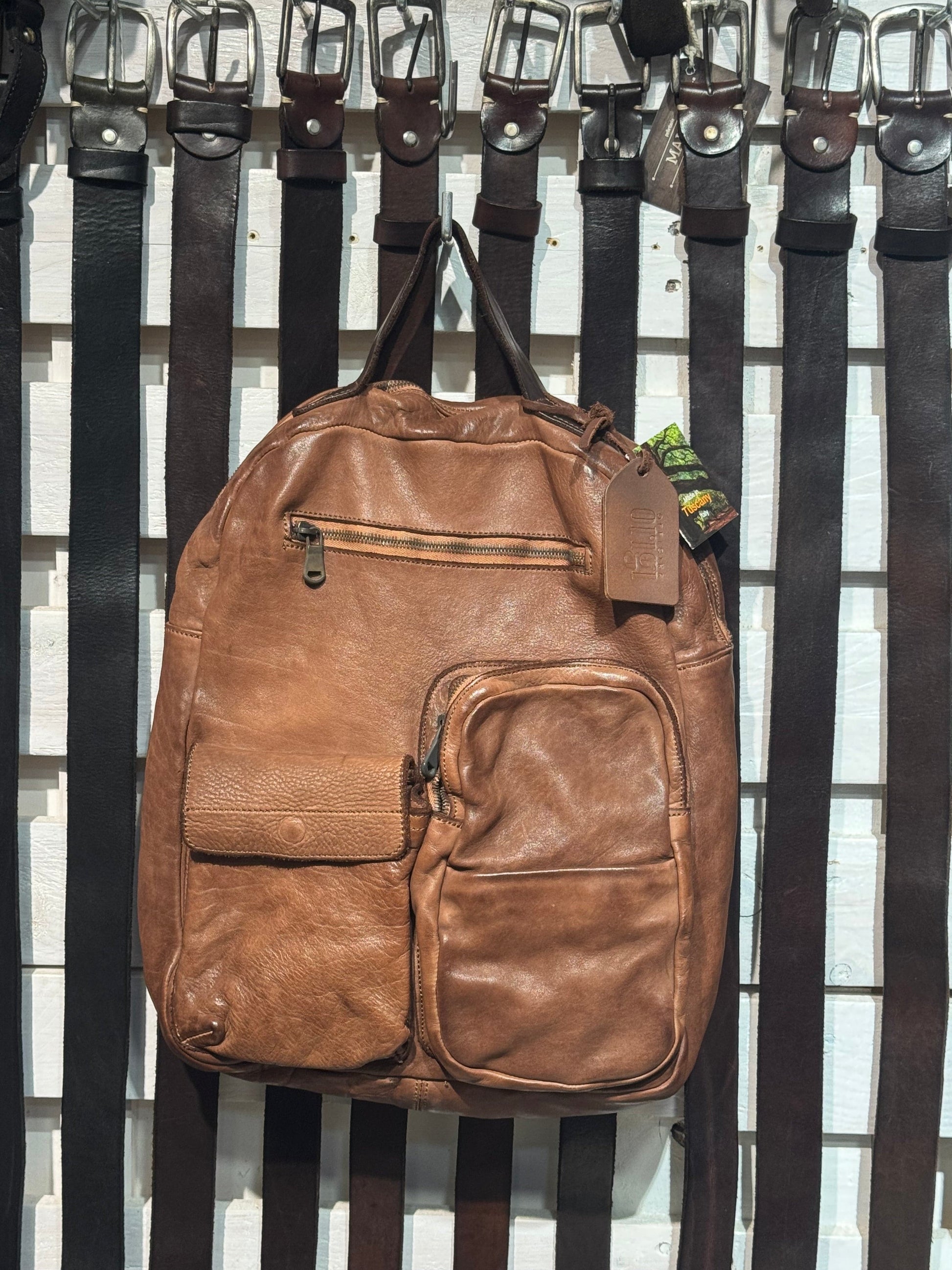 Zaino e cartella in vacchetta con inserti in Cuoio tinto in capo al vegetale, i due spallacci sono rimovibili e trasformano lo zaino in una borsa, oggetto ricercato nelle linee e nei materiali, adatto in più situazioni e fortemente caratteriale, interno rivestito ed accessoriato da tasca chiusa da zip e tasche aperte, costruito in maniera artigianale con pellami di alta qualità da veri maestri del cuoio