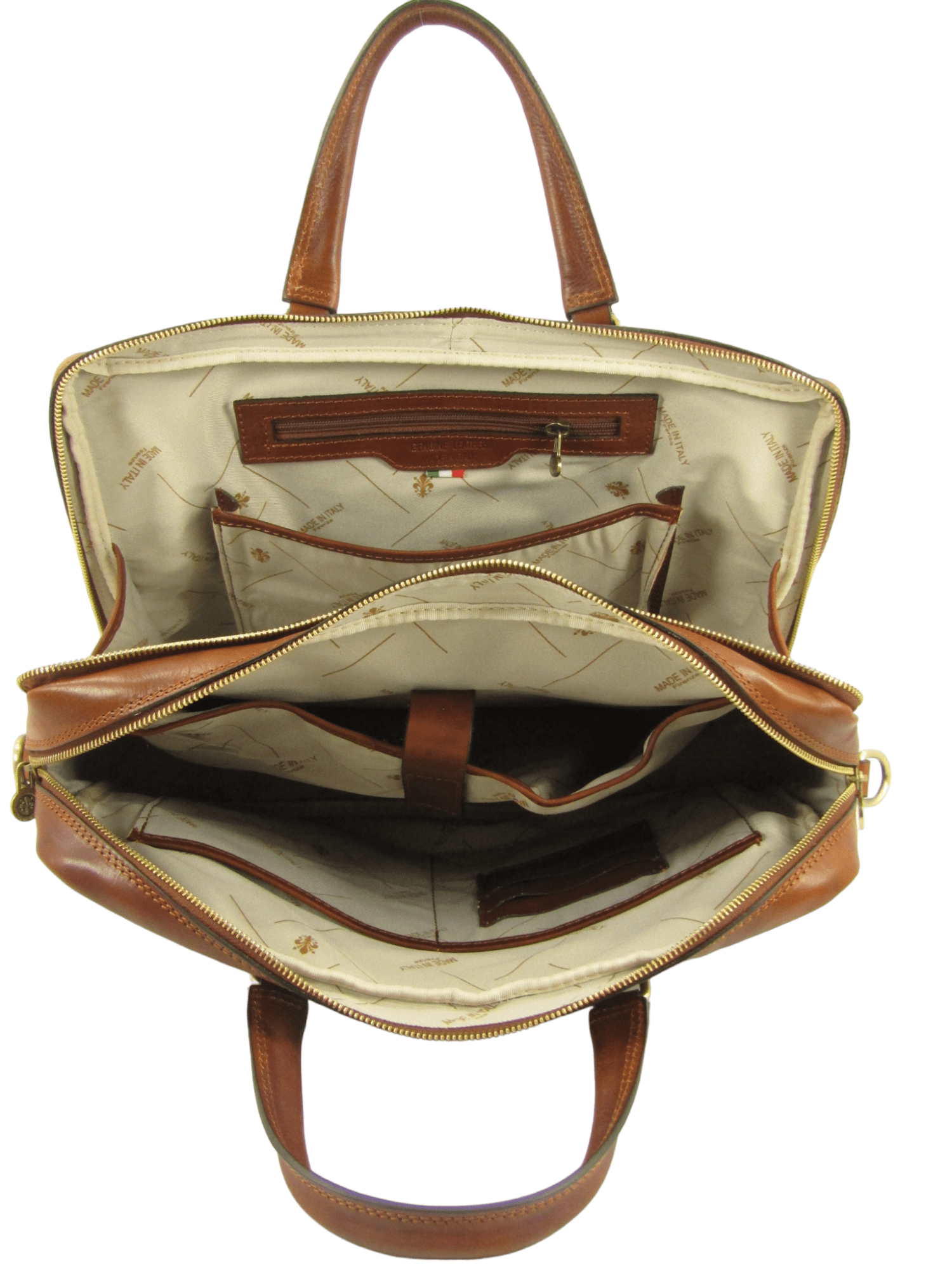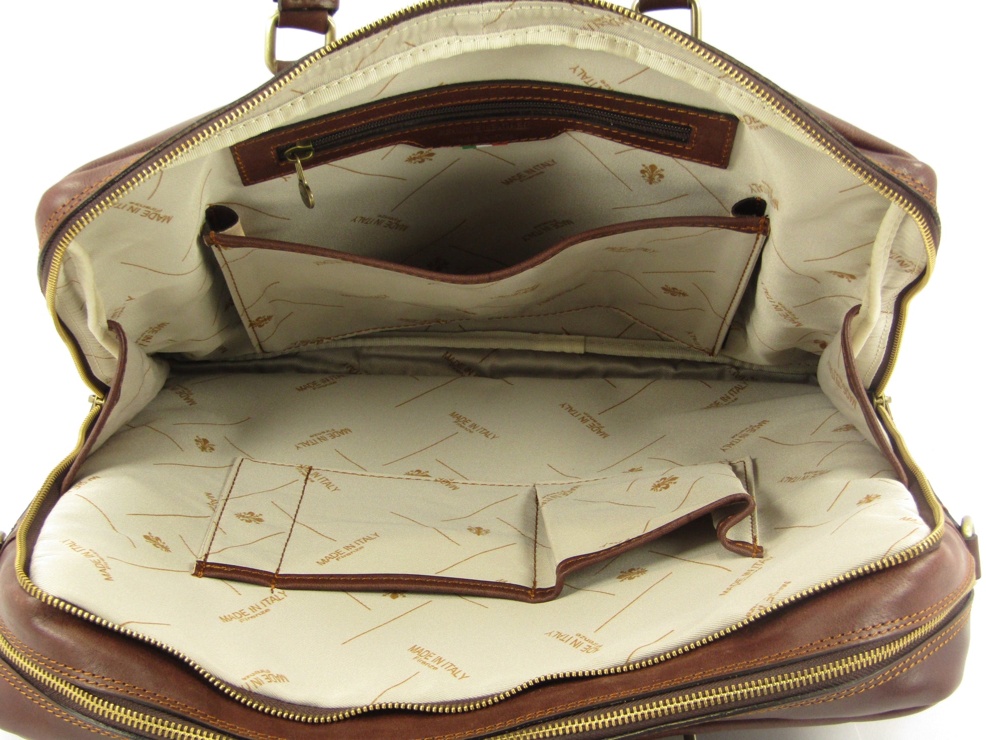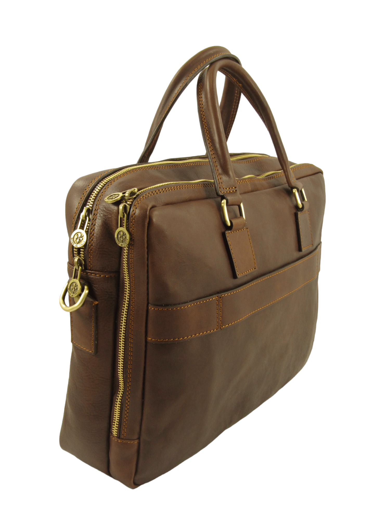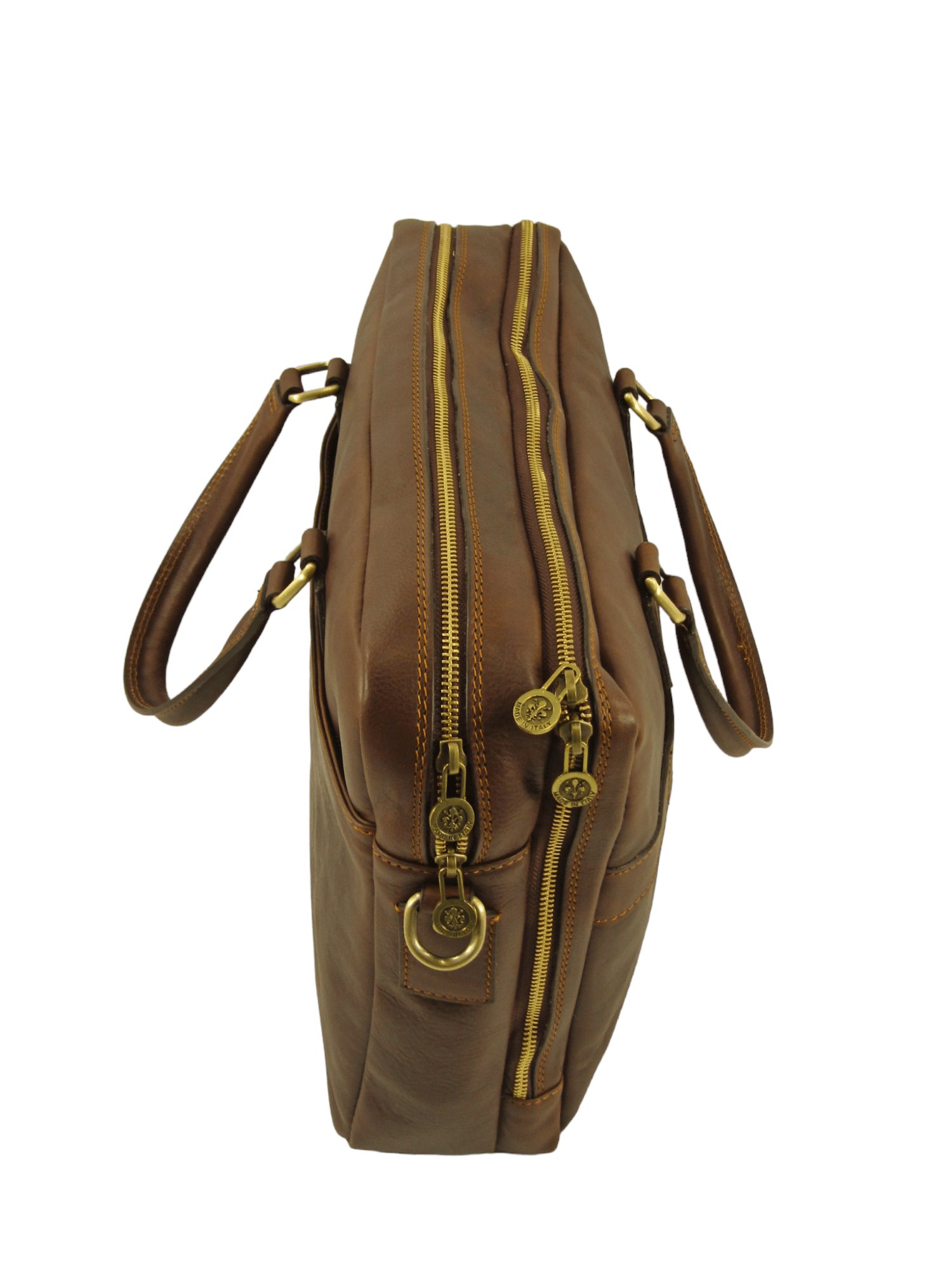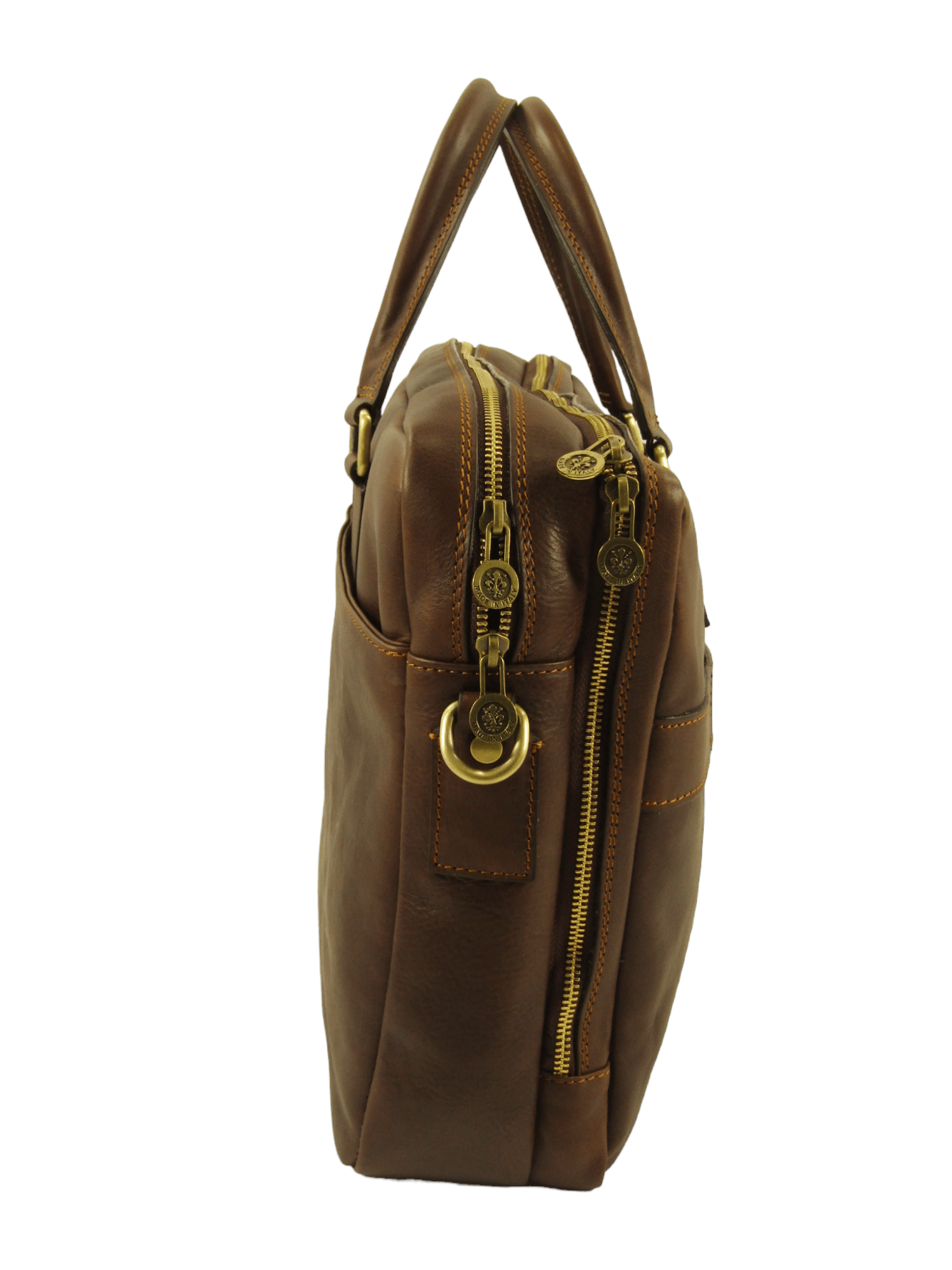 Cartella in cuoio conciato al vegetale e tamponato a mano, due scomparti separati chiusi da zip, accessoriati con molte tasche aperte ,chiuse da zip o da laccetti, sull'esterno ulteriore tasca chiusa da zip, sul retro laccio in cuoio per agganciare la cartella al trolley, tracolla in pelle e stoffa regolabile e rimovibile, cartella grande e comoda, costruita con pellami di alta qualità, contiene comodamente pc e tutto quello che occorre per il lavoro