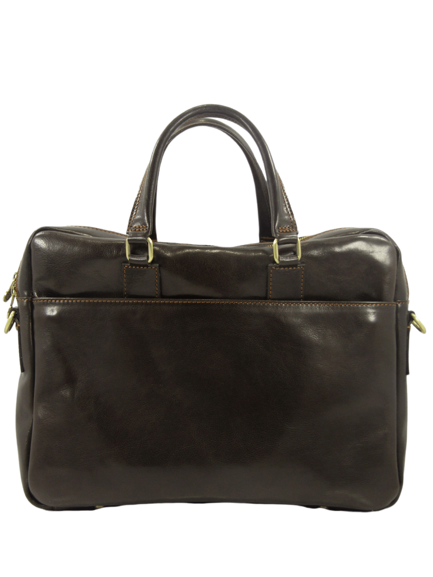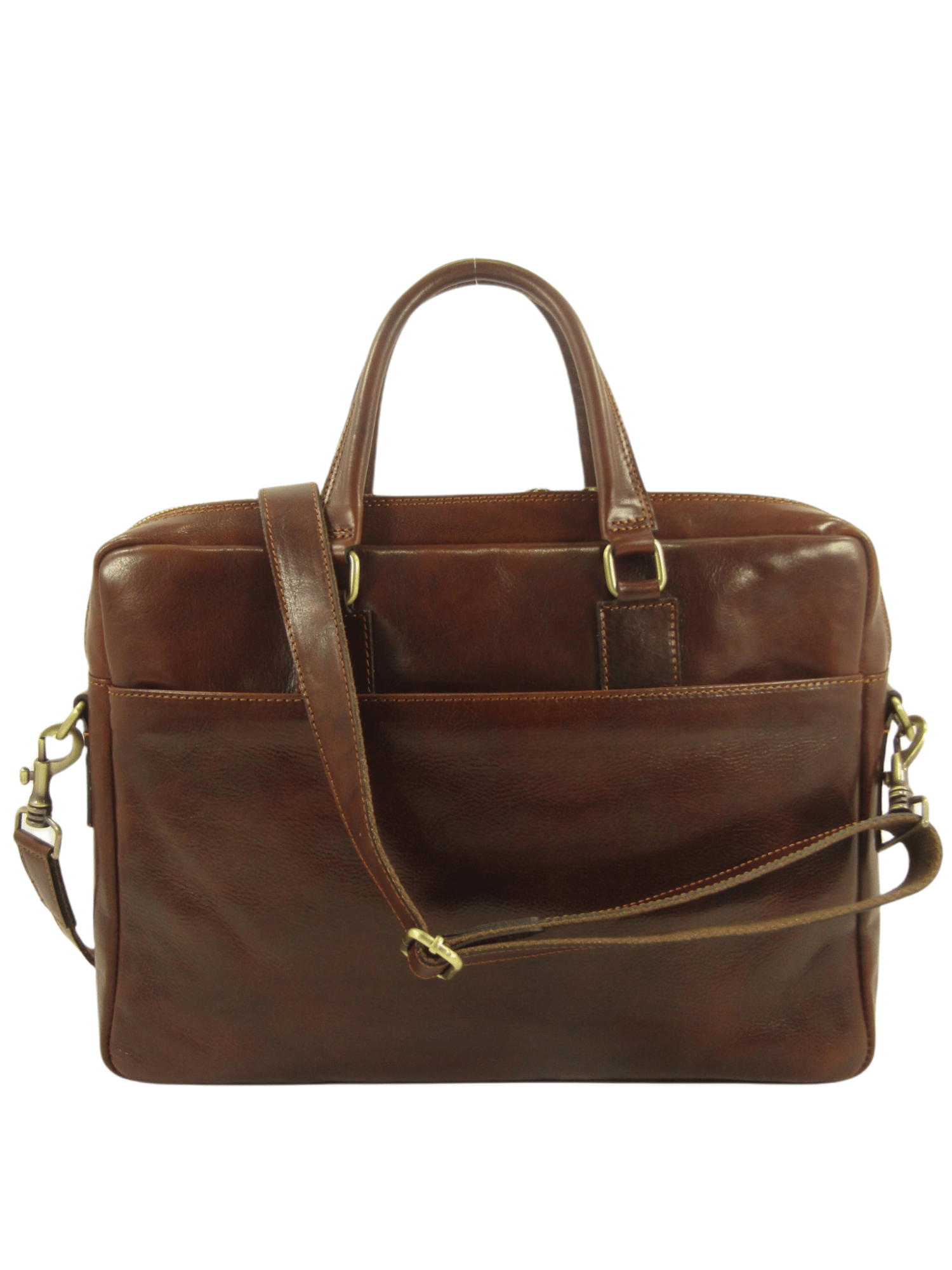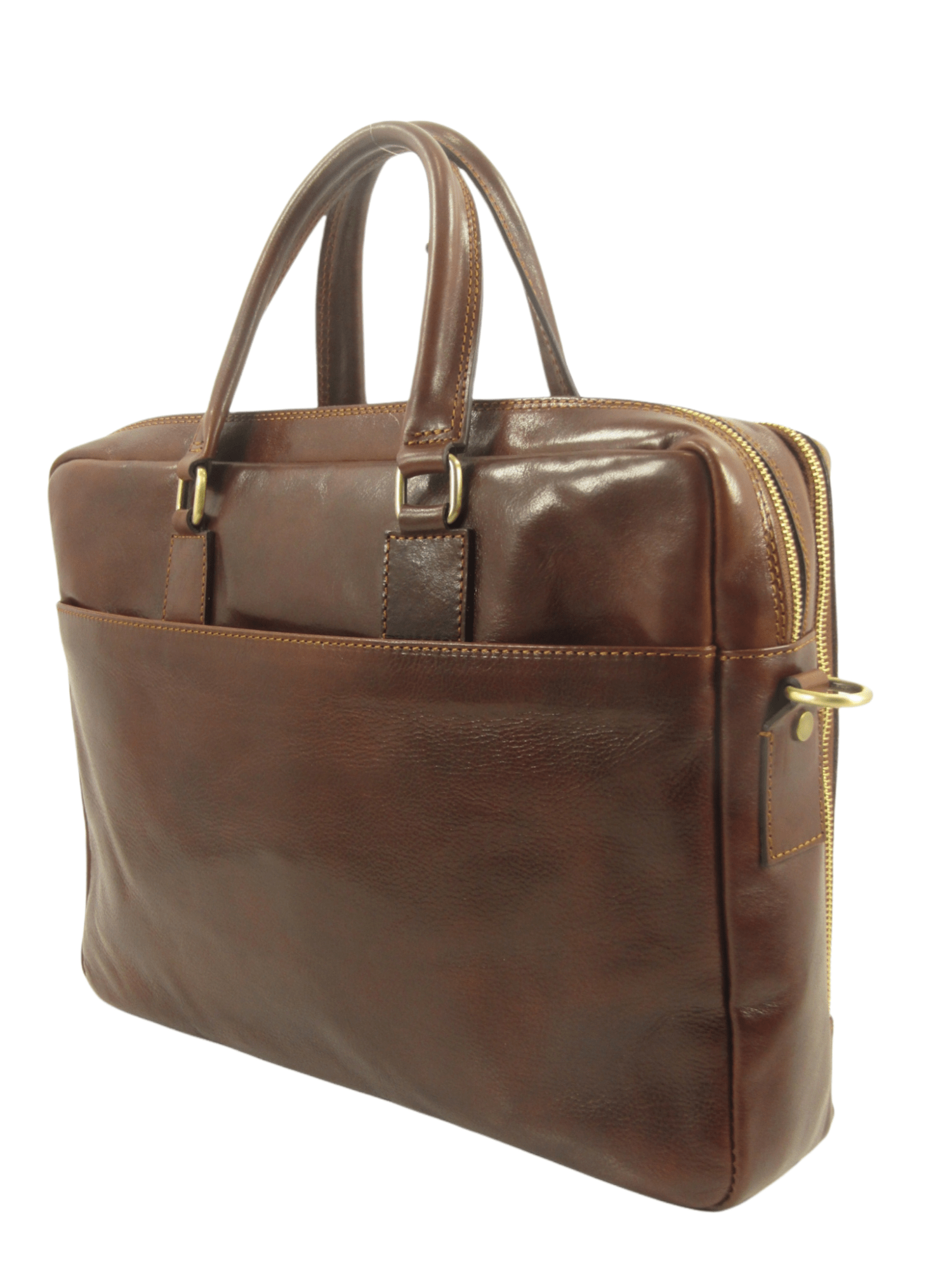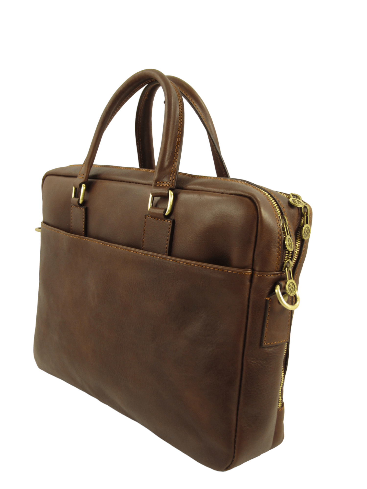 Cartella in cuoio conciato al vegetale e tamponato a mano, due scomparti separati chiusi da zip, accessoriati con molte tasche aperte ,chiuse da zip o da laccetti, sull'esterno ulteriore tasca chiusa da zip, sul retro laccio in cuoio per agganciare la cartella al trolley, tracolla in pelle e stoffa regolabile e rimovibile, cartella grande e comoda, costruita con pellami di alta qualità, contiene comodamente pc e tutto quello che occorre per il lavoro