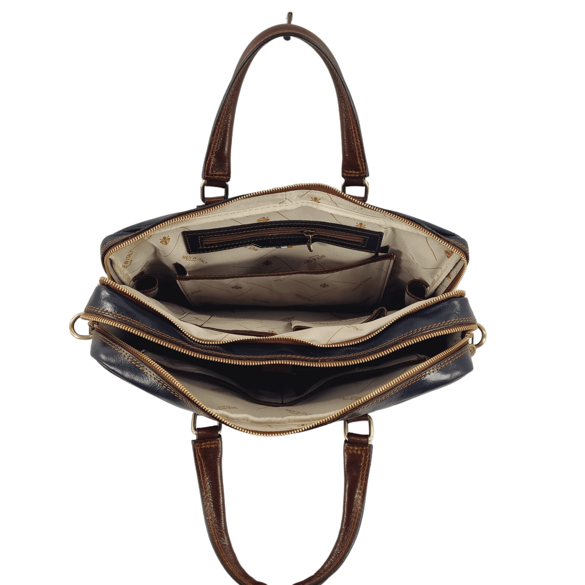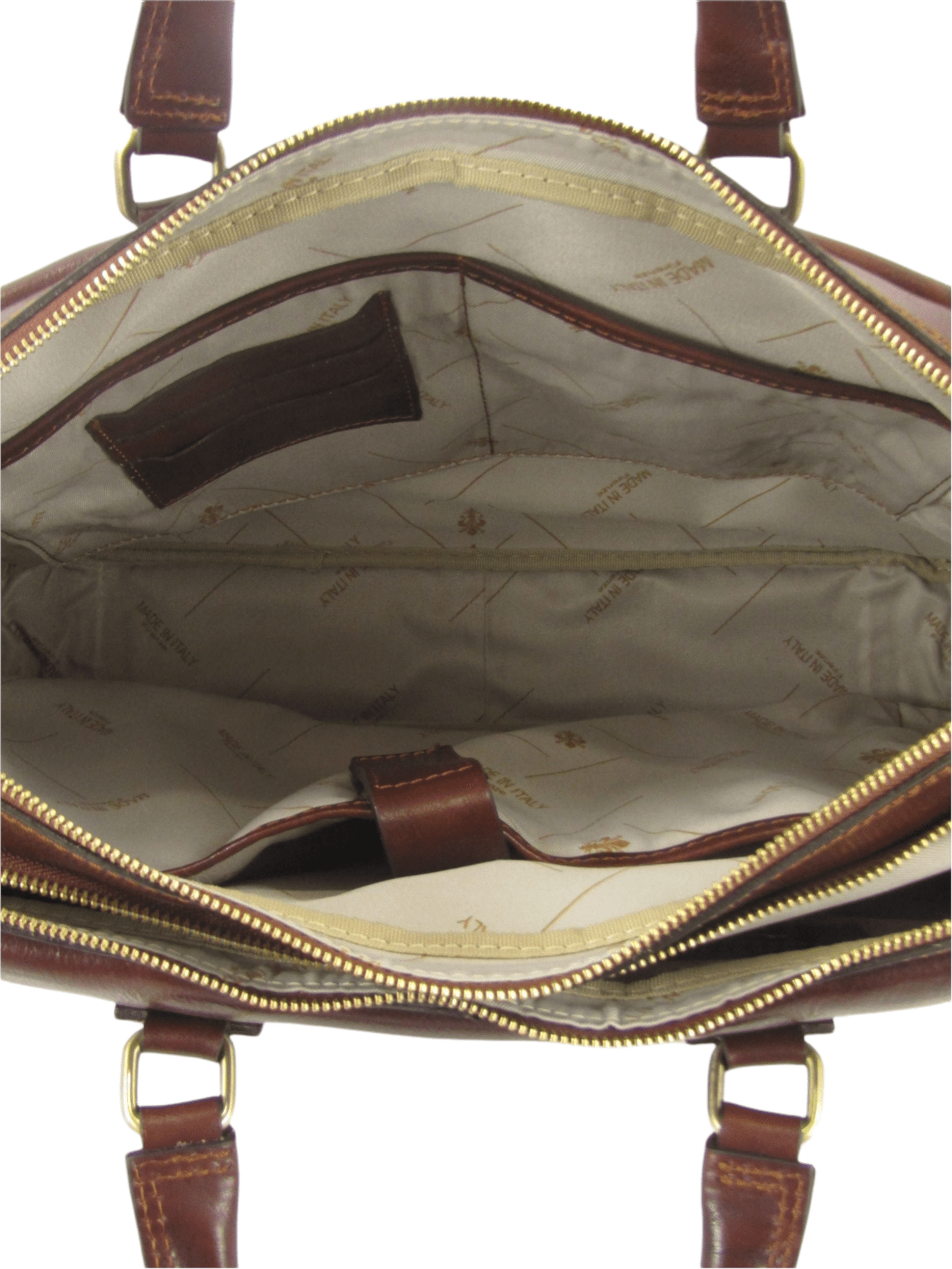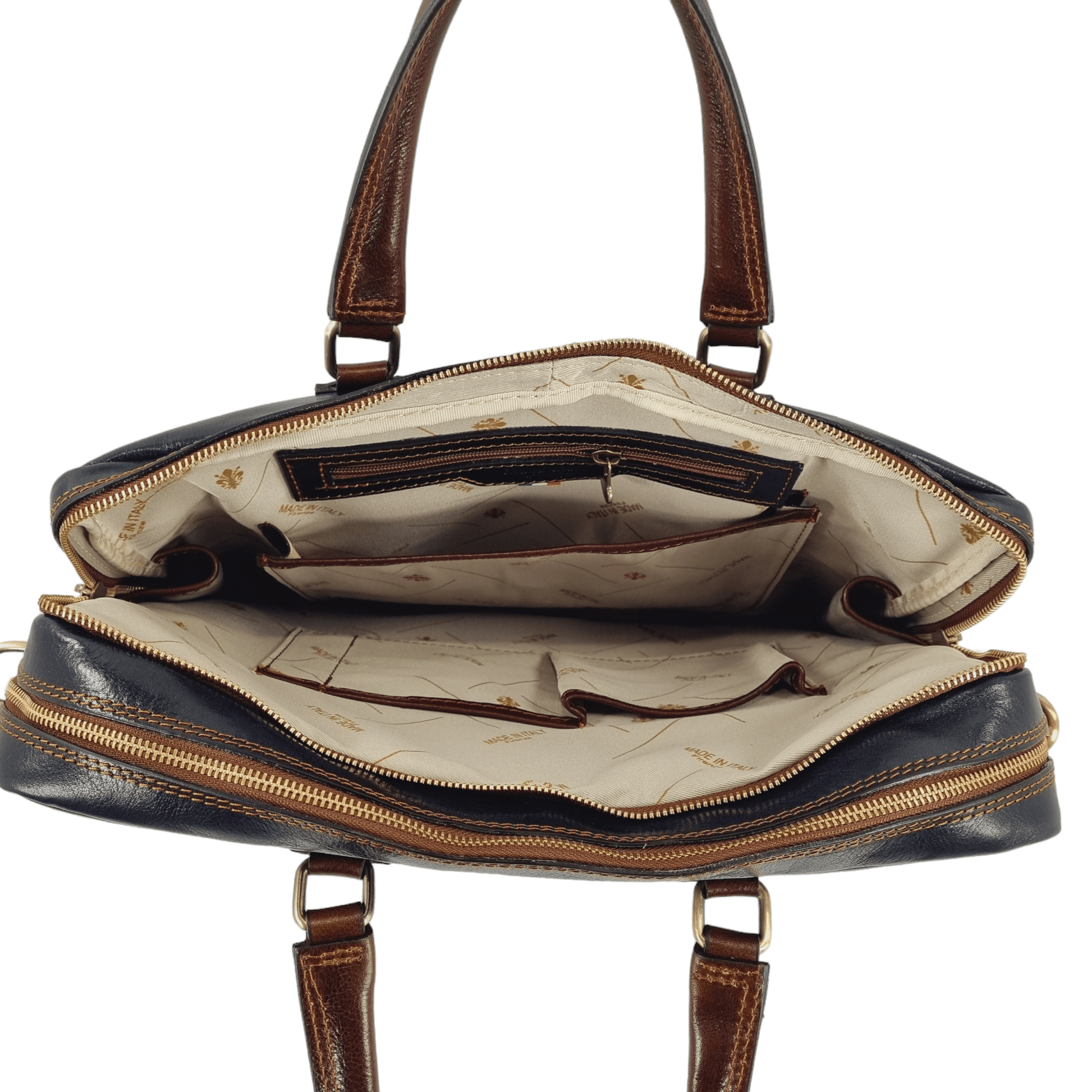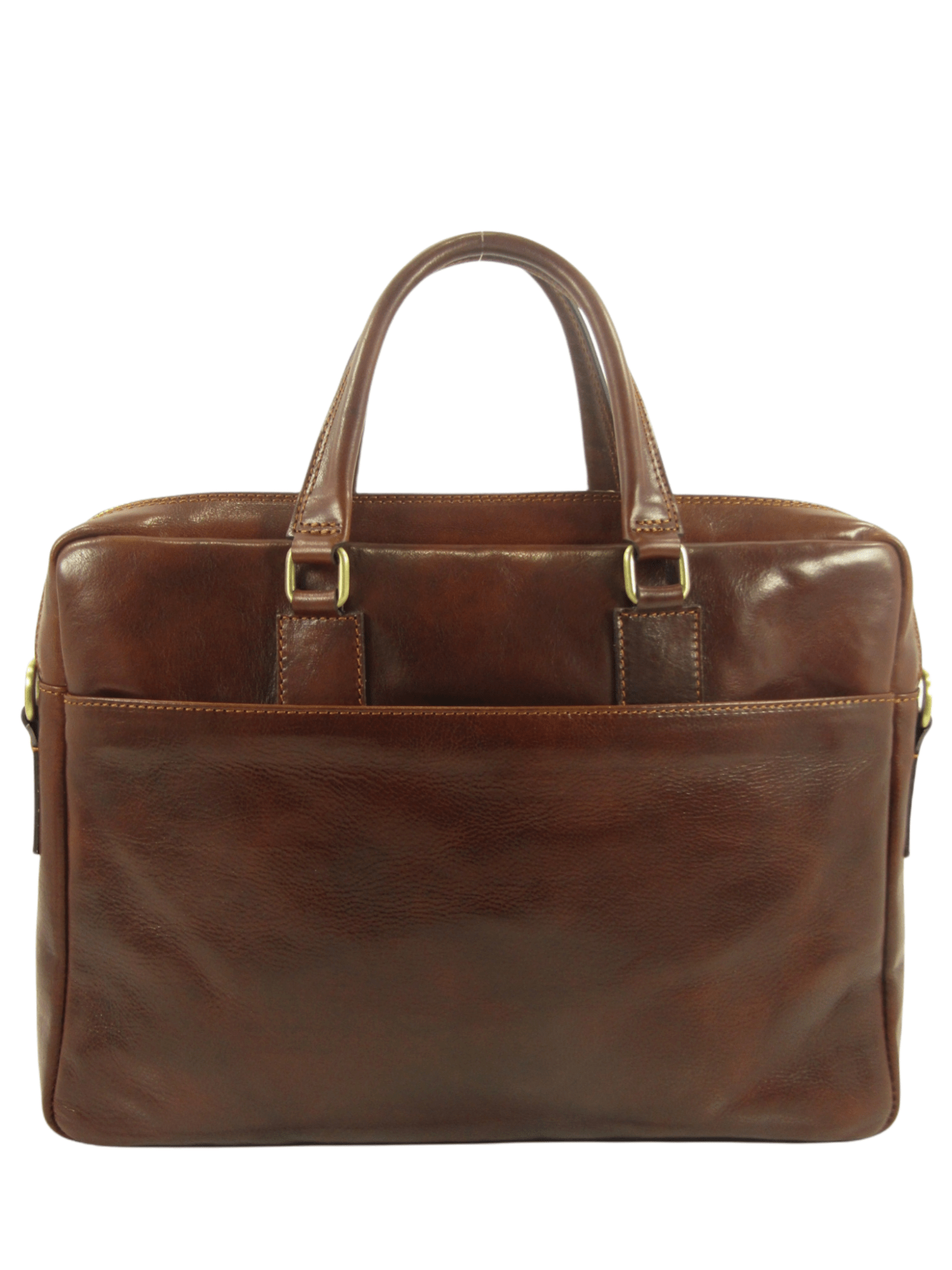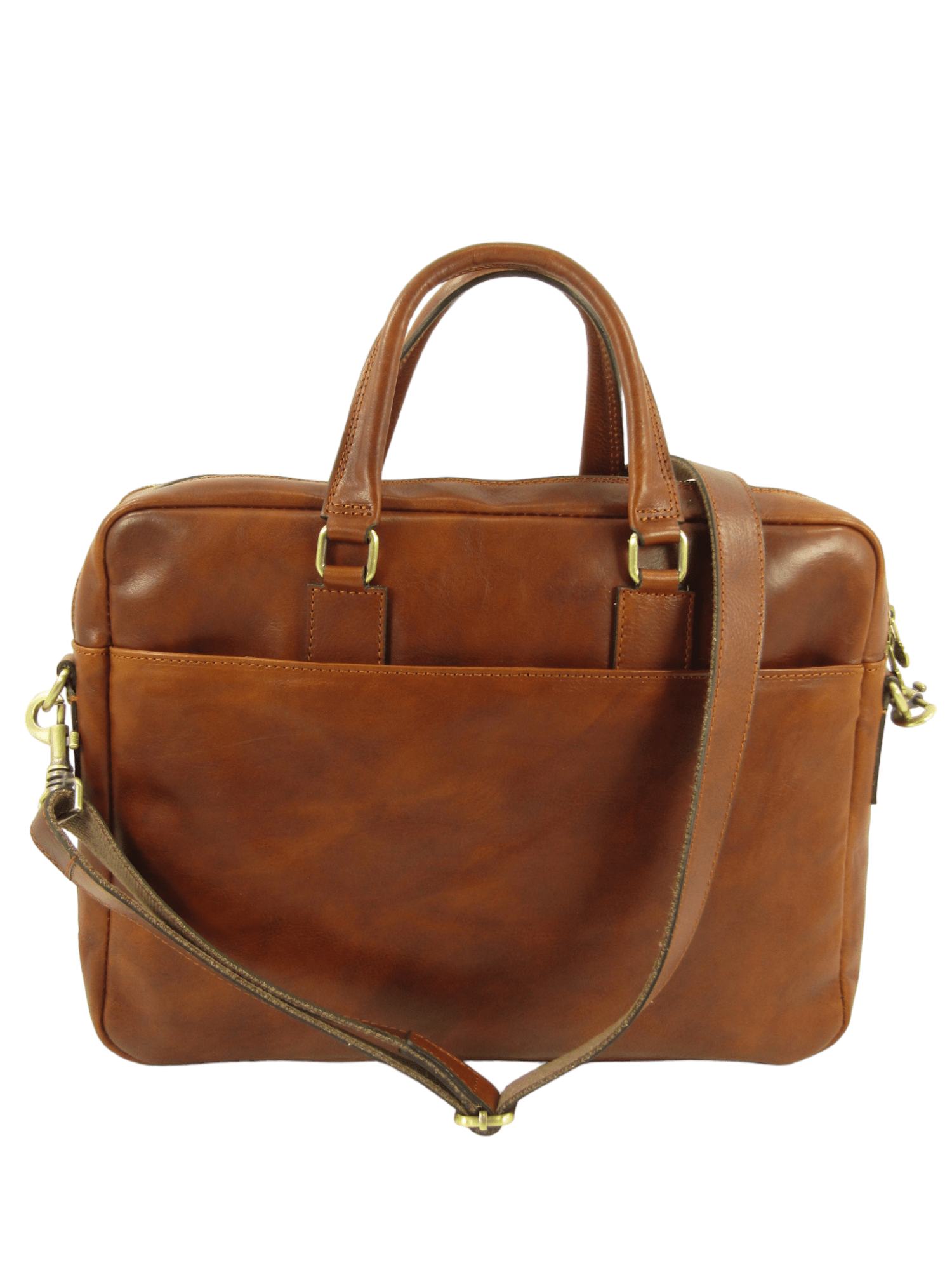 Cartella in cuoio conciato al vegetale e tamponato a mano, due scomparti separati chiusi da zip, accessoriati con molte tasche aperte ,chiuse da zip o da laccetti, sull'esterno ulteriore tasca chiusa da zip, sul retro laccio in cuoio per agganciare la cartella al trolley, tracolla in pelle e stoffa regolabile e rimovibile, cartella grande e comoda, costruita con pellami di alta qualità, contiene comodamente pc e tutto quello che occorre per il lavoro