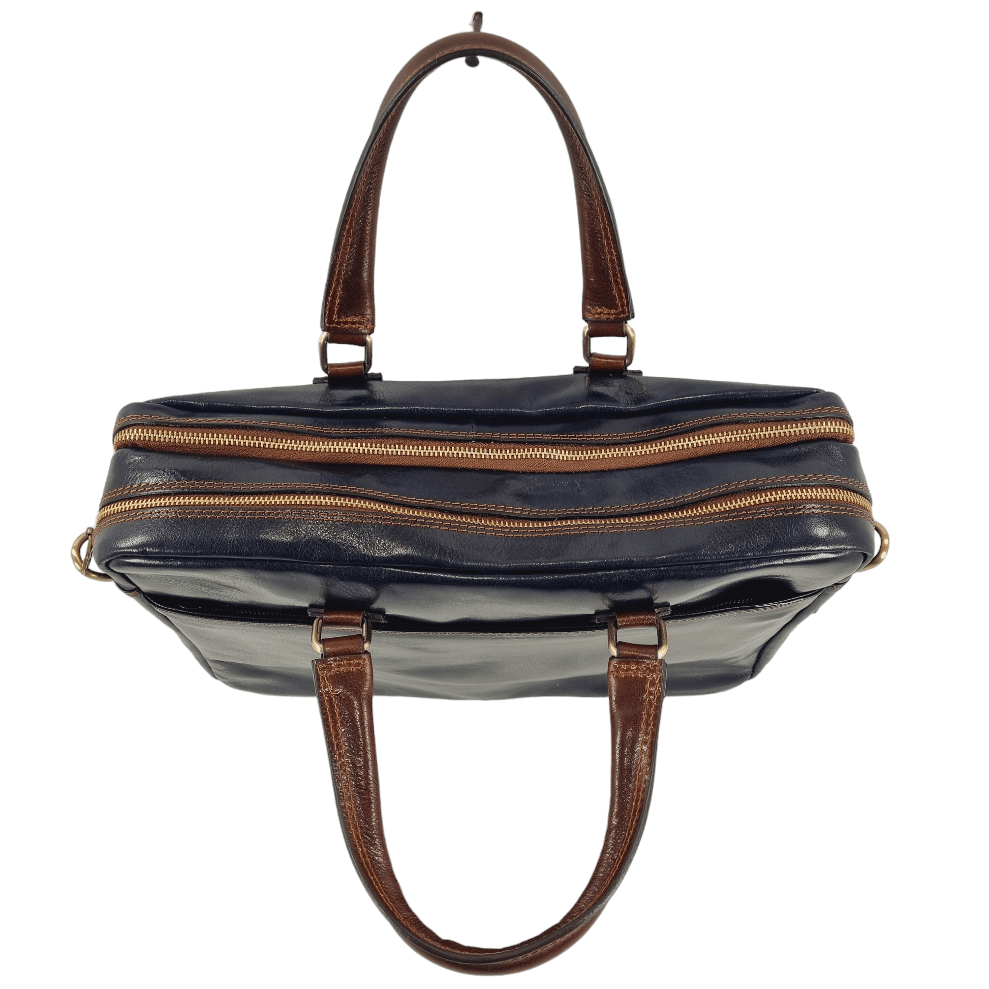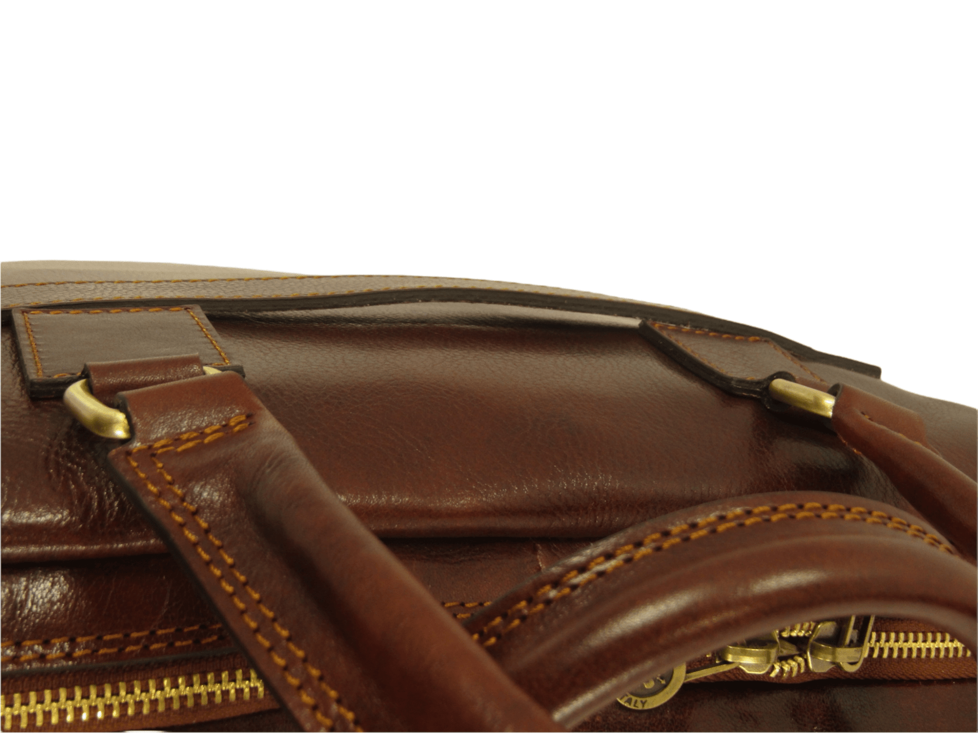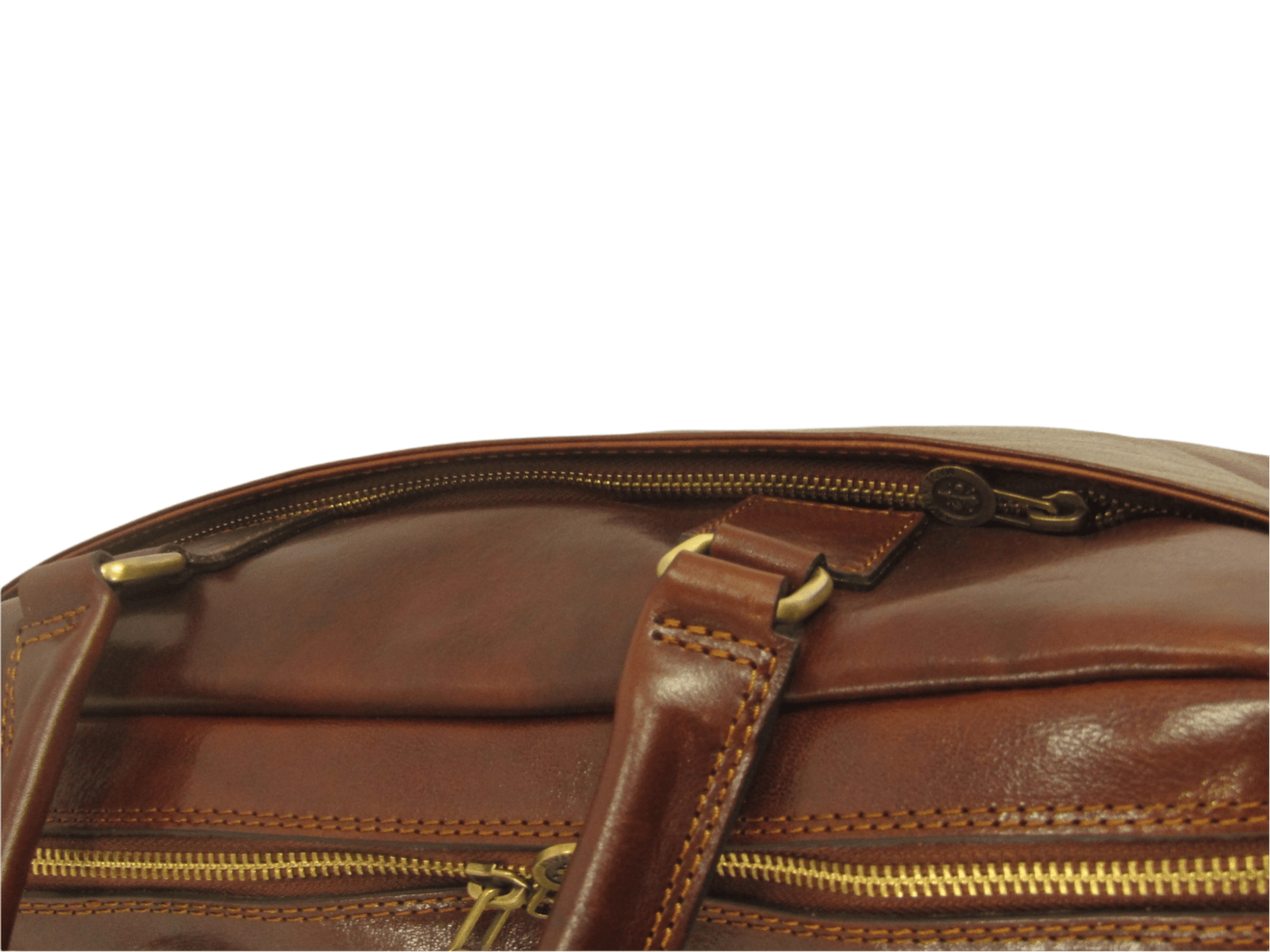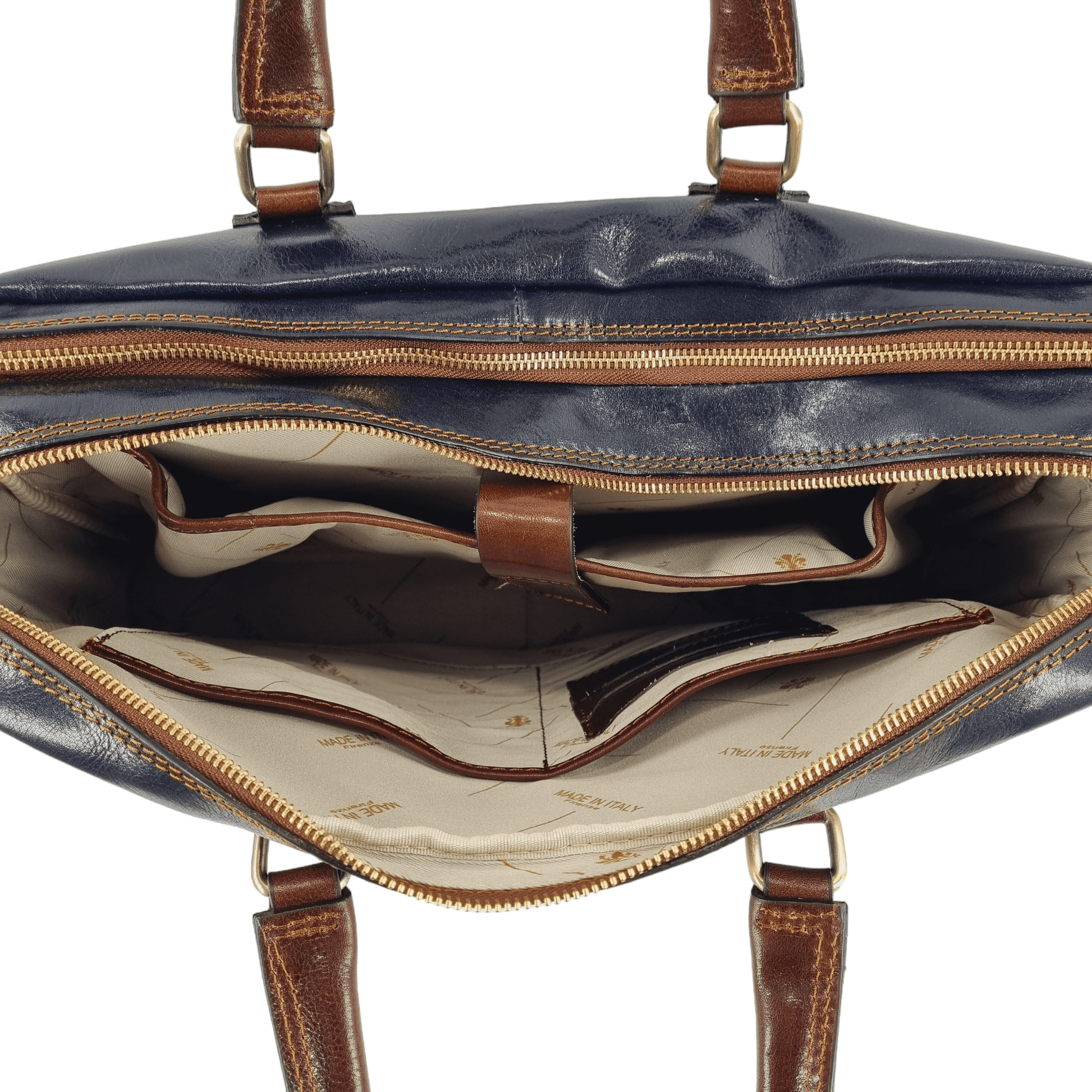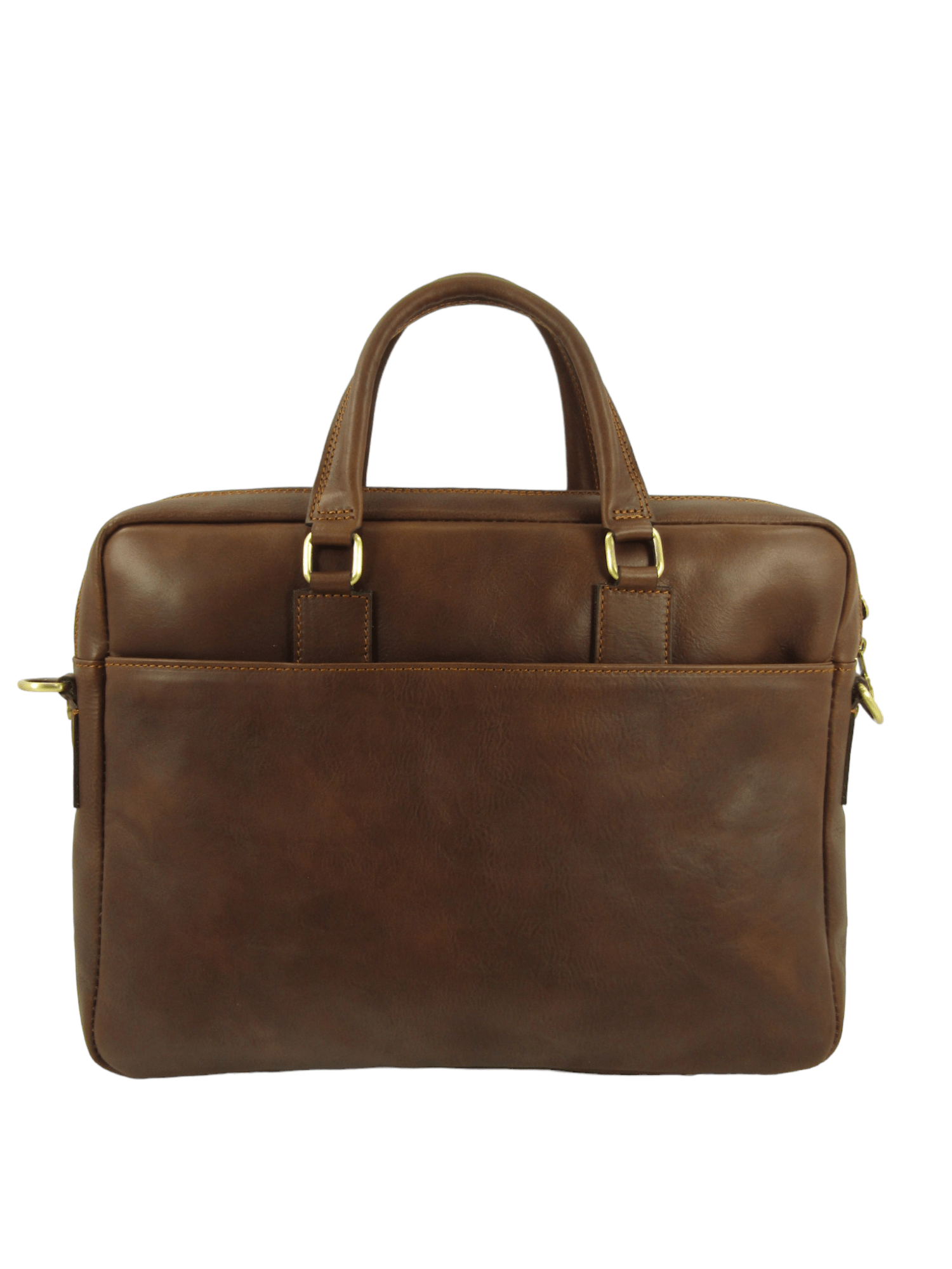 Cartella in cuoio conciato al vegetale e tamponato a mano, due scomparti separati chiusi da zip, accessoriati con molte tasche aperte ,chiuse da zip o da laccetti, sull'esterno ulteriore tasca chiusa da zip, sul retro laccio in cuoio per agganciare la cartella al trolley, tracolla in pelle e stoffa regolabile e rimovibile, cartella grande e comoda, costruita con pellami di alta qualità, contiene comodamente pc e tutto quello che occorre per il lavoro