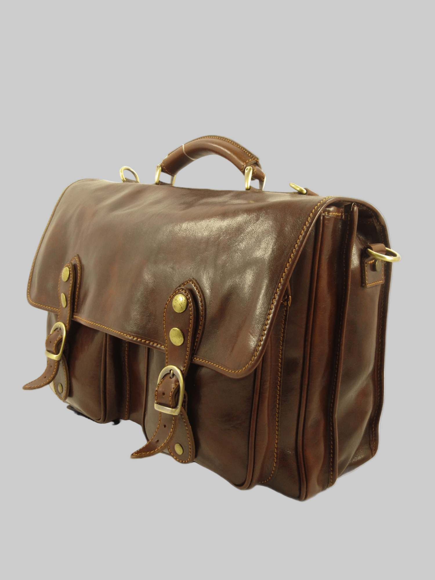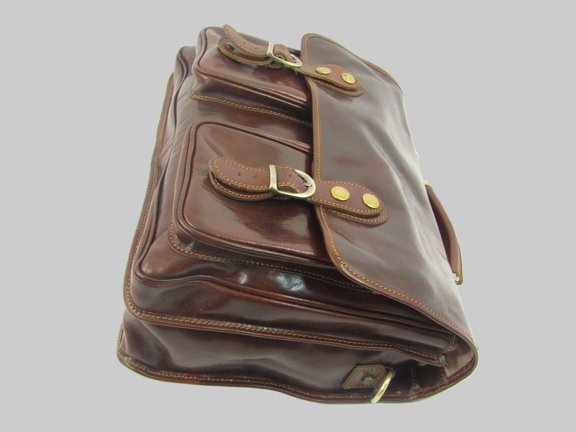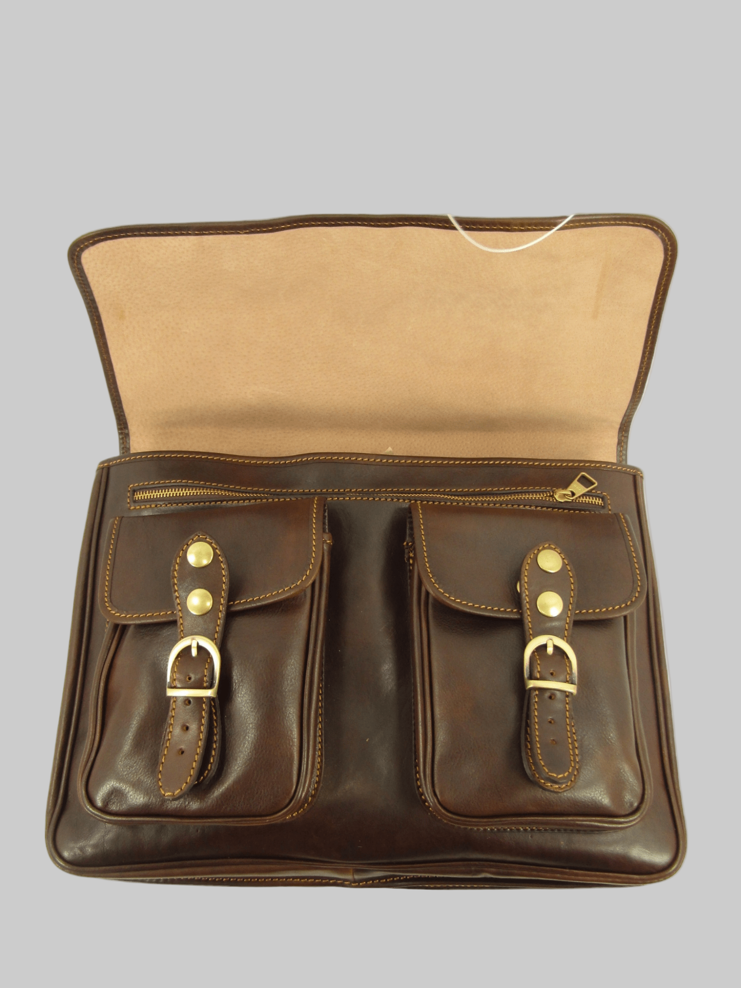 Cartella in cuoio primo fiore conciato al vegetale e tamponato a mano. Chiusura con pattina e fibbiette a sgancio rapido. Interno organizzato in due scomparti sfoderati con porta accessori in pelle, tasche esterne chiuse da pattina e bottoni. Tracolla in pelle regolabile e rimovibile. La tracolla può essere agganciata sui lati oppure sulla parte superiore. Costruita in maniera artigianale con pellami di alta qualità, il passare del tempo non farà altro che donarle maggiore fascino.