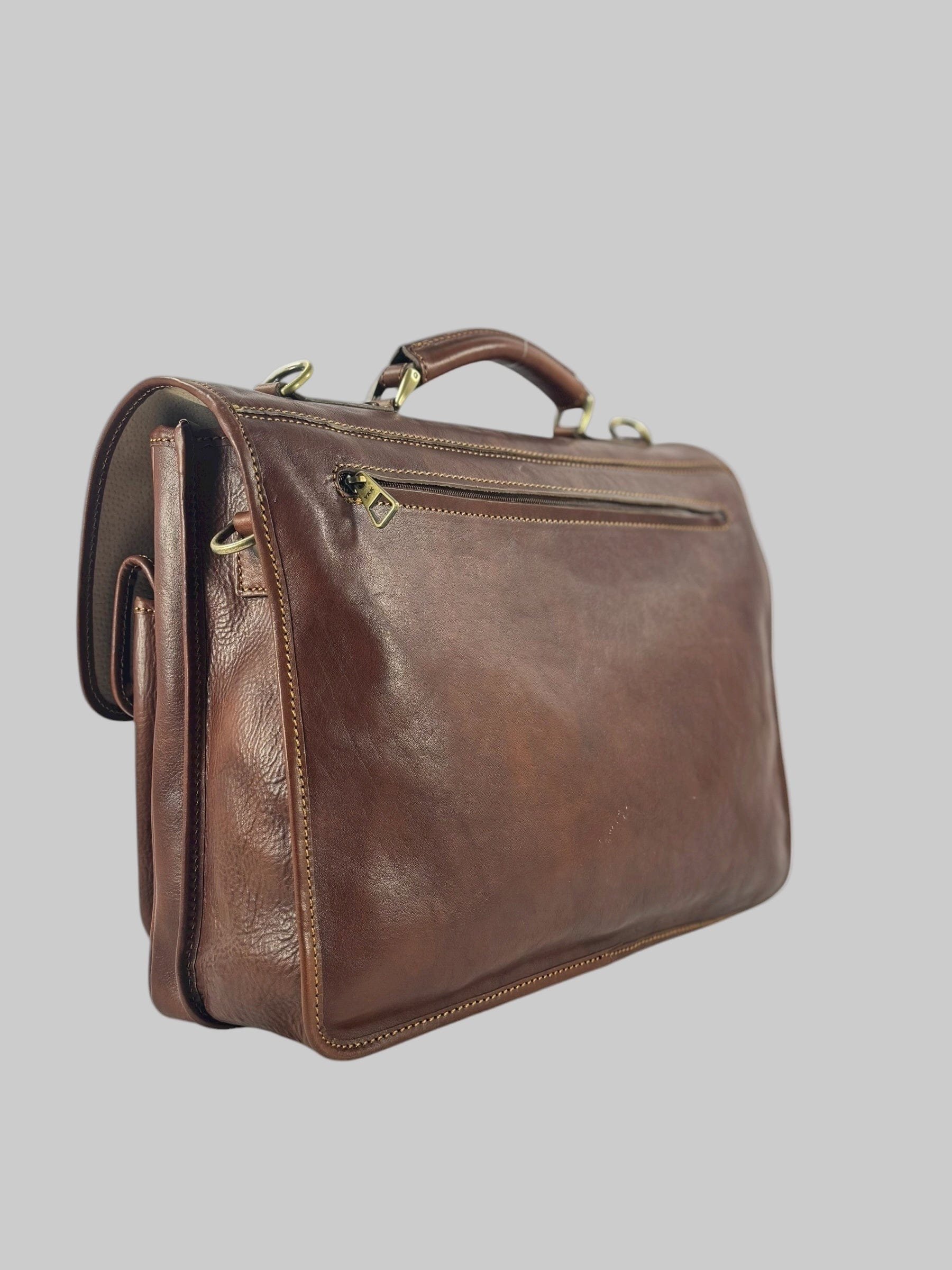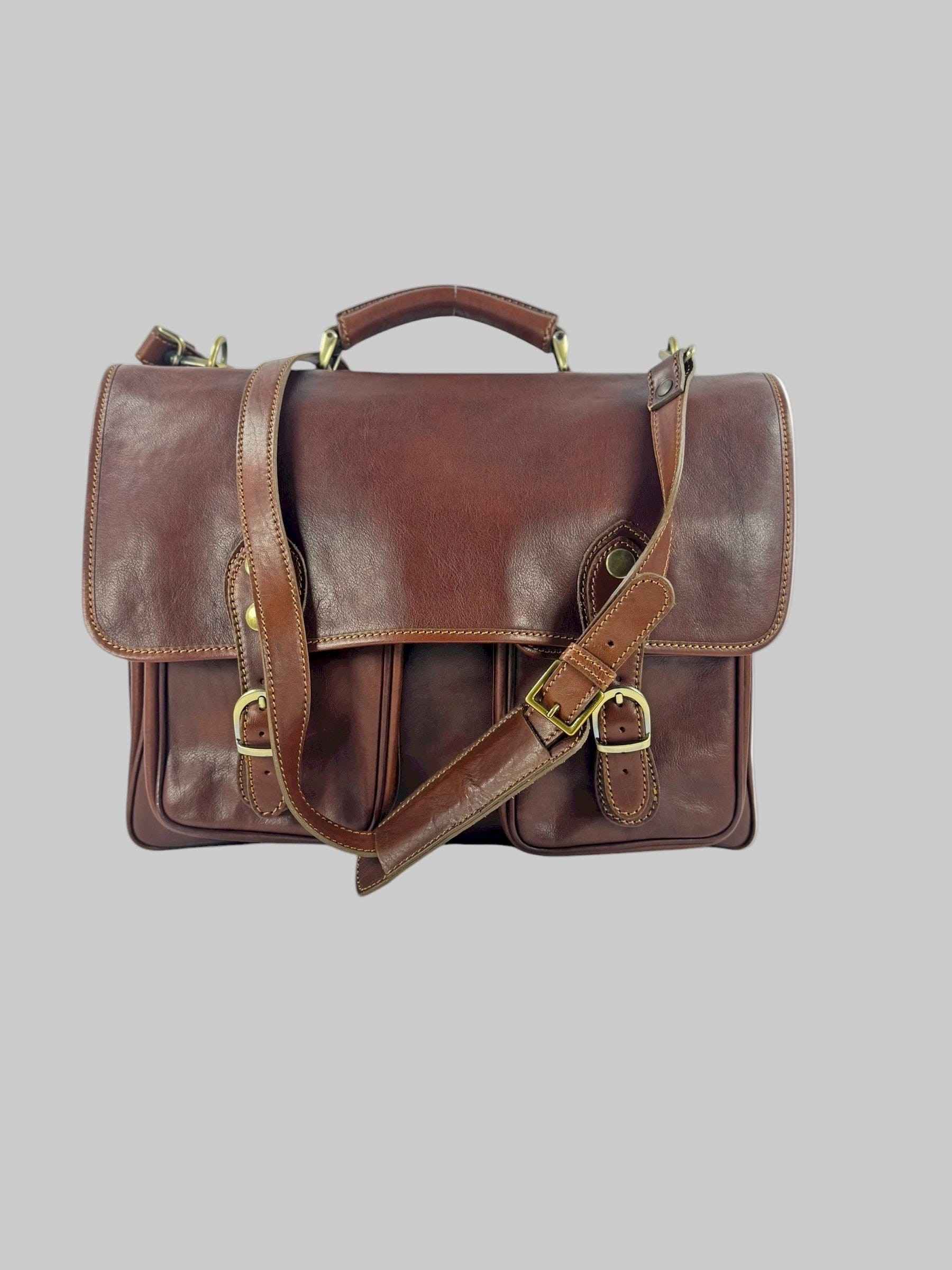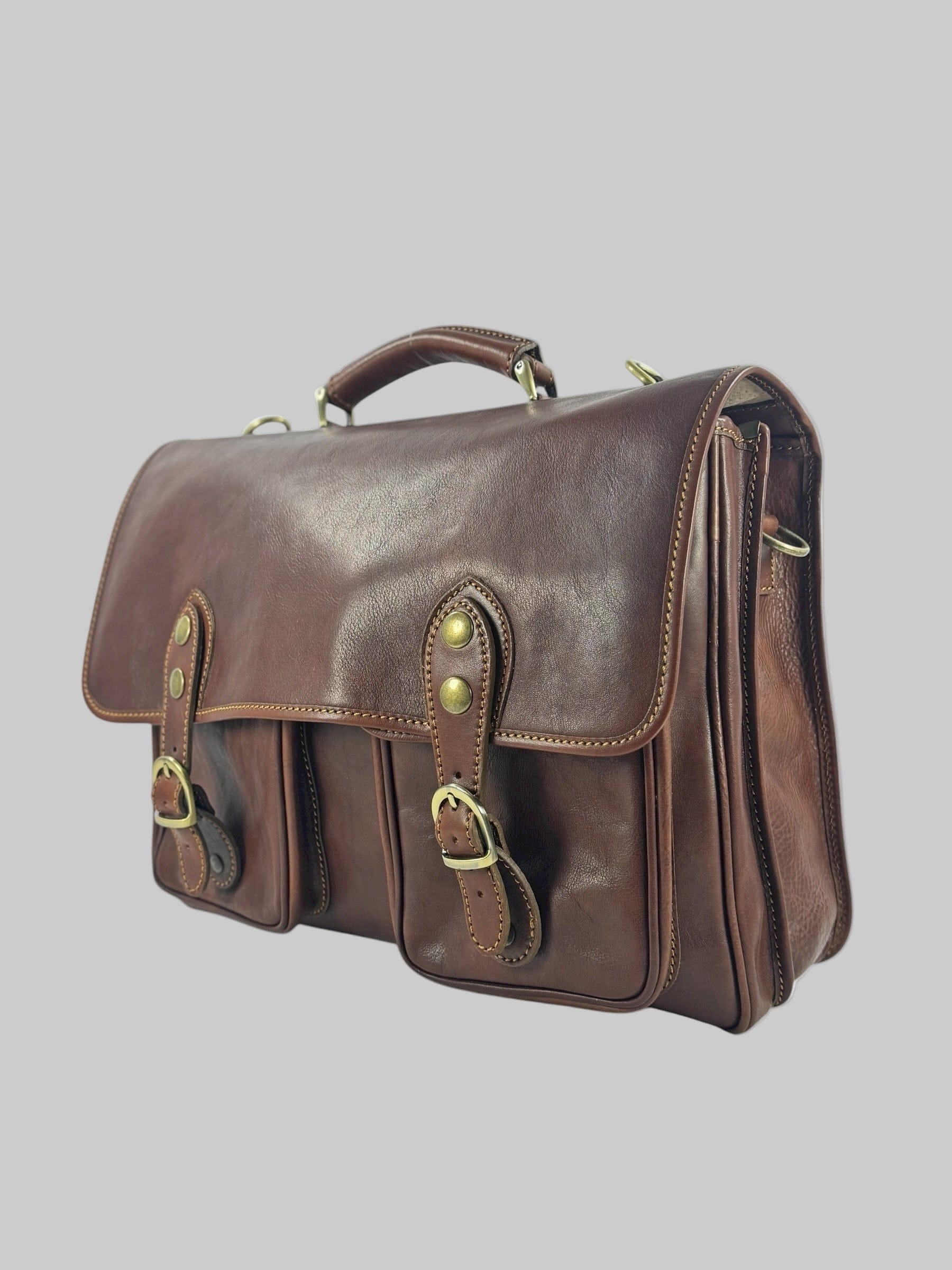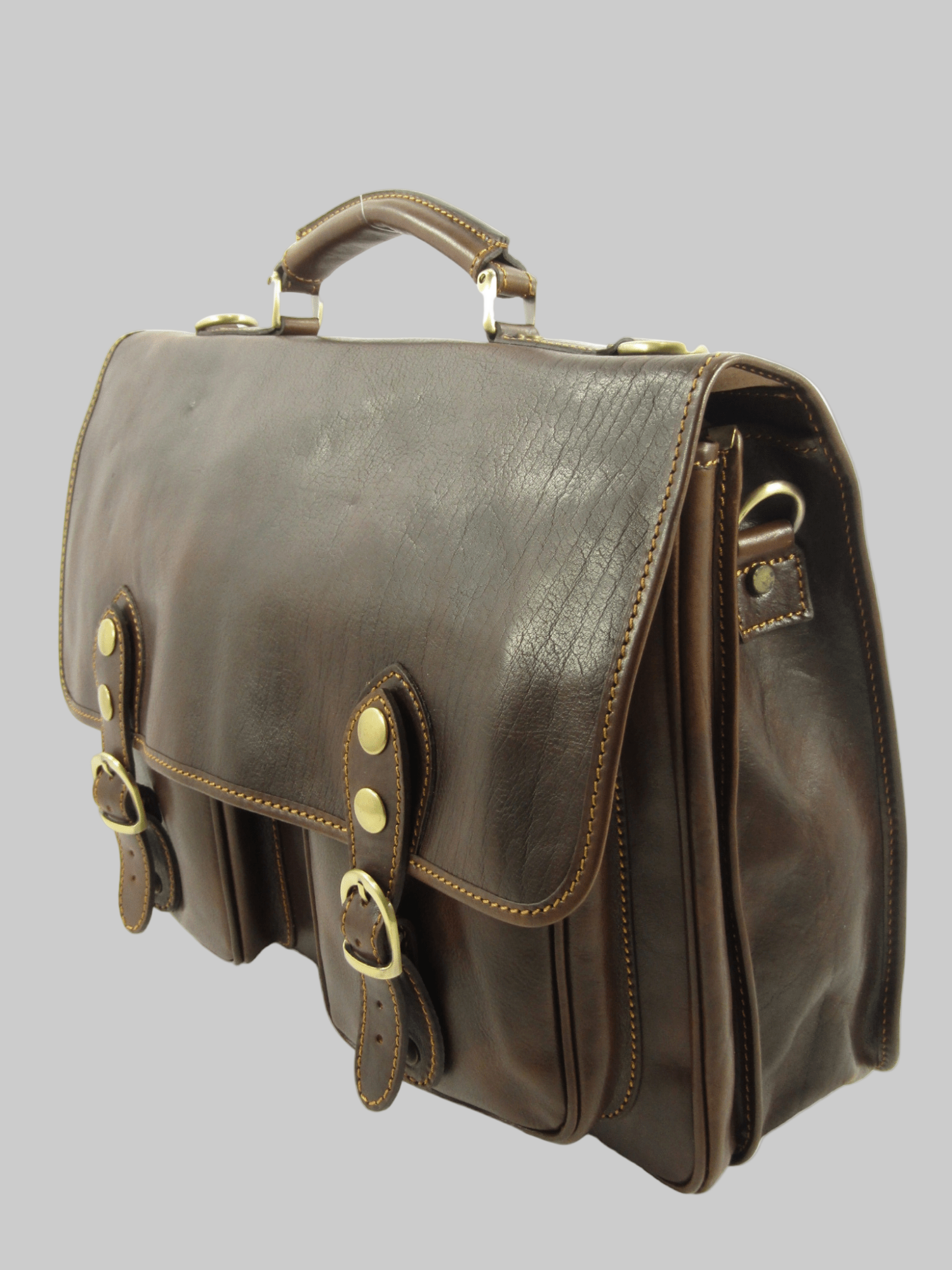 Cartella in cuoio primo fiore conciato al vegetale e tamponato a mano. Chiusura con pattina e fibbiette a sgancio rapido. Interno organizzato in due scomparti sfoderati con porta accessori in pelle, tasche esterne chiuse da pattina e bottoni. Tracolla in pelle regolabile e rimovibile. La tracolla può essere agganciata sui lati oppure sulla parte superiore. Costruita in maniera artigianale con pellami di alta qualità, il passare del tempo non farà altro che donarle maggiore fascino.
