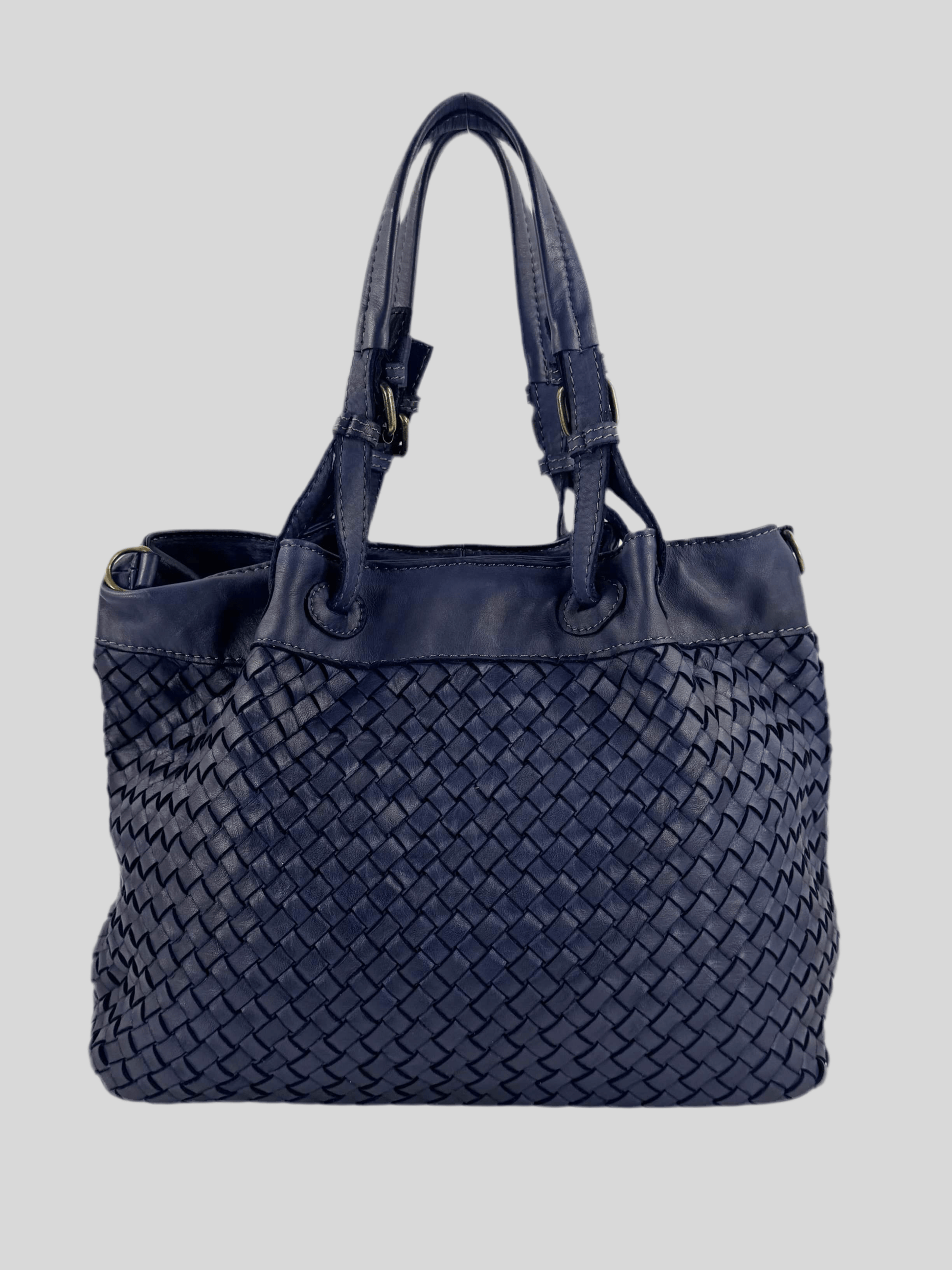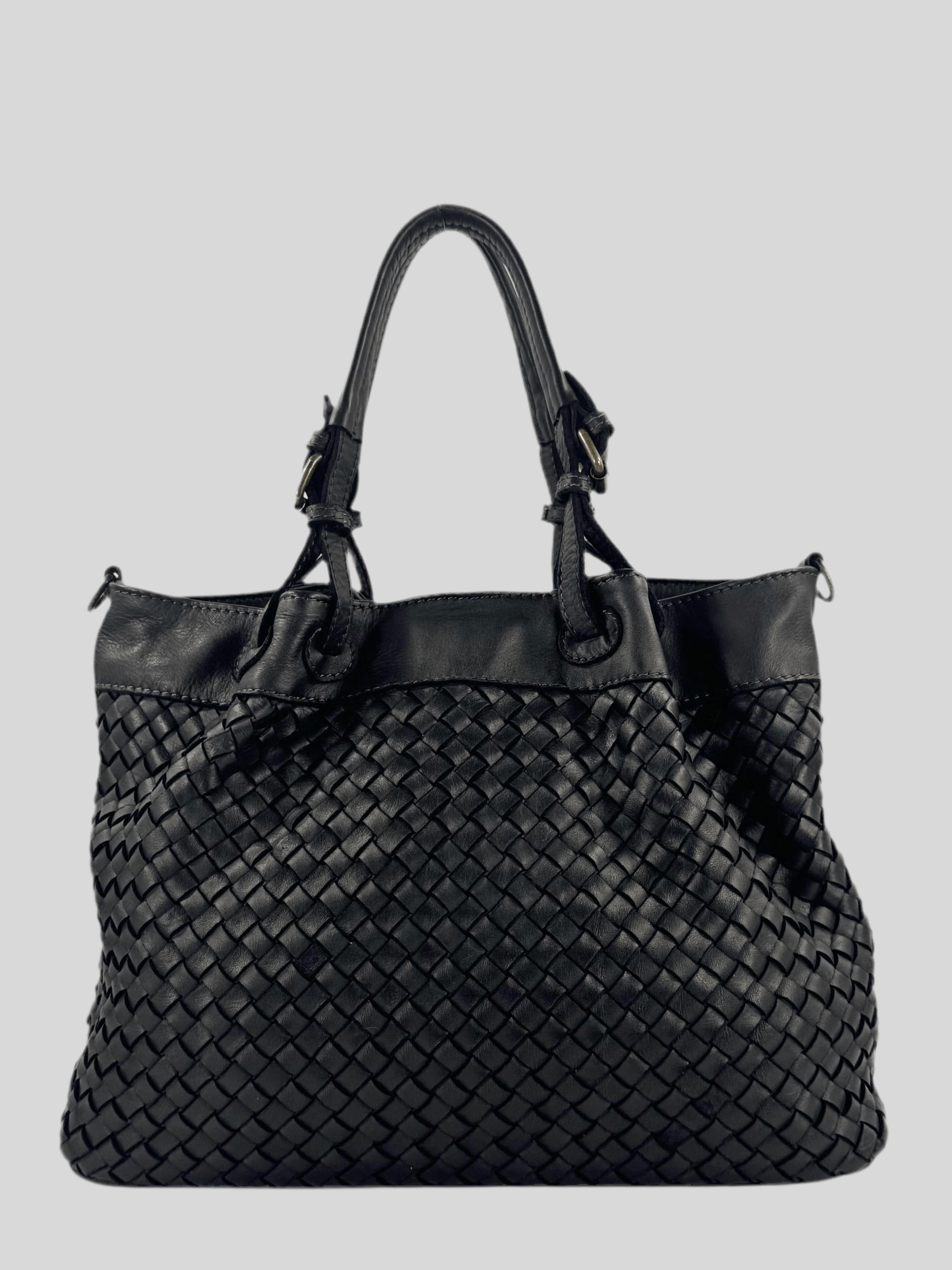 Borsa realizzata in pelle tinta in capo, comoda e morbida, frontale in pelle intrecciata, realizzato in maniera artigianale in Toscana.