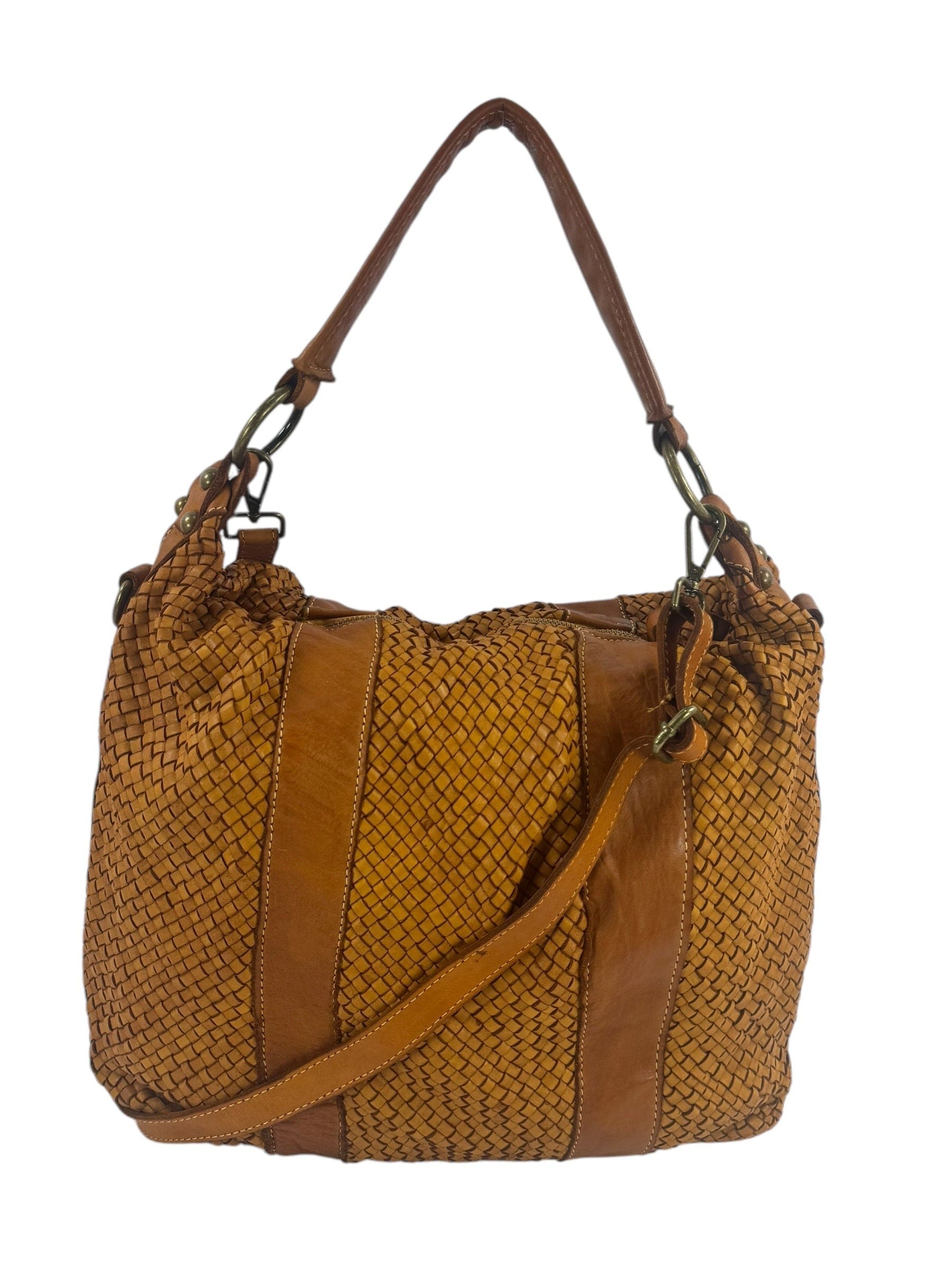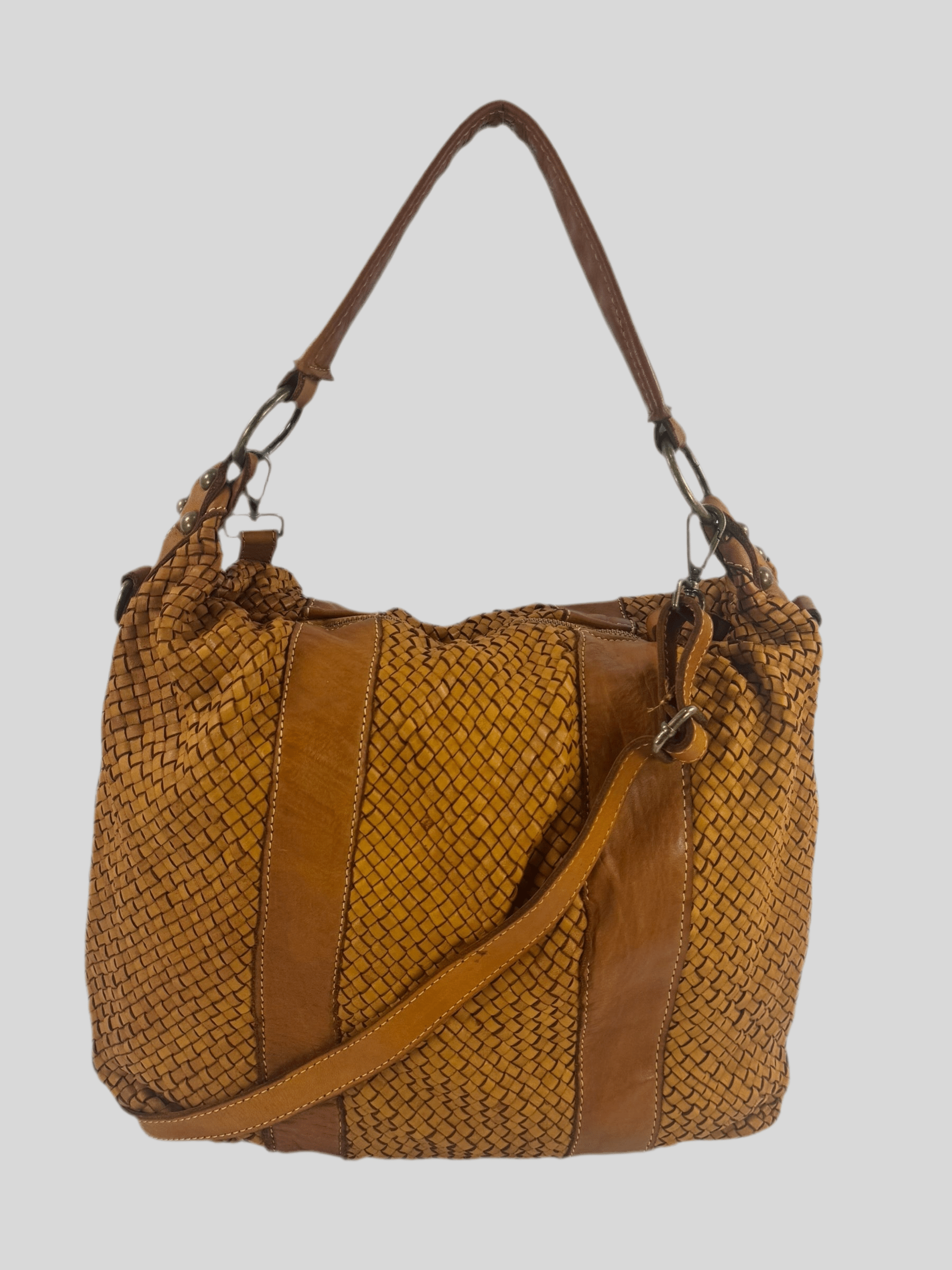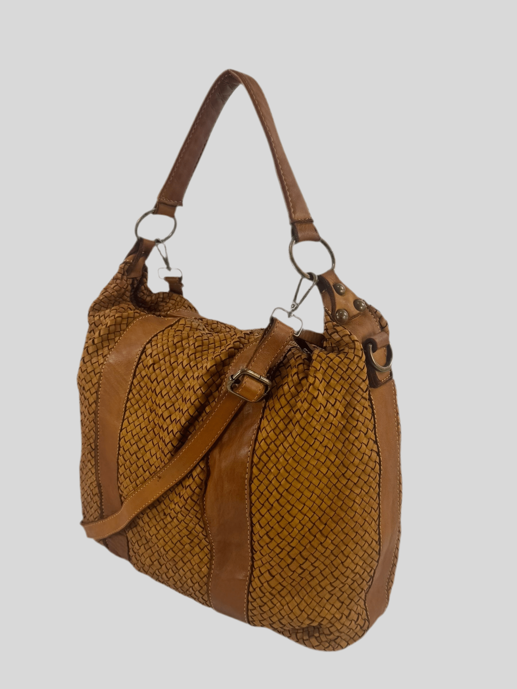 Borsa cestino in pelle intrecciata tinta in capo, effetto vintage, comoda, versatile, si porta sia a spalla che a tracolla, costruita in maniera artigianale con pellemi di alta qualità in Toscana