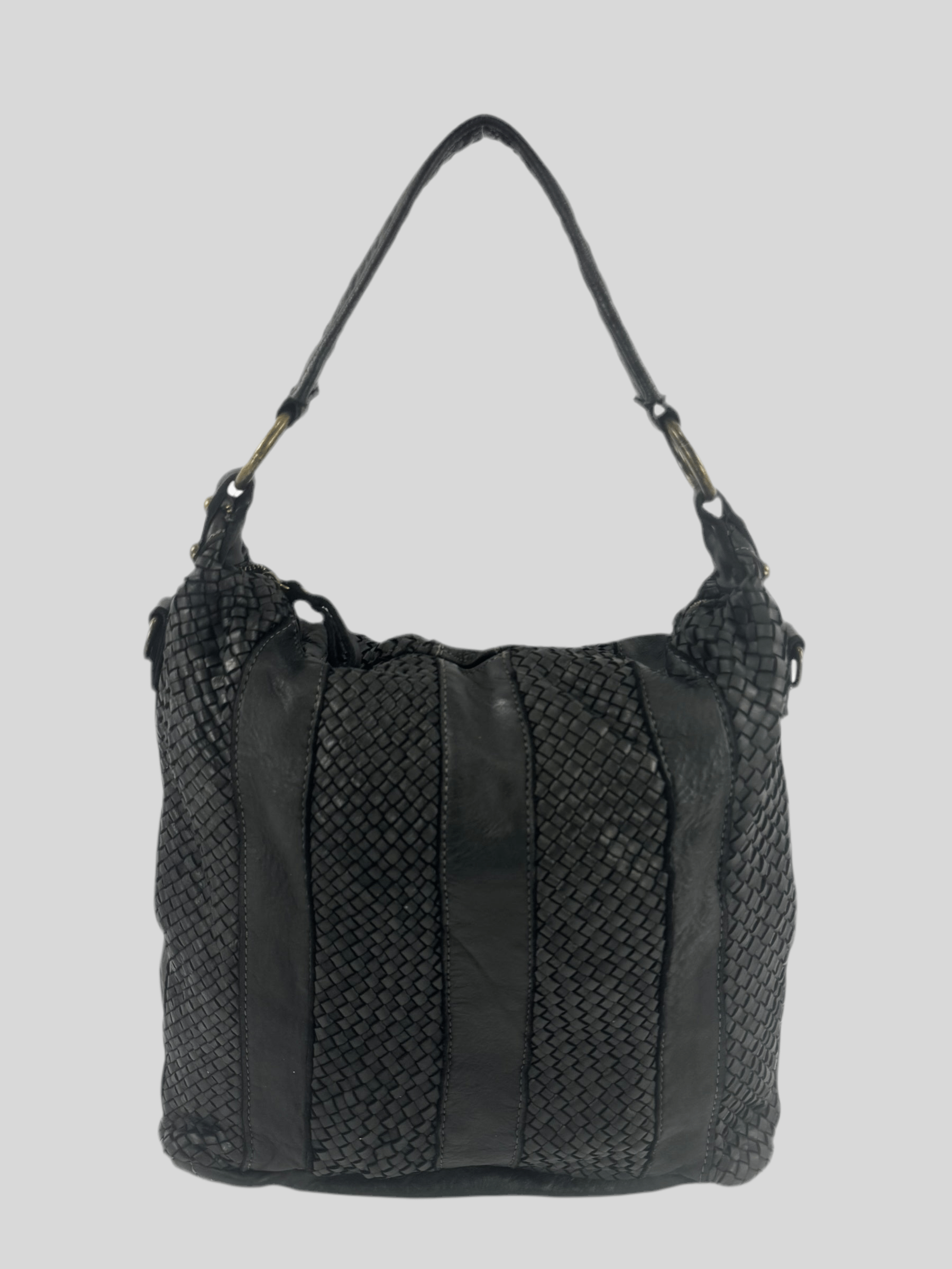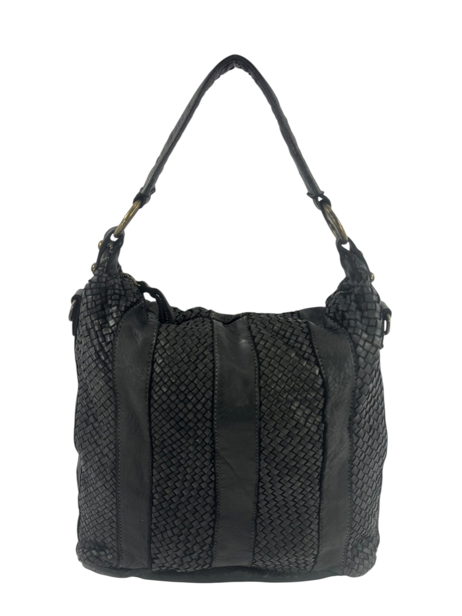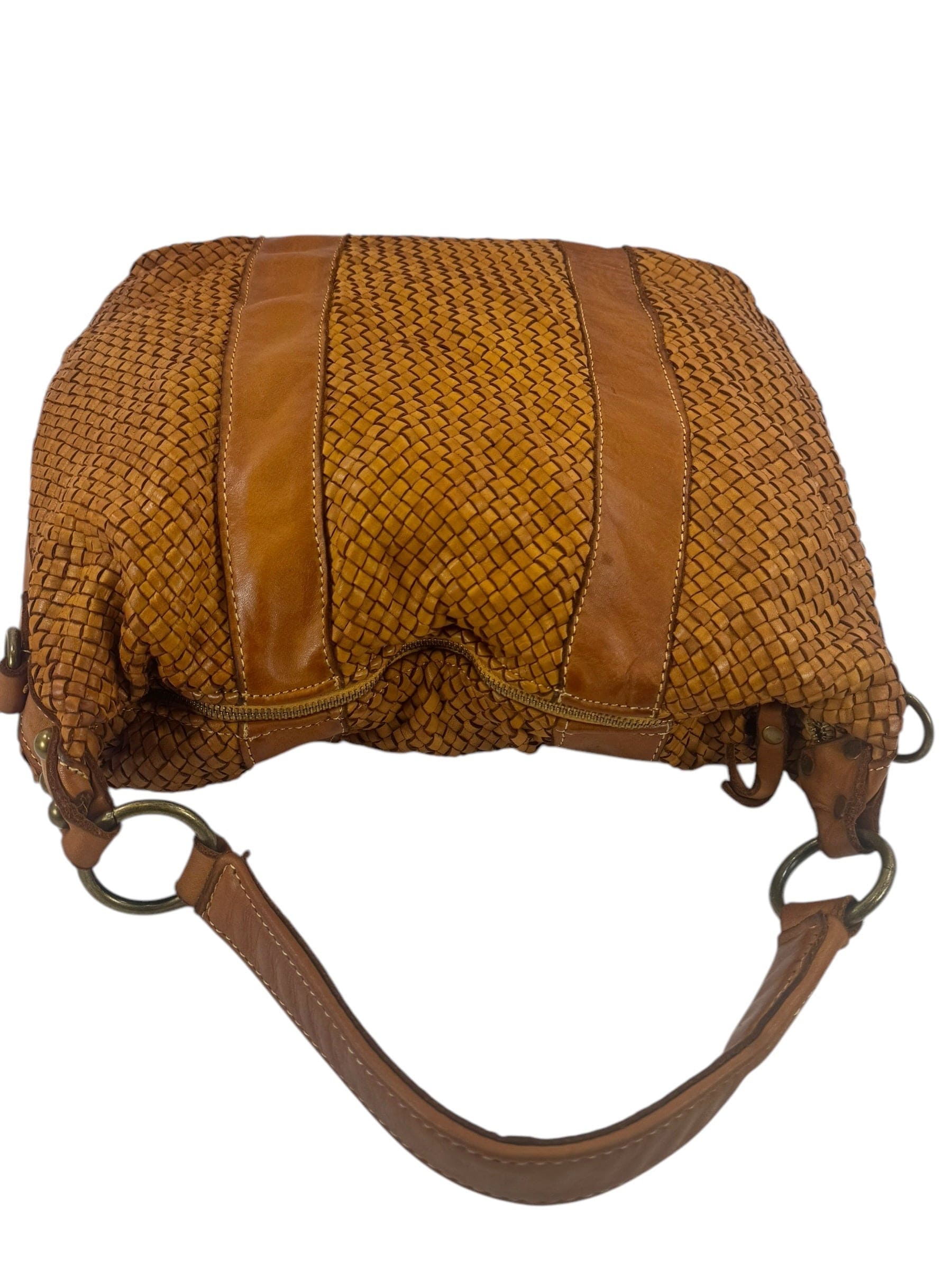 Borsa cestino in pelle intrecciata tinta in capo, effetto vintage, comoda, versatile, si porta sia a spalla che a tracolla, costruita in maniera artigianale con pellemi di alta qualità in Toscana