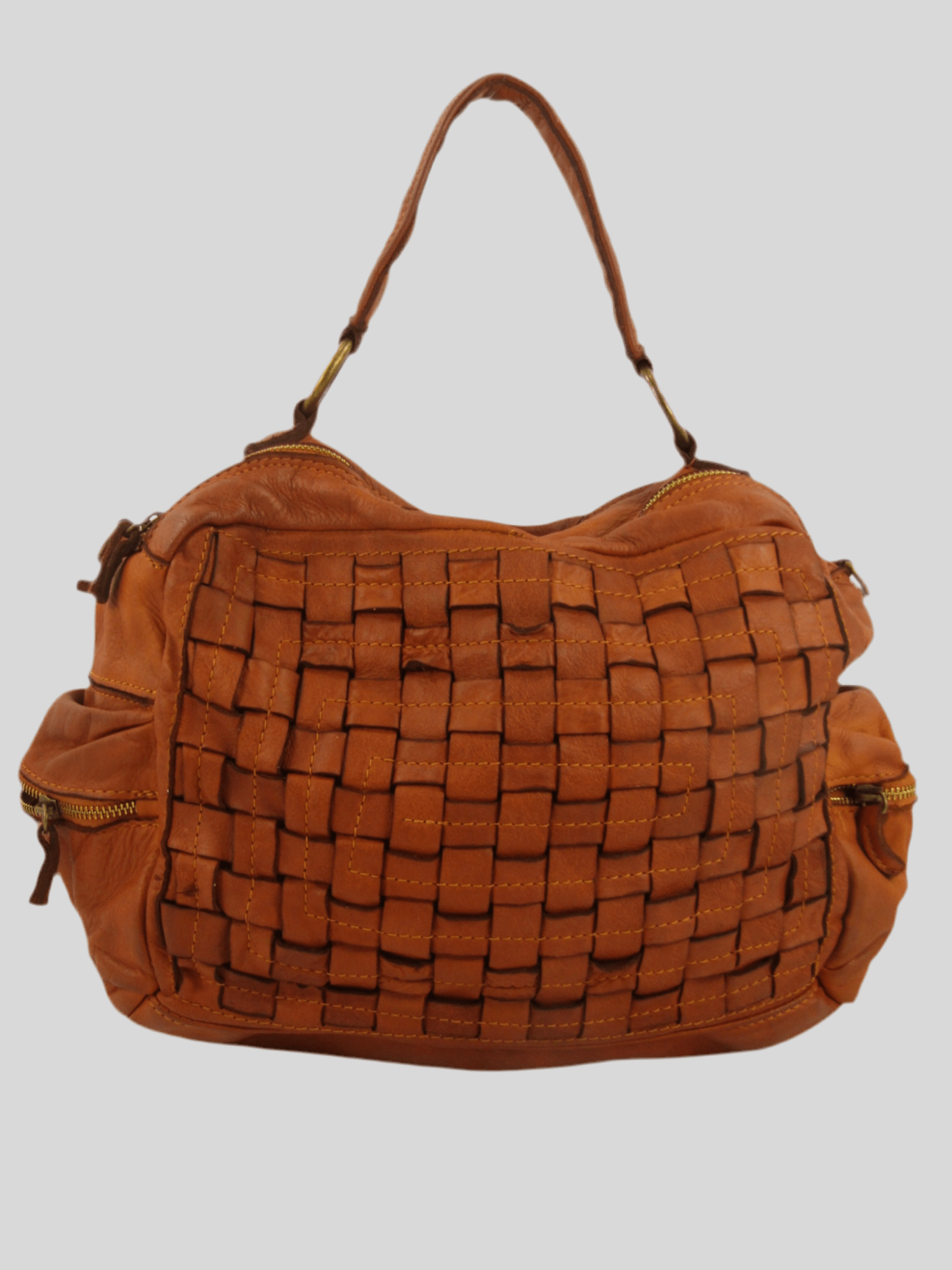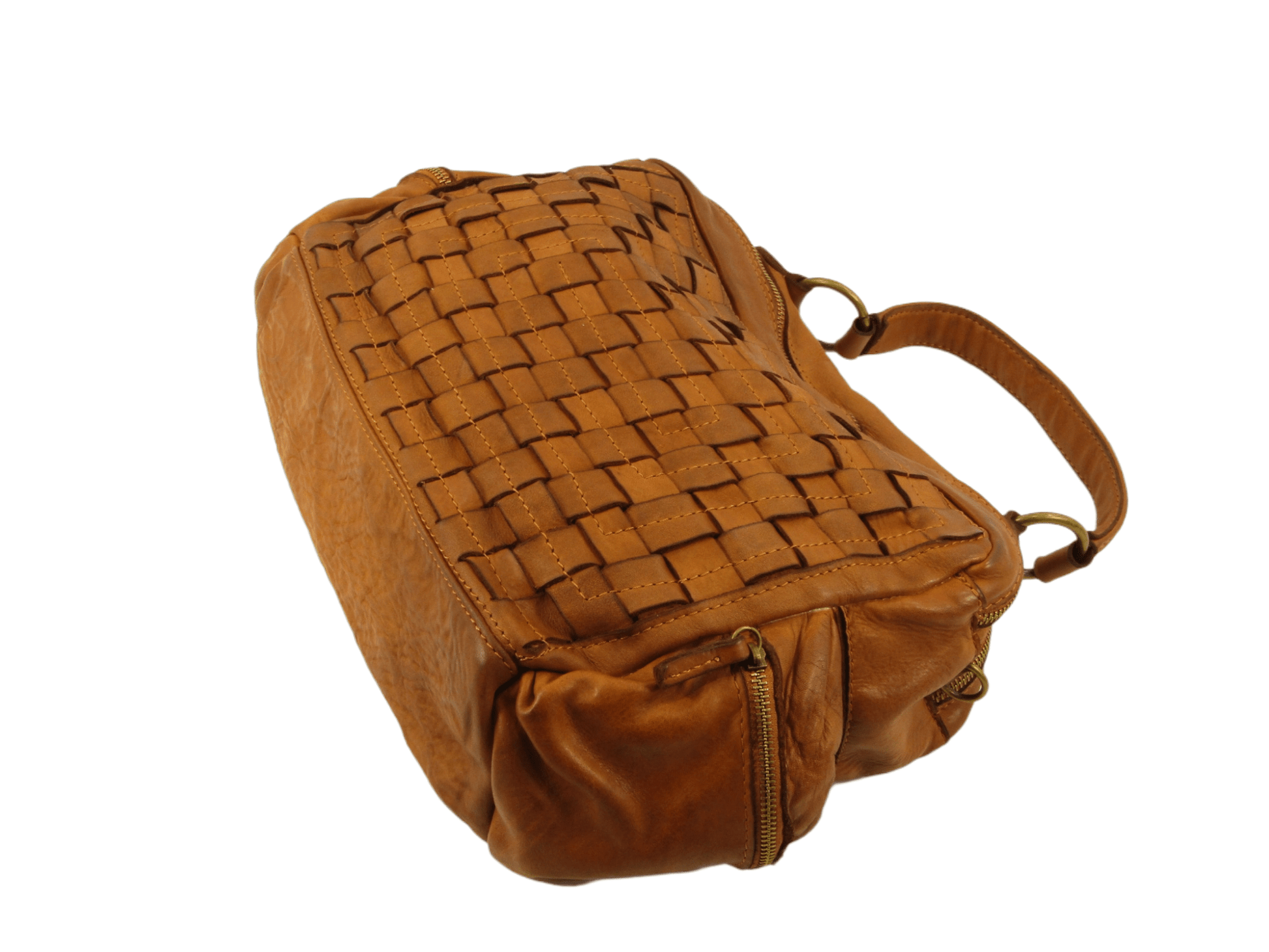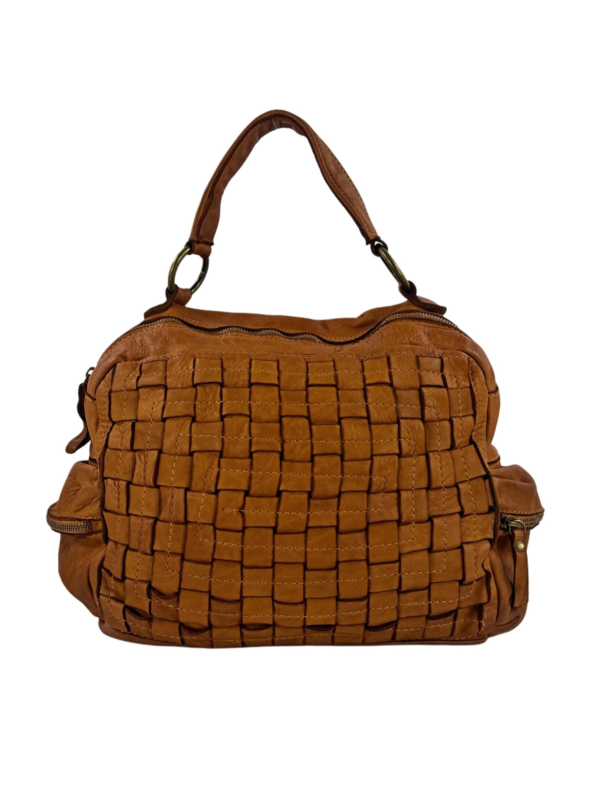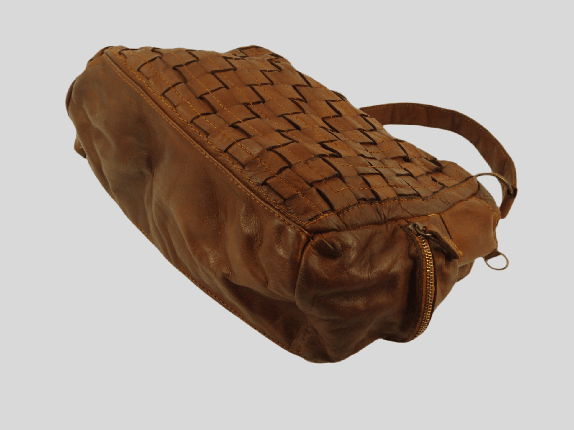 Bauletto Elena in pelle morbida tinto in capo, con frontale intrecciato e tasche laterali, due scomparti separati chiusi da zip, rivestiti ed accessoriati, borsa bella e comoda costruita in maniera artigianale con pellami di alta qualità, colori caldi e linee uniche