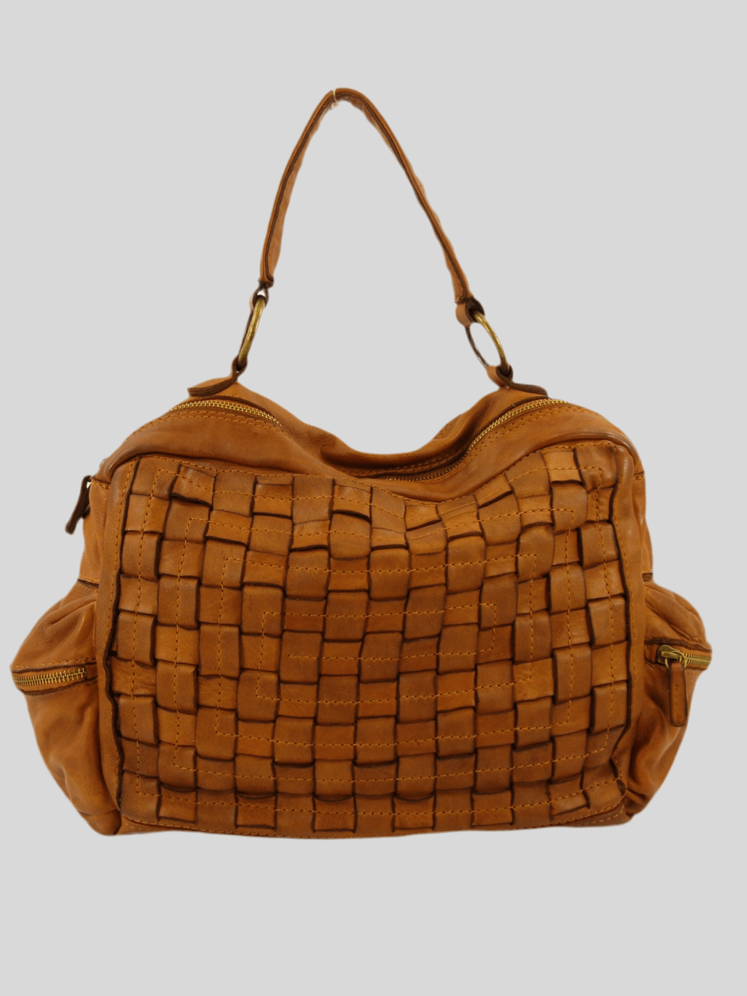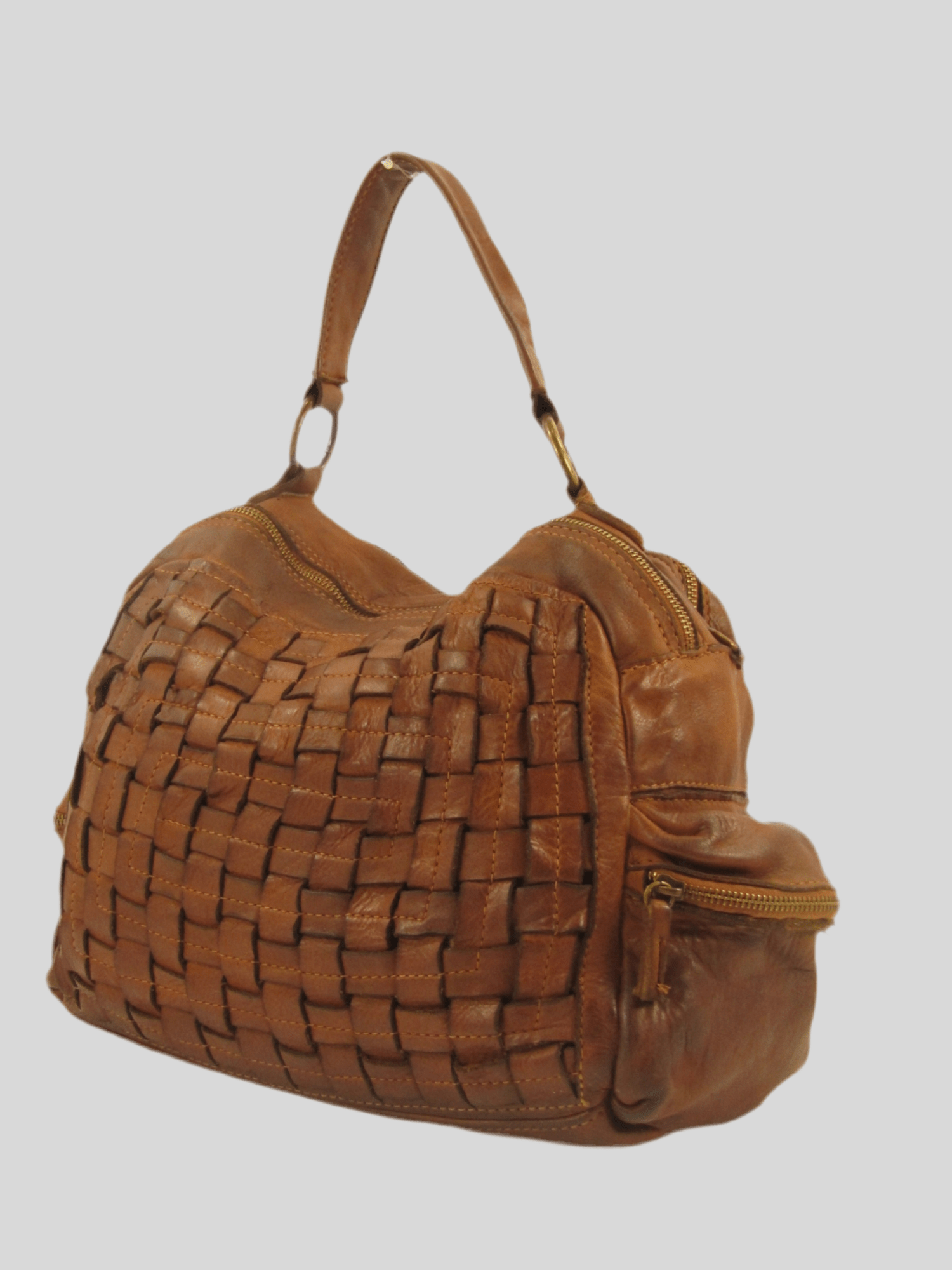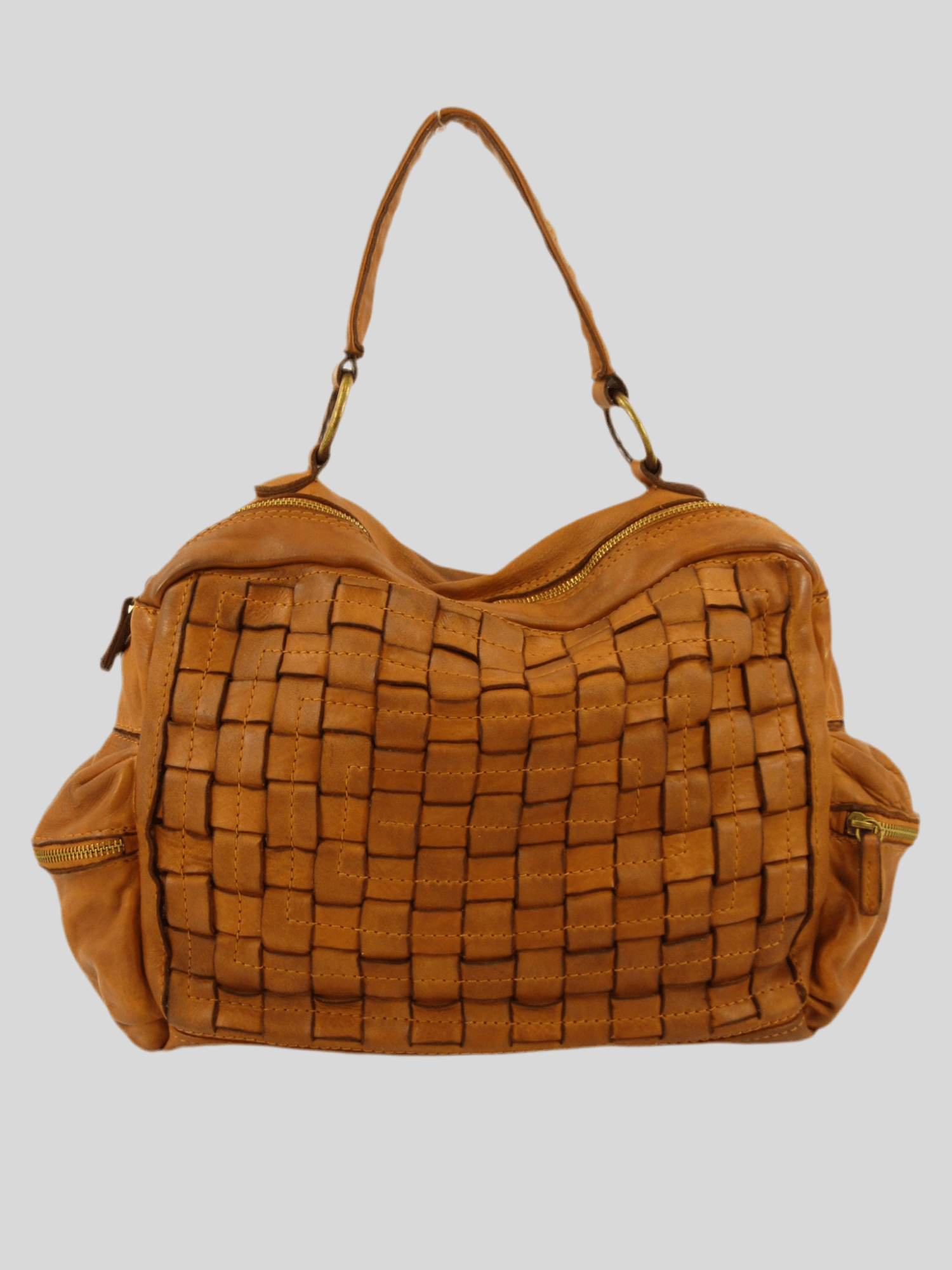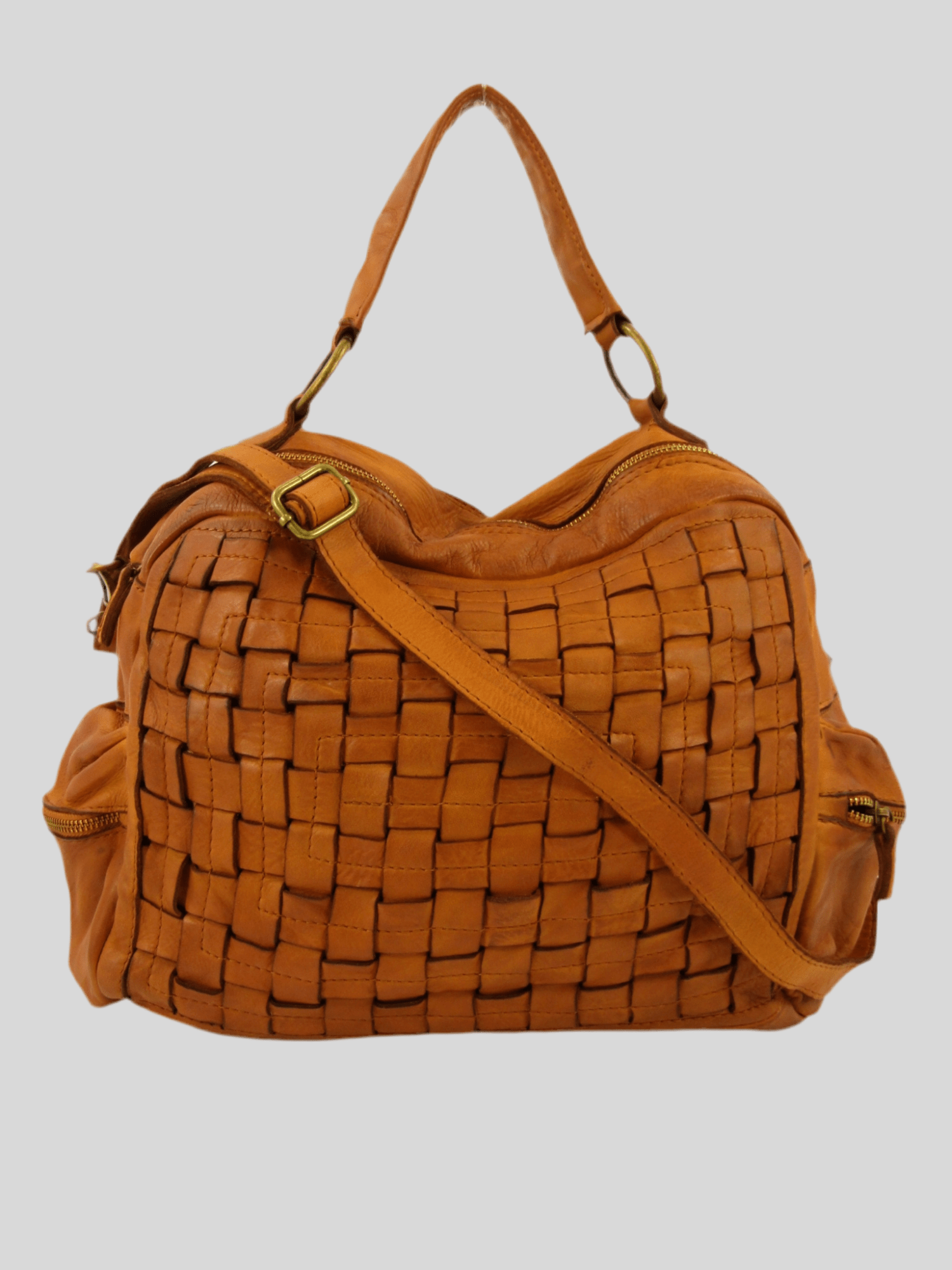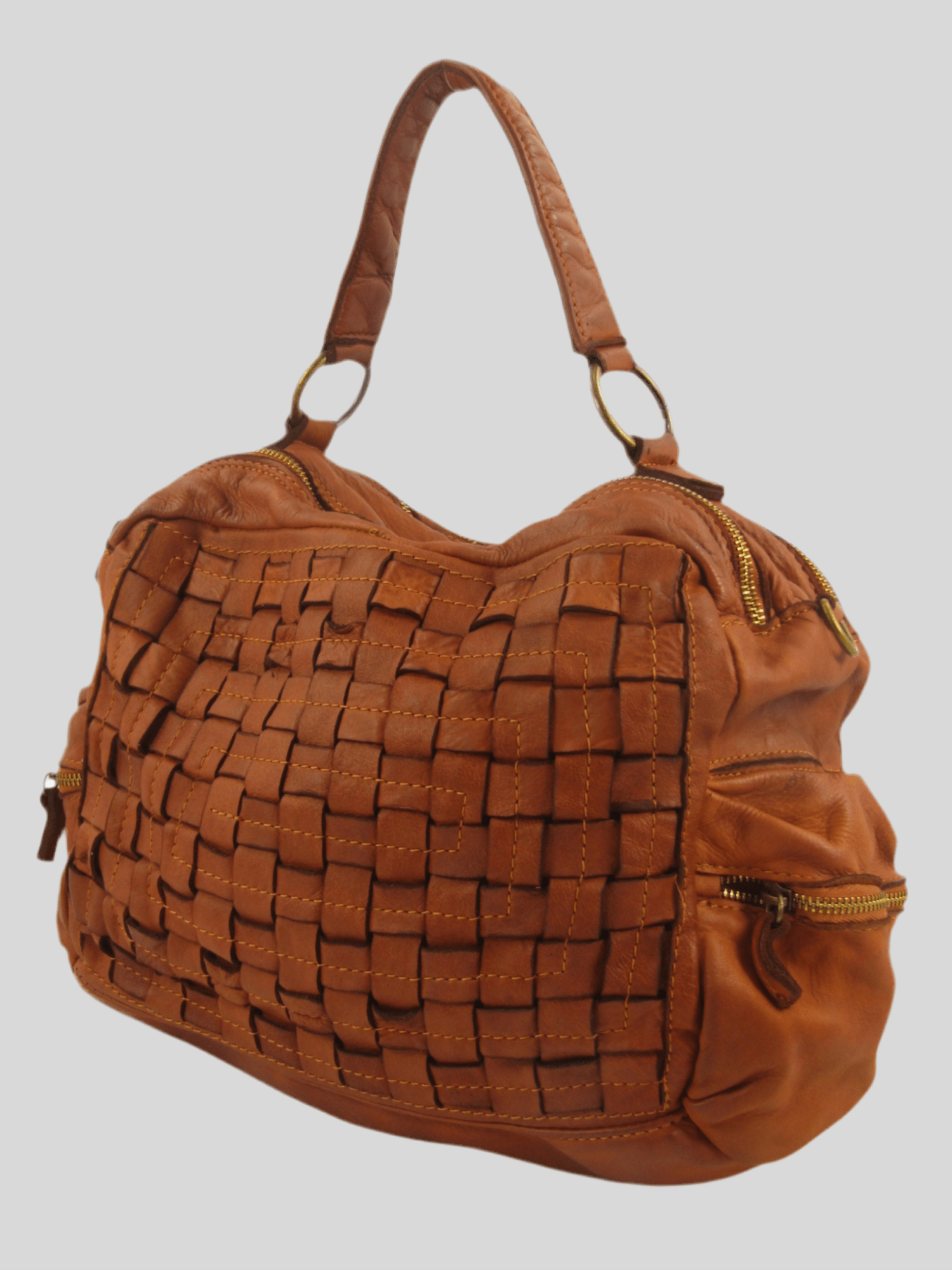 Bauletto Elena in pelle morbida tinto in capo, con frontale intrecciato e tasche laterali, due scomparti separati chiusi da zip, rivestiti ed accessoriati, borsa bella e comoda costruita in maniera artigianale con pellami di alta qualità, colori caldi e linee uniche
