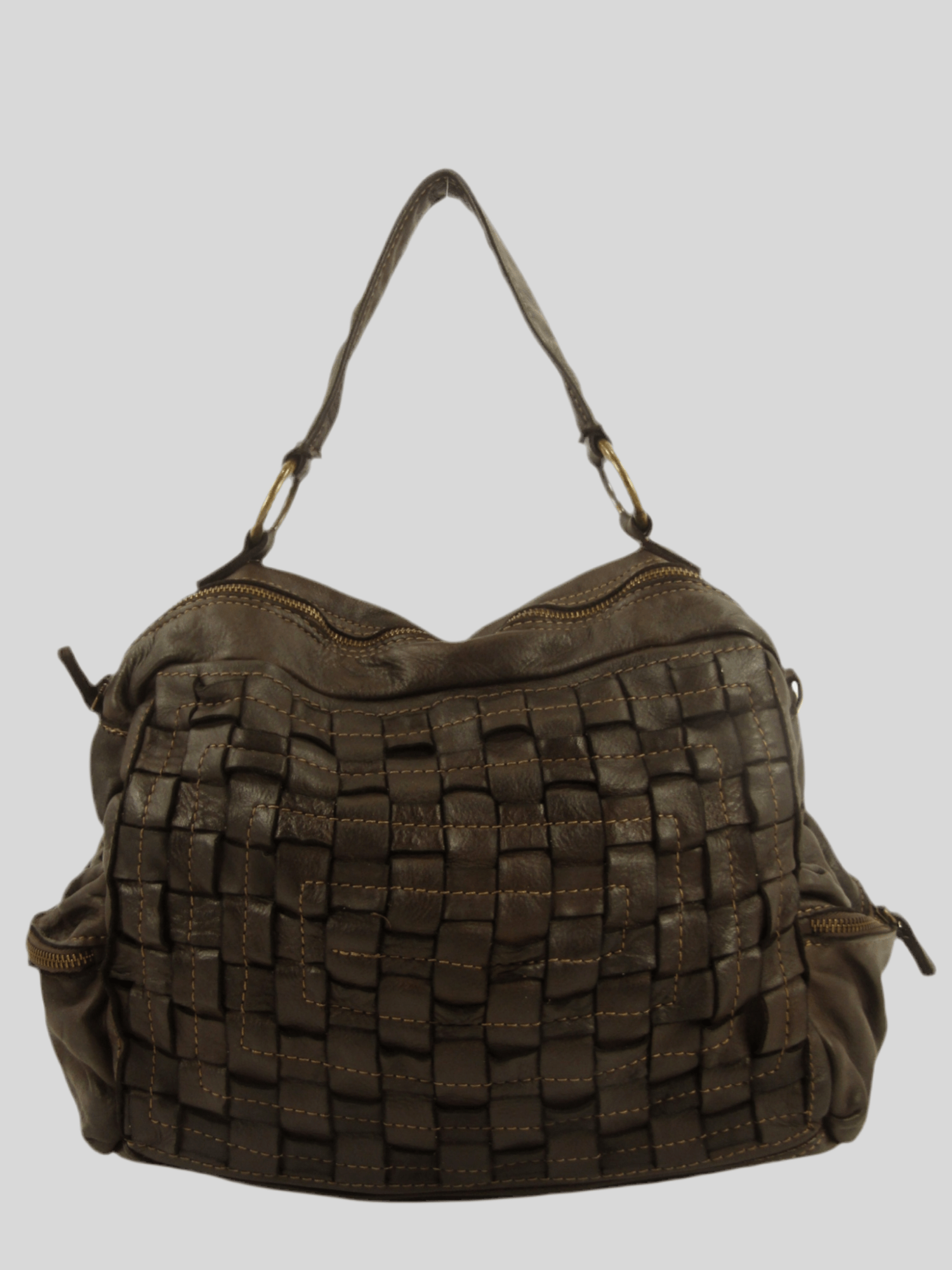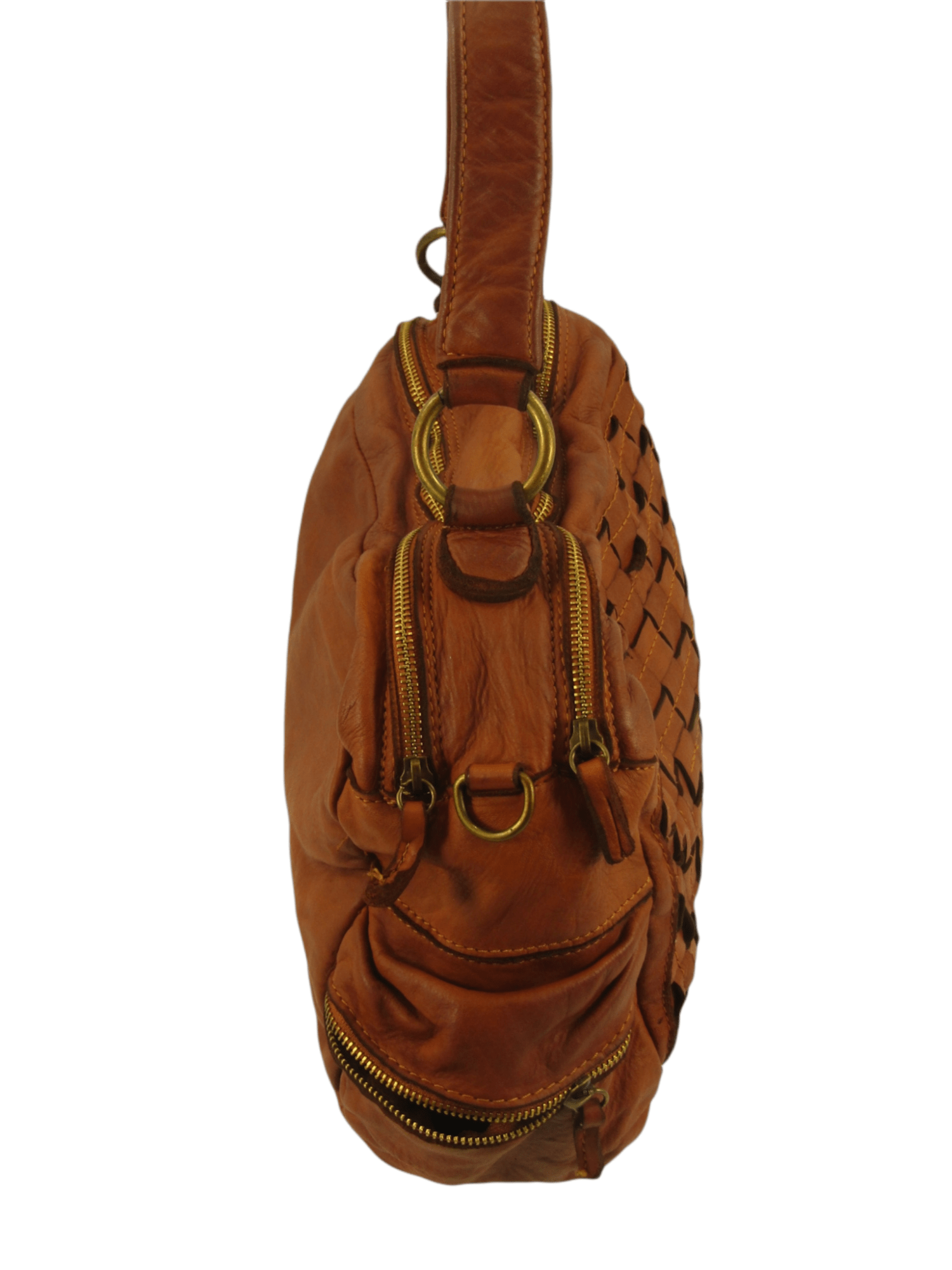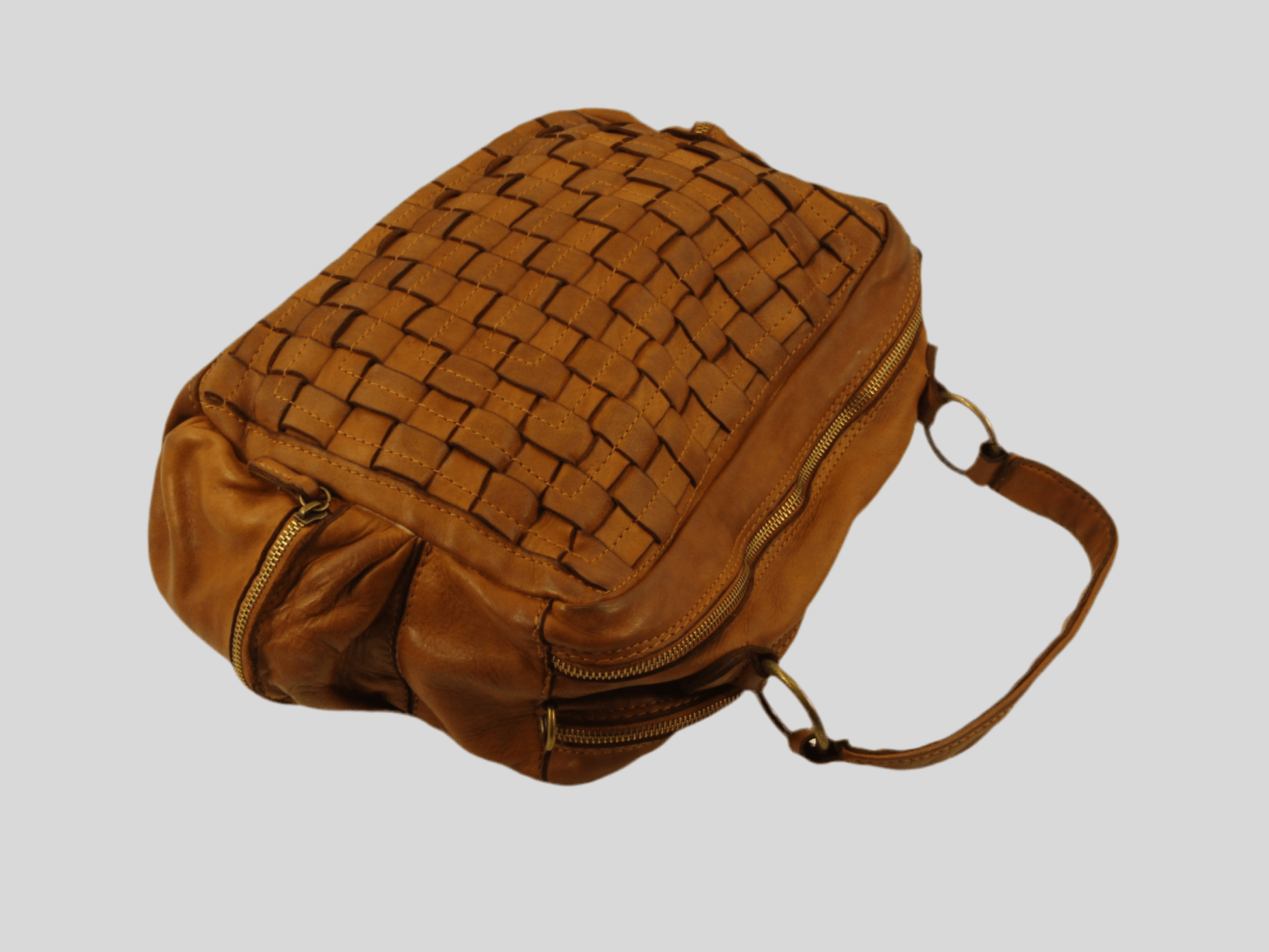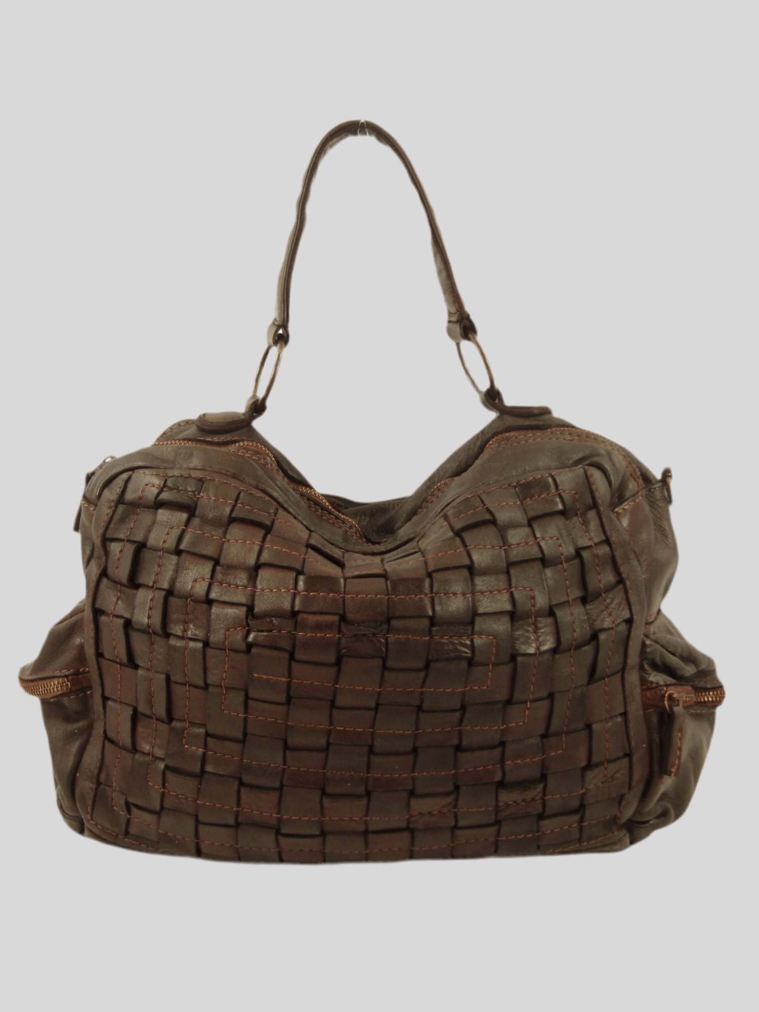 Bauletto Elena in pelle morbida tinto in capo, con frontale intrecciato e tasche laterali, due scomparti separati chiusi da zip, rivestiti ed accessoriati, borsa bella e comoda costruita in maniera artigianale con pellami di alta qualità, colori caldi e linee uniche