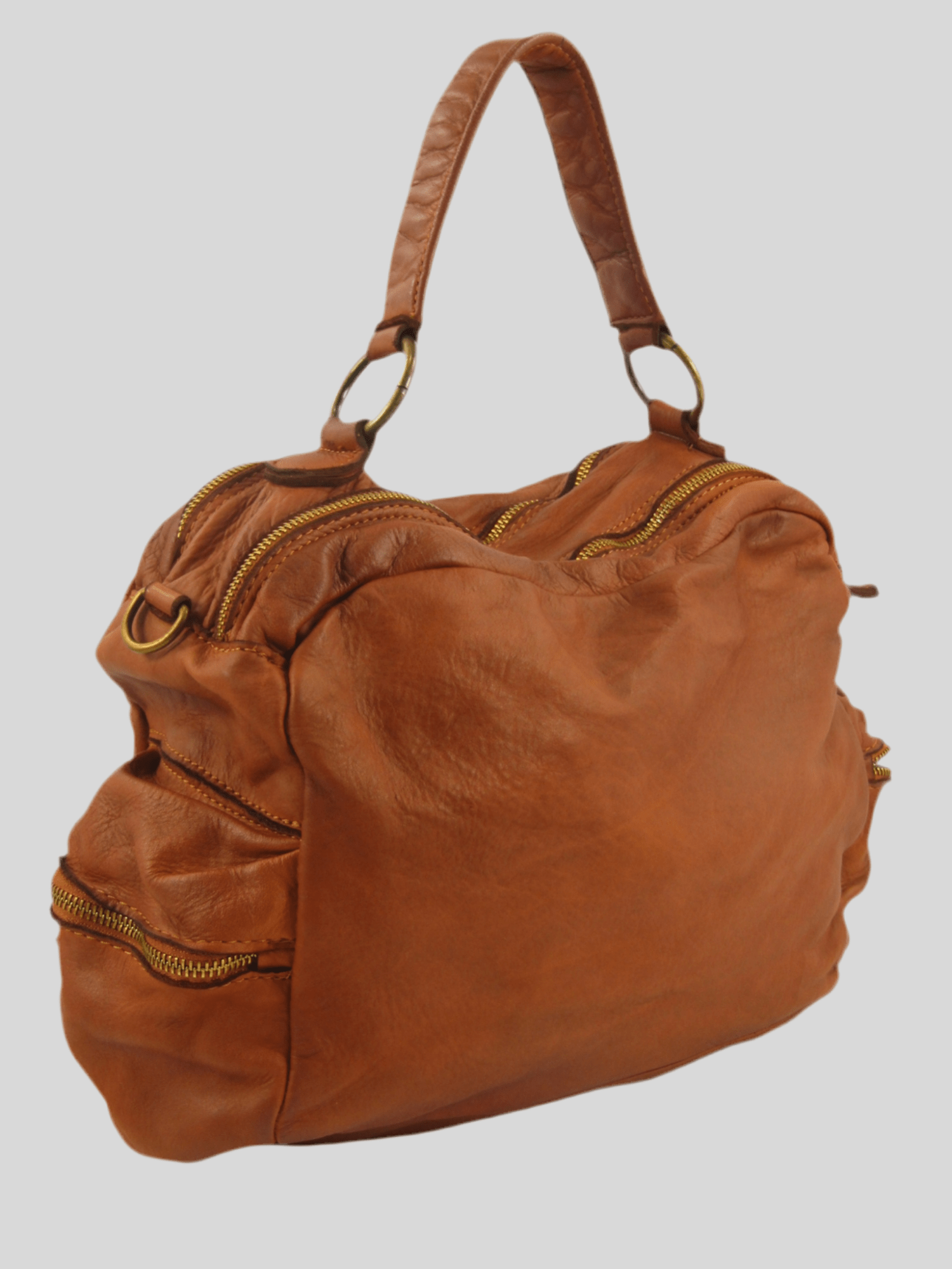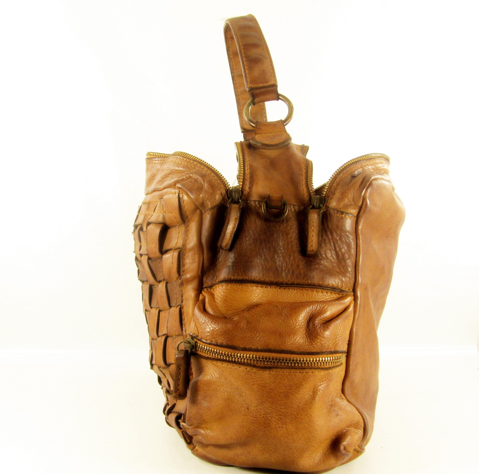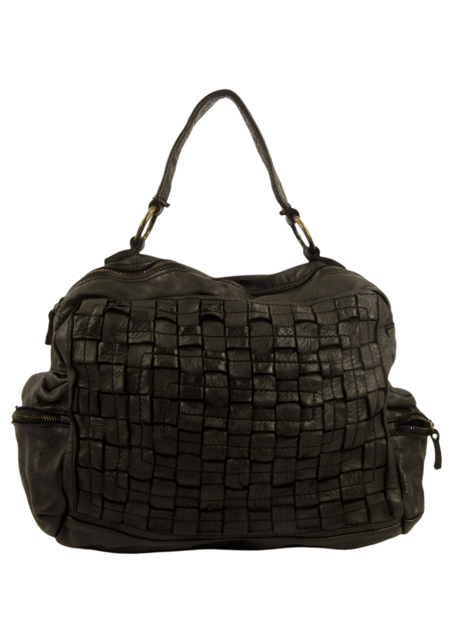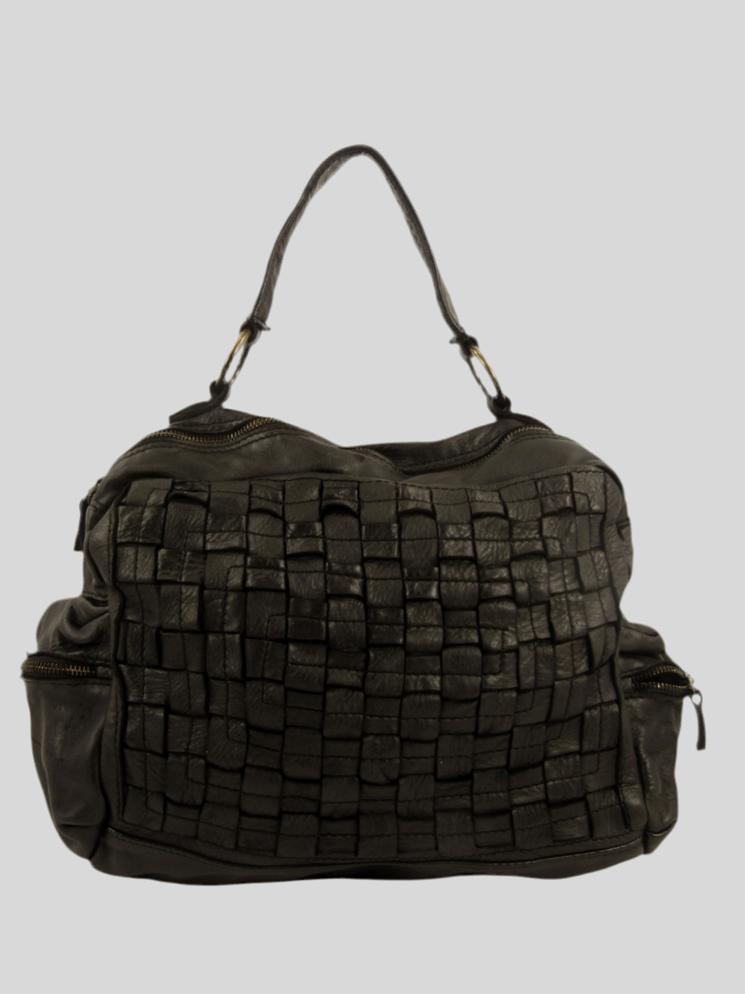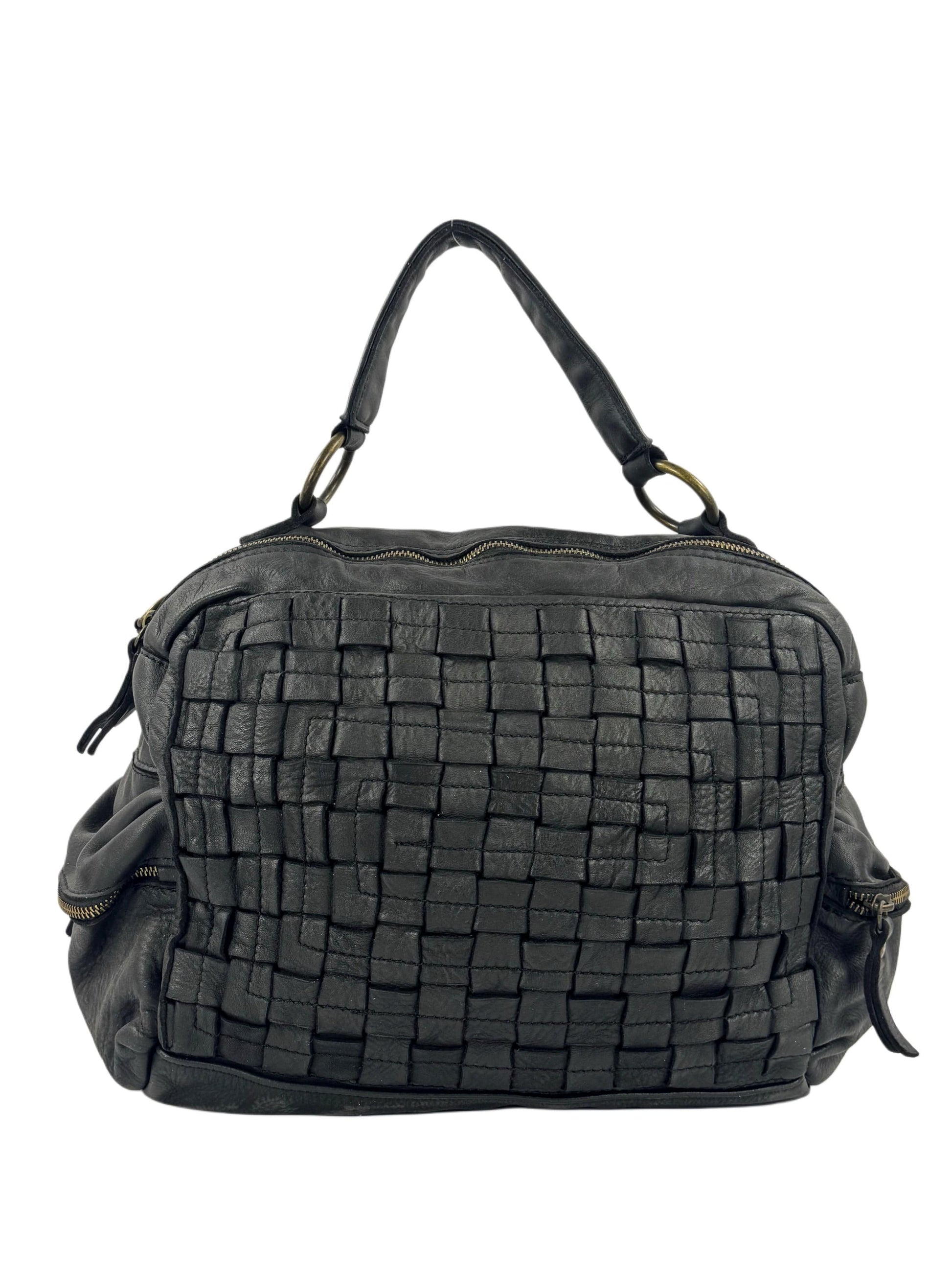 Bauletto Elena in pelle morbida tinto in capo, con frontale intrecciato e tasche laterali, due scomparti separati chiusi da zip, rivestiti ed accessoriati, borsa bella e comoda costruita in maniera artigianale con pellami di alta qualità, colori caldi e linee uniche