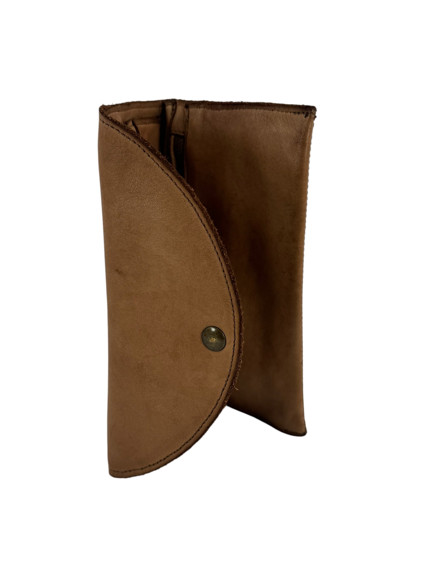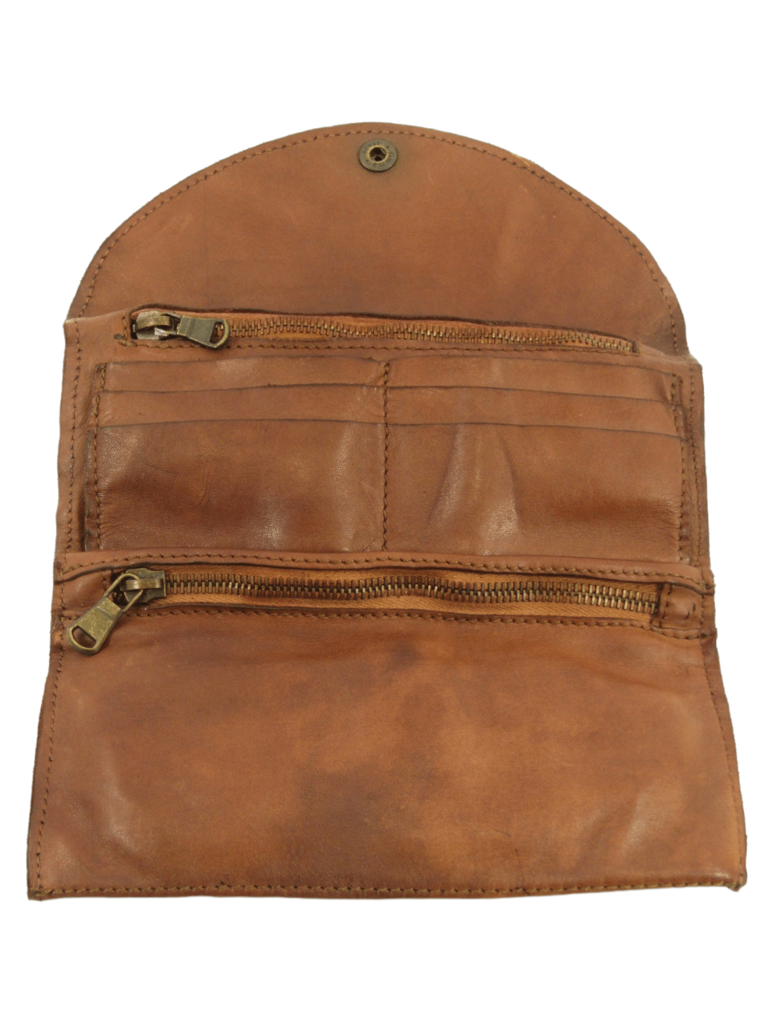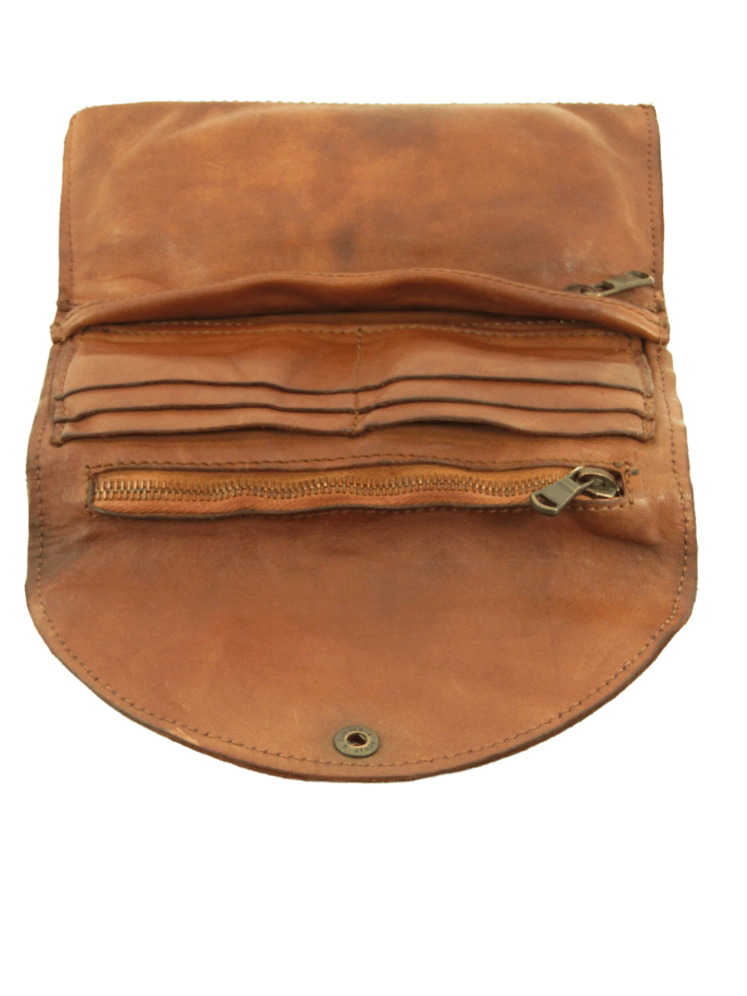 Portafogli/ portadocumenti in cuoio tinto in capo, chiuso con bottone a pressione, interno accessoriato con due tasche chiuse da zip ed una aperta e 6 fessure porta tessere, ogetto dalla forte personalità, di sicuro impatto, costruito in maniera artigianale con pellami di prima qualità in Toscana