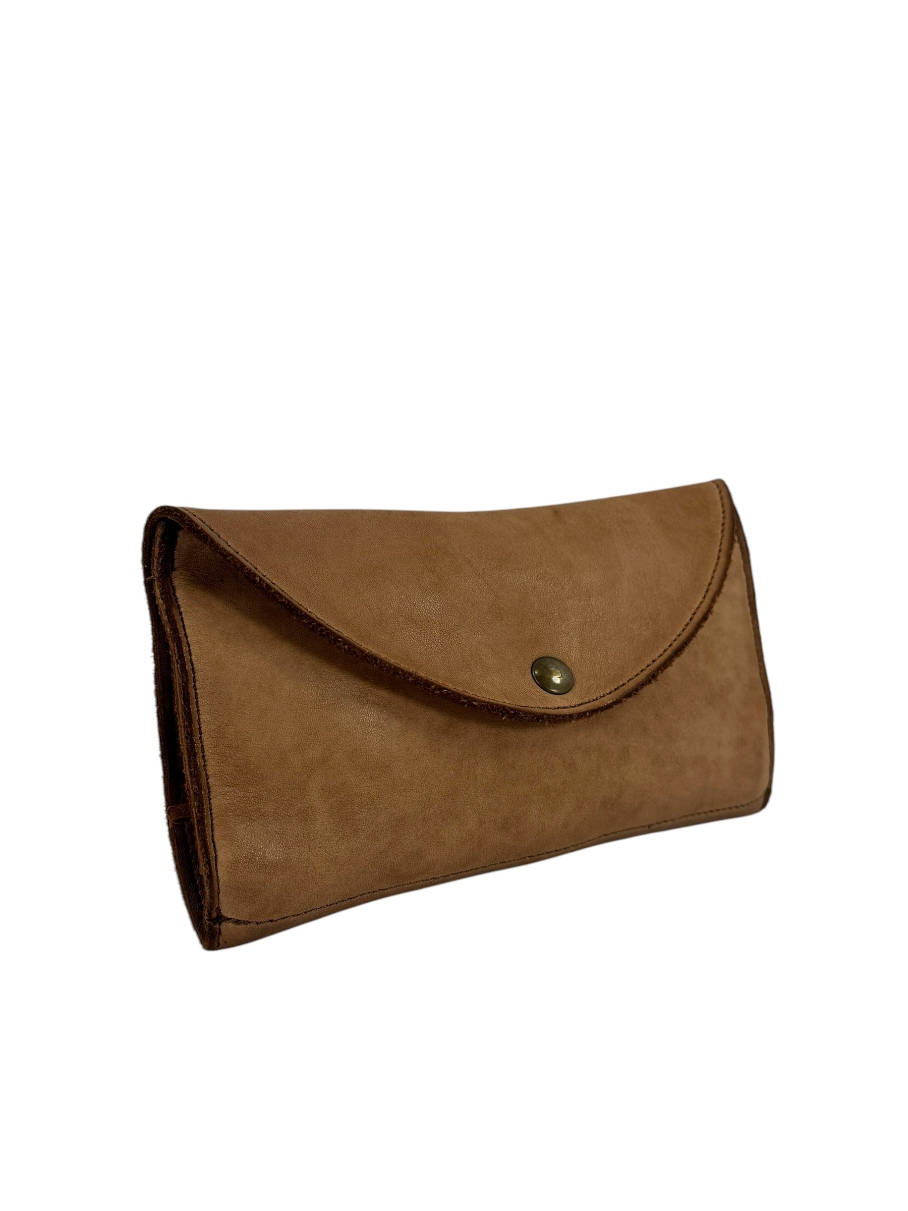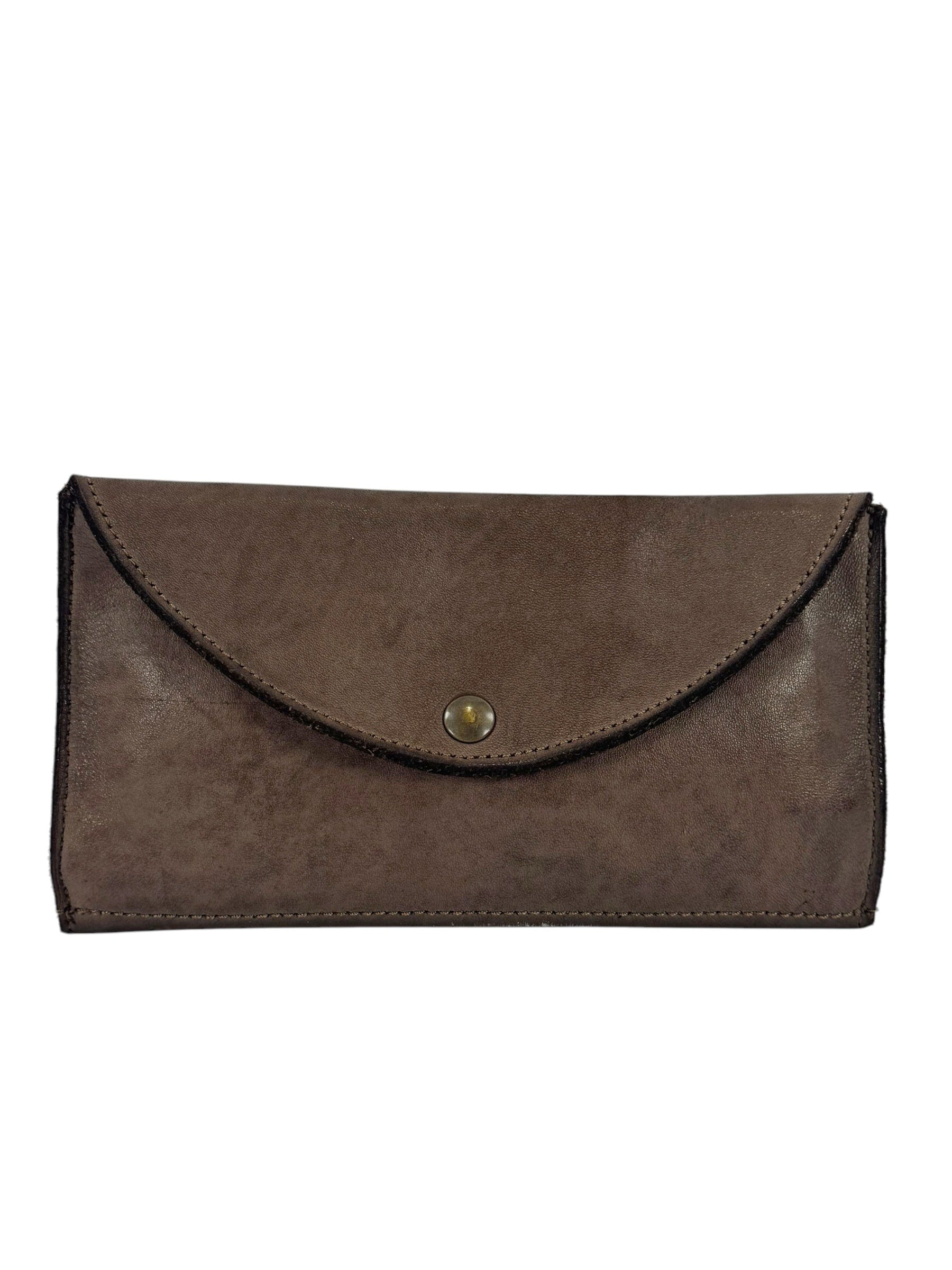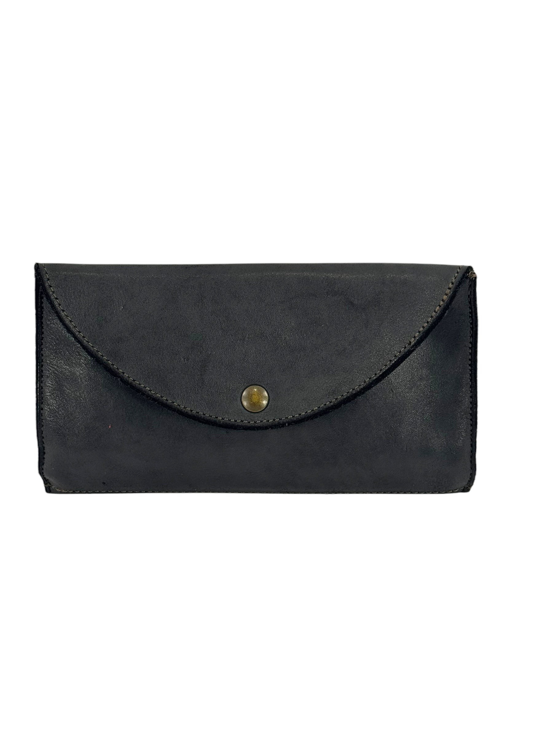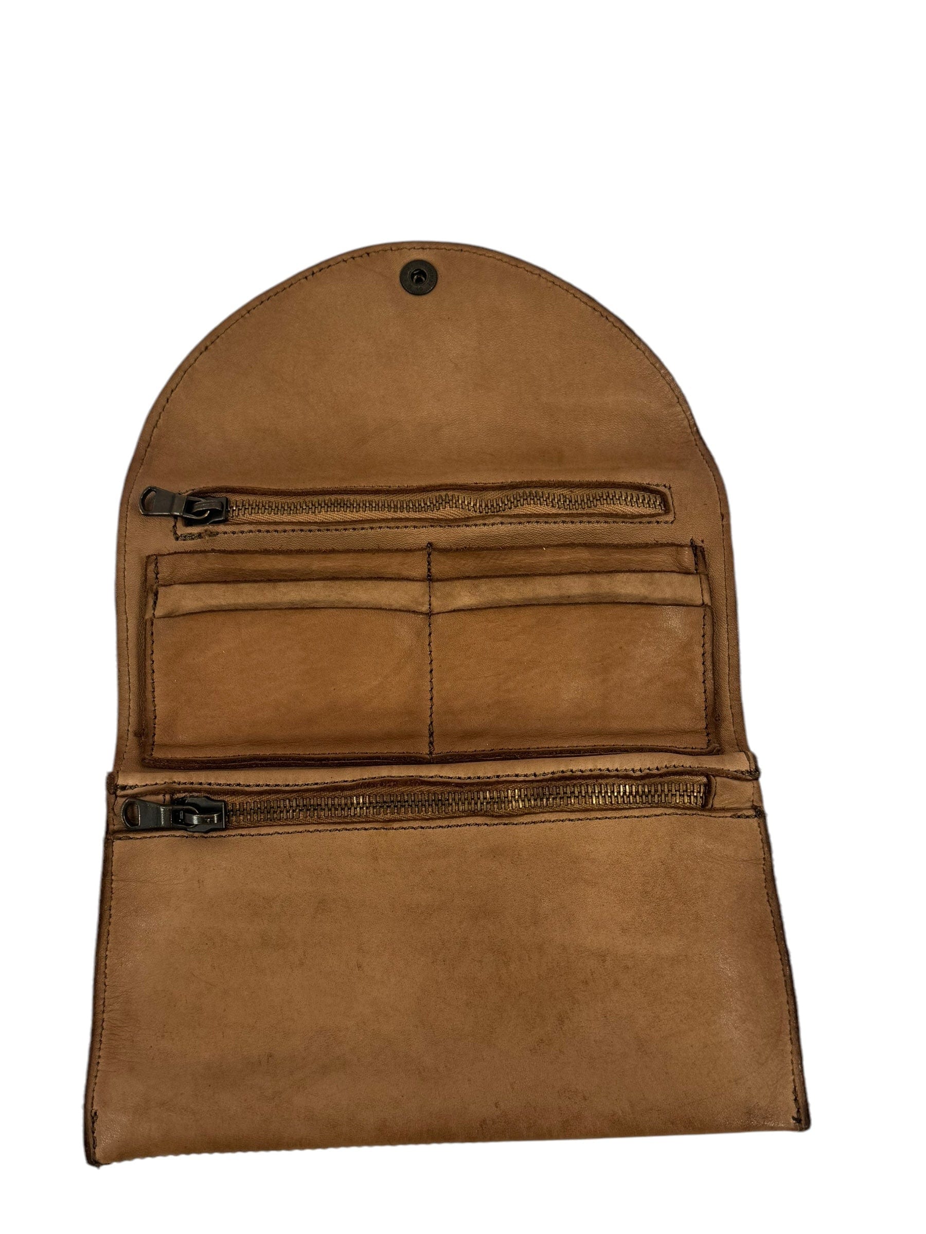Portafogli/ portadocumenti in cuoio tinto in capo, chiuso con bottone a pressione, interno accessoriato con due tasche chiuse da zip ed una aperta e 6 fessure porta tessere, ogetto dalla forte personalità, di sicuro impatto, costruito in maniera artigianale con pellami di prima qualità in Toscana