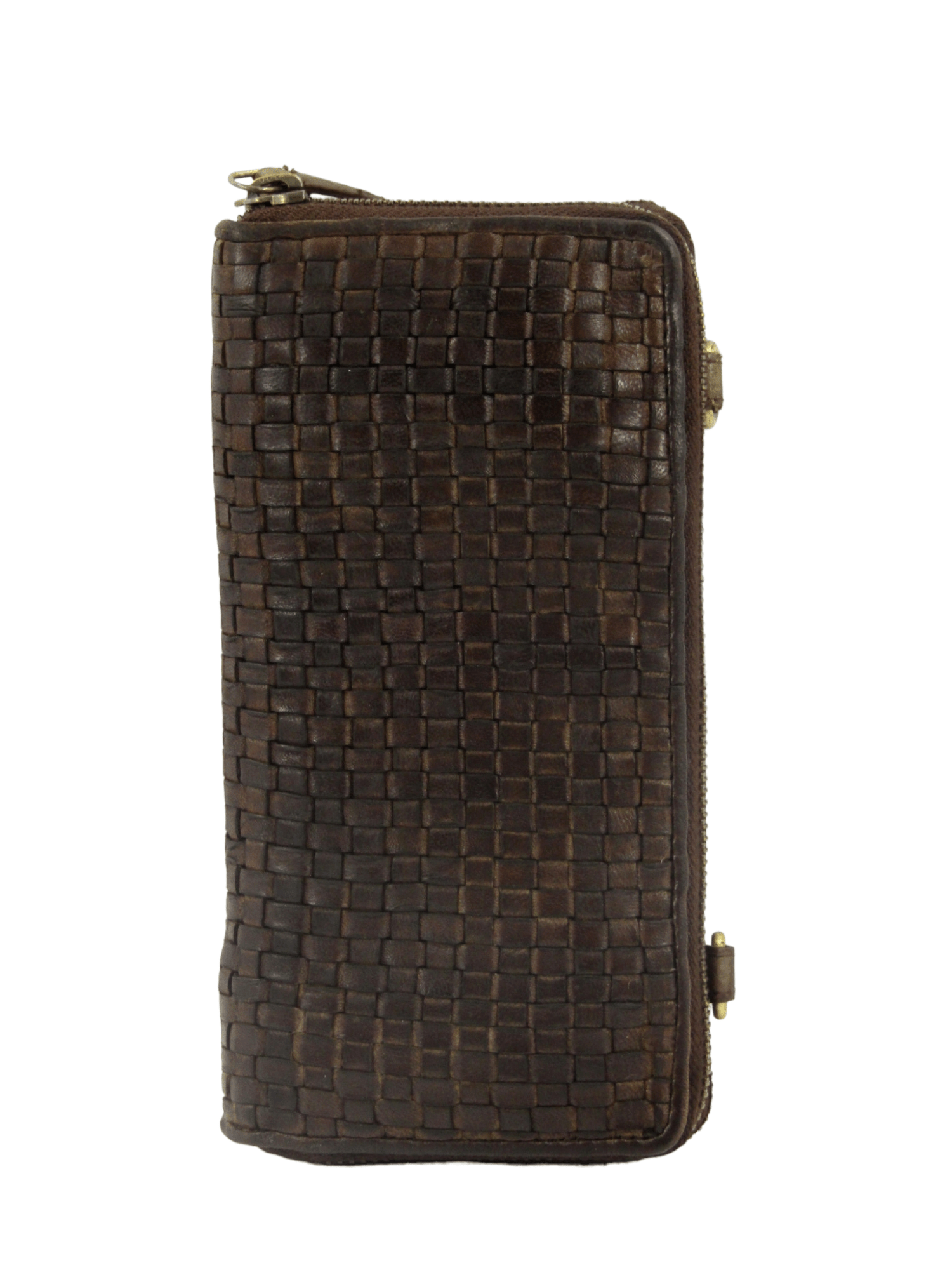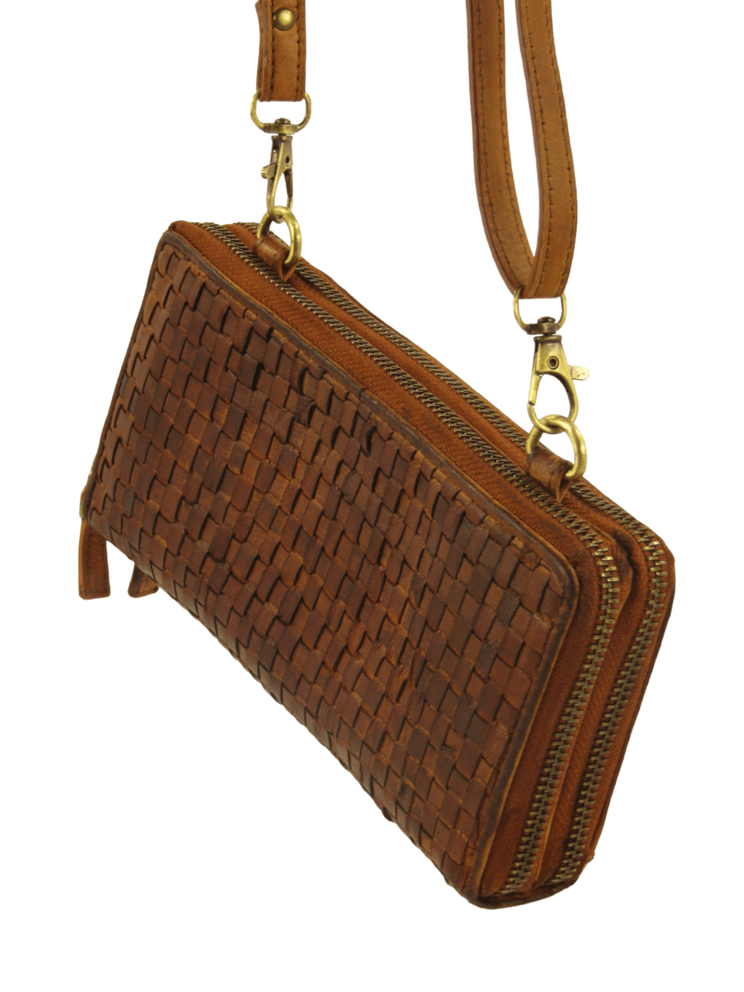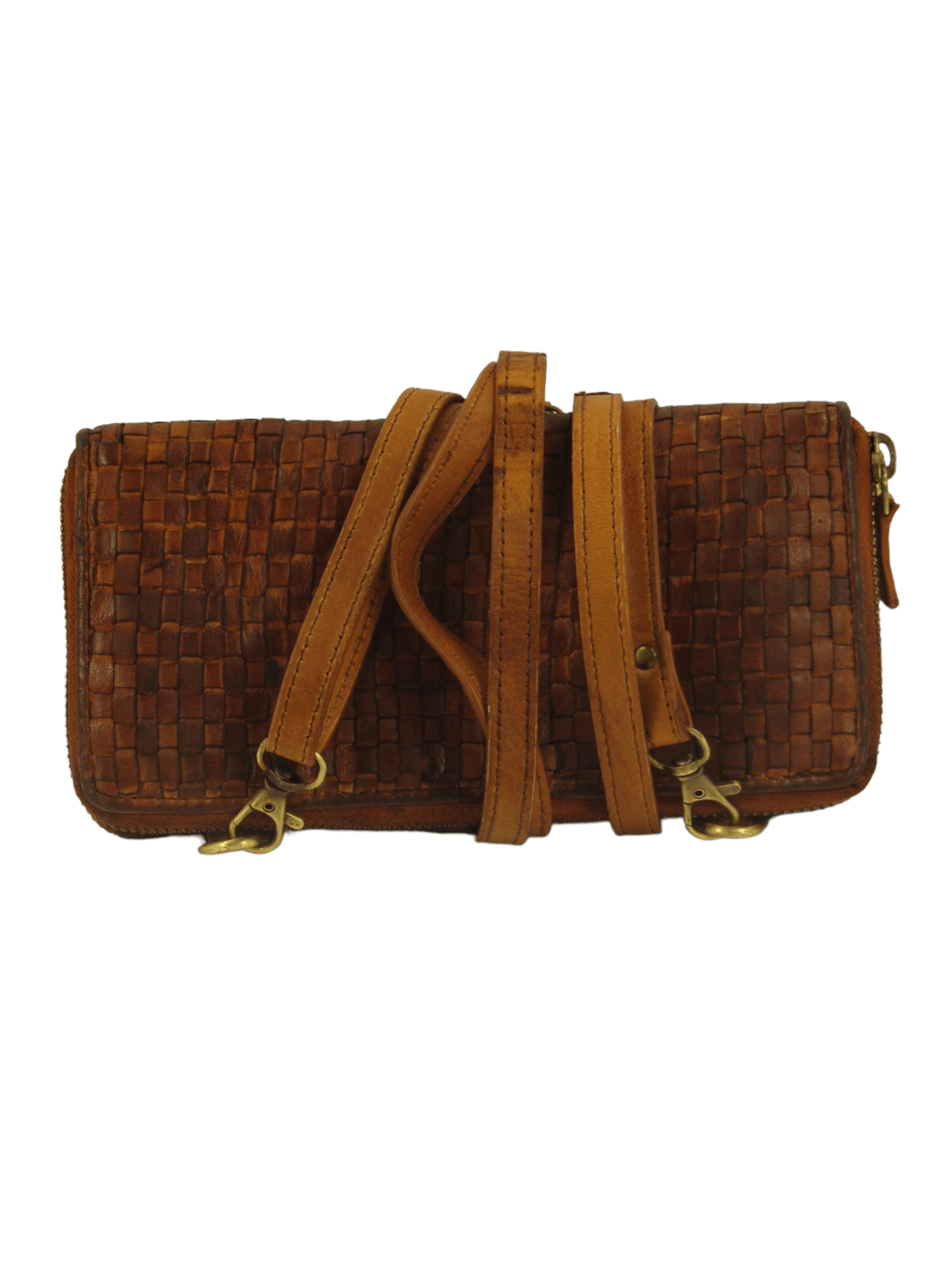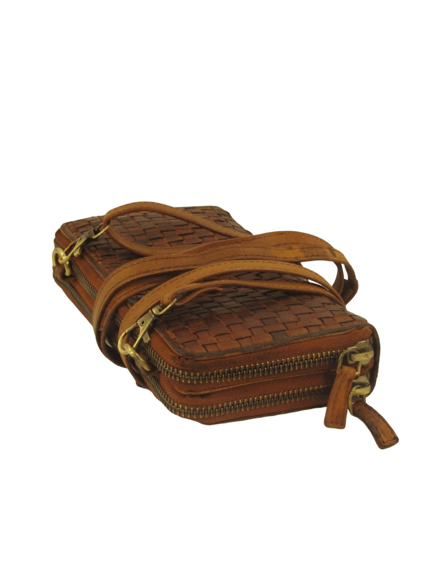 Portafogli in pelle vintage con frontale intrecciato, due scomparti separati chiusi da zip, accessoriati con tasche porta documenti e porta tessere, in uno dei due scomparti troviamo una tasca centrale chiusa da zip, capiente e pratico, dotato anche di tracollina in pelle regolabile e rimovibile, costruito con pellami di alta qualità