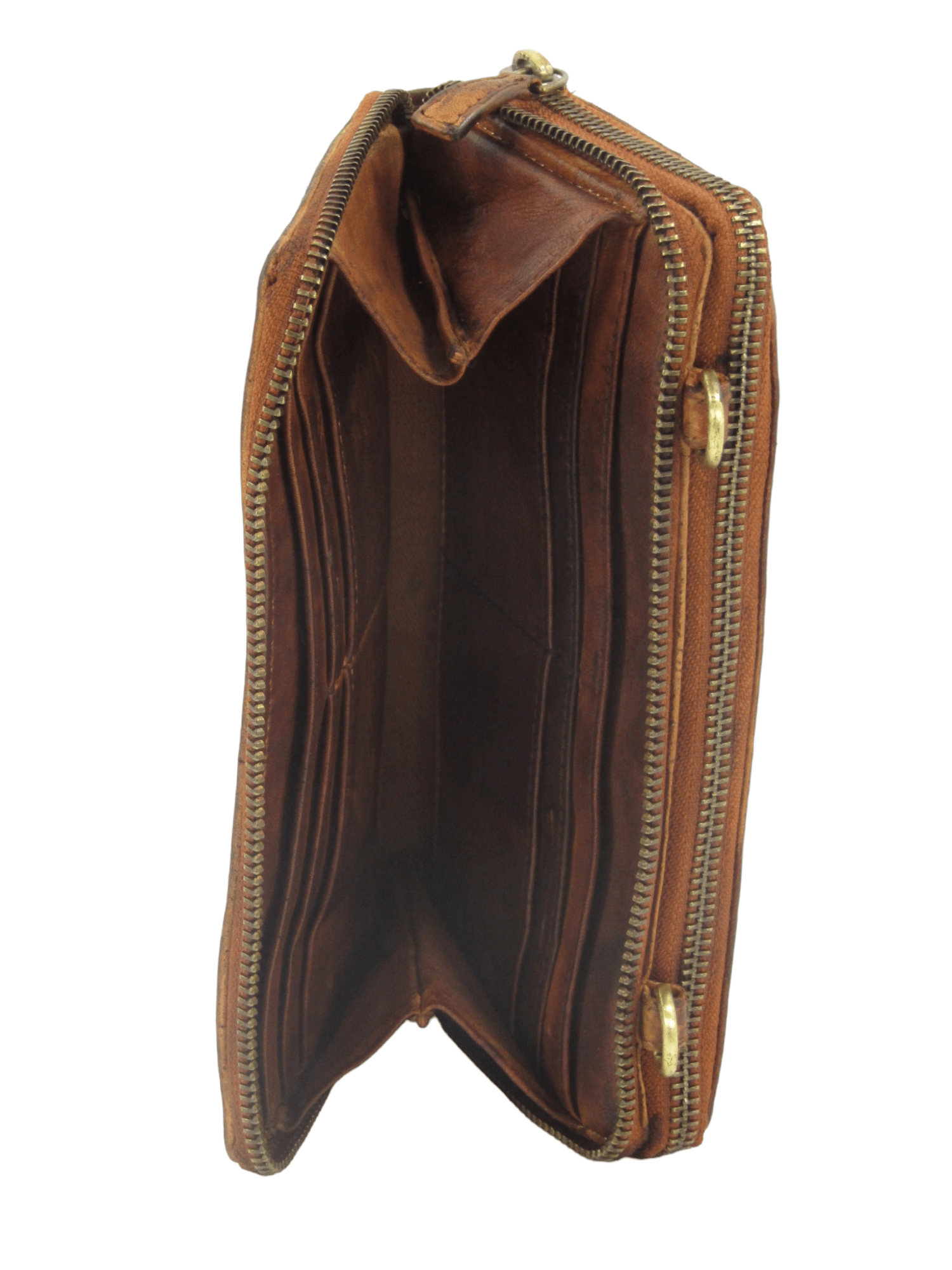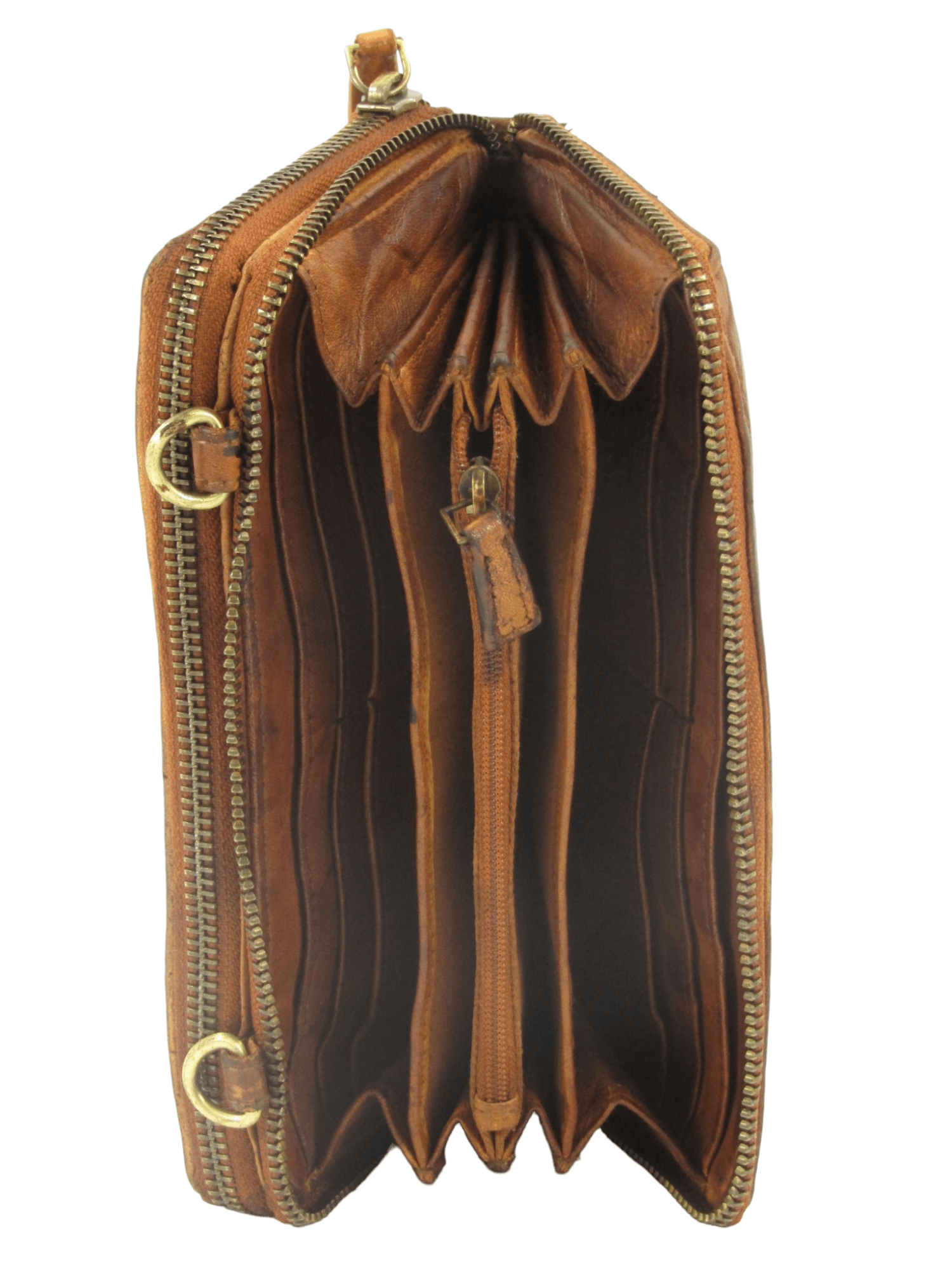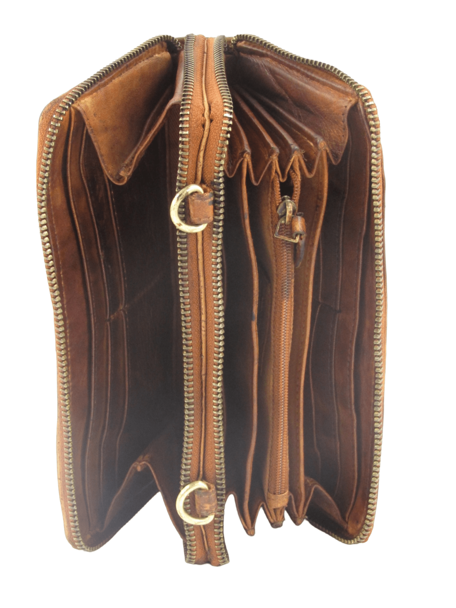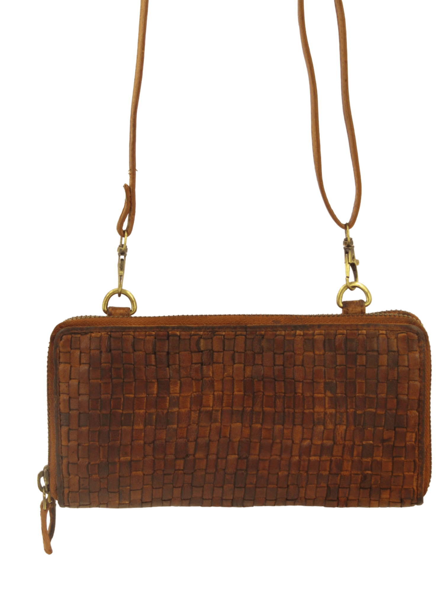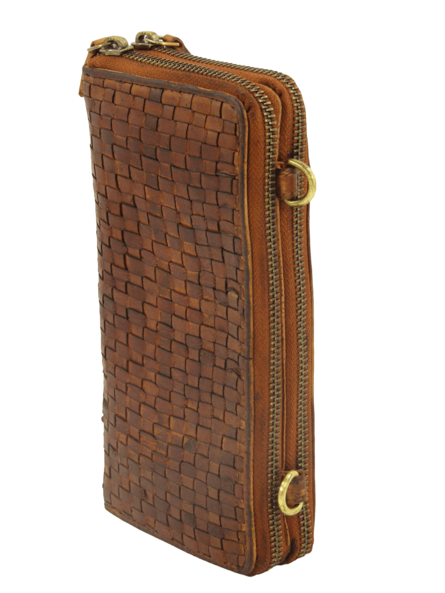Portafogli in pelle vintage con frontale intrecciato, due scomparti separati chiusi da zip, accessoriati con tasche porta documenti e porta tessere, in uno dei due scomparti troviamo una tasca centrale chiusa da zip, capiente e pratico, dotato anche di tracollina in pelle regolabile e rimovibile, costruito con pellami di alta qualità