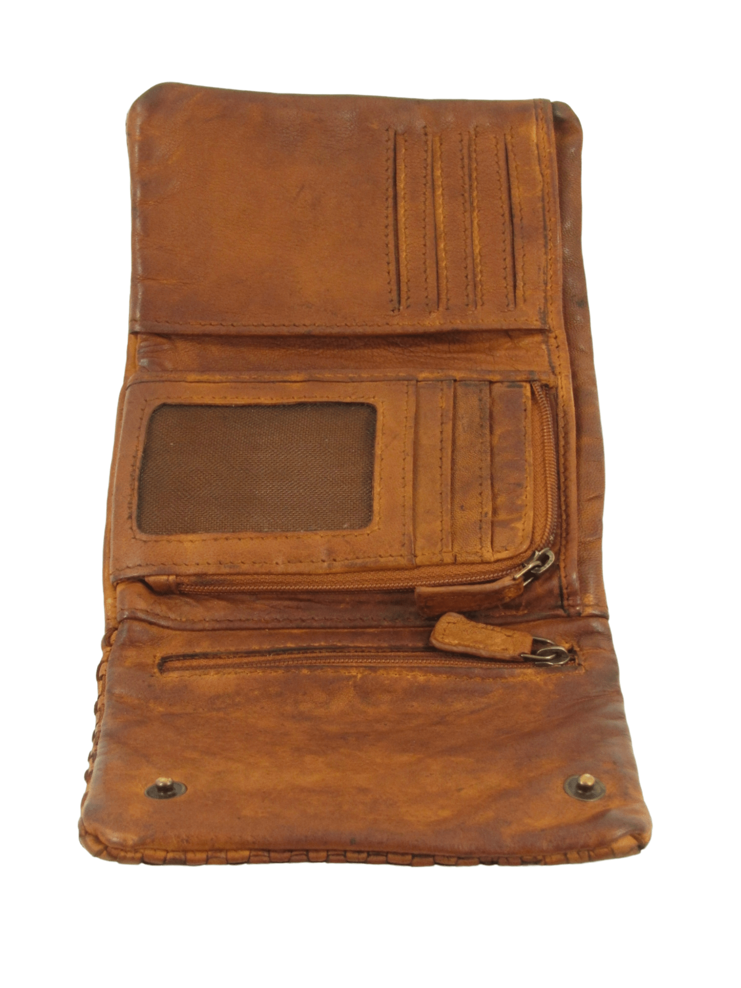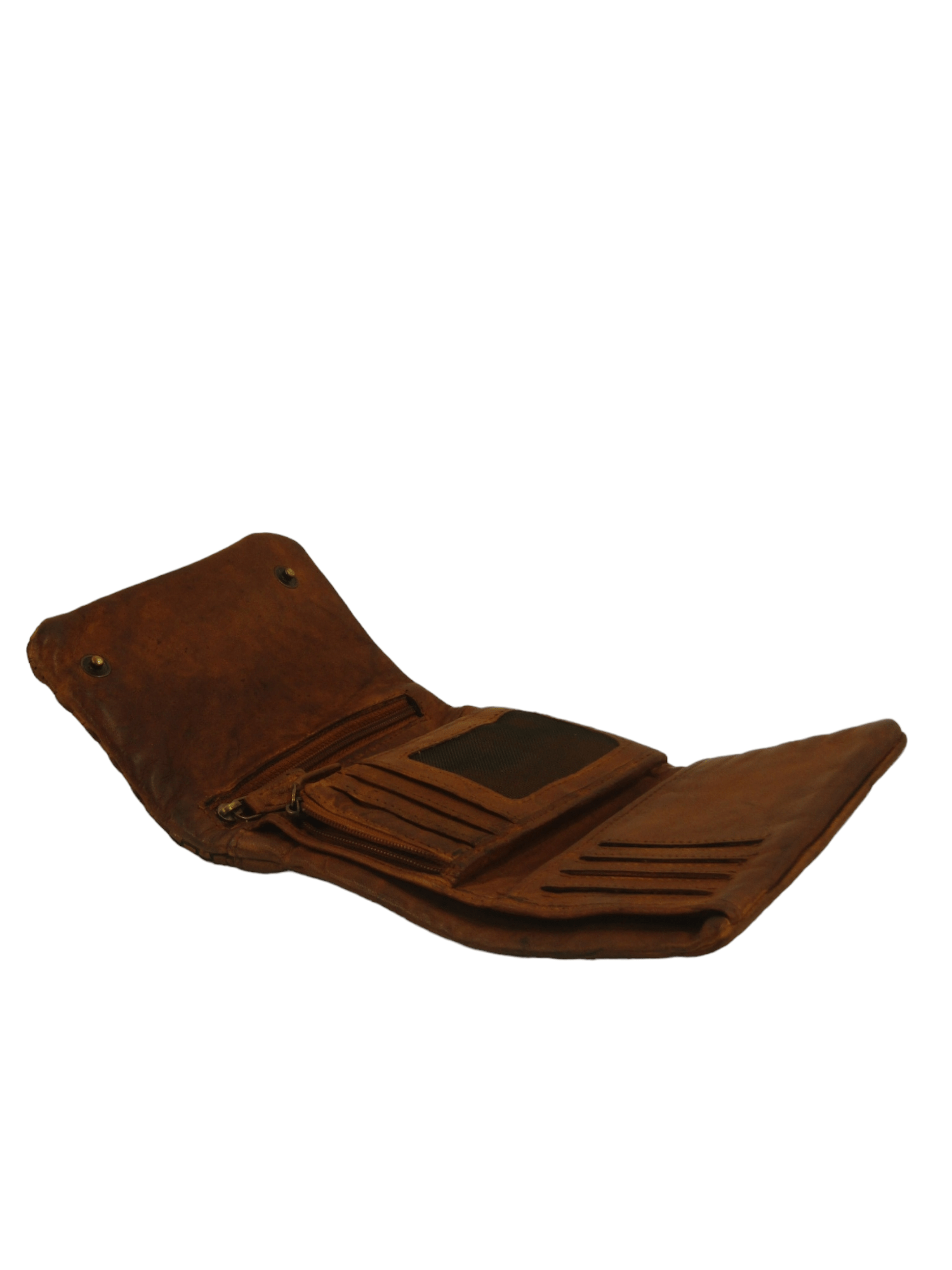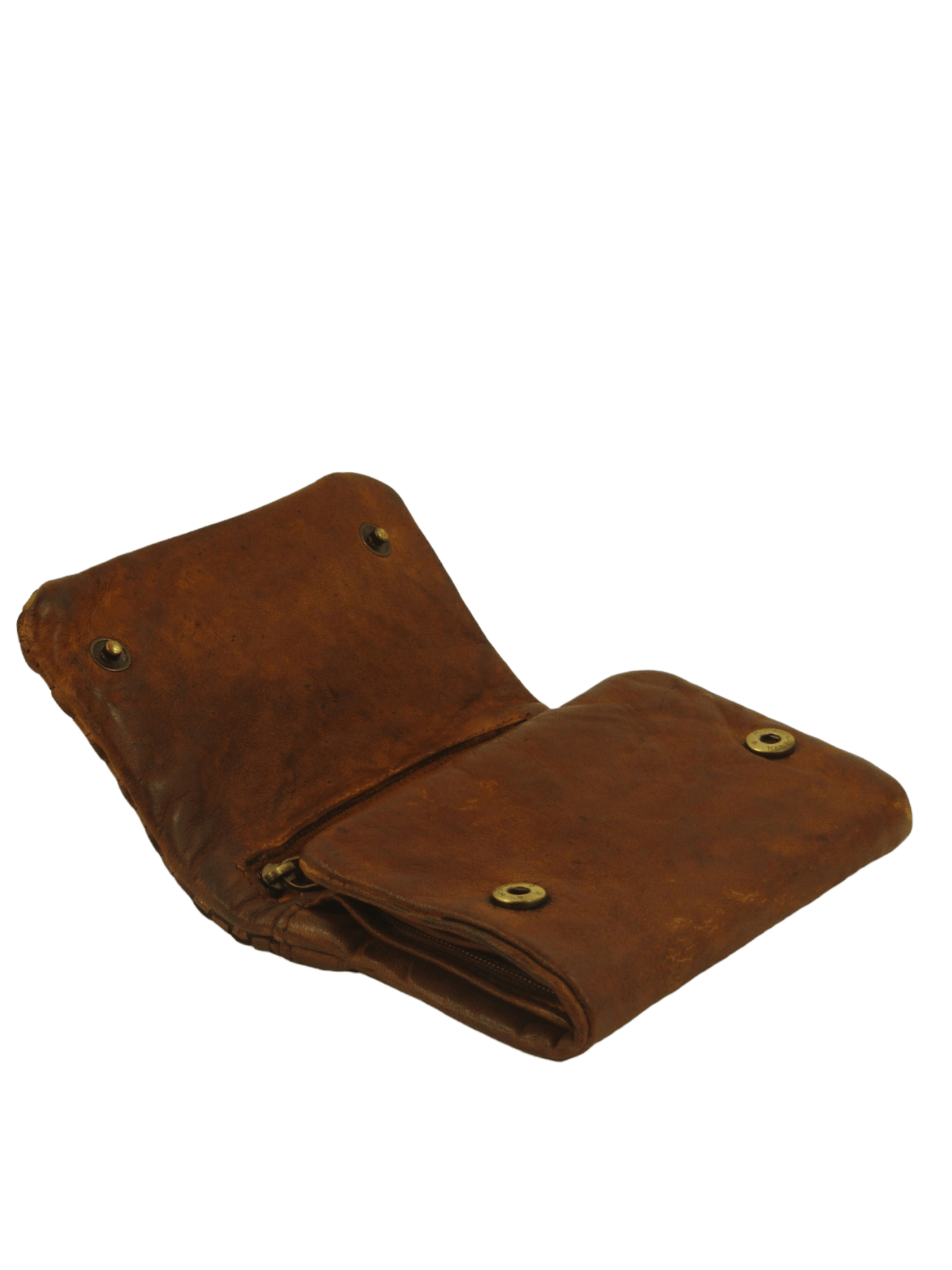 Portafogli in pelle tinto in capo effetto vintage, apertura a libretto fermato con bottoni ad incastro, interno accessoriato da tasca superiore per contanti e documenti e da altre tasche aperte e chiuse da zip, comodo e compatto, costruito con pellami di alta qualità
