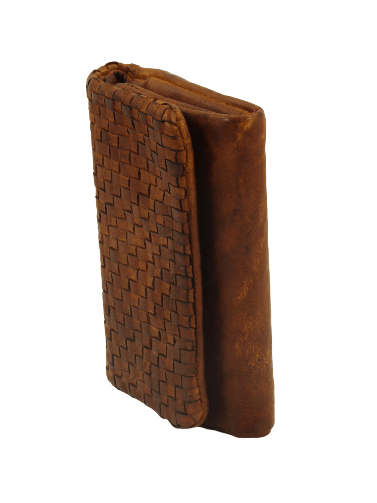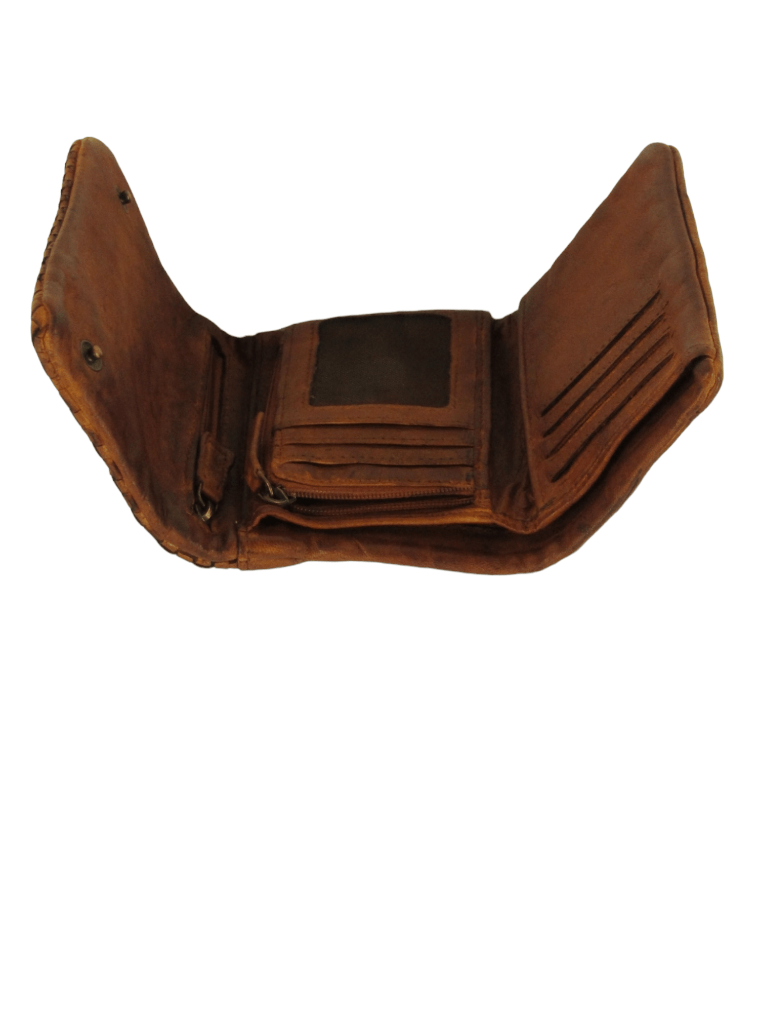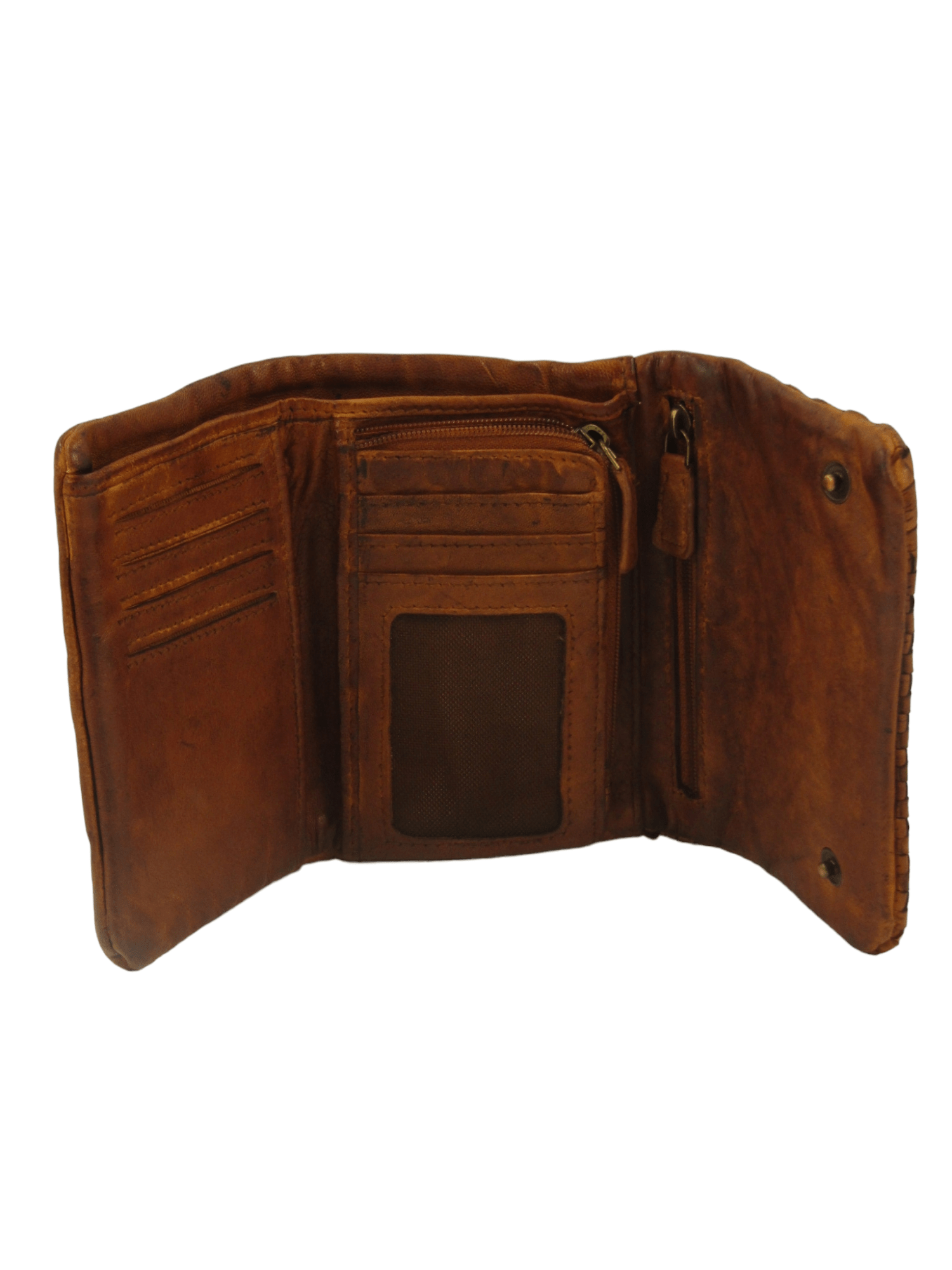 Portafogli in pelle tinto in capo effetto vintage, apertura a libretto fermato con bottoni ad incastro, interno accessoriato da tasca superiore per contanti e documenti e da altre tasche aperte e chiuse da zip, comodo e compatto, costruito con pellami di alta qualità