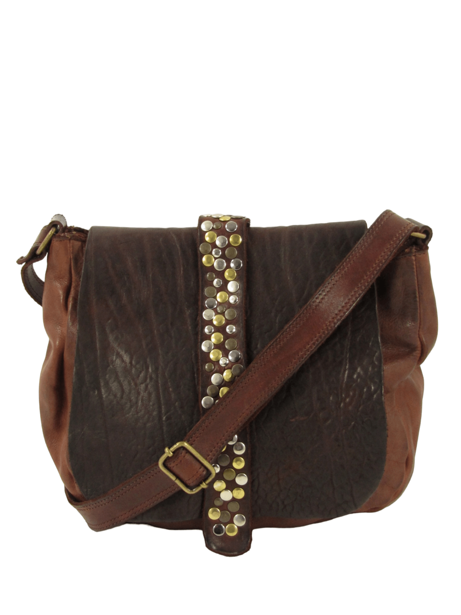 Postina in vacchetta tinta in capo, chiusura con zip, chiusura pattina con clip magnetica, decorata con nastro in cuoio borchiato, pattina in vacchetta spessa , interno rivestito ed accessoriato con tasca chiusa da zip e tasca di cortesia aperta, oggetto unico come tutti quelli della linea Country, realizzato interamente a mano con pellami di alta qualità