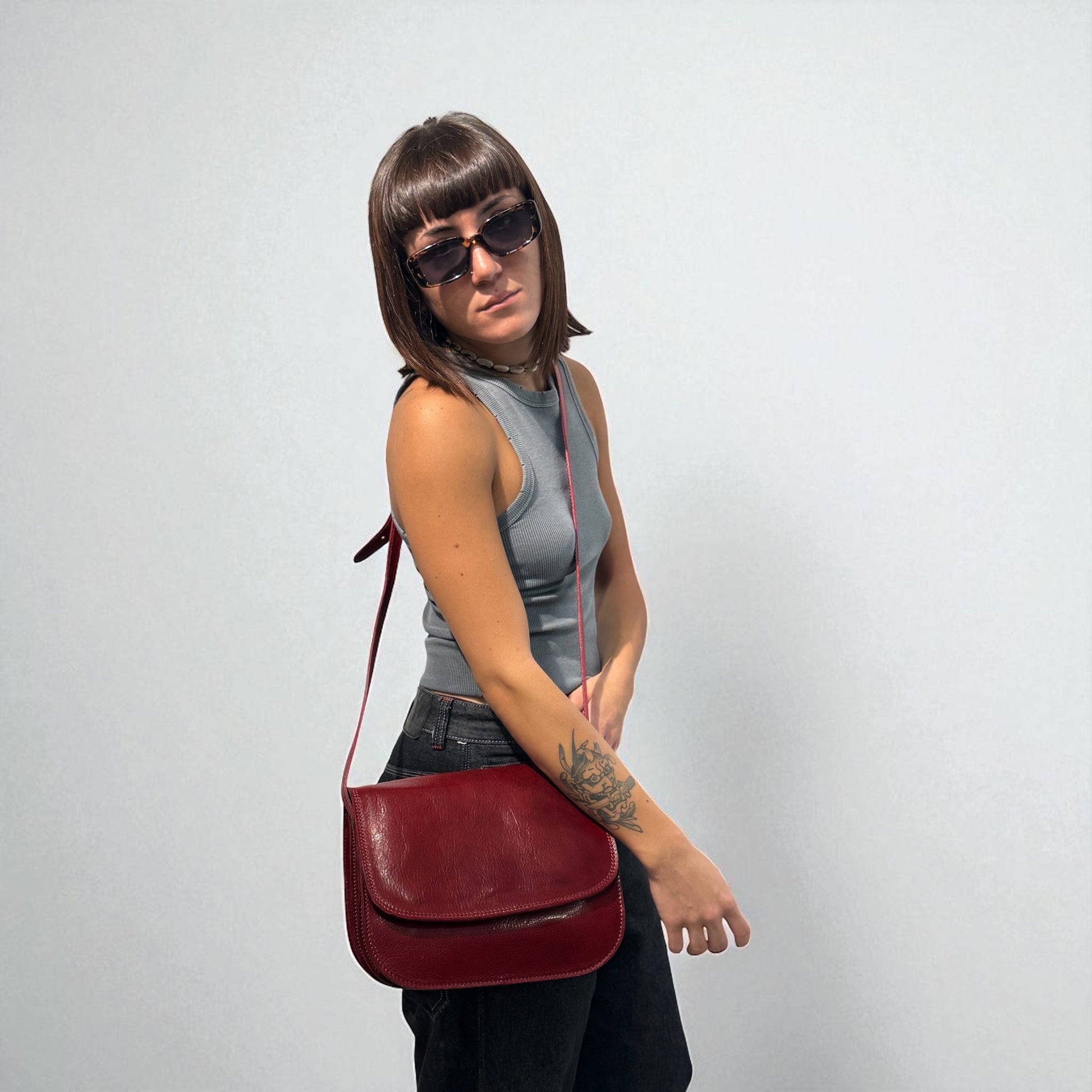Postina in cuoio primo fiore conciato al vegetale tamponato a mano. Chiusura con pattella e clip magnetica. Interno sfoderato diviso in tre scomparti, quello centrale chiuso da zip. Completa l’interno una tasca chiusa da zip. All’esterno sul retro tasca chiusa da zip. Tracolla in pelle regolabile. Borsa classica intramontabile, costruita con pellami di alta qualità, compatta ma capiente.