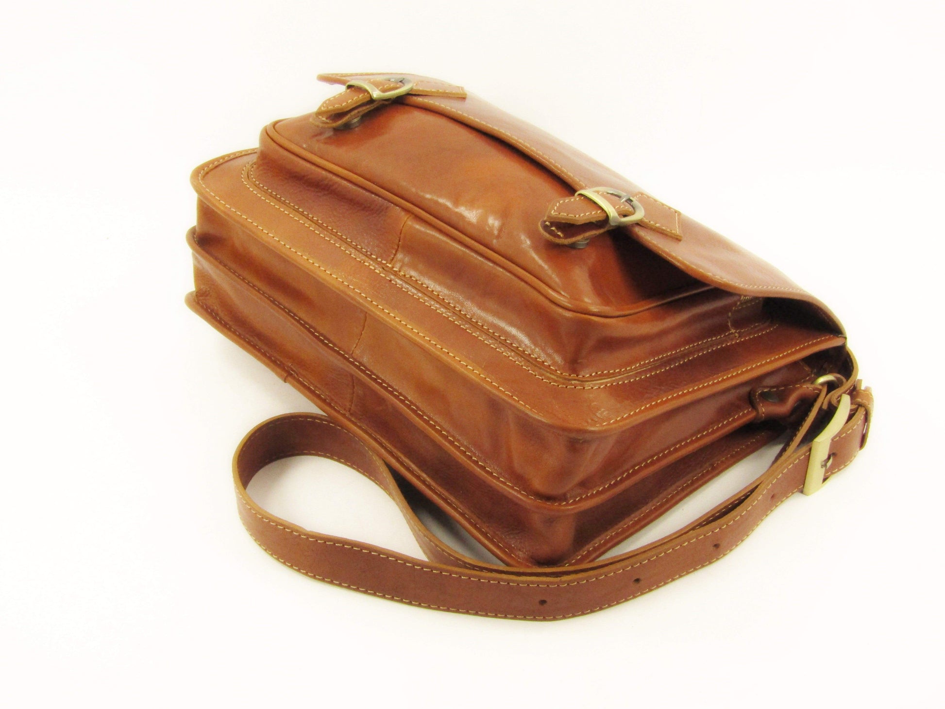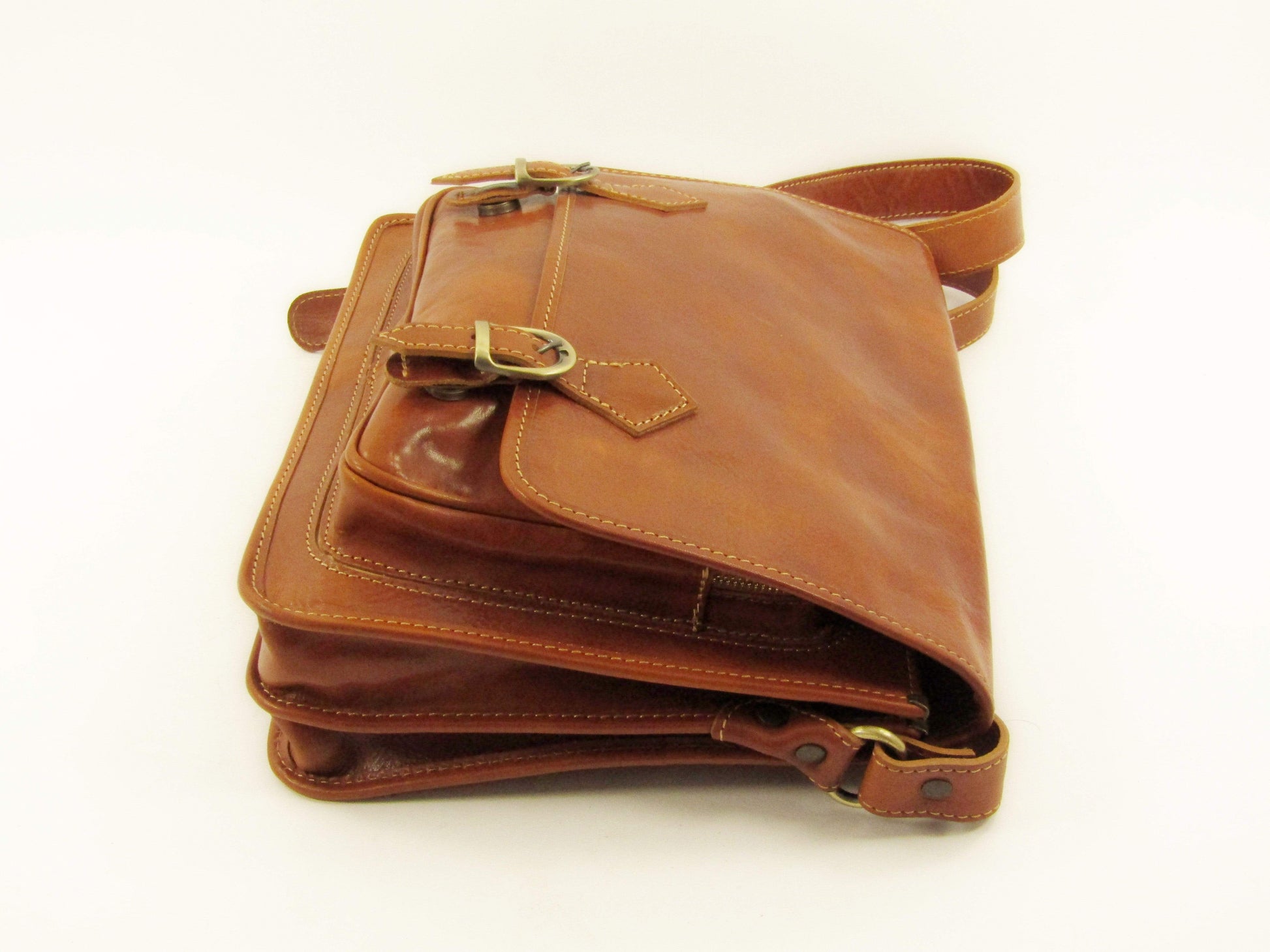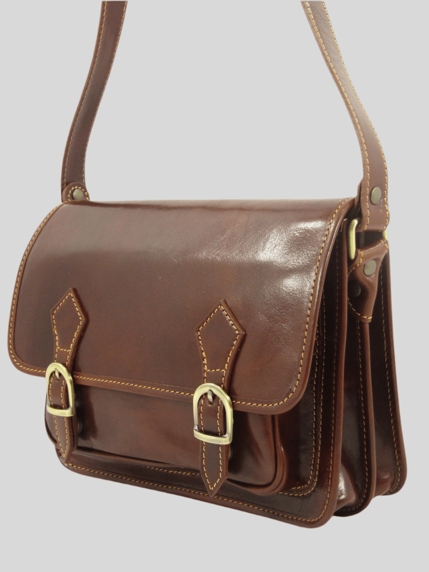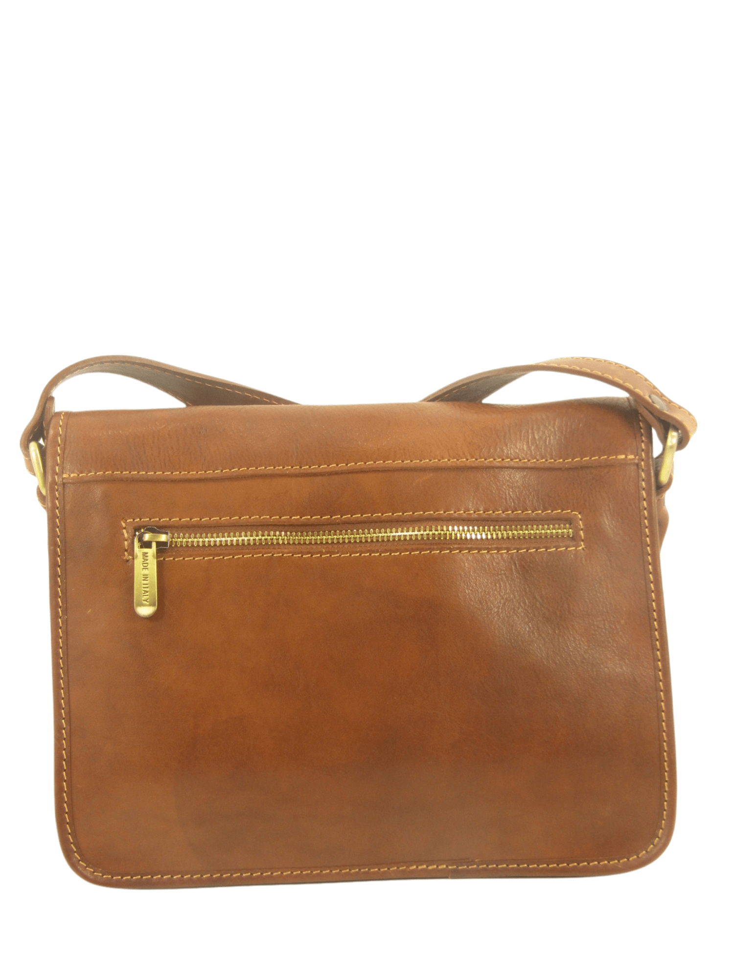 Borsa tipo postina classica in cuoio pieno fiore conciato al vegetale e tamponato a mano, chiusura con pattina e fibbiette con bottone magnetico, interno interamente in pelle diviso in due scomparti con tasca chiusa da zip e tasche porta accessori, sotto la pattina tasca chiusa da zip, tracolla larga in pelle regolabile, sul retro tasca chiusa da zip, borsa dal fascino intramontabile, molto robusta e fatta per migliorare con il tempo