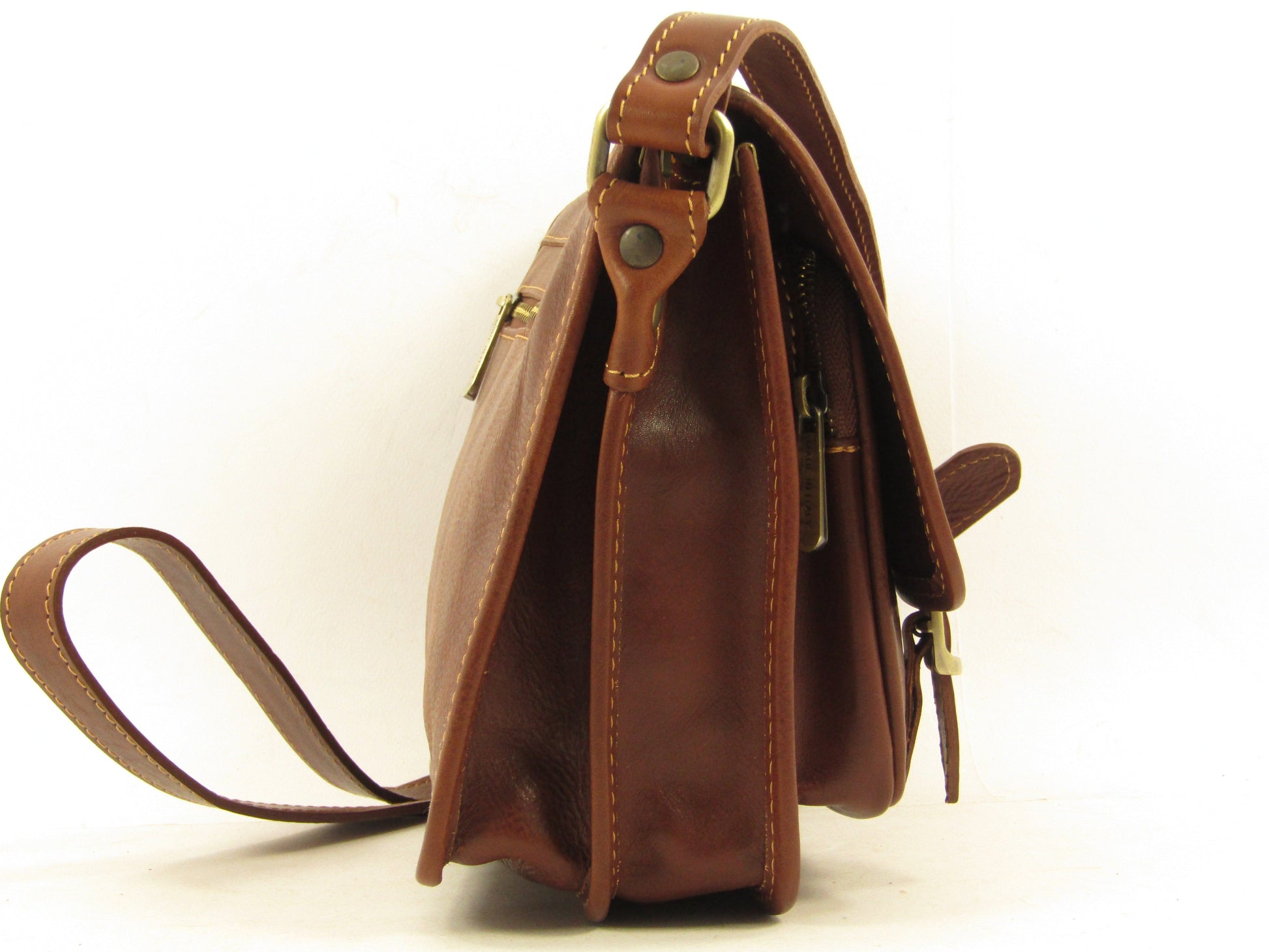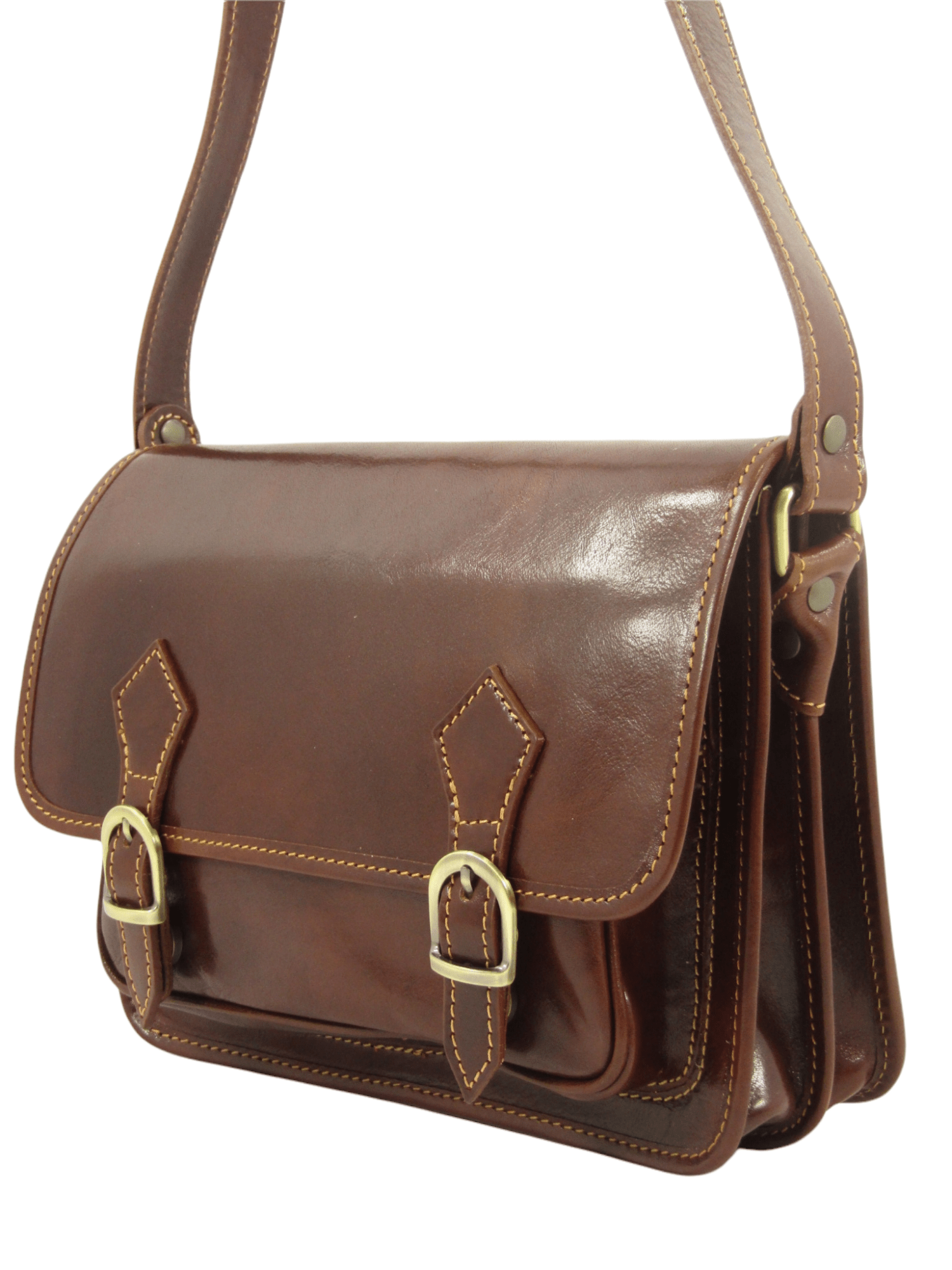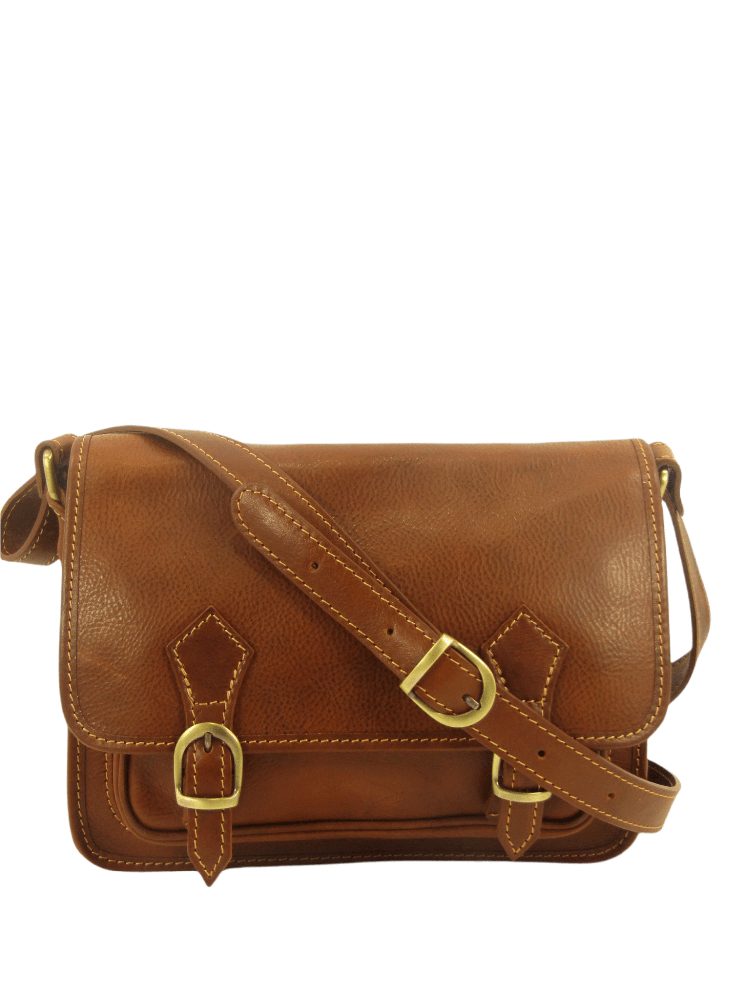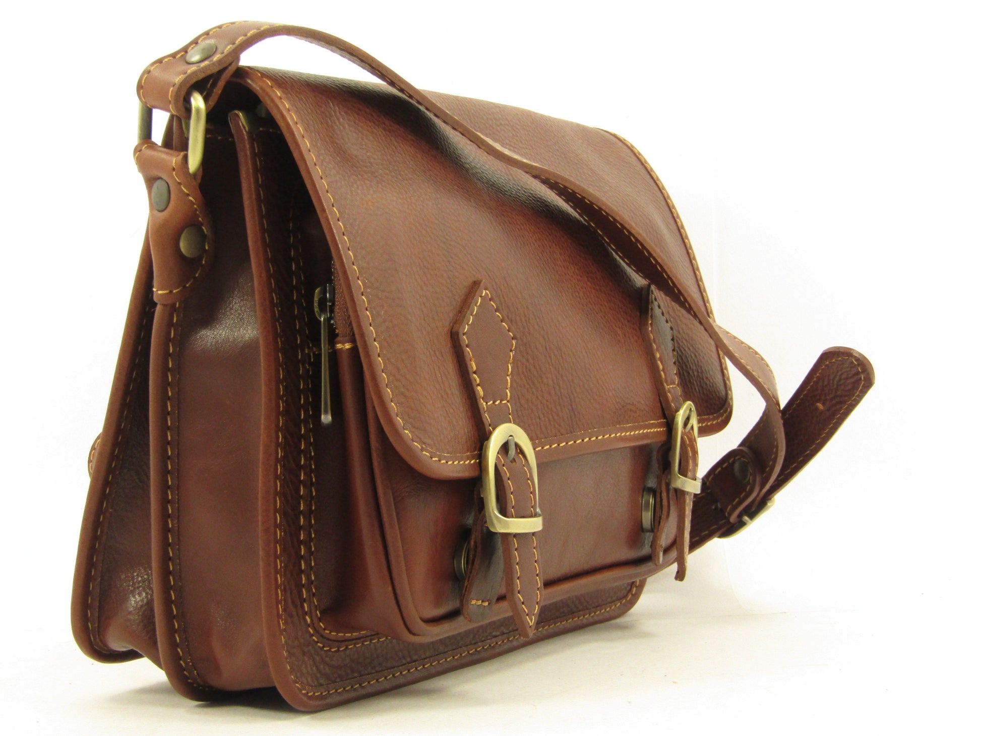 Borsa tipo postina classica in cuoio pieno fiore conciato al vegetale e tamponato a mano, chiusura con pattina e fibbiette con bottone magnetico, interno interamente in pelle diviso in due scomparti con tasca chiusa da zip e tasche porta accessori, sotto la pattina tasca chiusa da zip, tracolla larga in pelle regolabile, sul retro tasca chiusa da zip, borsa dal fascino intramontabile, molto robusta e fatta per migliorare con il tempo