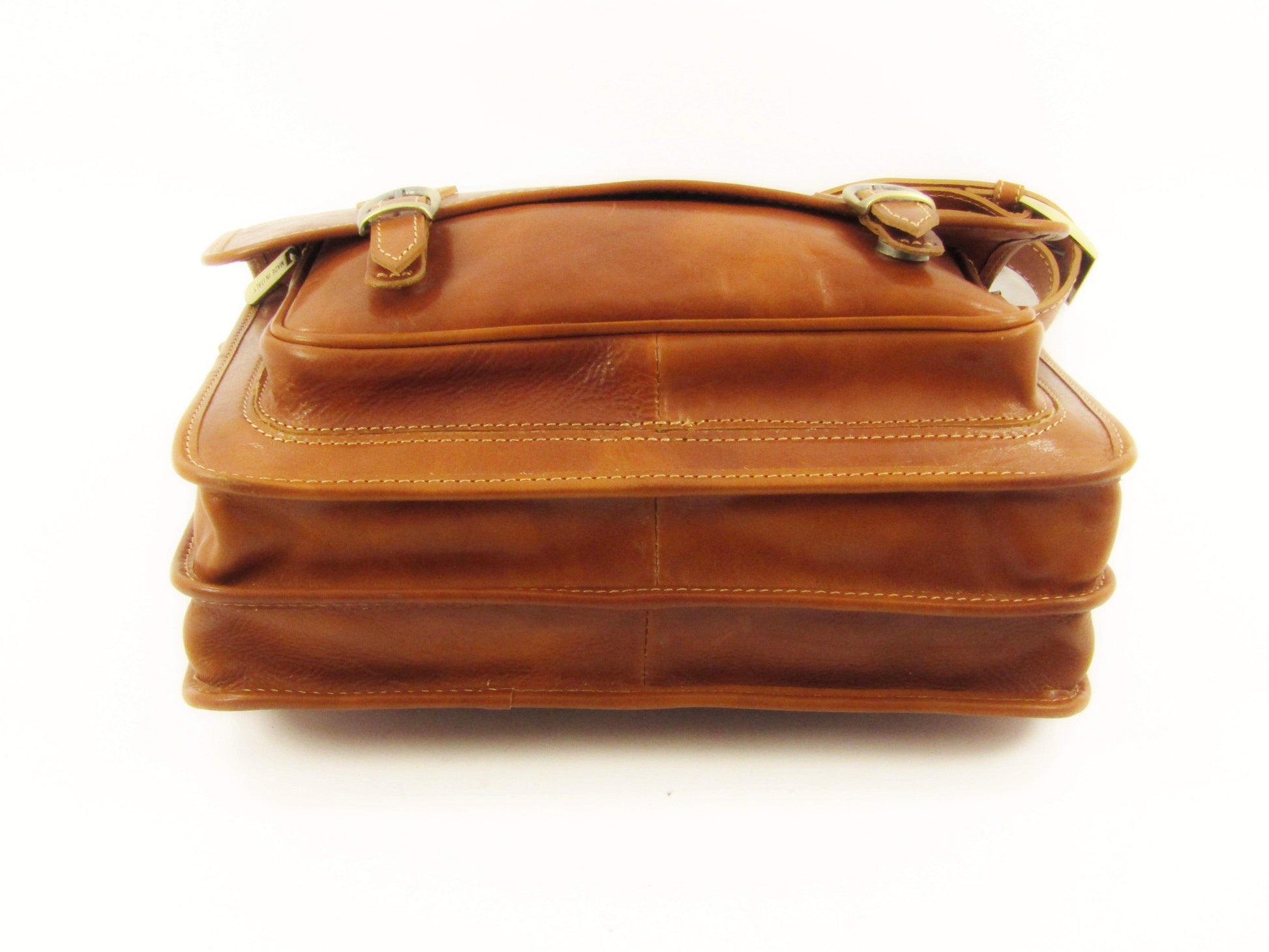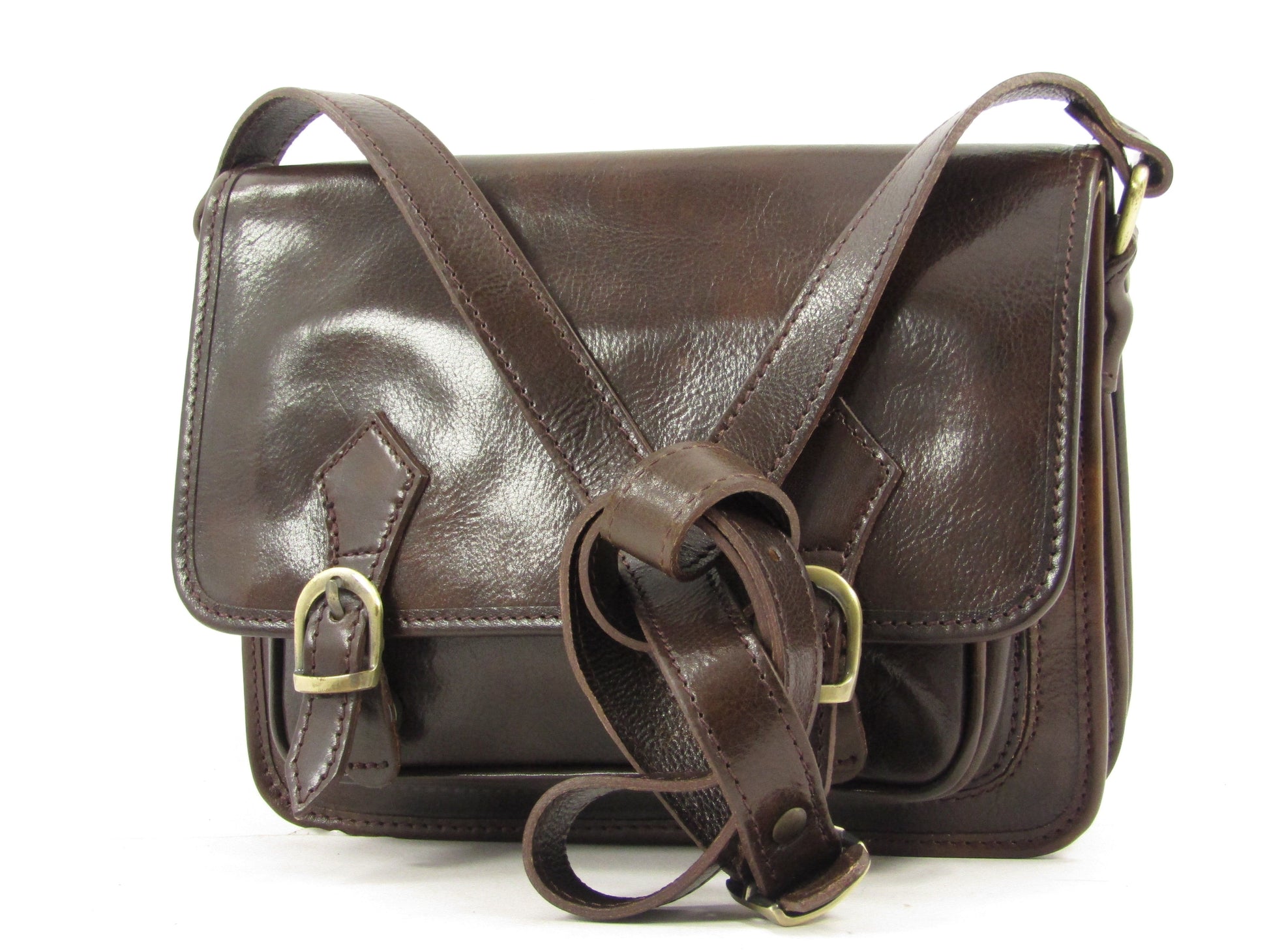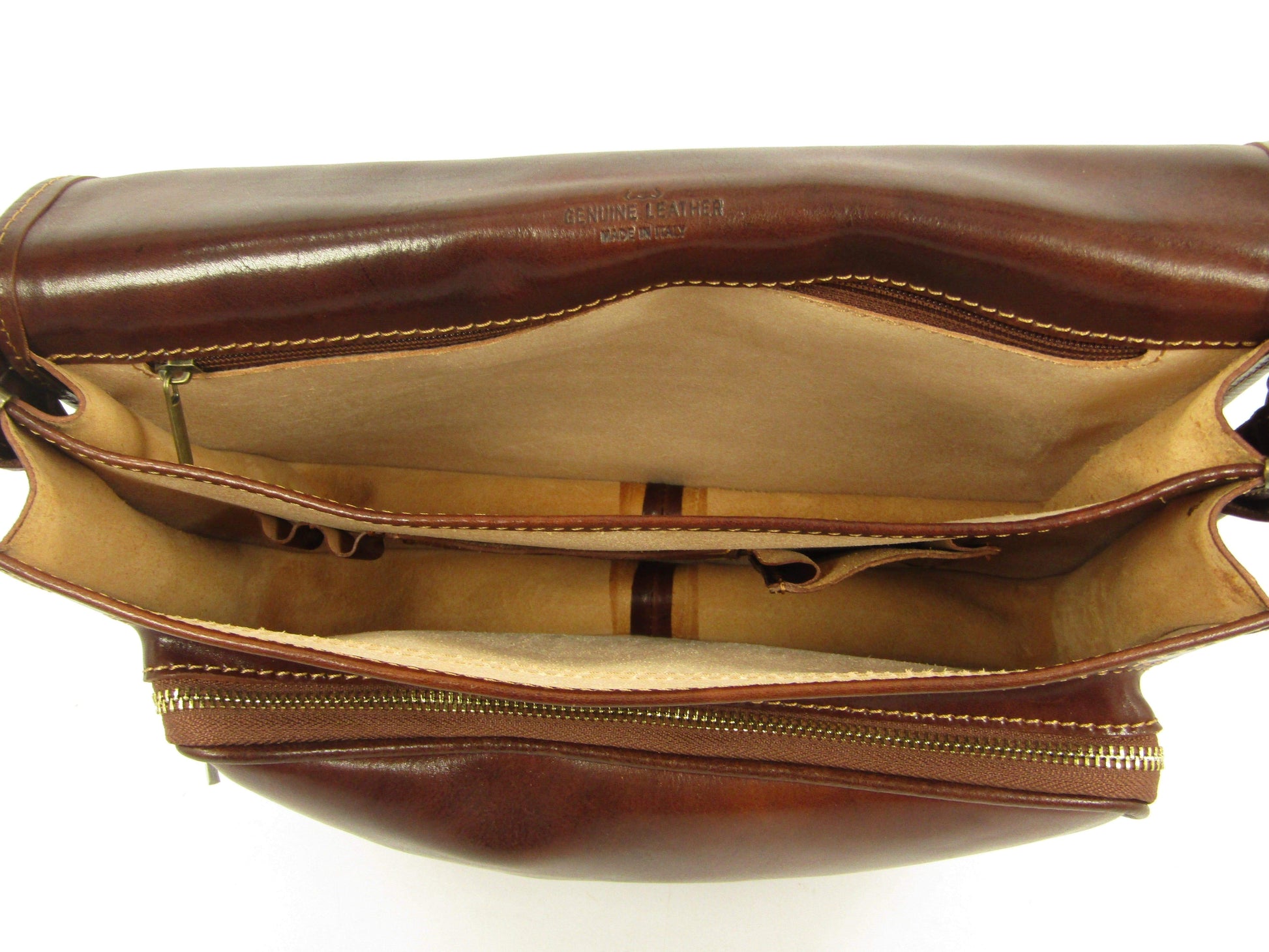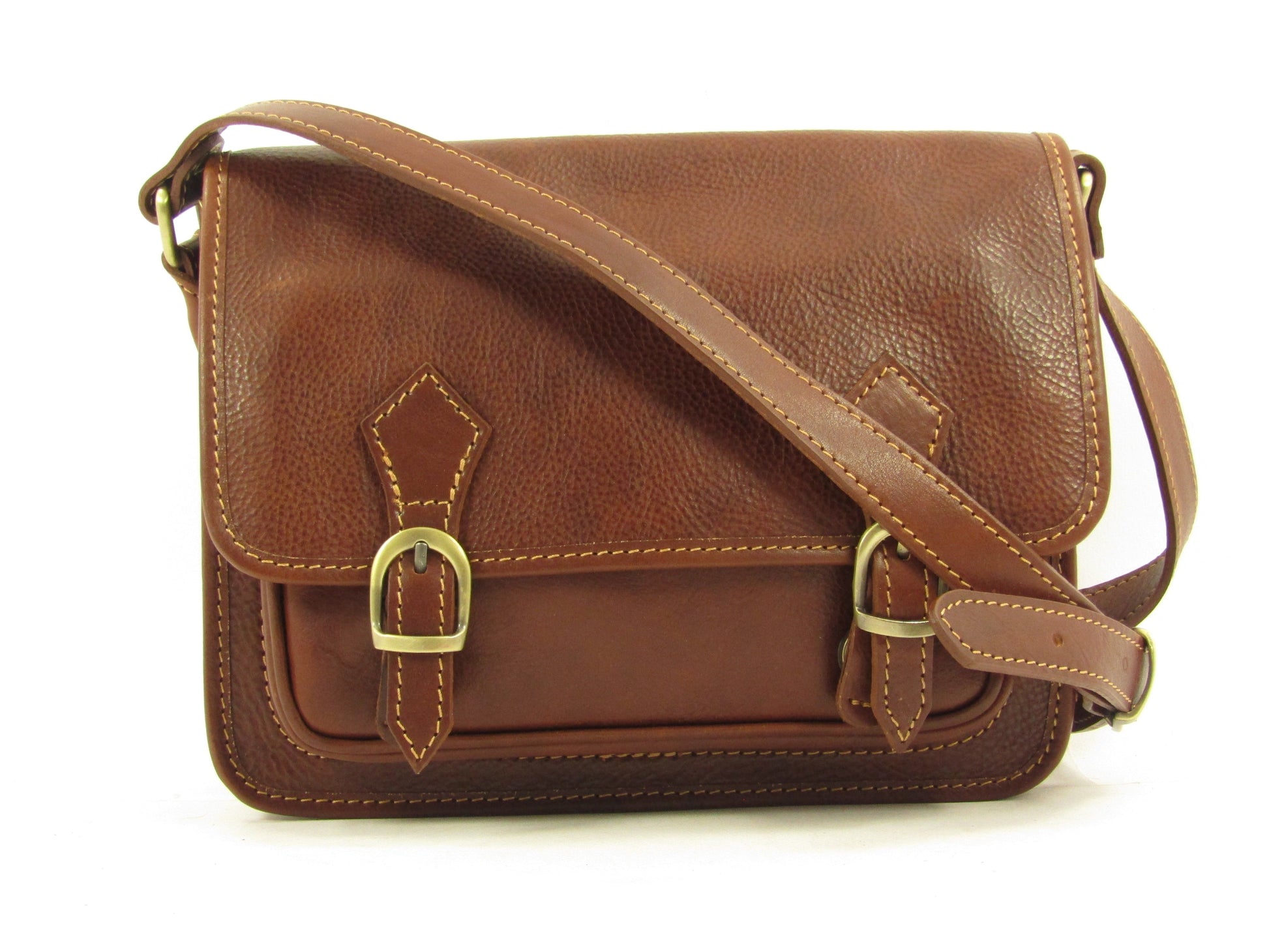 Borsa tipo postina classica in cuoio pieno fiore conciato al vegetale e tamponato a mano, chiusura con pattina e fibbiette con bottone magnetico, interno interamente in pelle diviso in due scomparti con tasca chiusa da zip e tasche porta accessori, sotto la pattina tasca chiusa da zip, tracolla larga in pelle regolabile, sul retro tasca chiusa da zip, borsa dal fascino intramontabile, molto robusta e fatta per migliorare con il tempo
