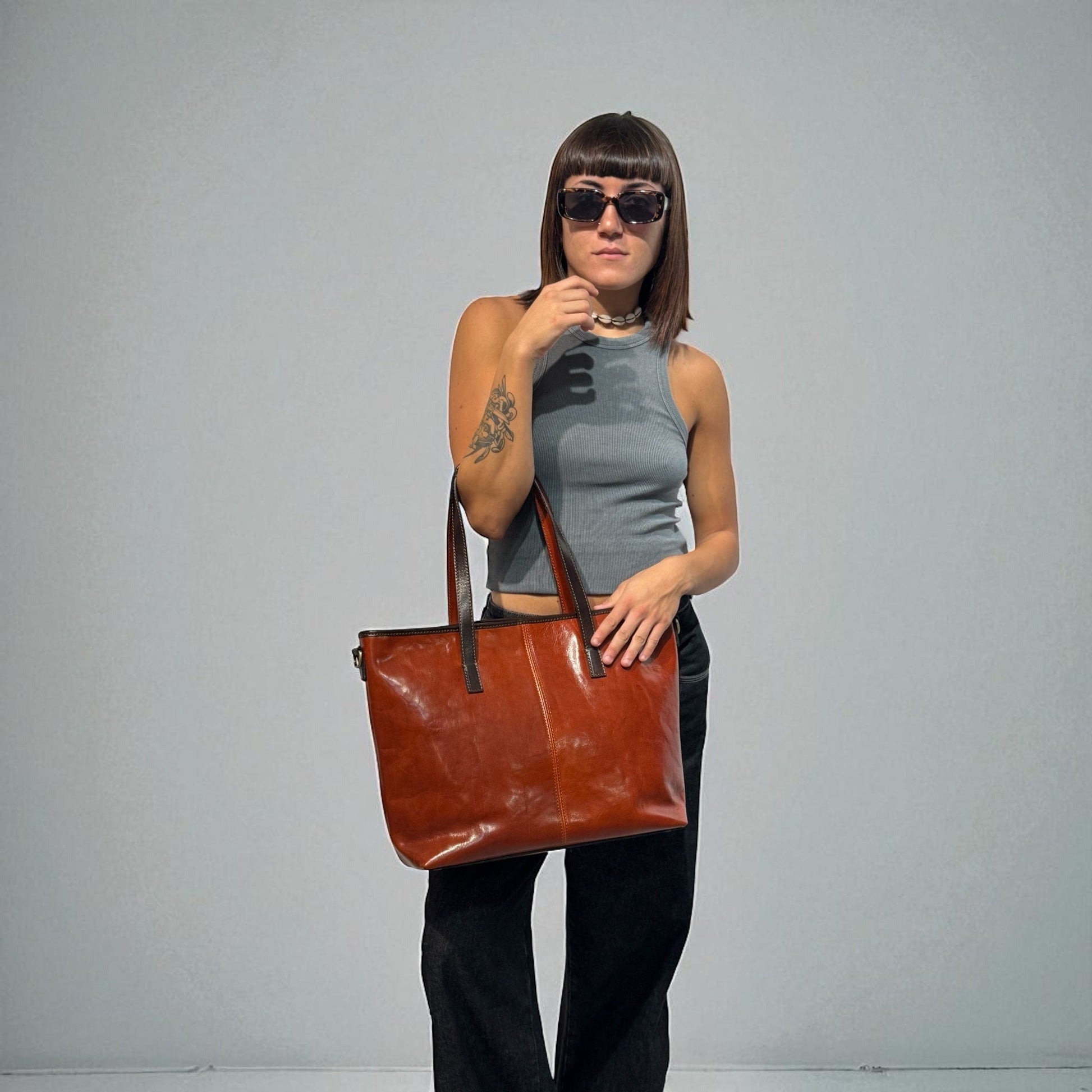 La shopper Lara in cuoio tamponato a mano unisce artigianalità italiana e stile senza tempo. Perfetta per il lavoro e il tempo libero, questa borsa resistente e raffinata valorizza ogni tuo outfit con eleganza e praticità. Scegli la qualità fatta a mano per accompagnarti con classe in ogni occasione.