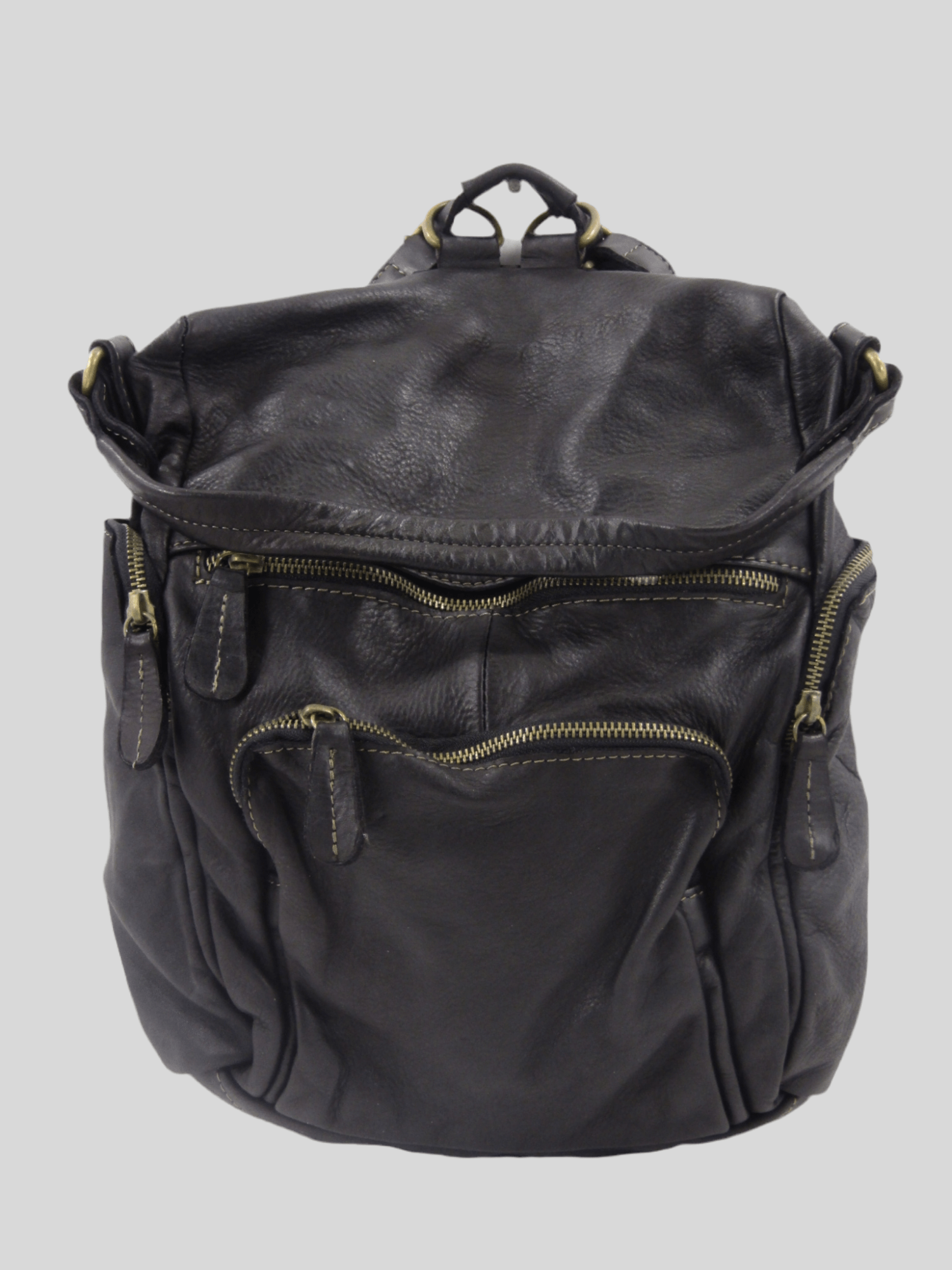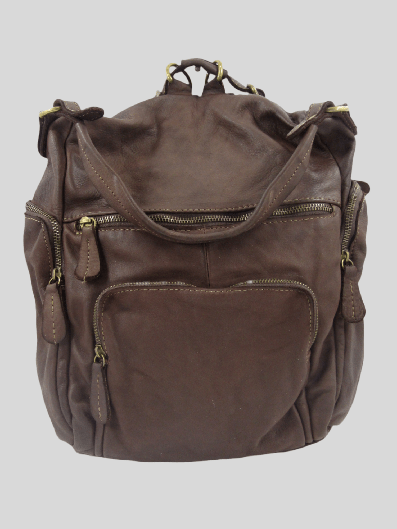 Zainetto in pelle morbida tinto in capo, con funzione di borsa a spallo o tracolla, multi tasche, il vano principale, accessoriato con tasca chiusa da zip è posto sul posteriore per garantire maggiore sicurezza, le altre tasche permettono di organizzare al meglio gli spazi, gli interni sono rivestiti, costruito in maniera artigianale con pellami di alta qualità