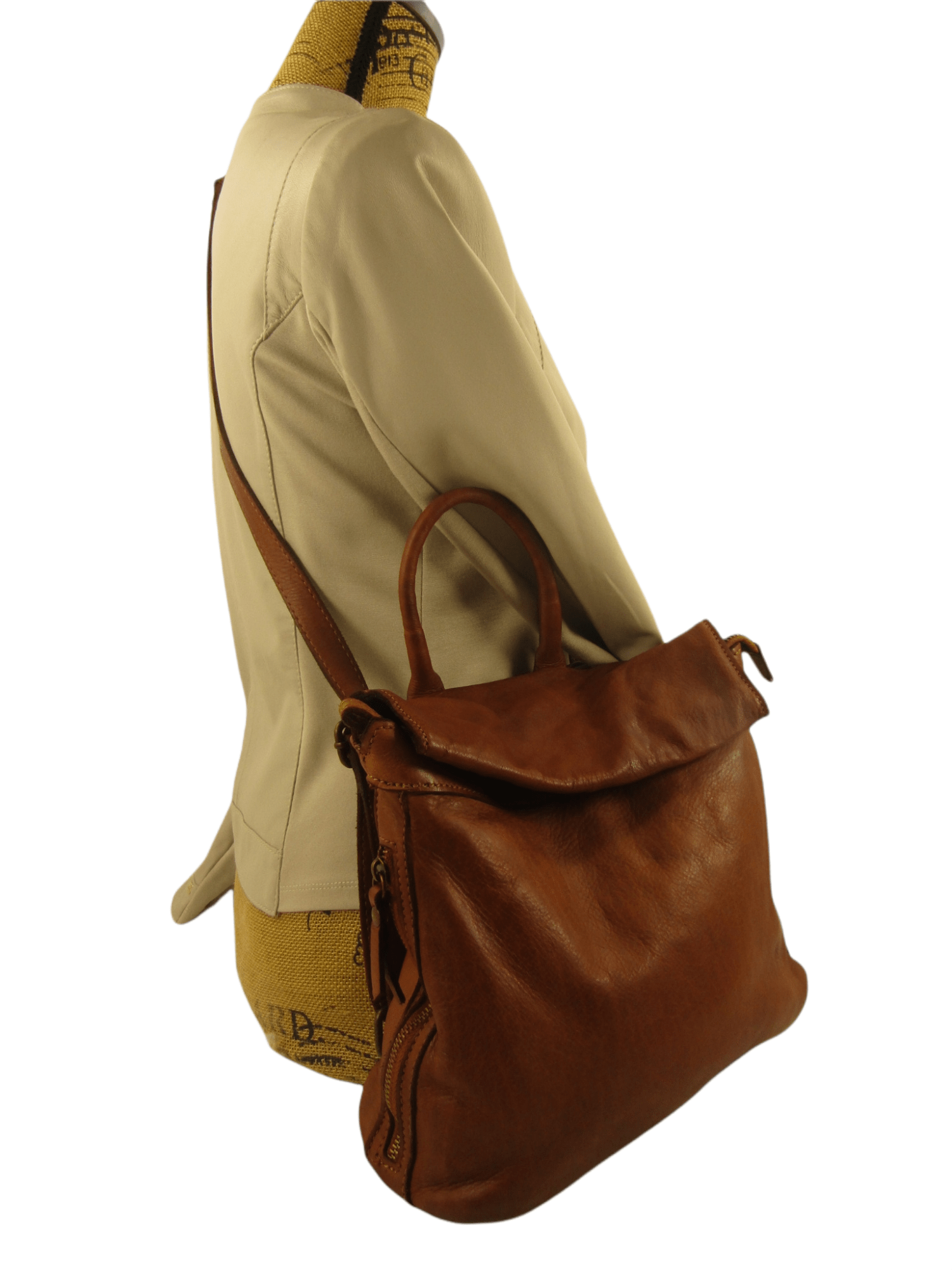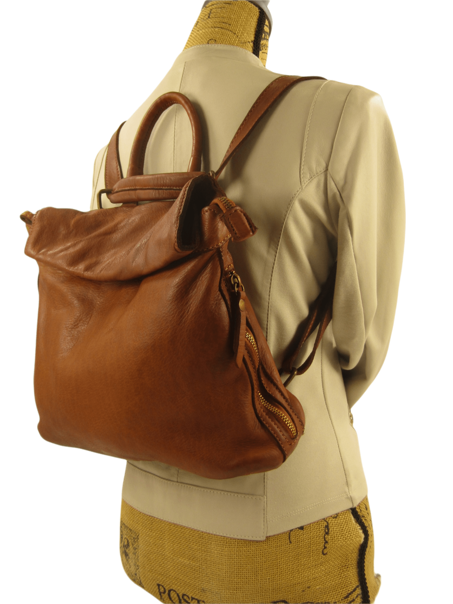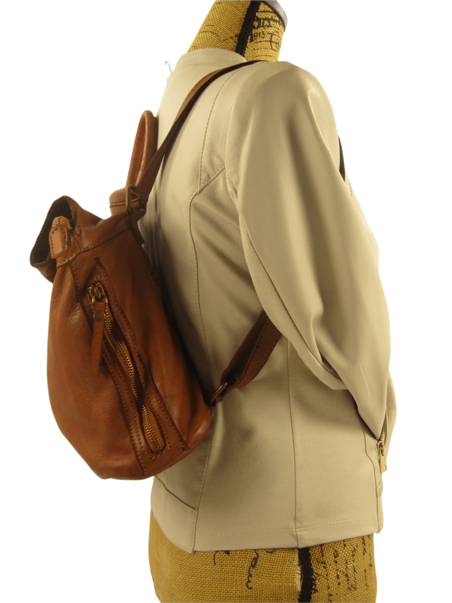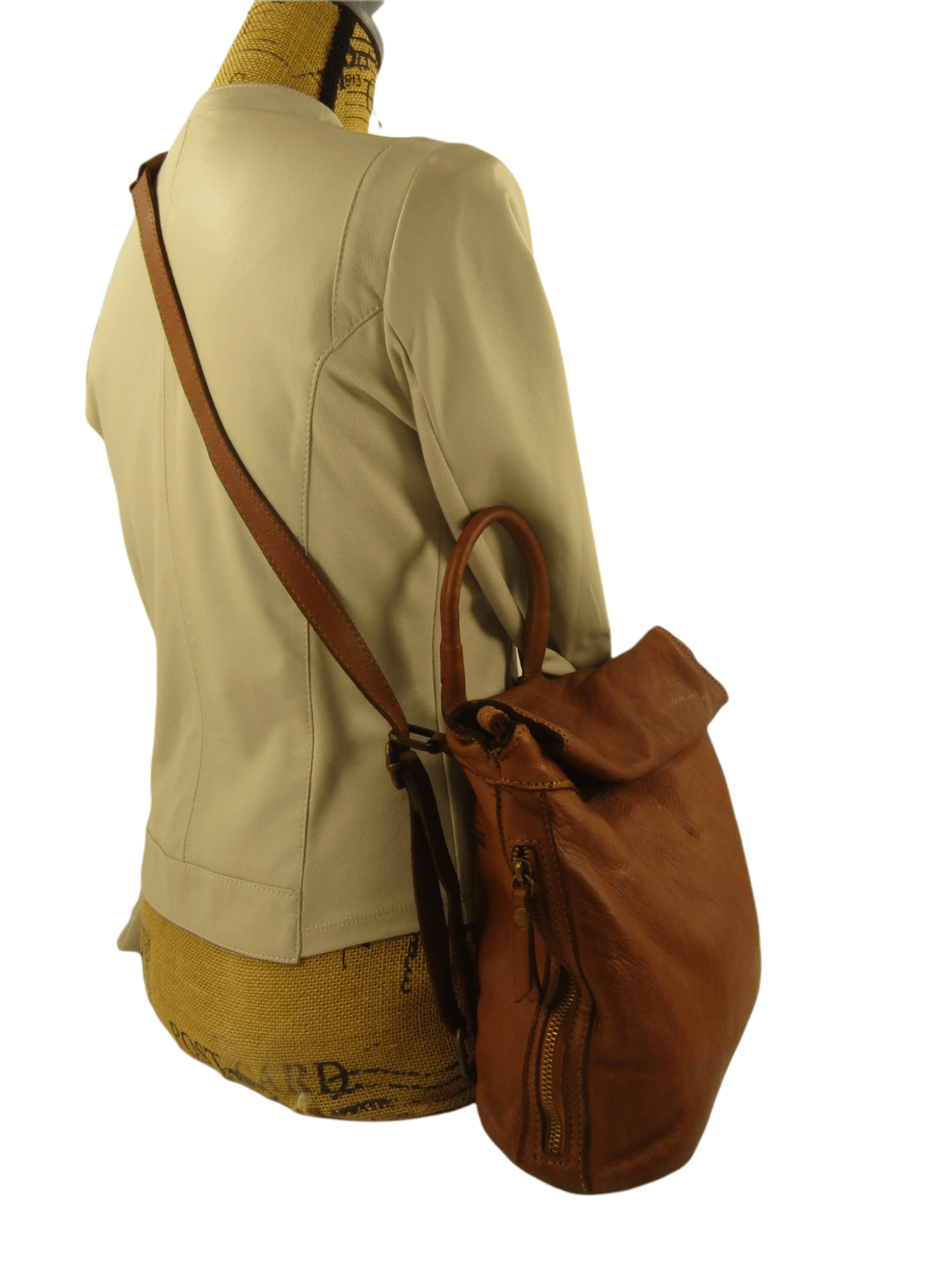 Zainetto reversibile in tracolla costruito in pelle morbida tinta in capo, zaino piccolo e ben organizzato, la trasformazione in tracolla è estremamente facile e veloce, zaino costruito in maniera artigianale con pellami di alta qualità