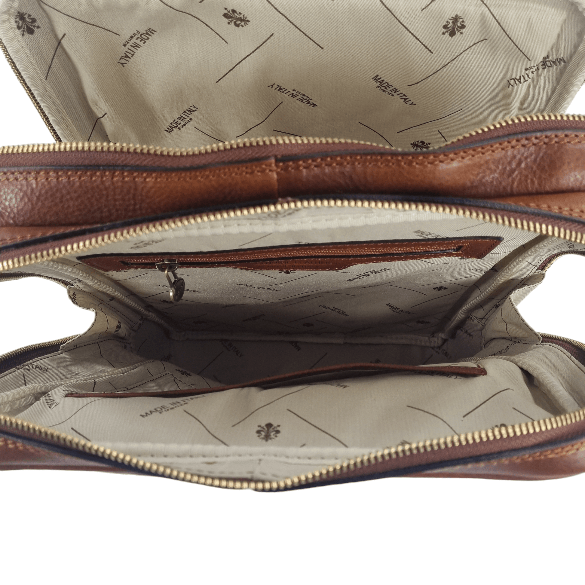 Zaino in cuoio primo fiore, due scomparti separati chiusi con zip a doppio cursore, design moderno ed egonomico, interni imbottiti per proteggere dispositivi, perfetto per il lavoro o il viaggio, dotato di aggancio per il trolley, costruito in Toscana con pellami di alta qualità