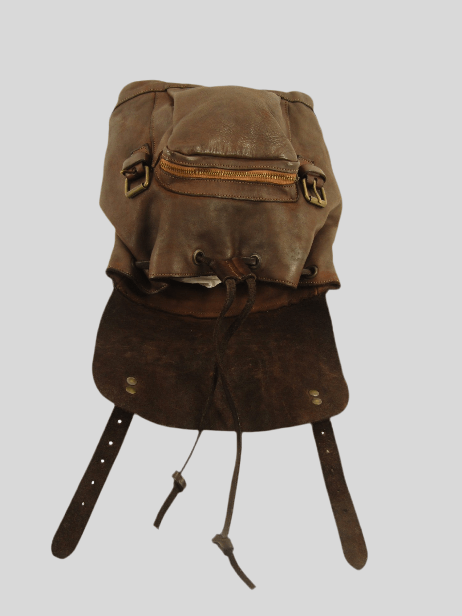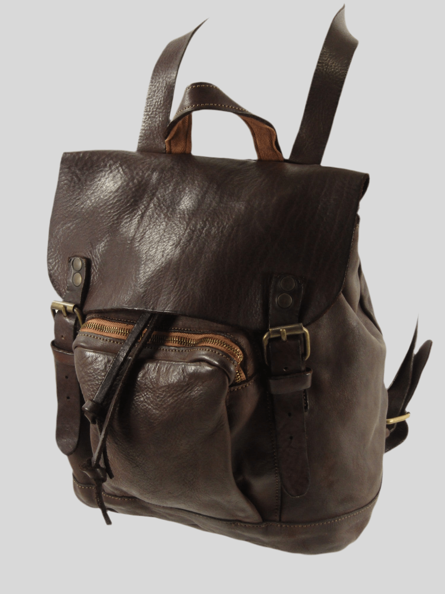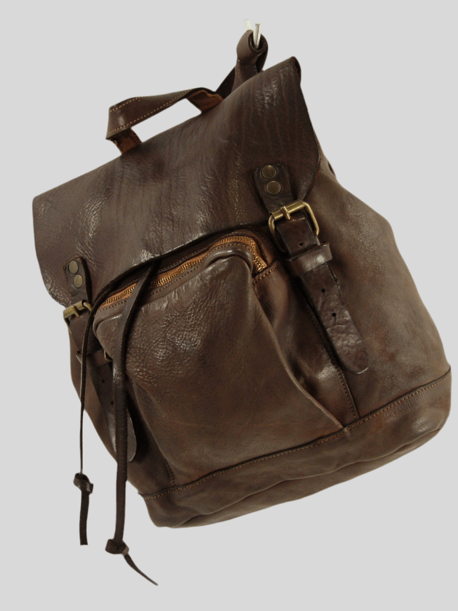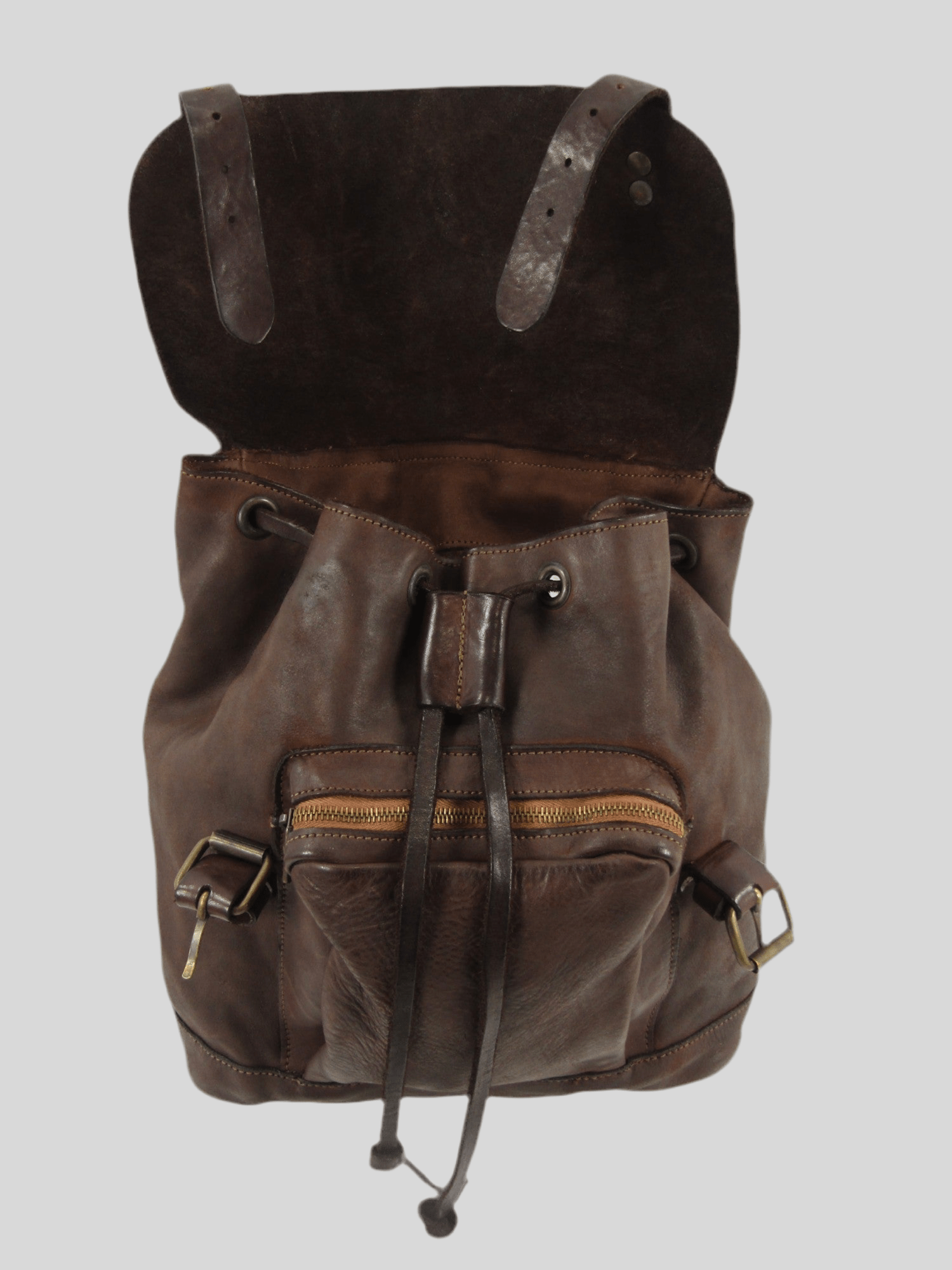 Zaino in vacchetta tinto in capo, chiusura con laccio di cuoio, chiusura pattina con fibbiette, interno rivestito ed accessoriato da tasca chiusa da zip e tasche porta accessori aperte, bellissimo zainetto con effetto vintage, dal carattere deciso, costruito con pellami di pregio da veri maestri dell'arte pellettiera