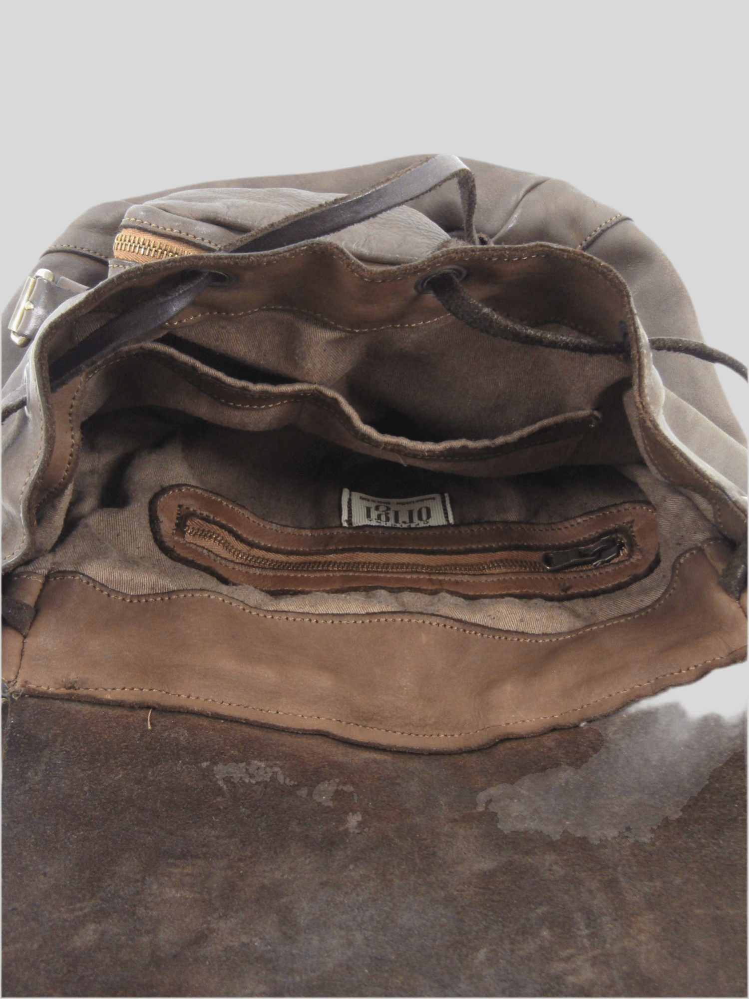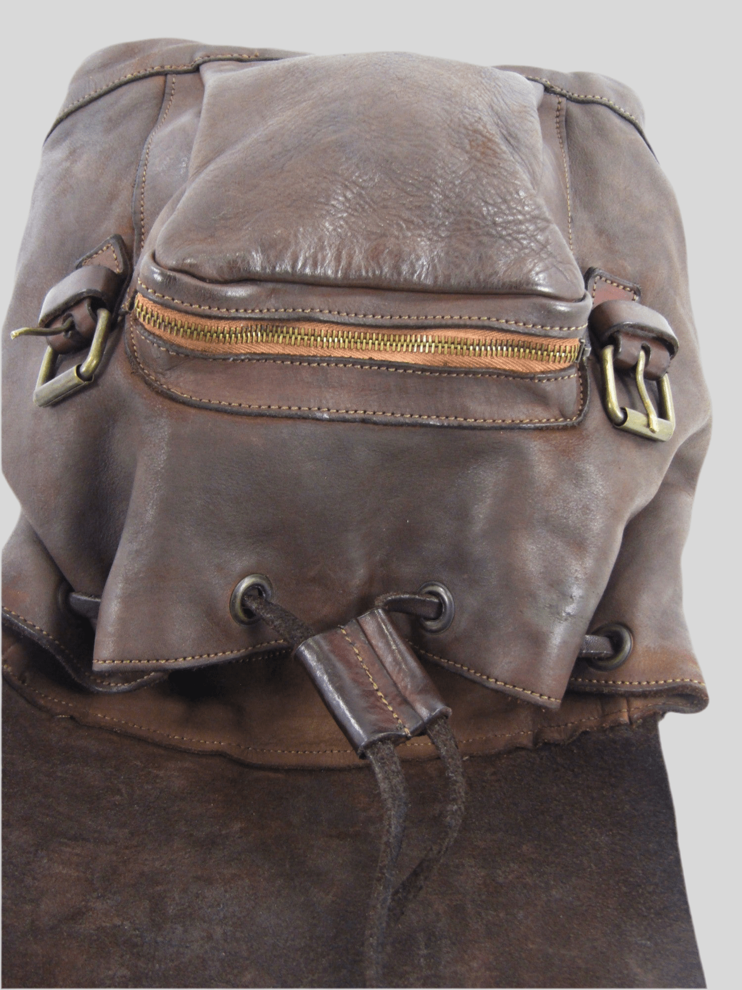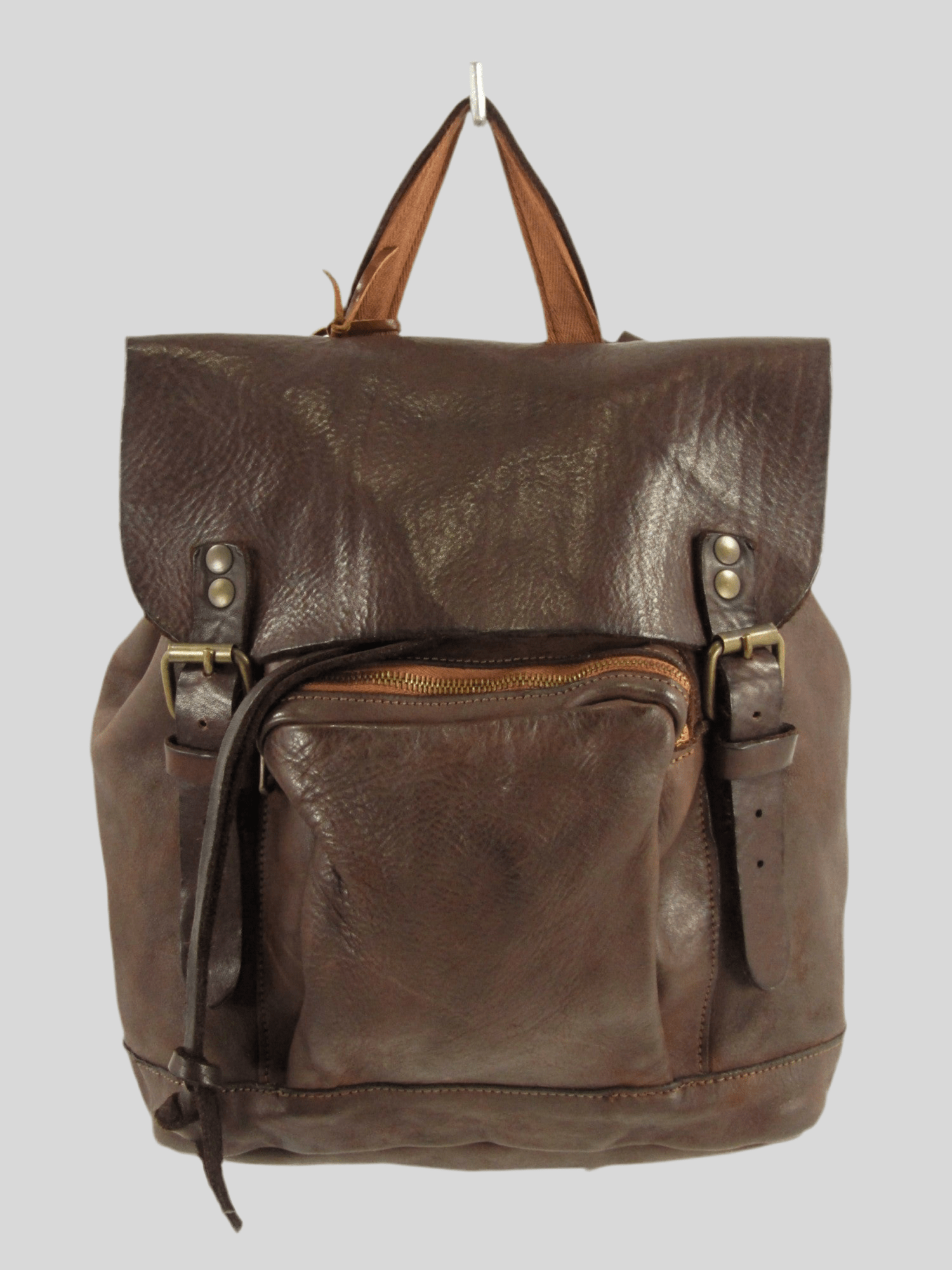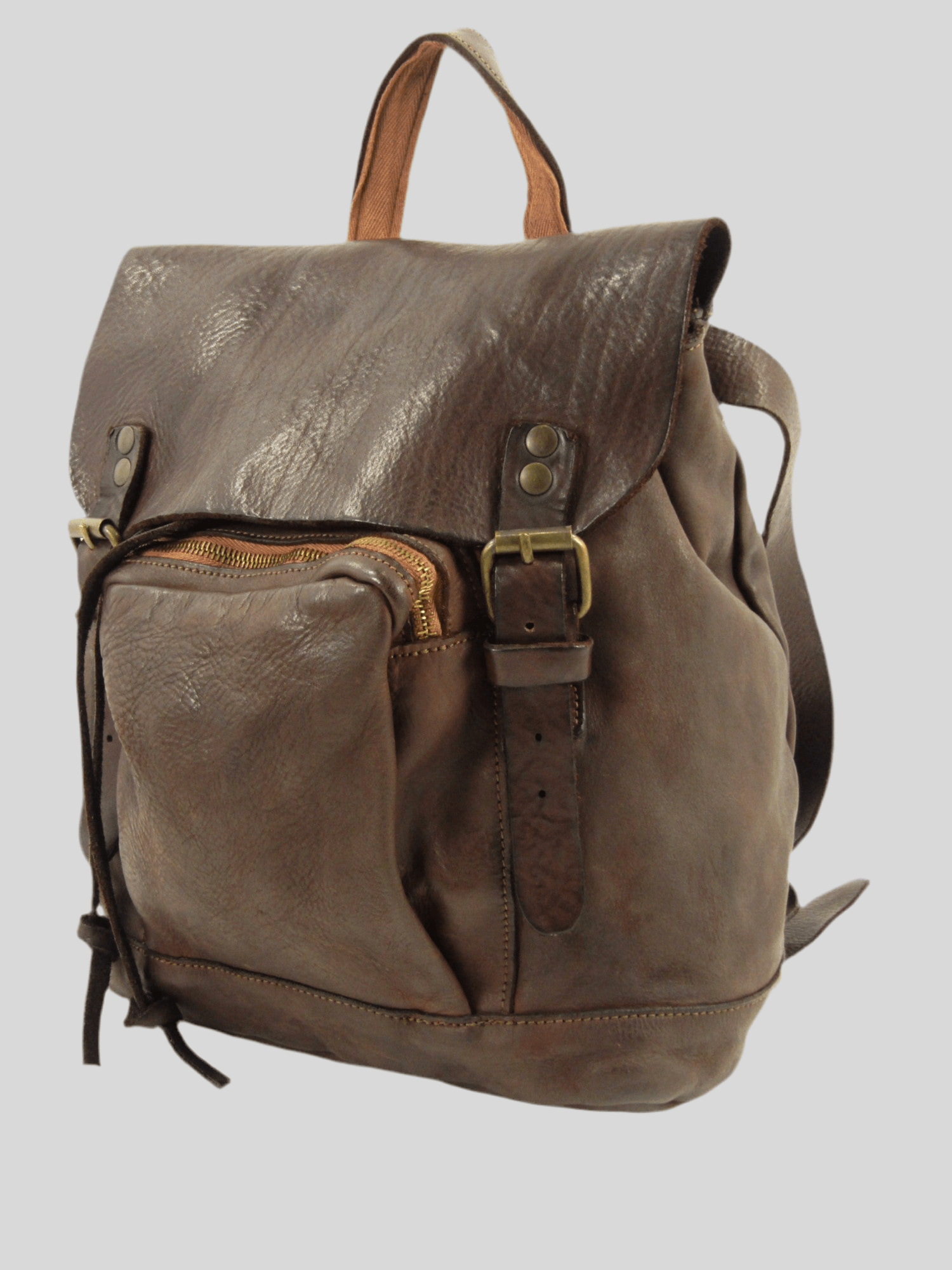Zaino in vacchetta tinto in capo, chiusura con laccio di cuoio, chiusura pattina con fibbiette, interno rivestito ed accessoriato da tasca chiusa da zip e tasche porta accessori aperte, bellissimo zainetto con effetto vintage, dal carattere deciso, costruito con pellami di pregio da veri maestri dell'arte pellettiera
