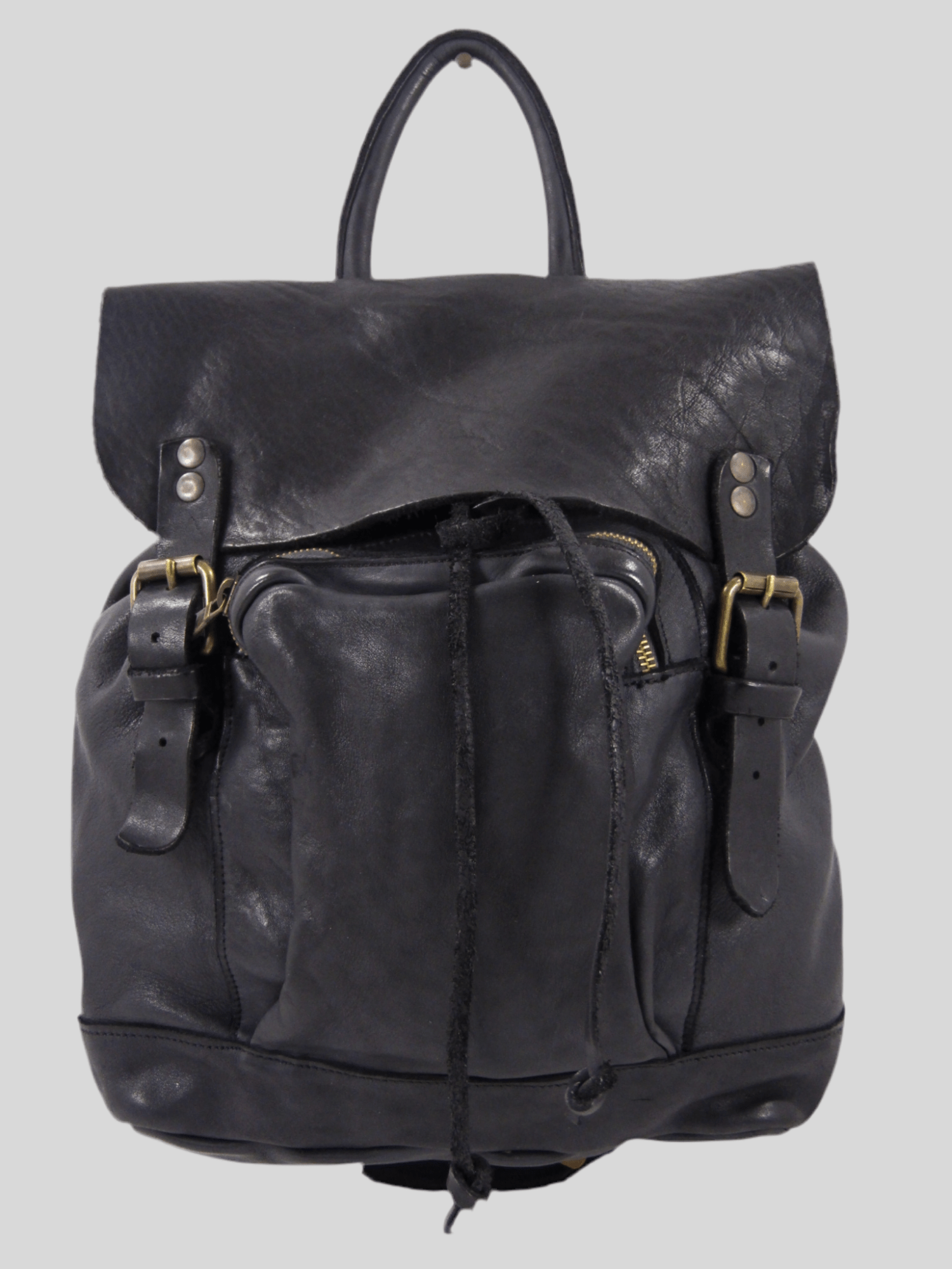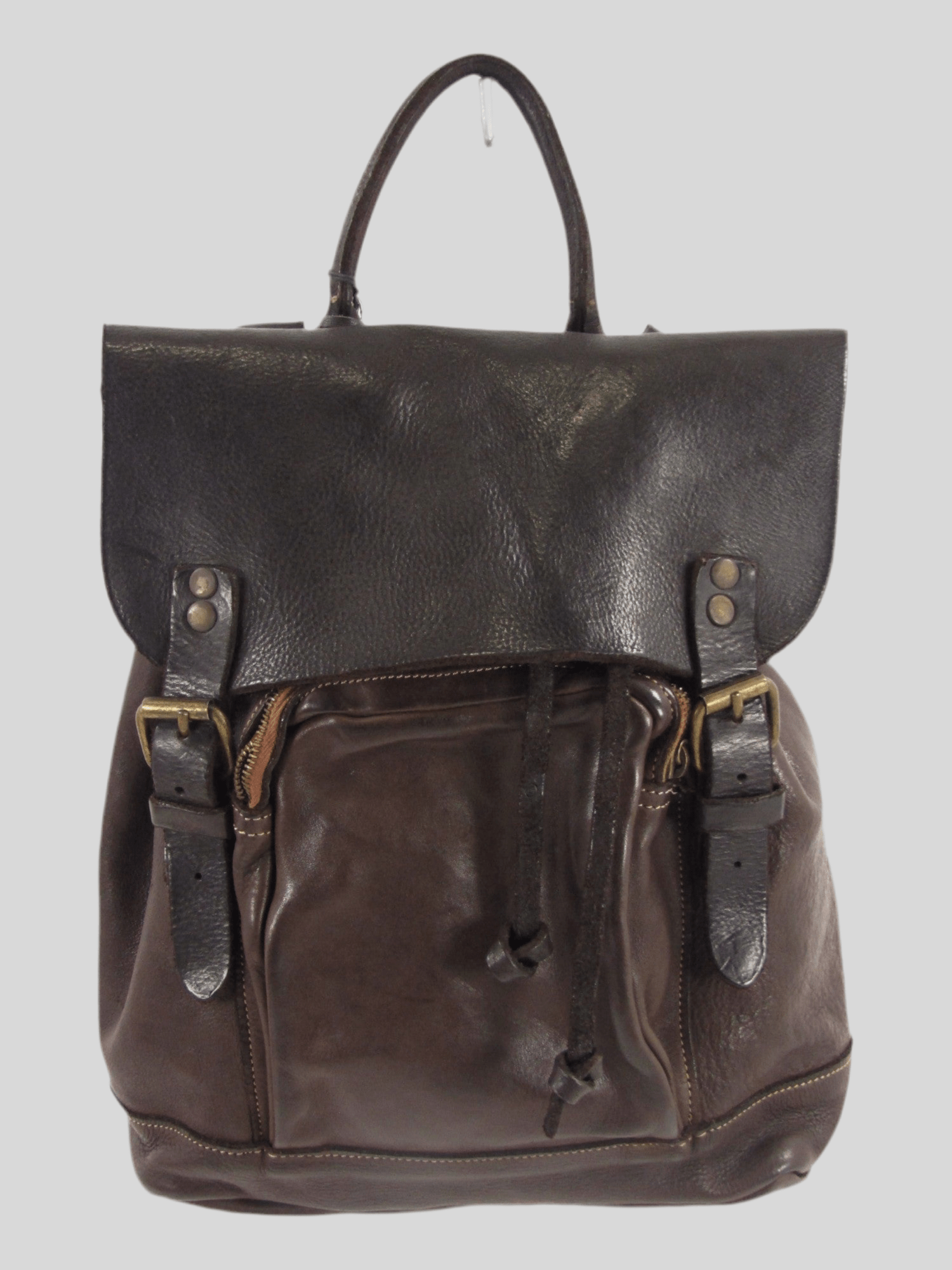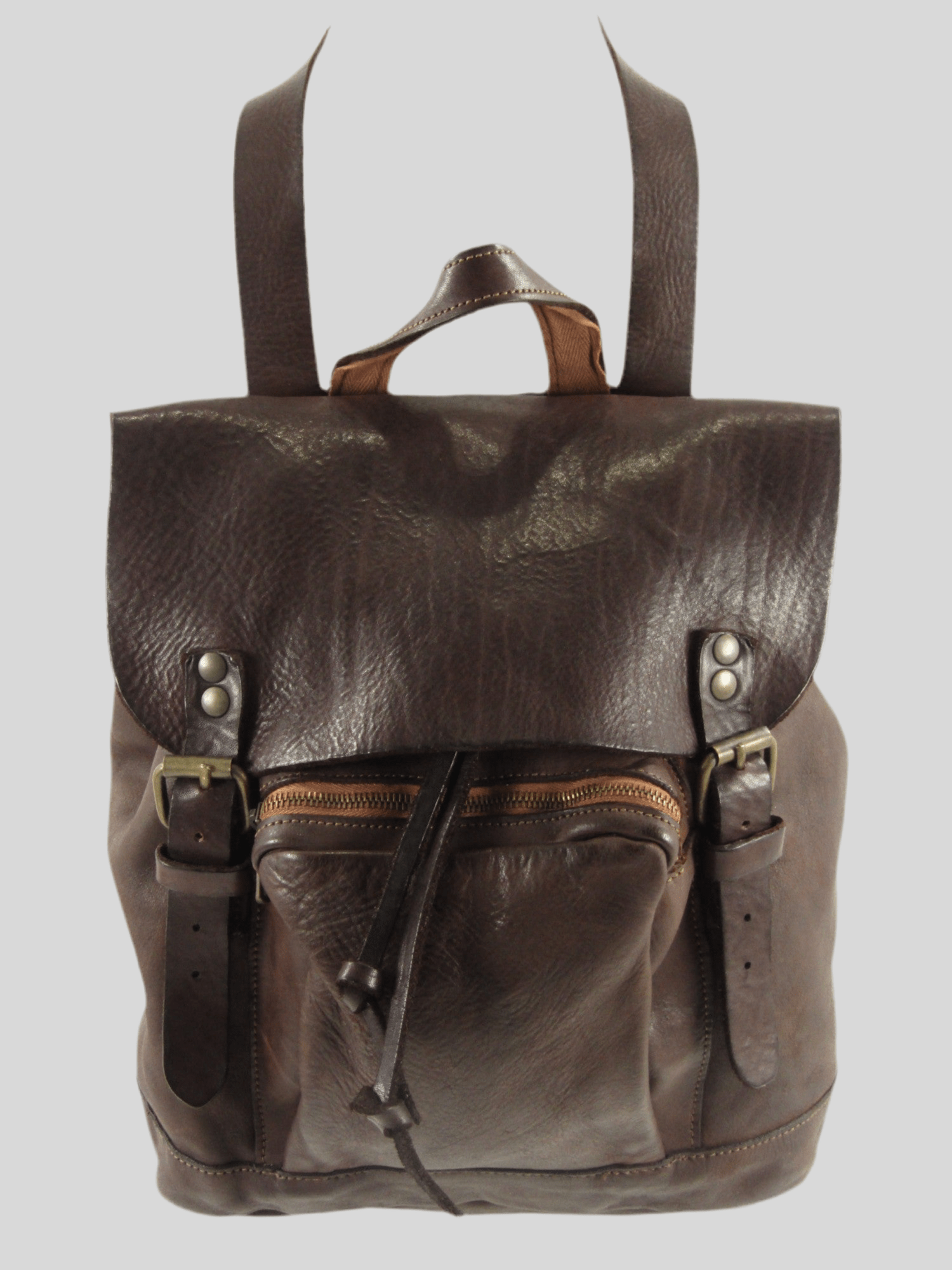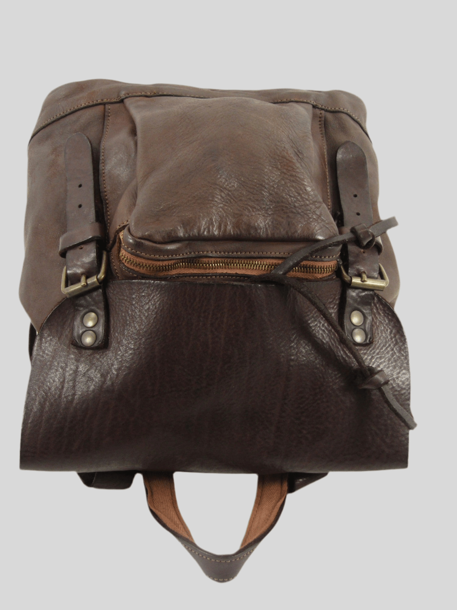 Zaino in vacchetta tinto in capo, chiusura con laccio di cuoio, chiusura pattina con fibbiette, interno rivestito ed accessoriato da tasca chiusa da zip e tasche porta accessori aperte, bellissimo zainetto con effetto vintage, dal carattere deciso, costruito con pellami di pregio da veri maestri dell'arte pellettiera