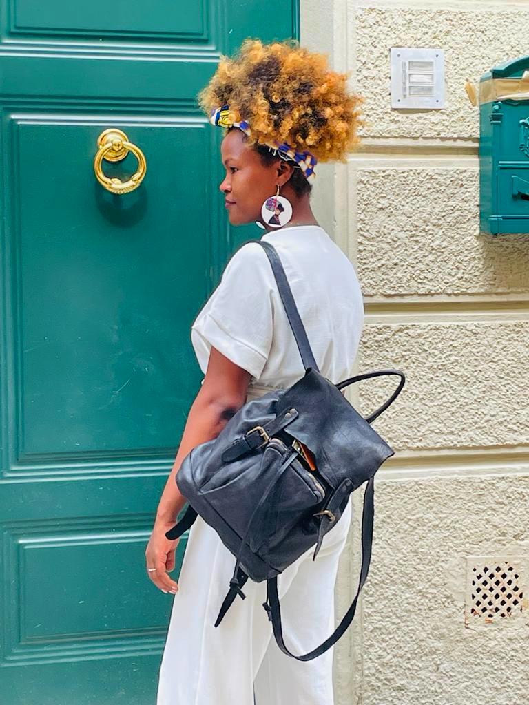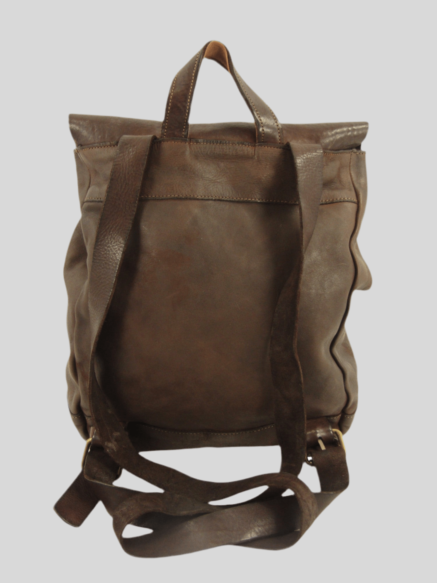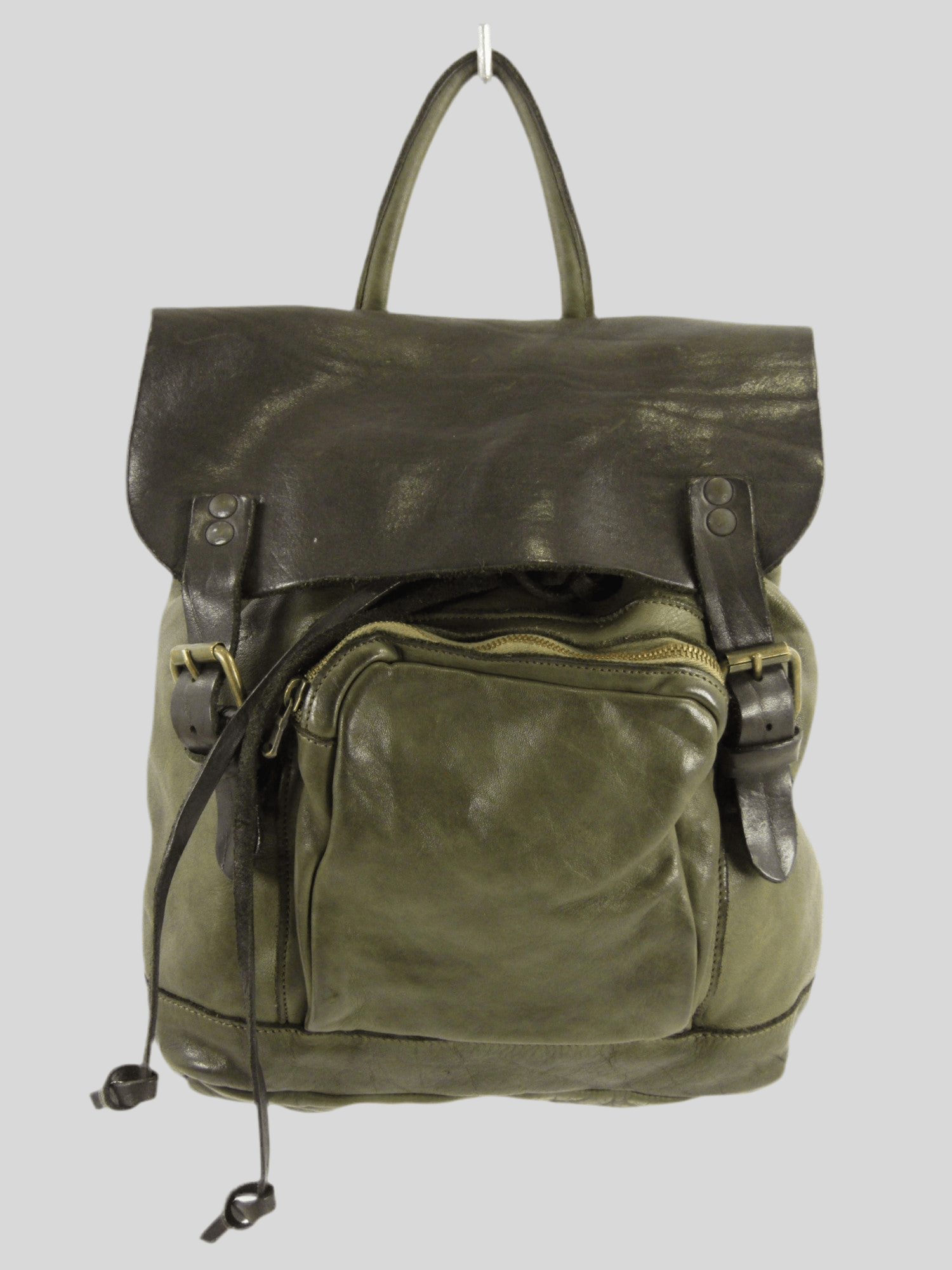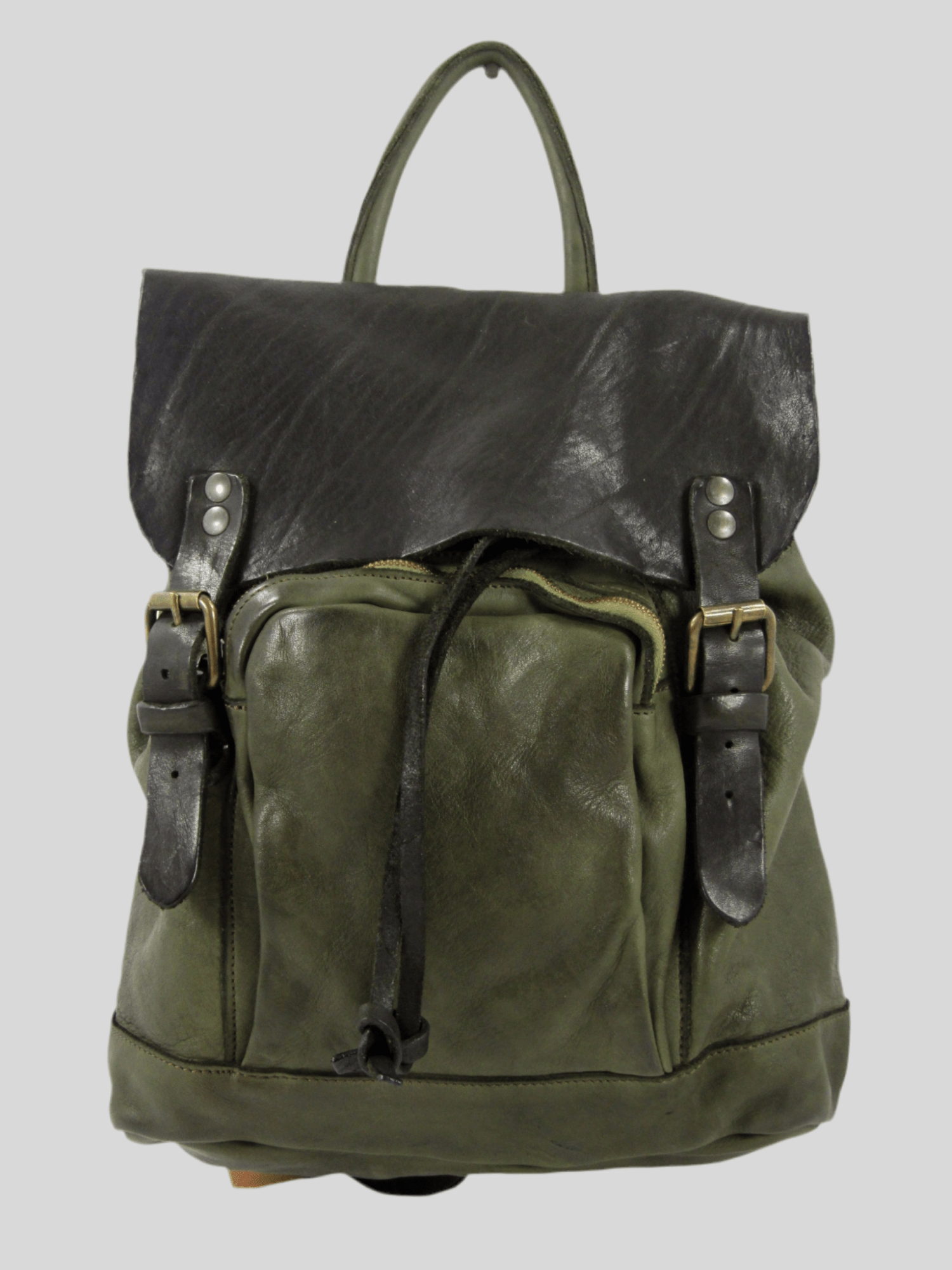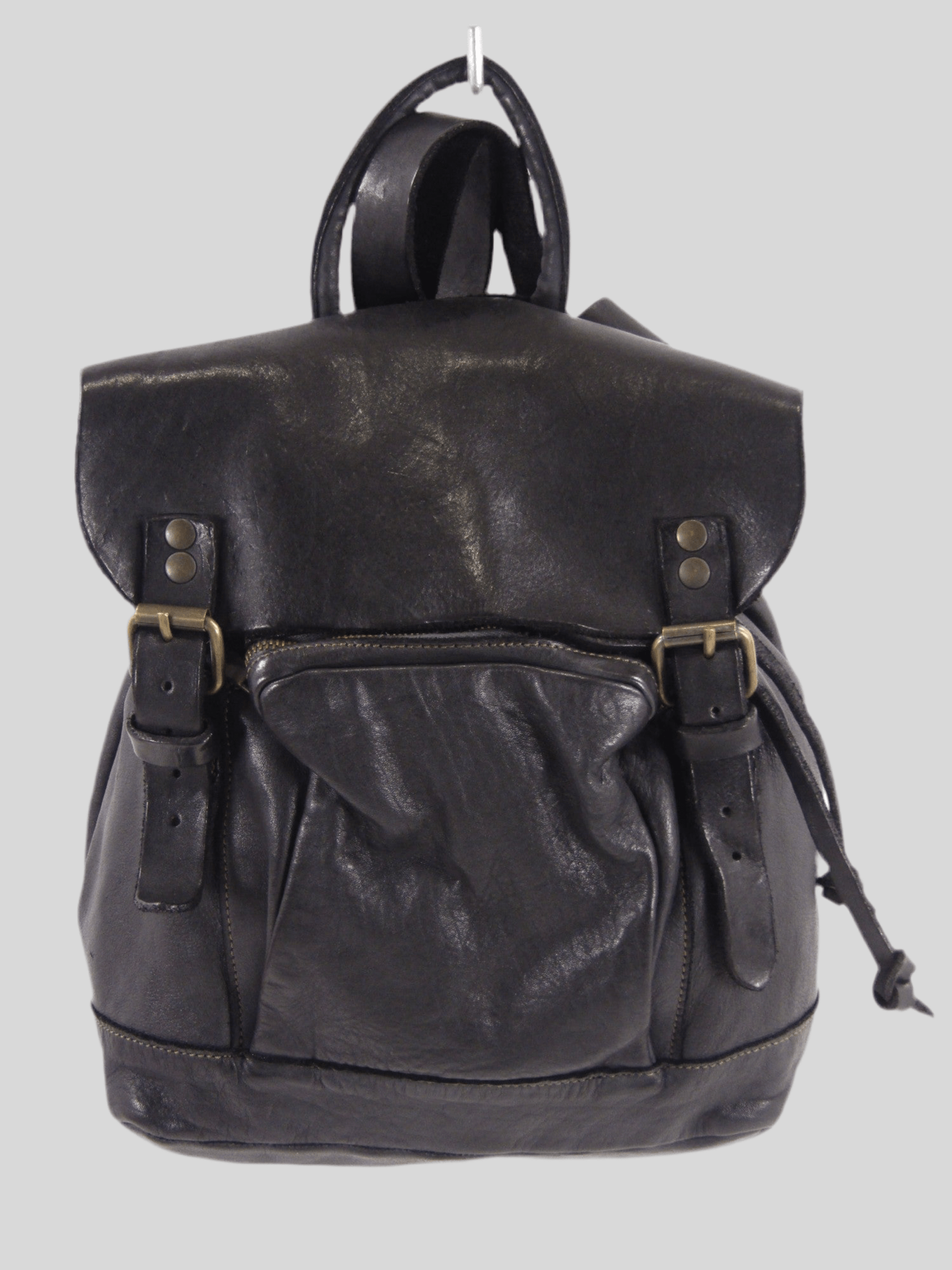 Zaino in vacchetta tinto in capo, chiusura con laccio di cuoio, chiusura pattina con fibbiette, interno rivestito ed accessoriato da tasca chiusa da zip e tasche porta accessori aperte, bellissimo zainetto con effetto vintage, dal carattere deciso, costruito con pellami di pregio da veri maestri dell'arte pellettiera