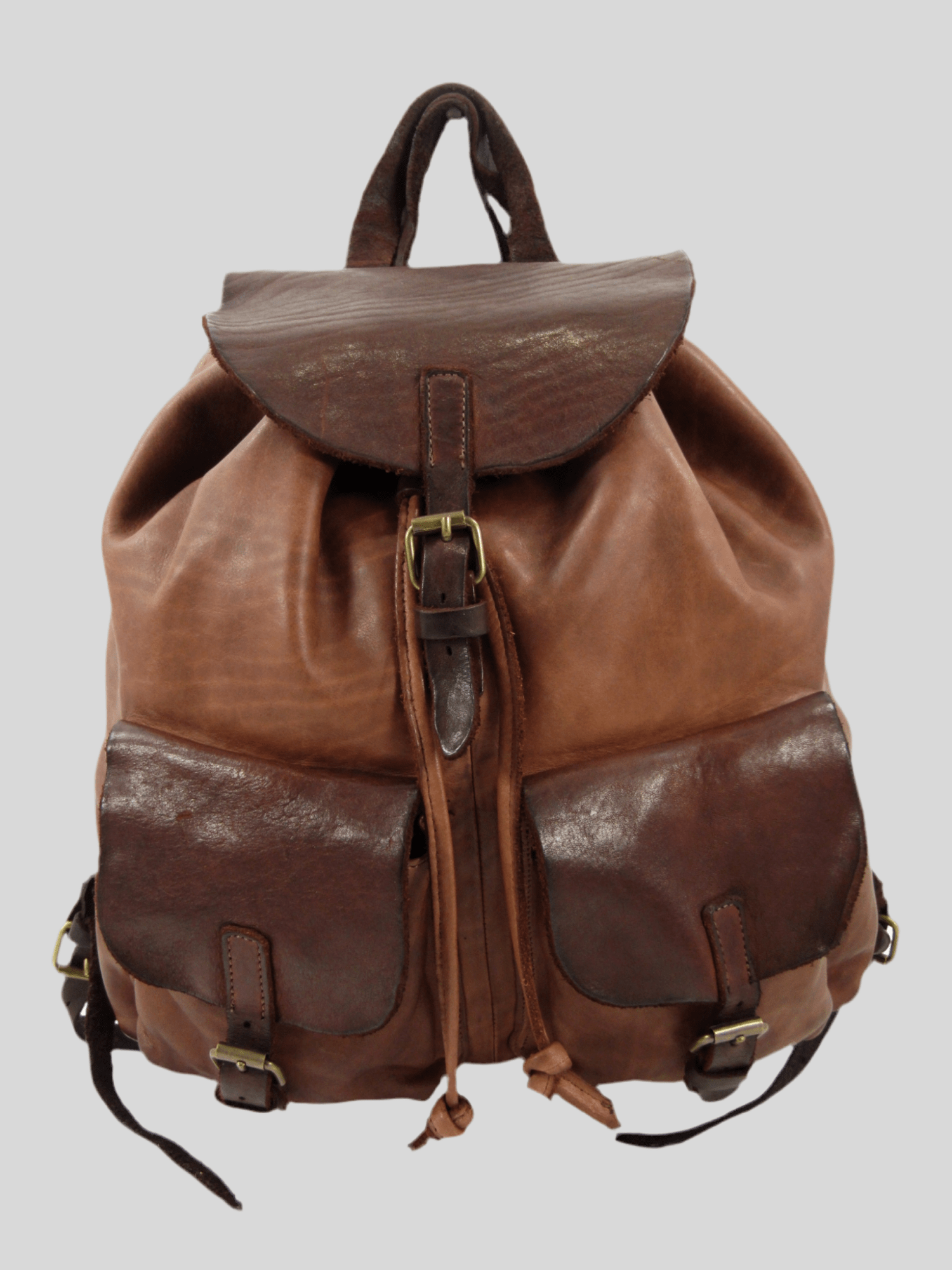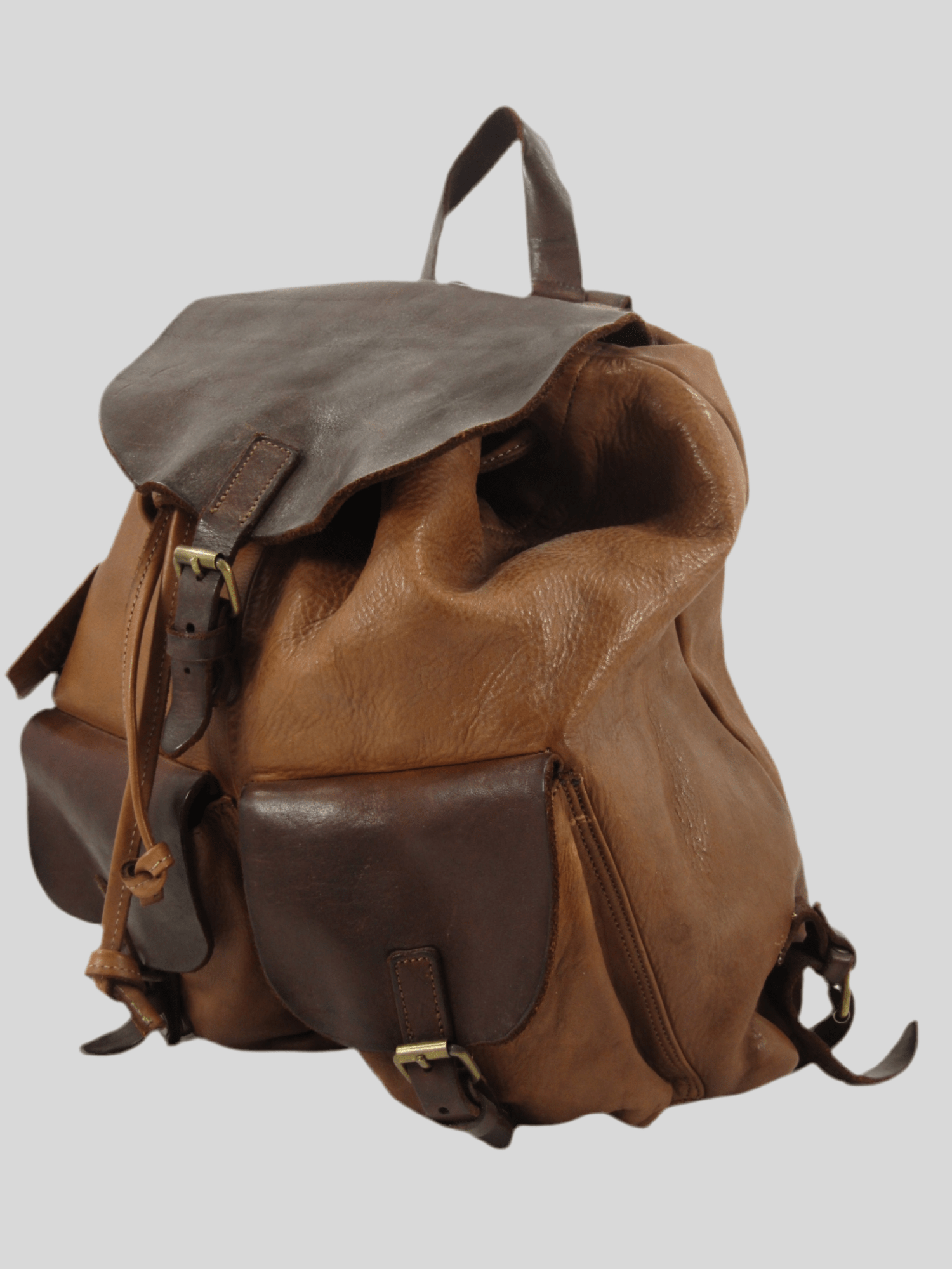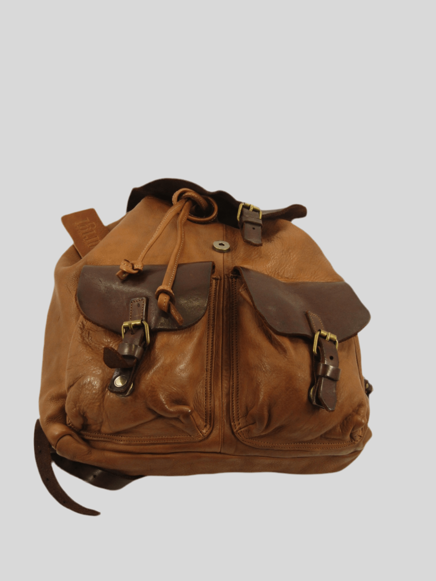 Zaino in vacchetta tinto in capo, chiusura bocca dello zaino con laccetto in cuoio, chiusura pattina con fibbietta e clip magnetica, interno rivestito ed accessoriato da tasca porta accessori aperta e tasca chiusa da zip, sull'esterno due tasche chiuse da pattina, zaino dalle linee classiche, morbido, riprogettato con tecniche di tintura che donano colori caldi e unici, costruito in maniera artigianale da veri maestri del cuoio