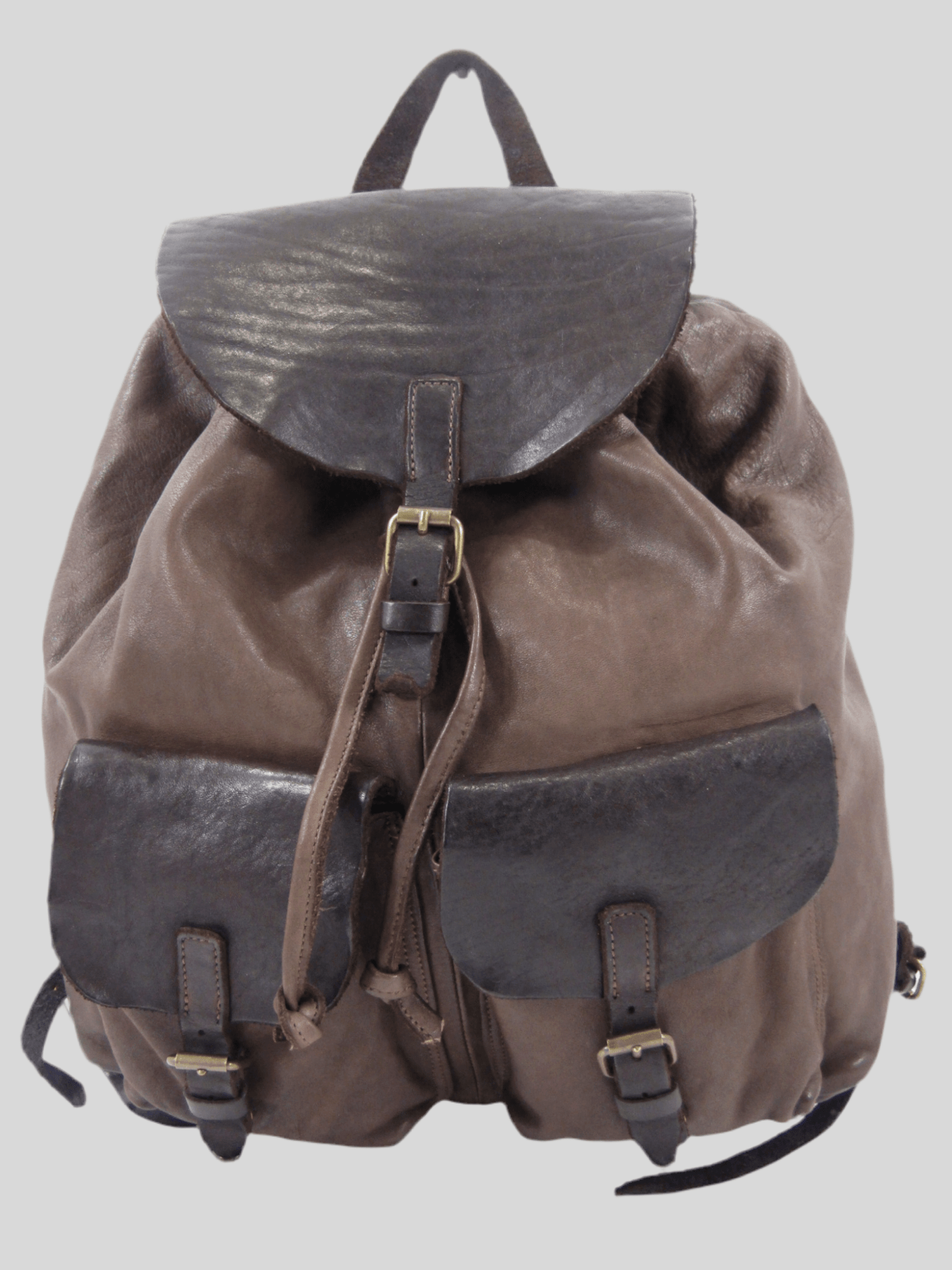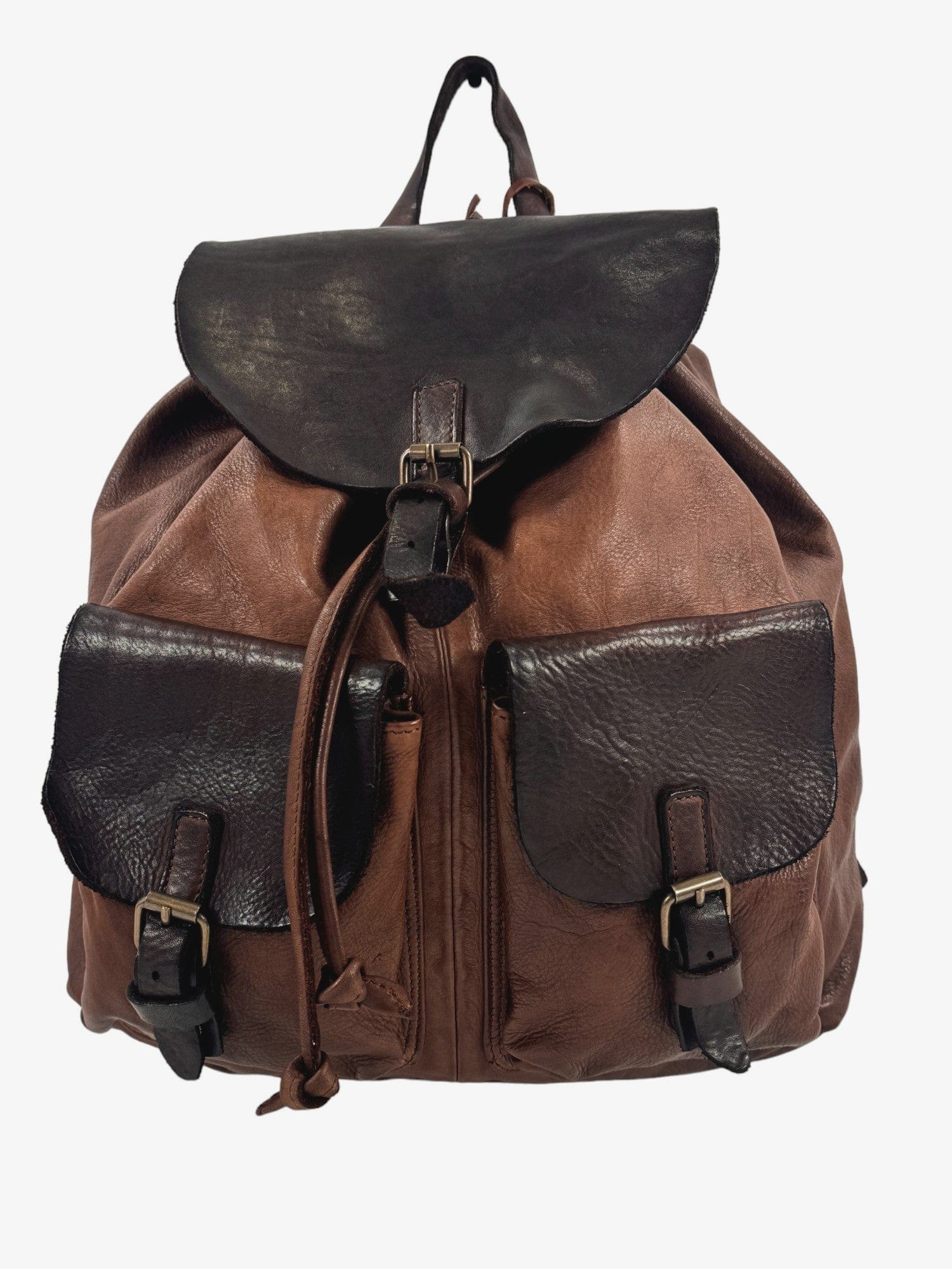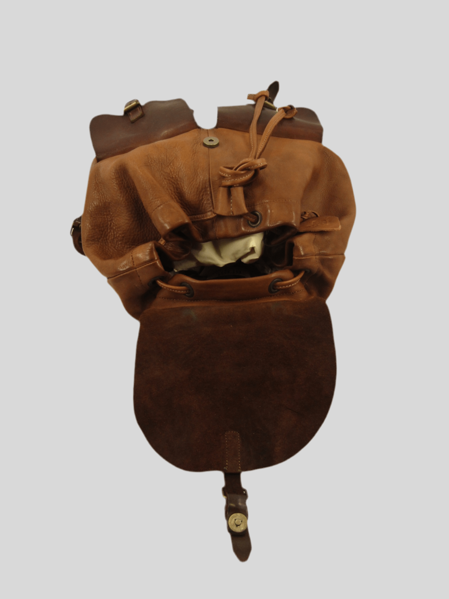 Zaino in vacchetta tinto in capo, chiusura bocca dello zaino con laccetto in cuoio, chiusura pattina con fibbietta e clip magnetica, interno rivestito ed accessoriato da tasca porta accessori aperta e tasca chiusa da zip, sull'esterno due tasche chiuse da pattina, zaino dalle linee classiche, morbido, riprogettato con tecniche di tintura che donano colori caldi e unici, costruito in maniera artigianale da veri maestri del cuoio
