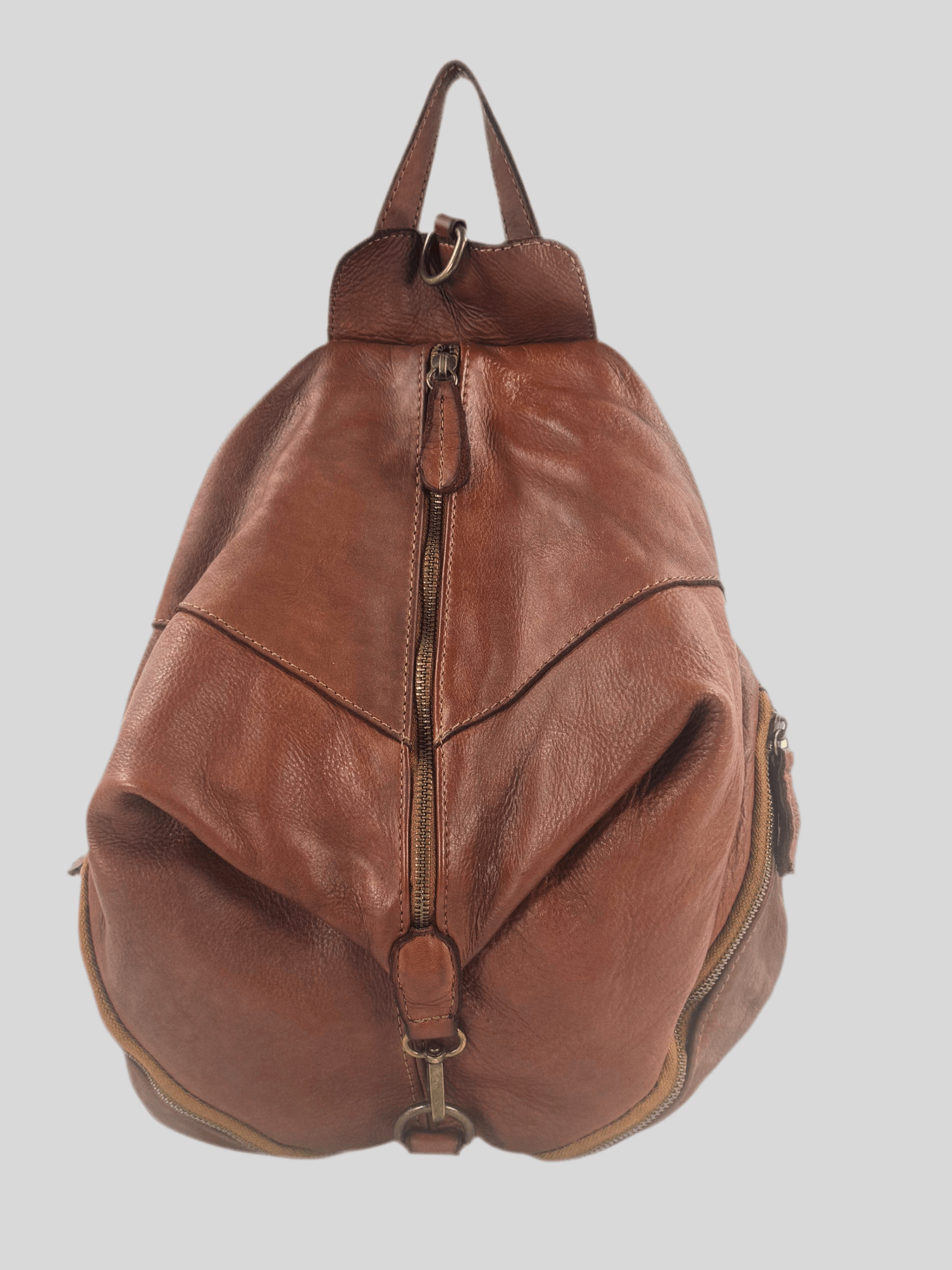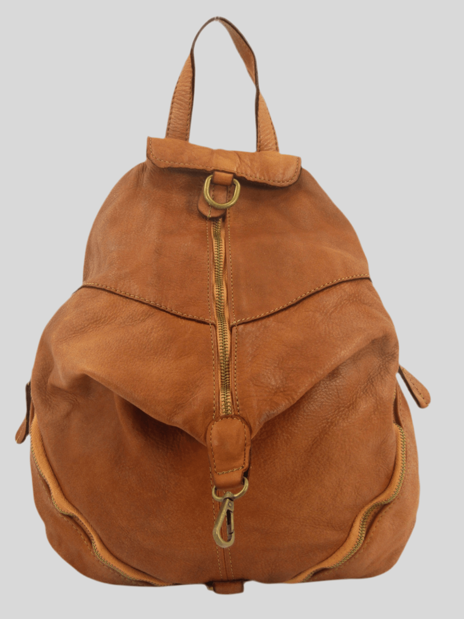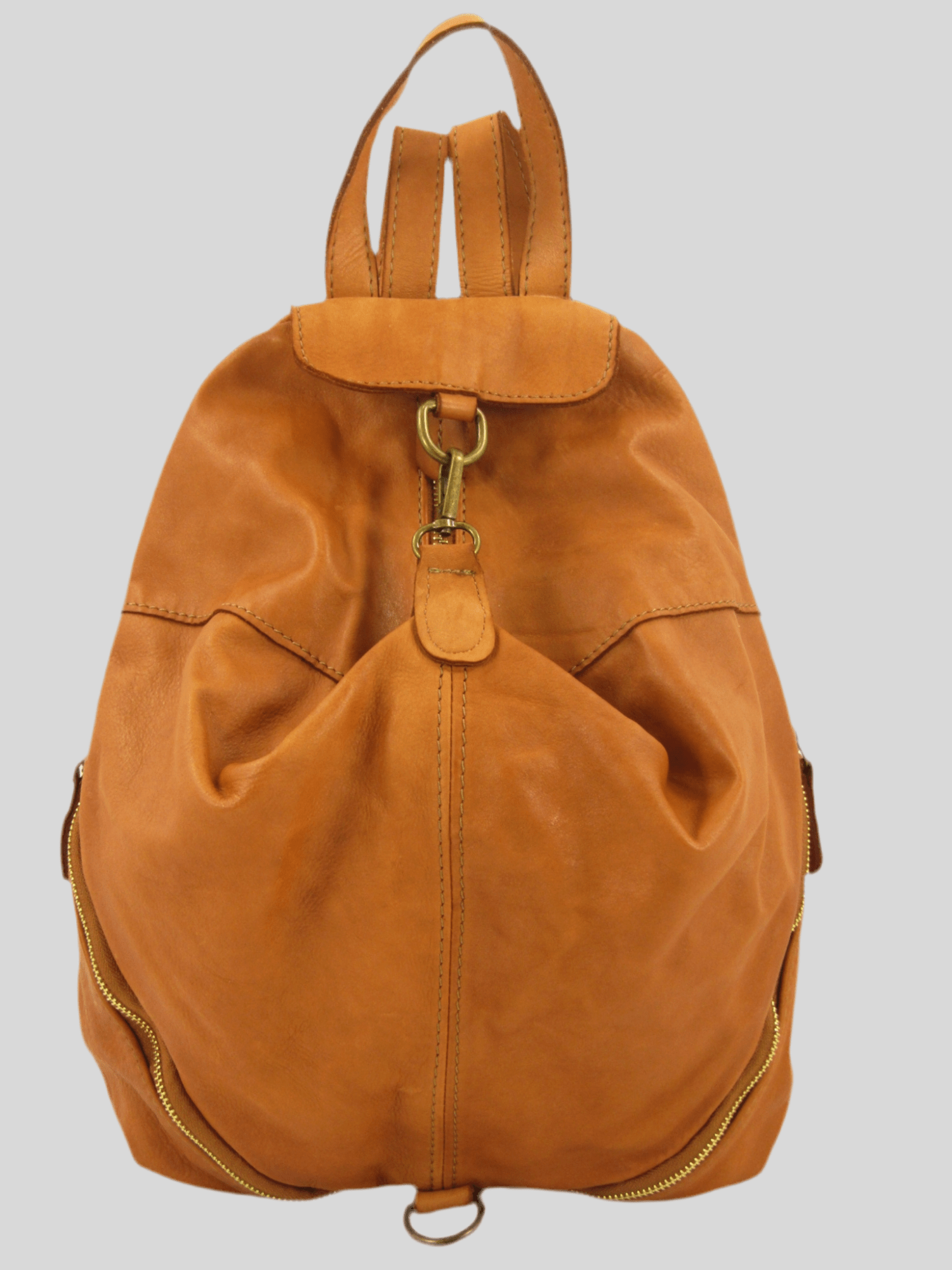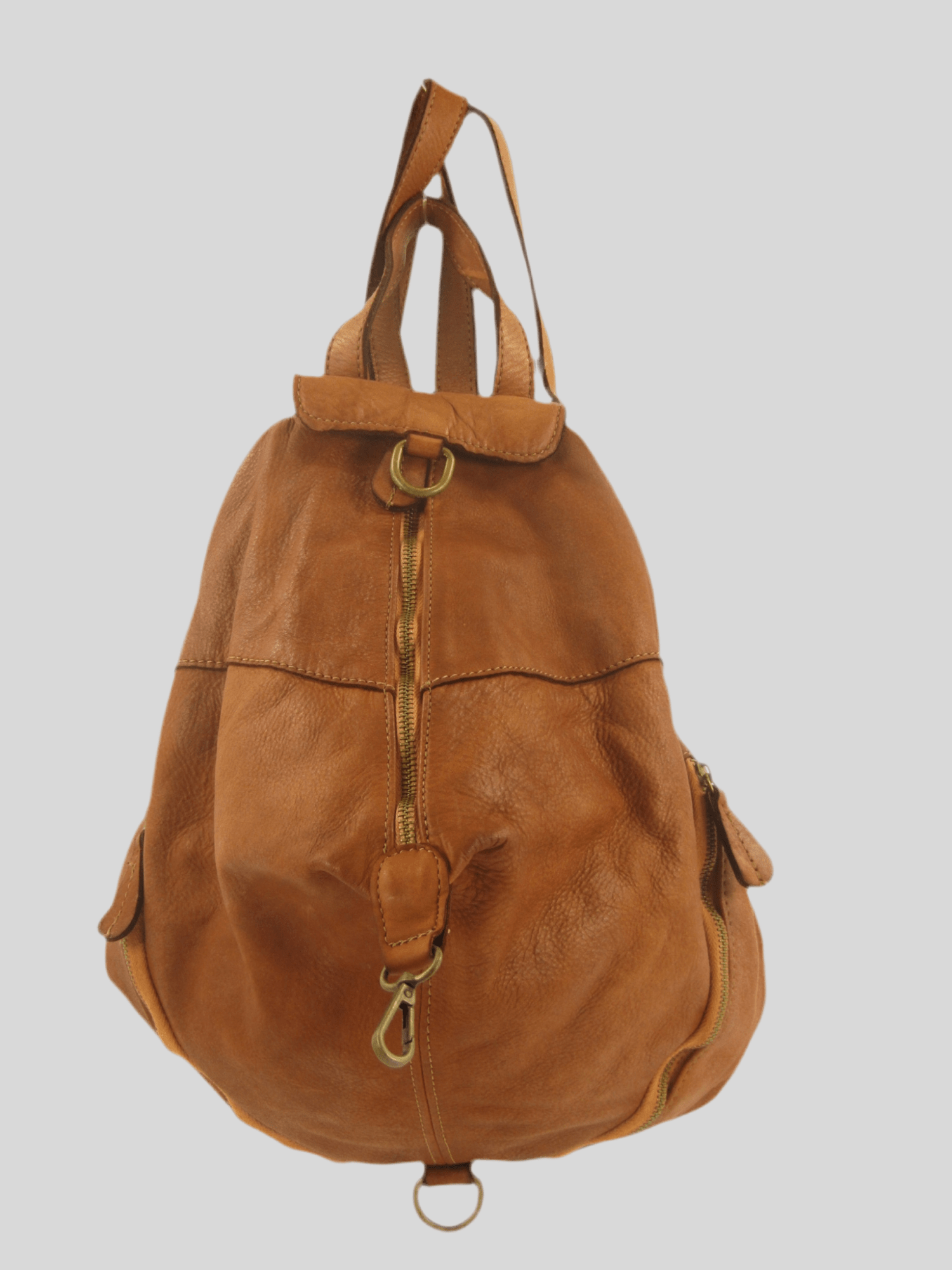 Zaino in pelle tinto in capo, chiusura con zip e moschettone, tracolle in pelle regolabili, interno rivestito accessoriato da tasca chiusa da zip e taschine porta accessori, sull’esterno frontale due tasche chiuse da zip, sul retro tasca chiusa da zip, zainetto accattivante nelle linee, caldo nei colori e morbido al tatto. Possibilità di chiuderlo in più modi agganciando o meno il moschettone.